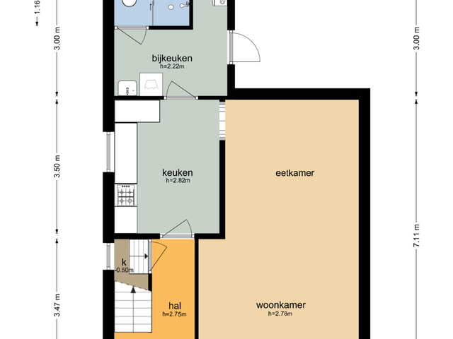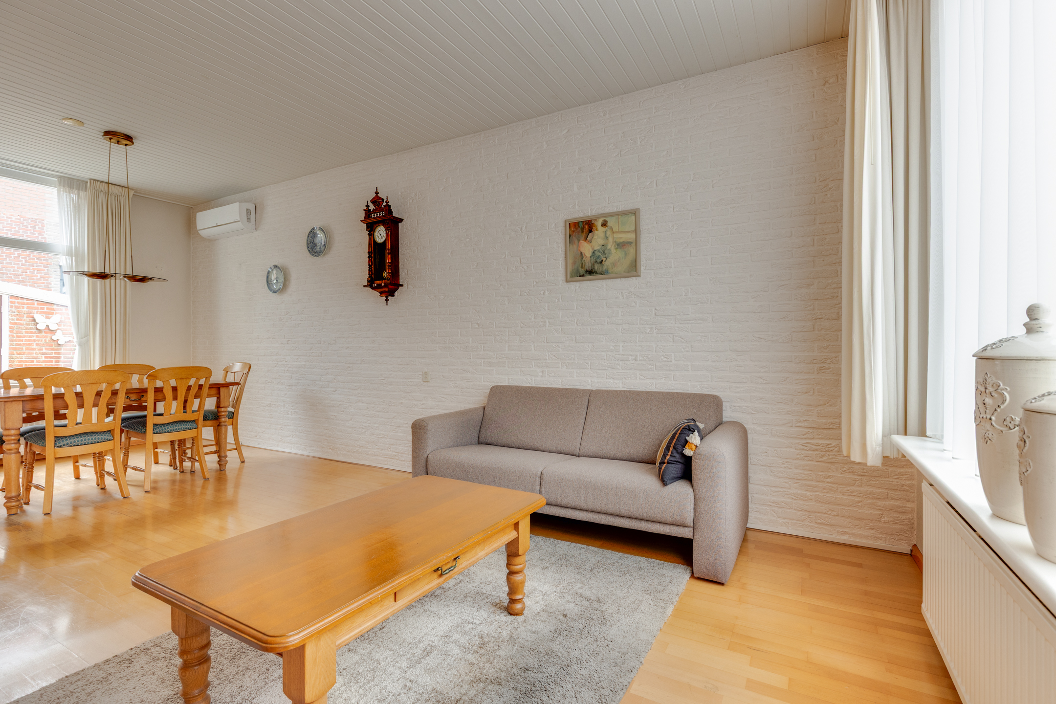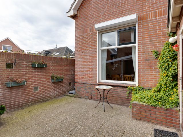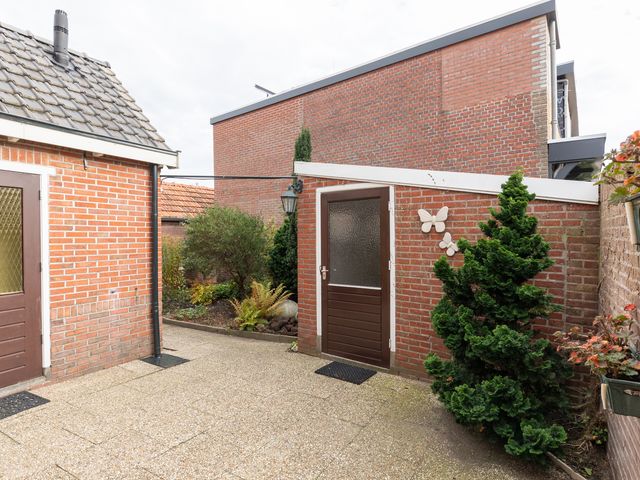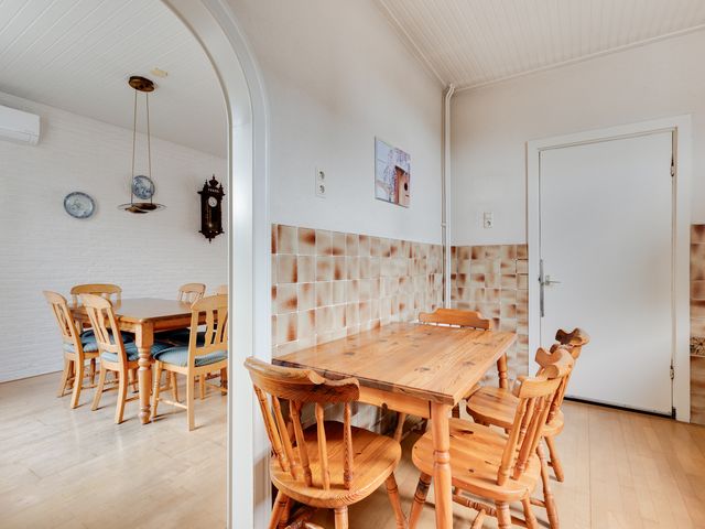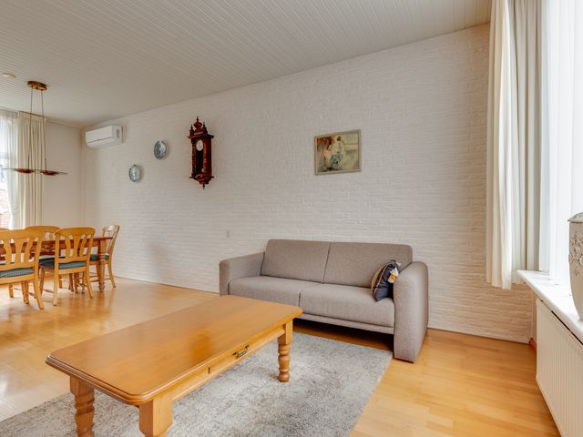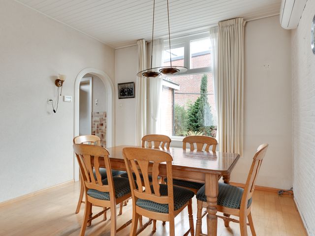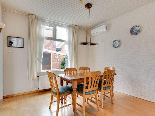 Begane grond: Entreehal met meterkast, trapopgang (incl. traplift) naar de eerste verdieping en een praktische provisieruimte. Vanuit de hal is de halfopen keuken bereikbaar, voorzien van een L-vormig keukenblok en o.a. een gasfornuis. Via een toog is de circa 7 meter lange doorzonwoonkamer en eetkamer toegankelijk. Deze ruime en lichte woonkamer is uitgerust met rolluiken en een airconditioningunit. Vanuit de keuken is tevens de bijkeuken bereikbaar. De bijkeuken beschikt over een wasmachineaansluiting, een wastafel en biedt toegang tot een toiletruimte en een aparte doucheruimte. Boven de bijkeuken is een (kleine) vliering aanwezig, bereikbaar middels een vlizotrap. Via de achterdeur in de bijkeuken is de achtertuin toegankelijk.