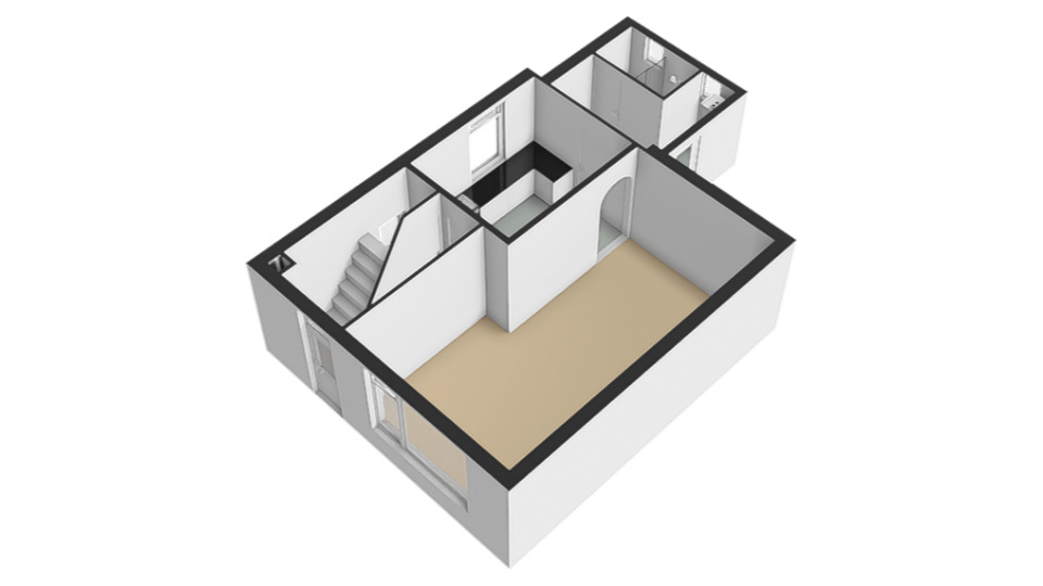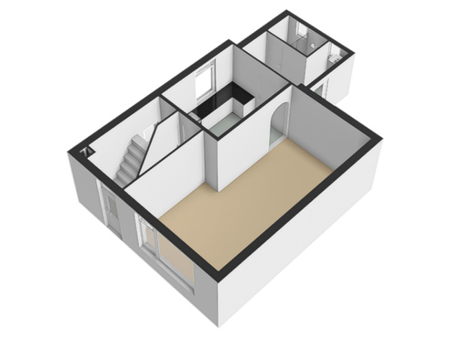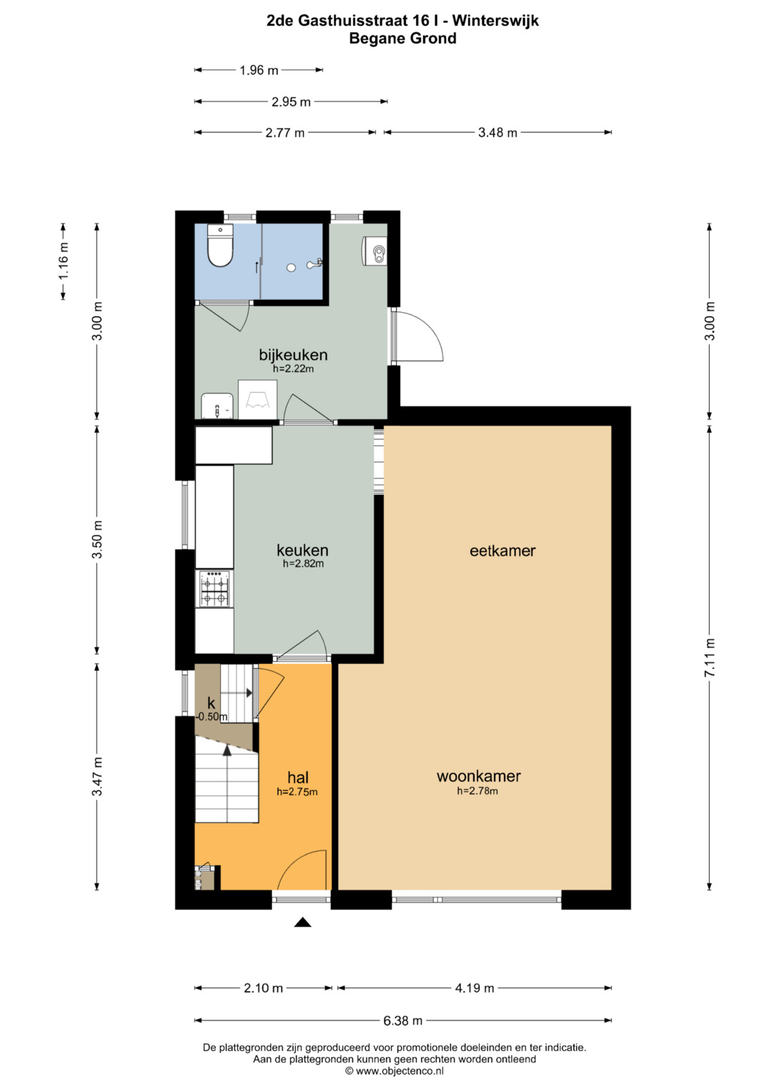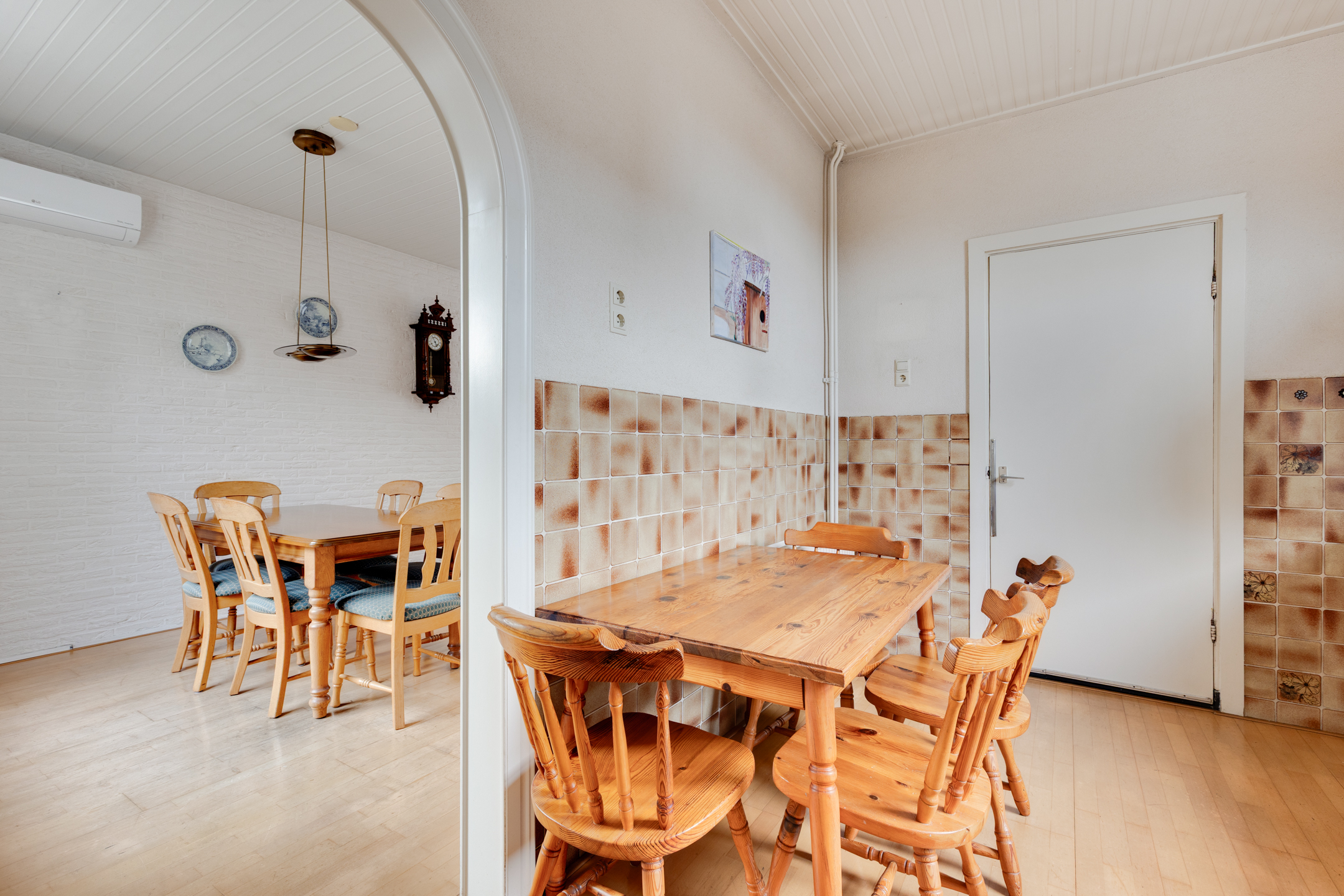 Begane grond: Entreehal met meterkast, trapopgang (incl. traplift) naar de eerste verdieping en een praktische provisieruimte. Vanuit de hal is de halfopen keuken bereikbaar, voorzien van een L-vormig keukenblok en o.a. een gasfornuis. Via een toog is de circa 7 meter lange doorzonwoonkamer en eetkamer toegankelijk. Deze ruime en lichte woonkamer is uitgerust met rolluiken en een airconditioningunit. Vanuit de keuken is tevens de bijkeuken bereikbaar. De bijkeuken beschikt over een wasmachineaansluiting, een wastafel en biedt toegang tot een toiletruimte en een aparte doucheruimte. Boven de bijkeuken is een (kleine) vliering aanwezig, bereikbaar middels een vlizotrap. Via de achterdeur in de bijkeuken is de achtertuin toegankelijk.