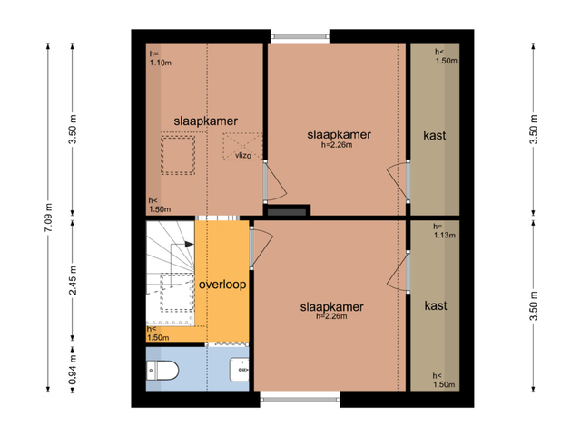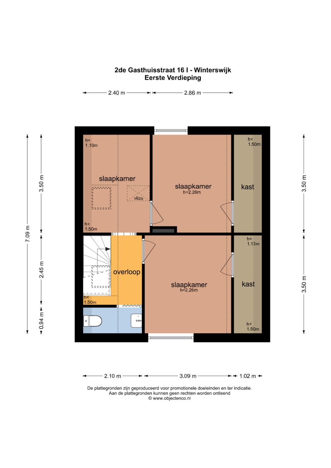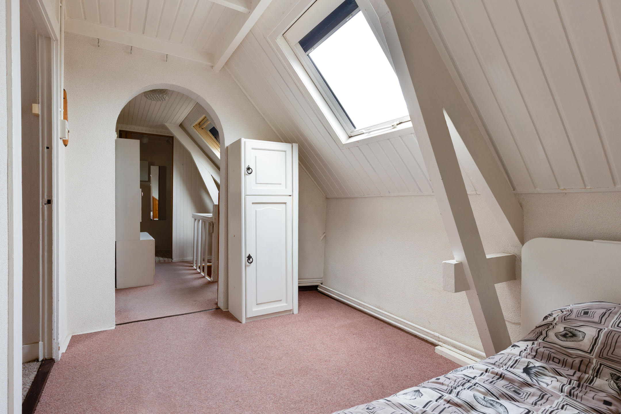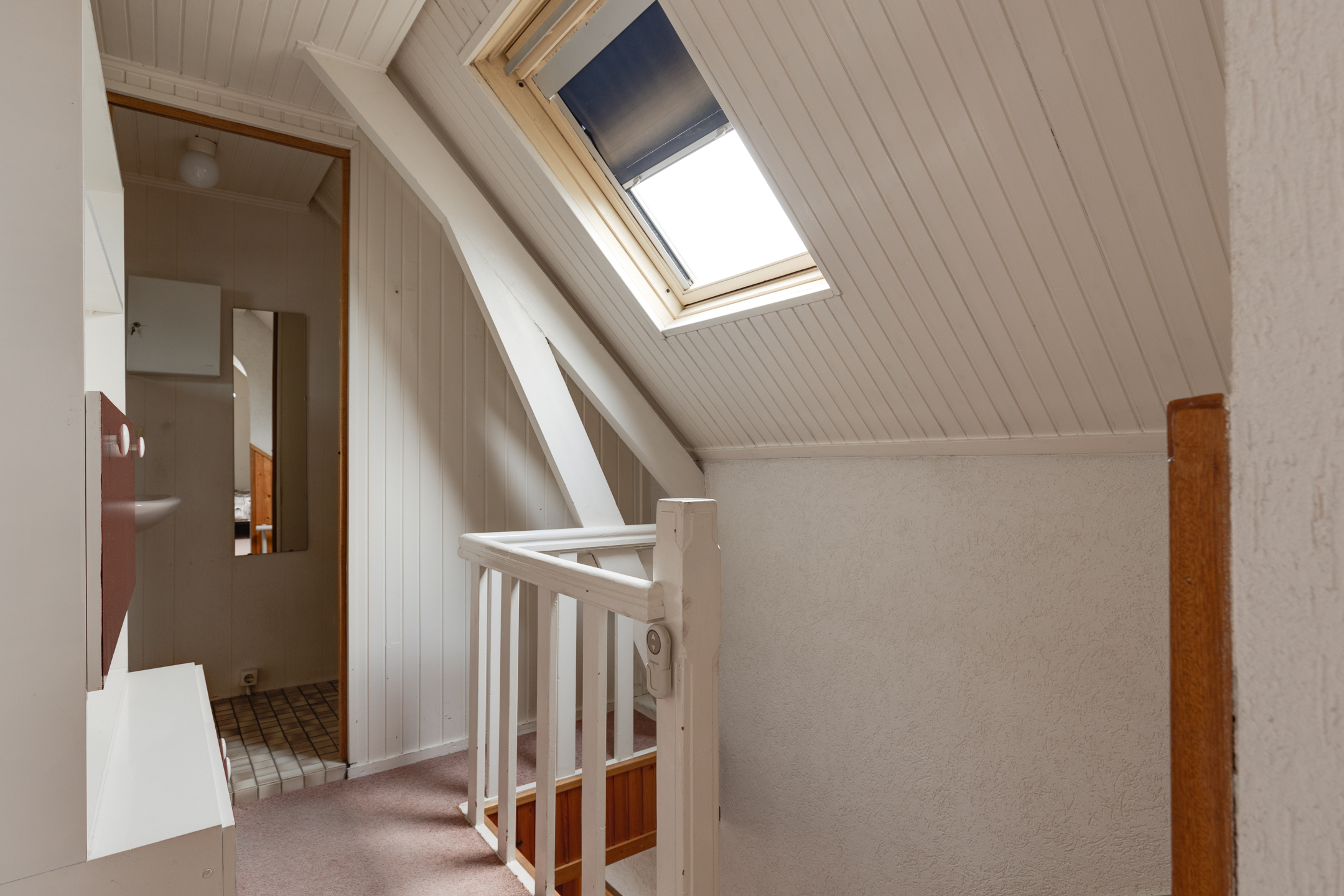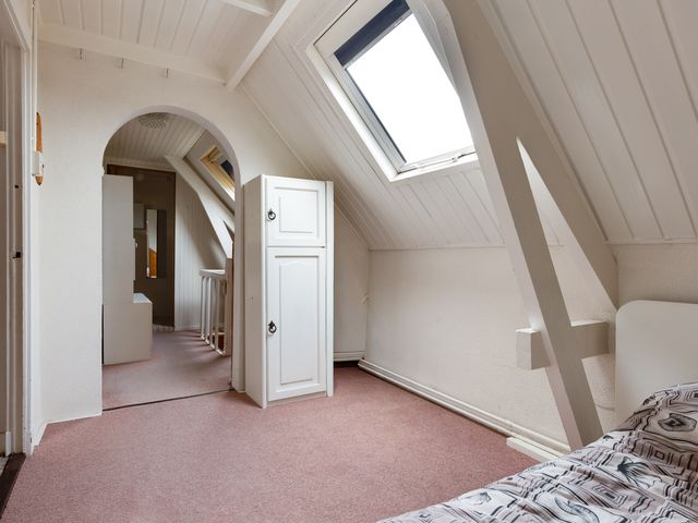 Eerste verdieping: Overloop met toegang tot drie slaapkamers. De overloop en één van de slaapkamers zijn voorzien van dakramen. Twee slaapkamers beschikken over praktische inbouwkasten. Op deze verdieping bevindt zich tevens een tweede toiletruimte met wastafel.