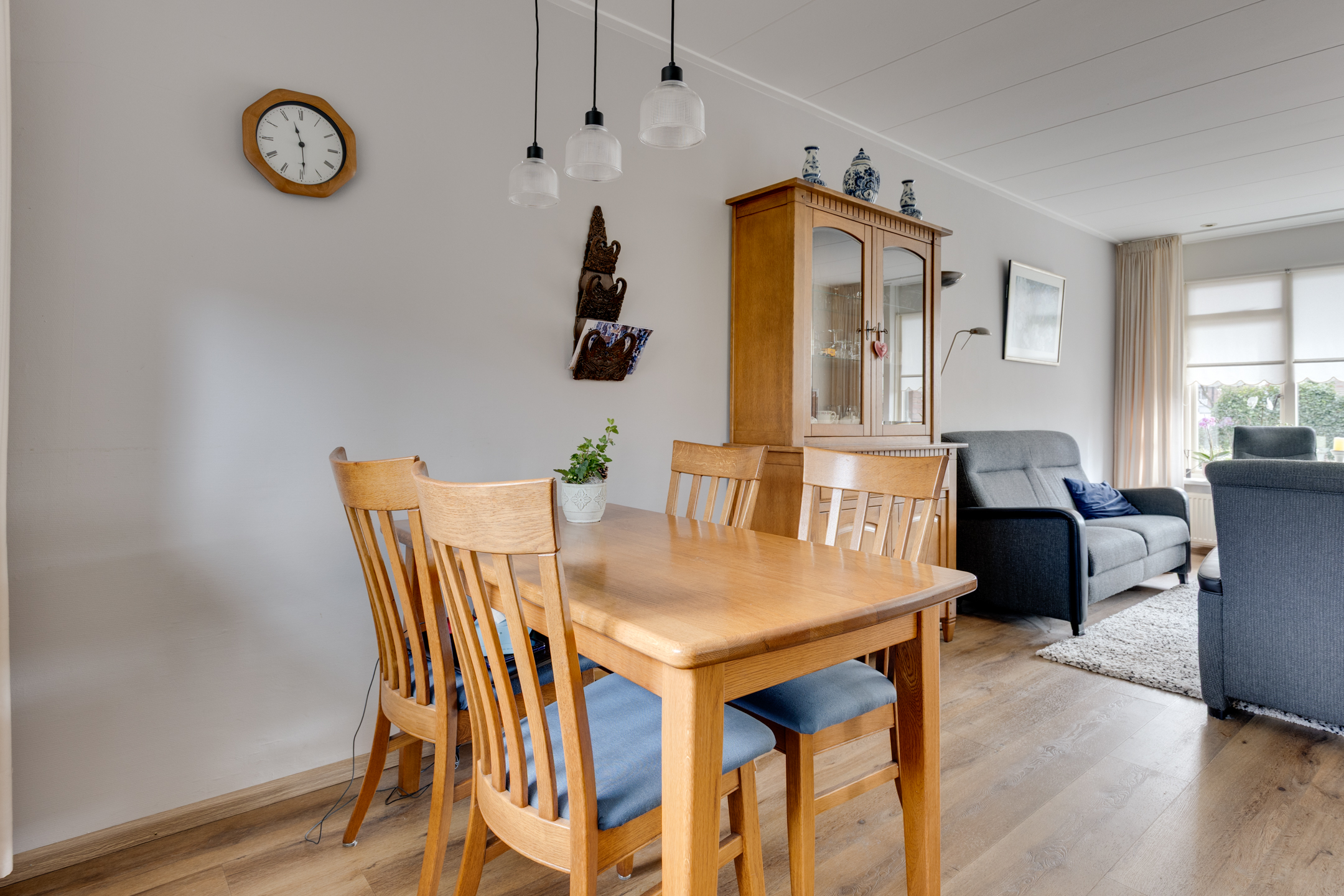 De woonkamer met zit en eethoek beschikt over enkele inbouwspots in het plafond en een laminaatvloer.