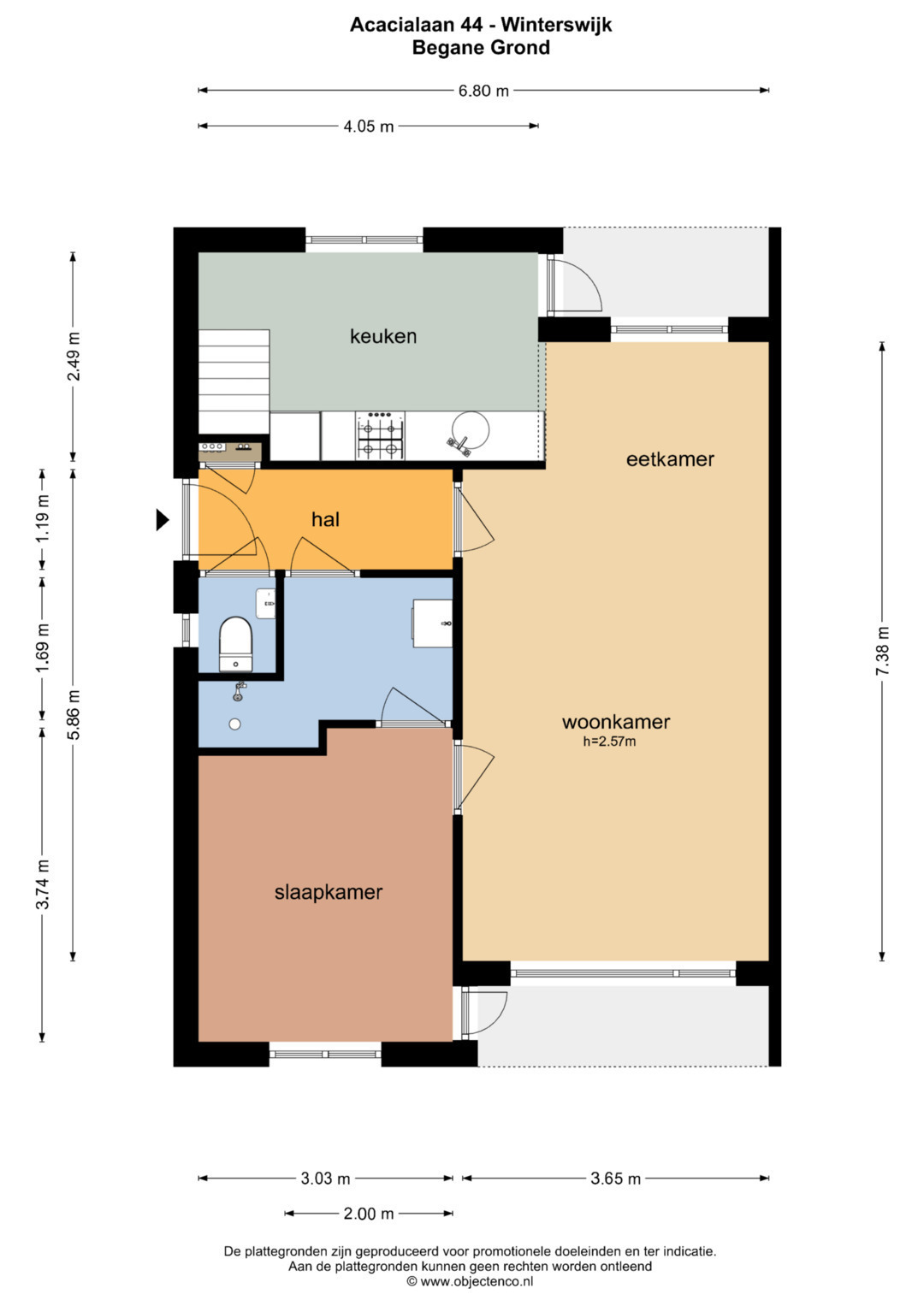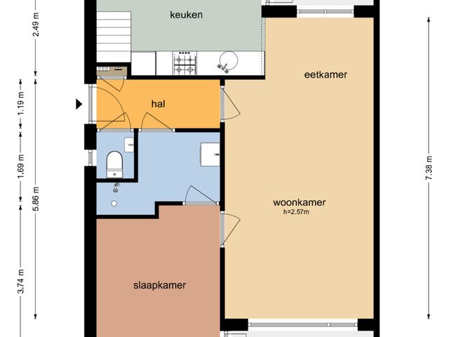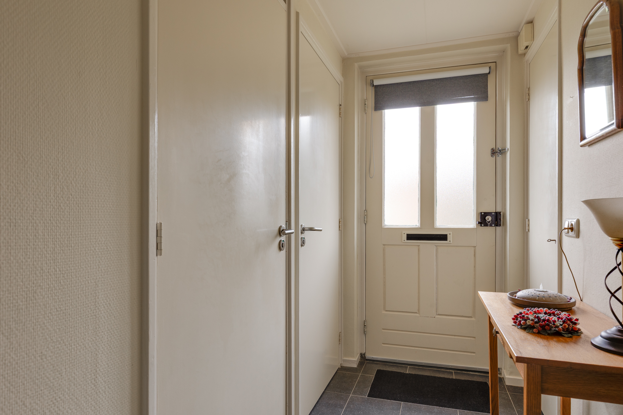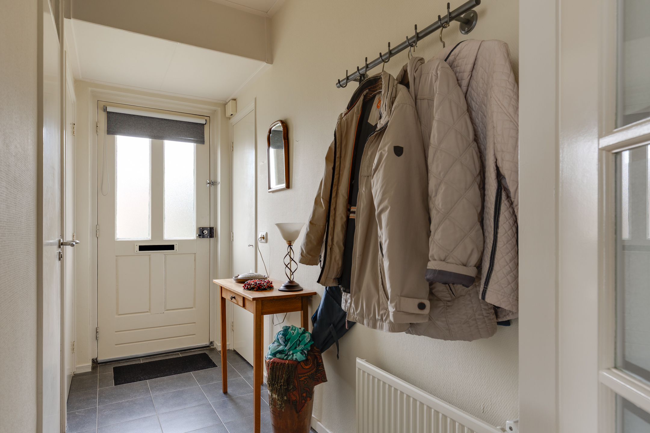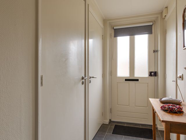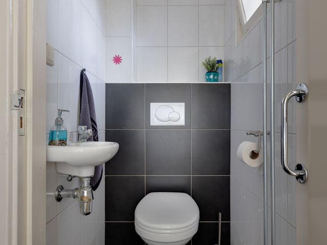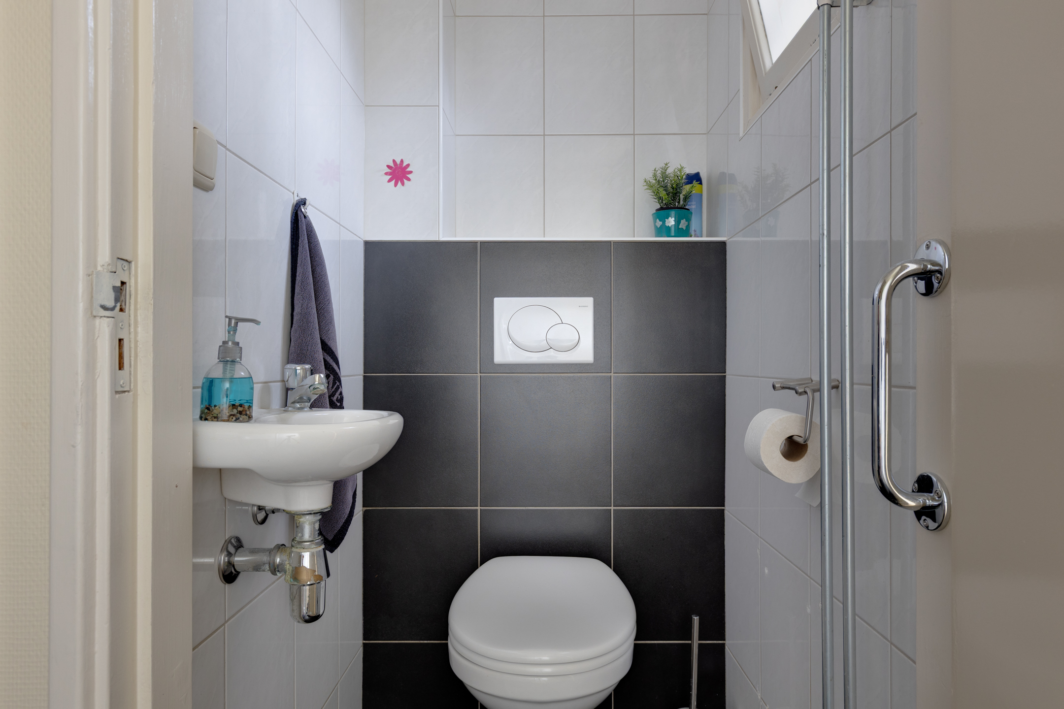 Begane grond: Entree/hal via de voordeur aan zijkant van de woning; de hal biedt toegang tot de meterkast, toilet, badkamer en woonkamer. De toiletruimte is modern en voorzien van een wandcloset en fonteintje.