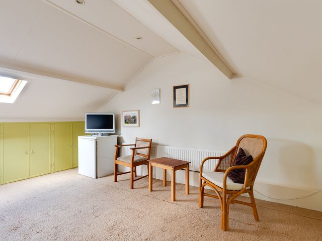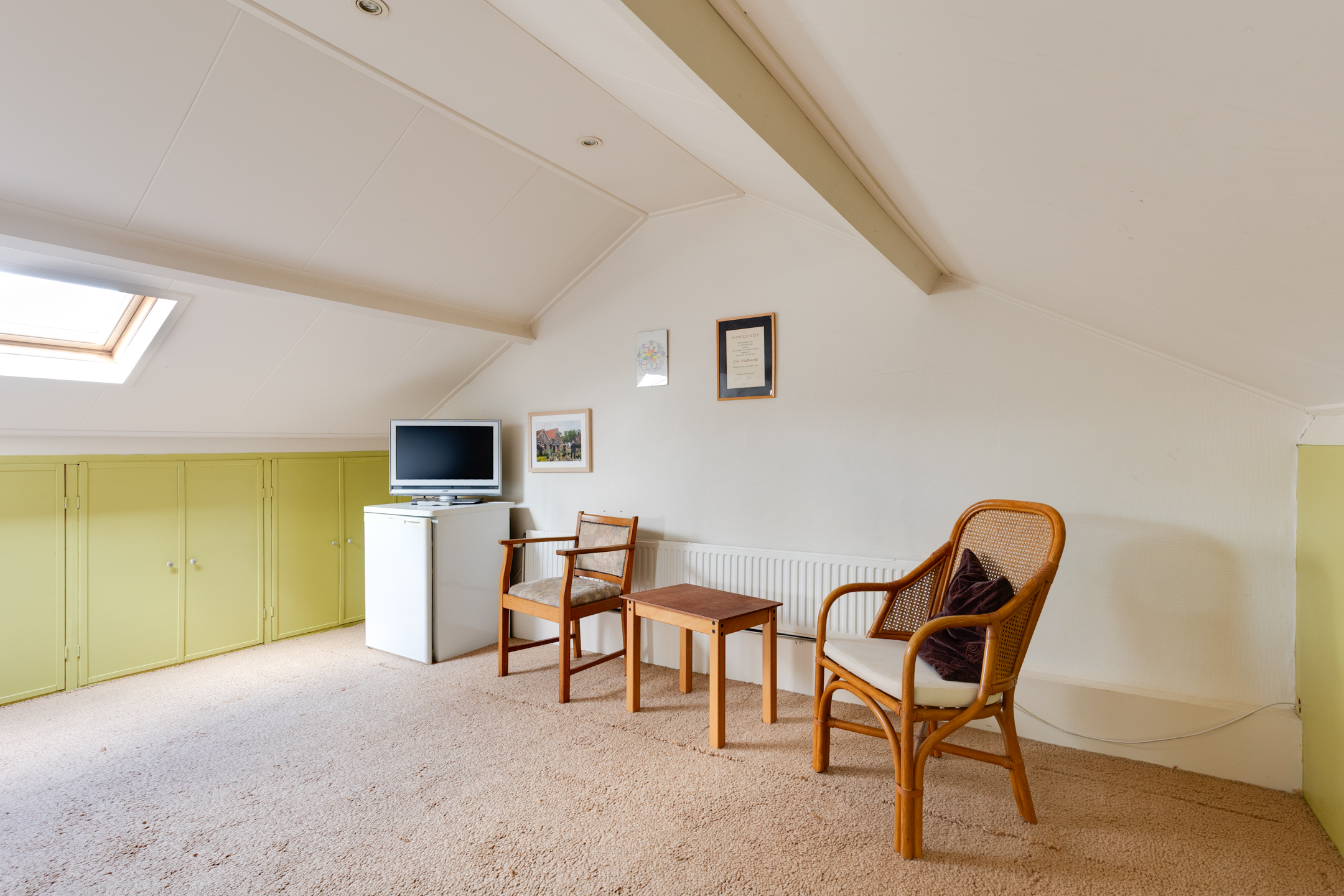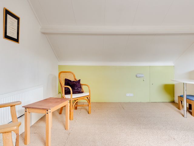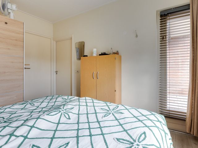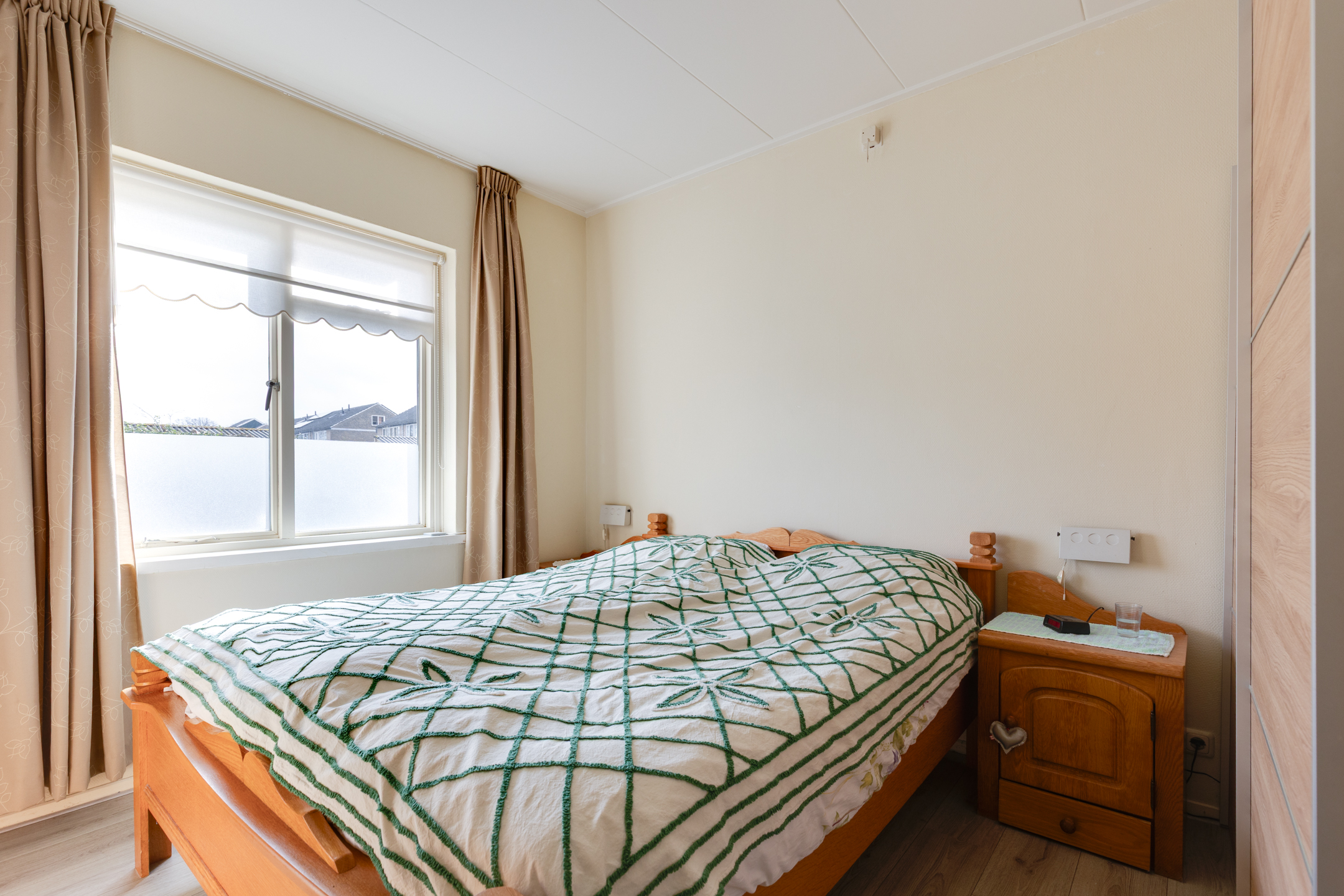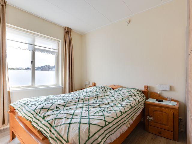 De slaapkamer op de begane grond is bereikbaar via de woonkamer en deze beschikt over een tuindeur naar het terras aan de voorzijde van de woning.