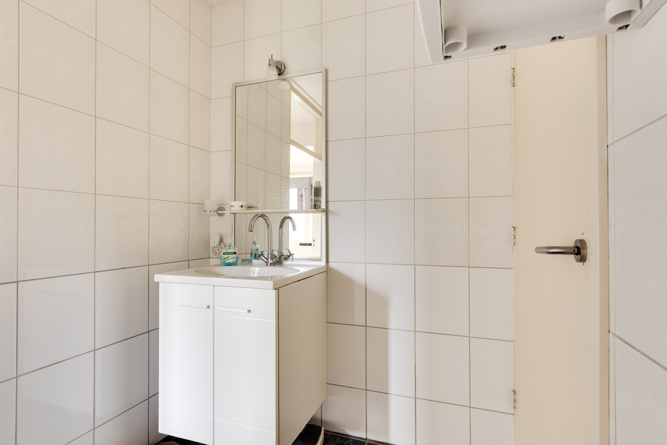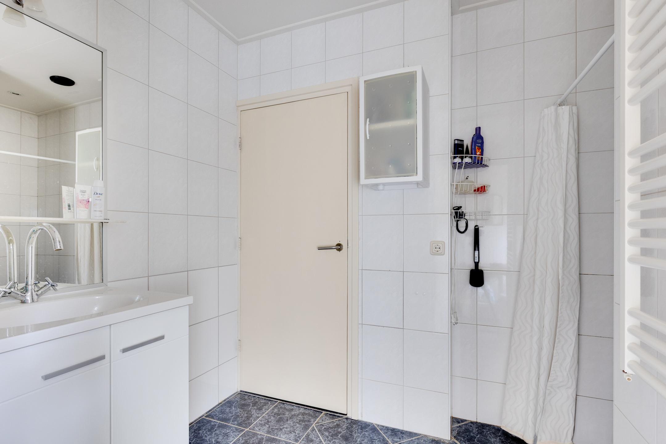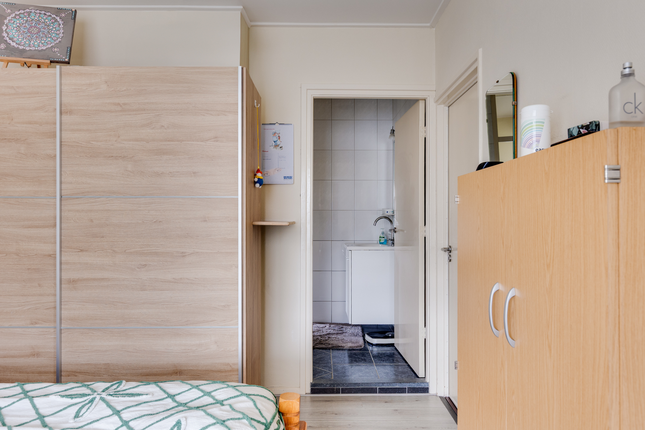 De badkamer met wastafelmeubel en inloopdouche is zowel vanuit de slaapkamer als de hal toegankelijk.