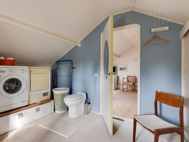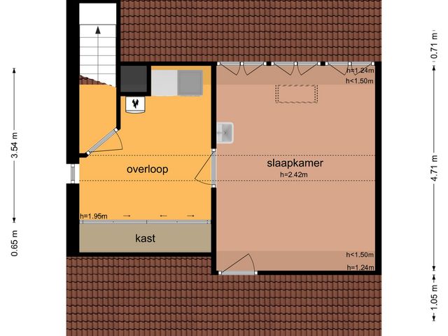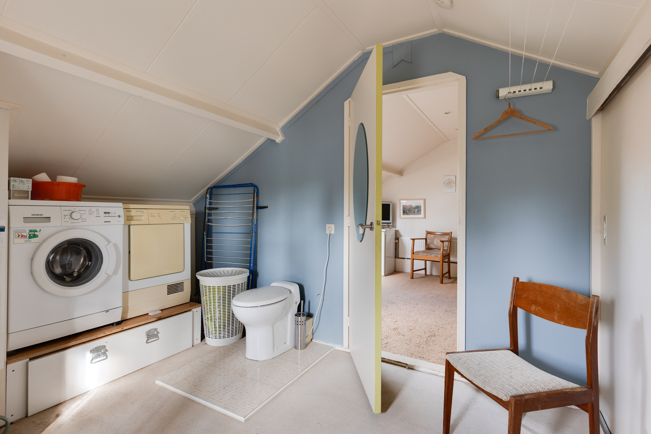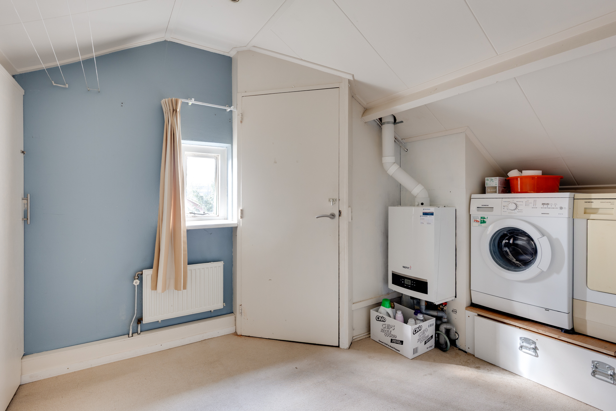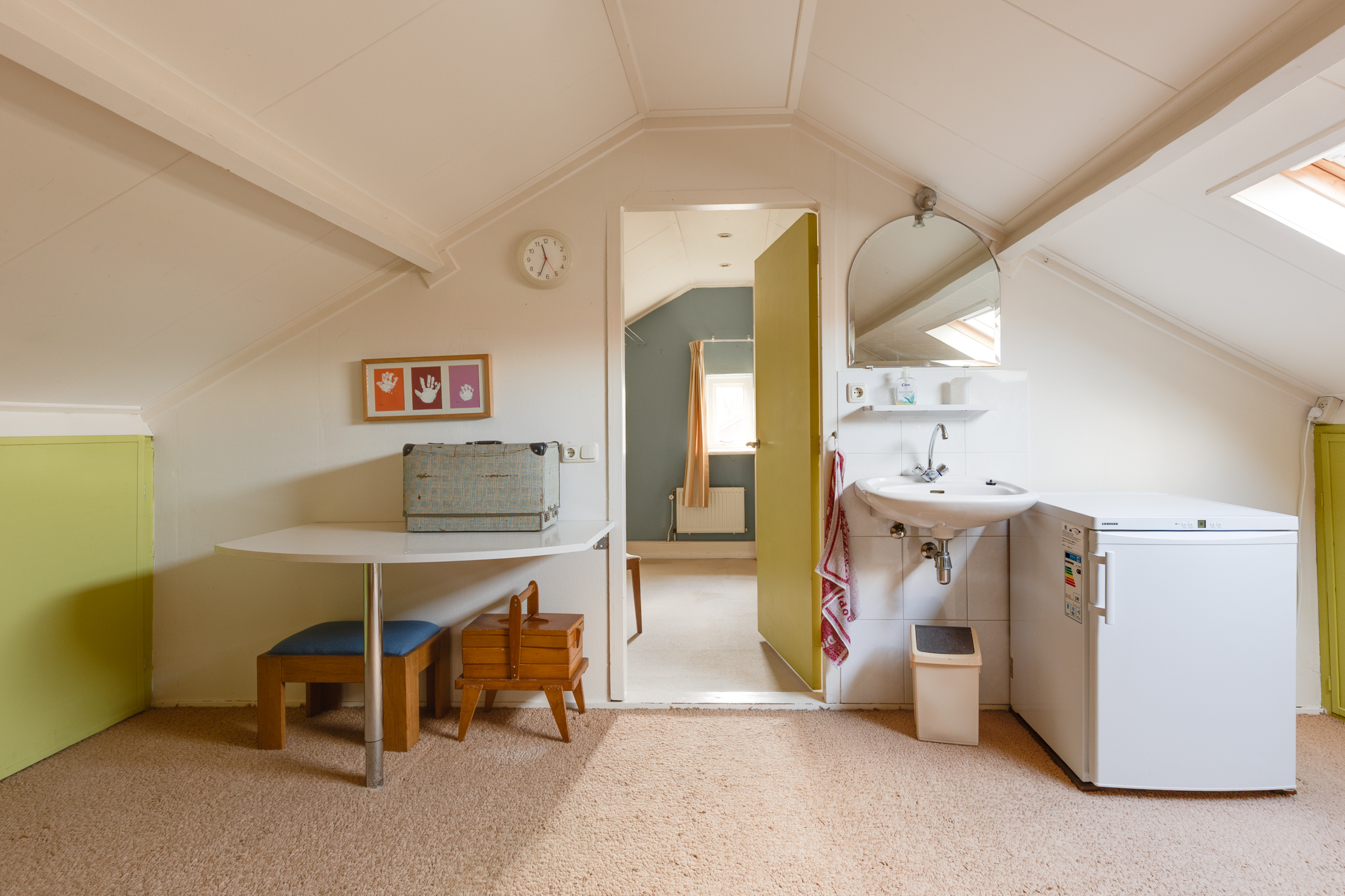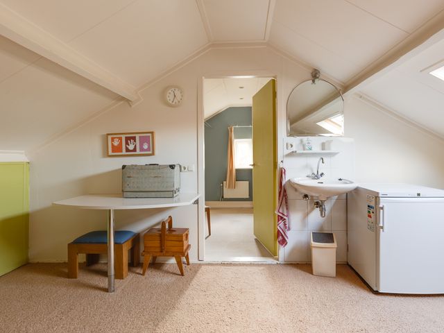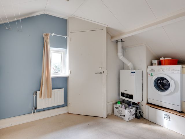 Verdieping: Overloop met schuifkastenwand en opstelling cv-ketel. Ook zijn hier een elektrisch toilet en de wasmachine en -droger geplaatst. Via de overloop is er toegang tot de slaapkamer met vaste wastafel, kastruimte achter schuine kant en dakraam.