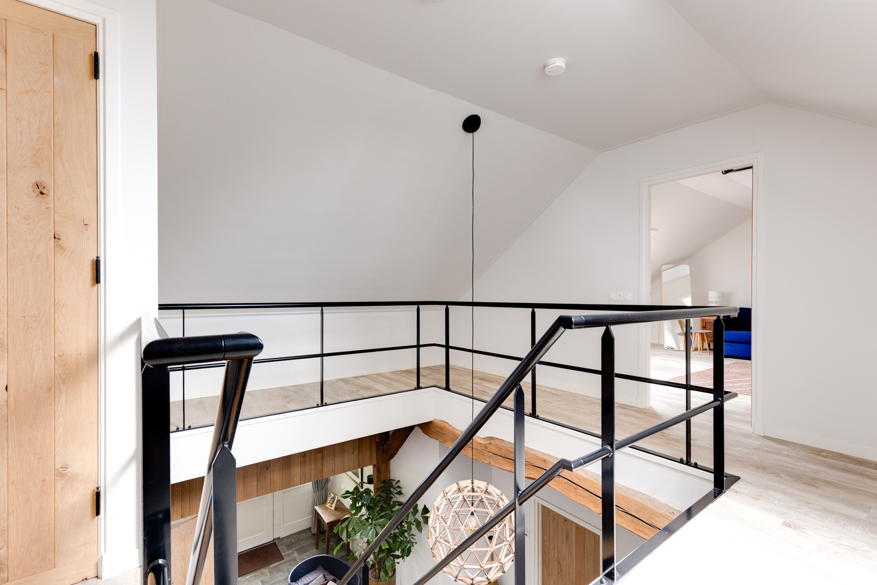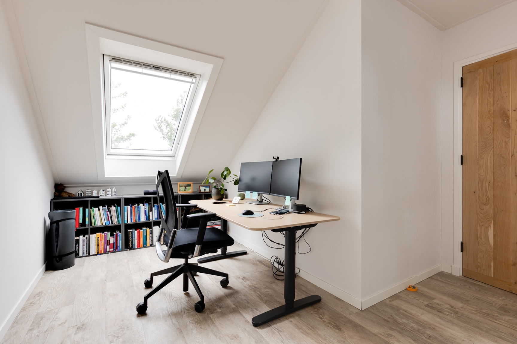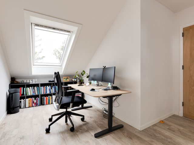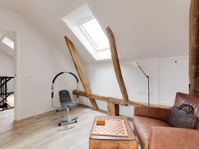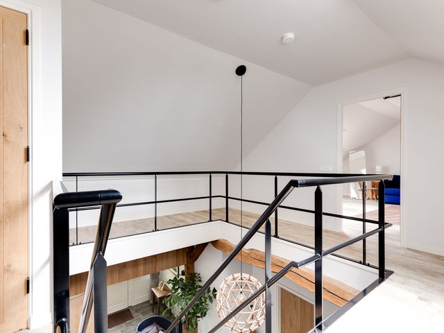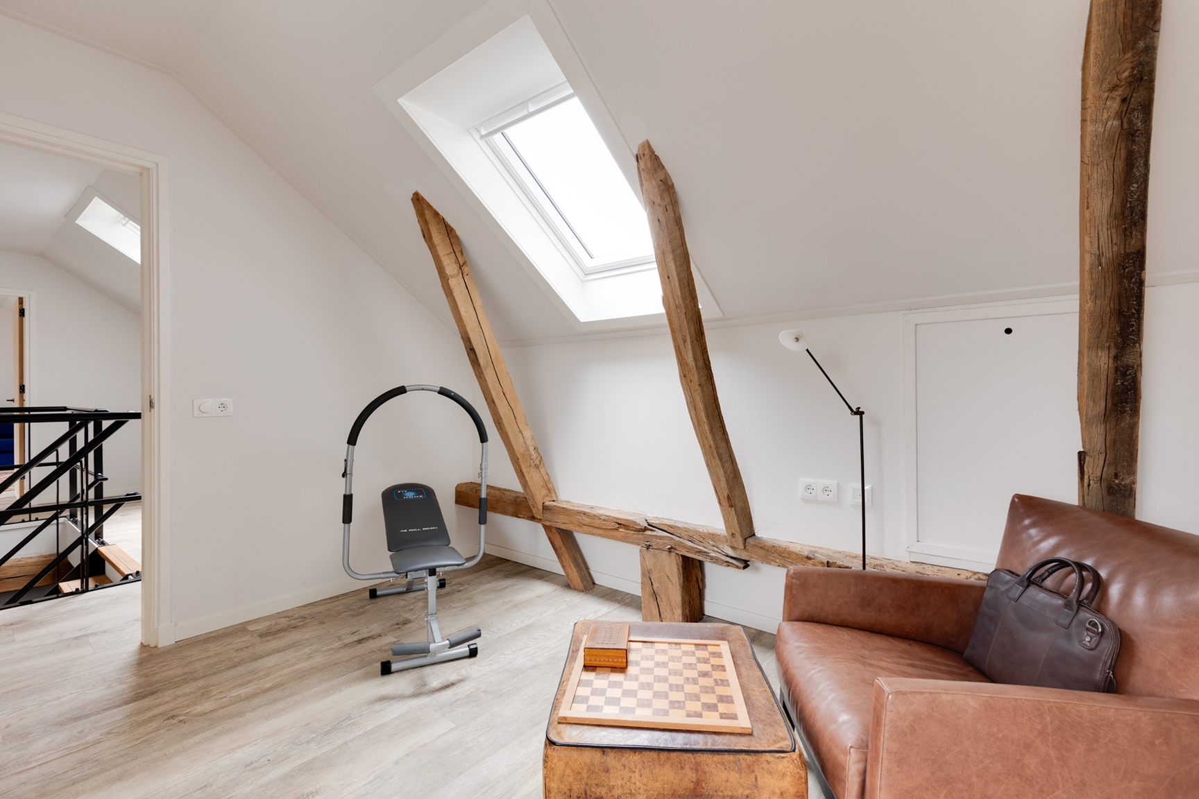 Verdieping: Via de trapopgang in de hal is er toegang tot de vide. Hoewel de trap en balustrade modern zijn uitgevoerd past deze perfect in deze prachtig verbouwde woning. De vide biedt toegang tot 2 slaapkamers en een badkamer. Eén van de slaapkamers is momenteel in gebruik als kantoor. De badkamer is voorzien van een inloopdouche, wastafel en wandcloset. Door de in totaal 6 dakramen is er ook op deze etage een overvloed aan natuurlijk daglicht.