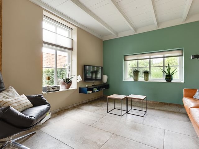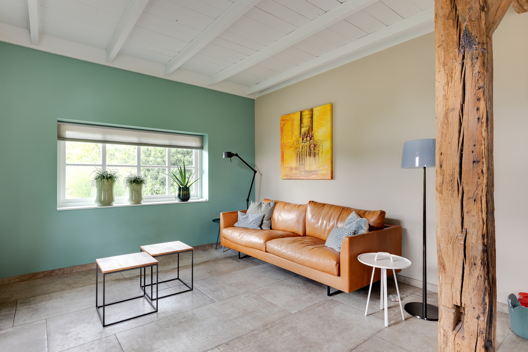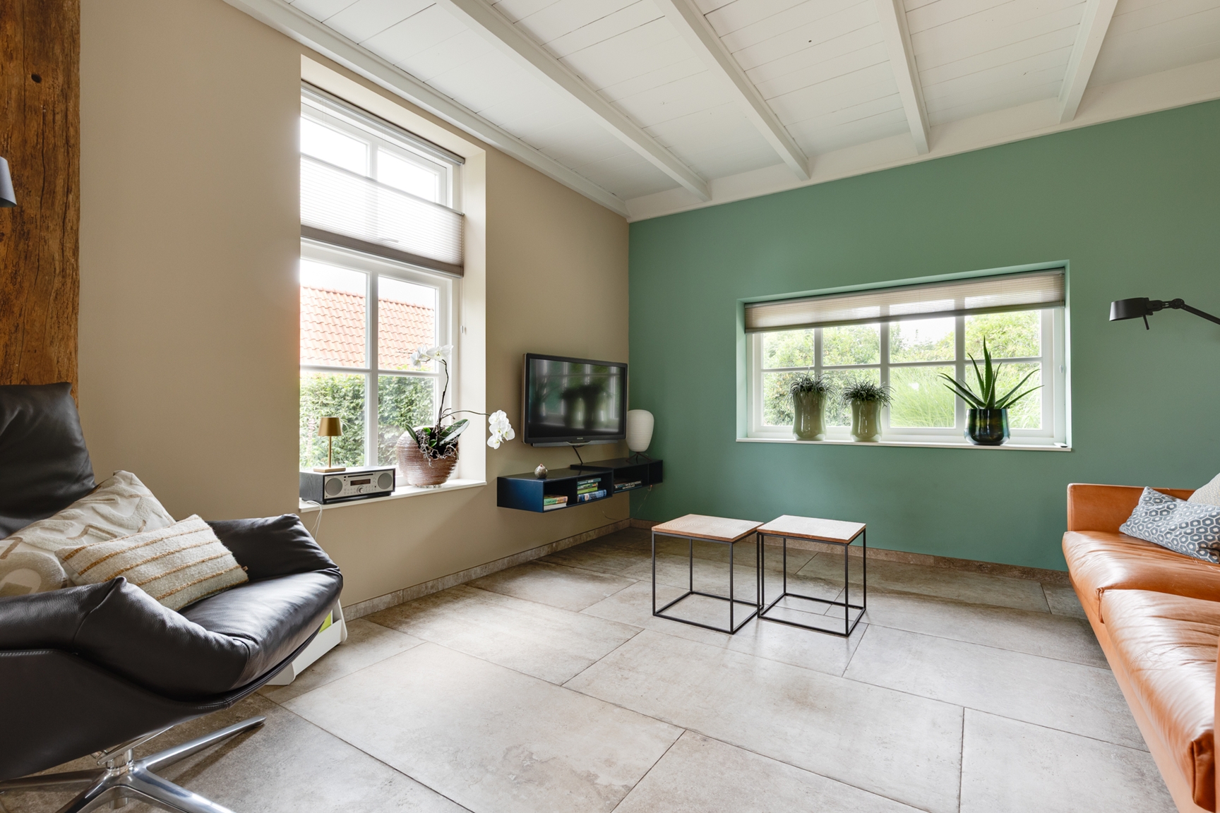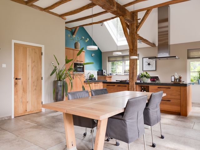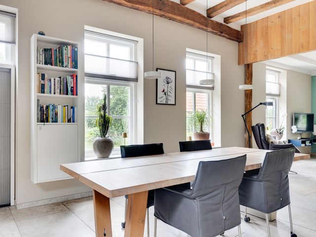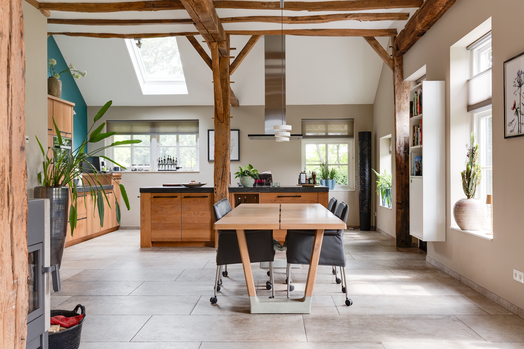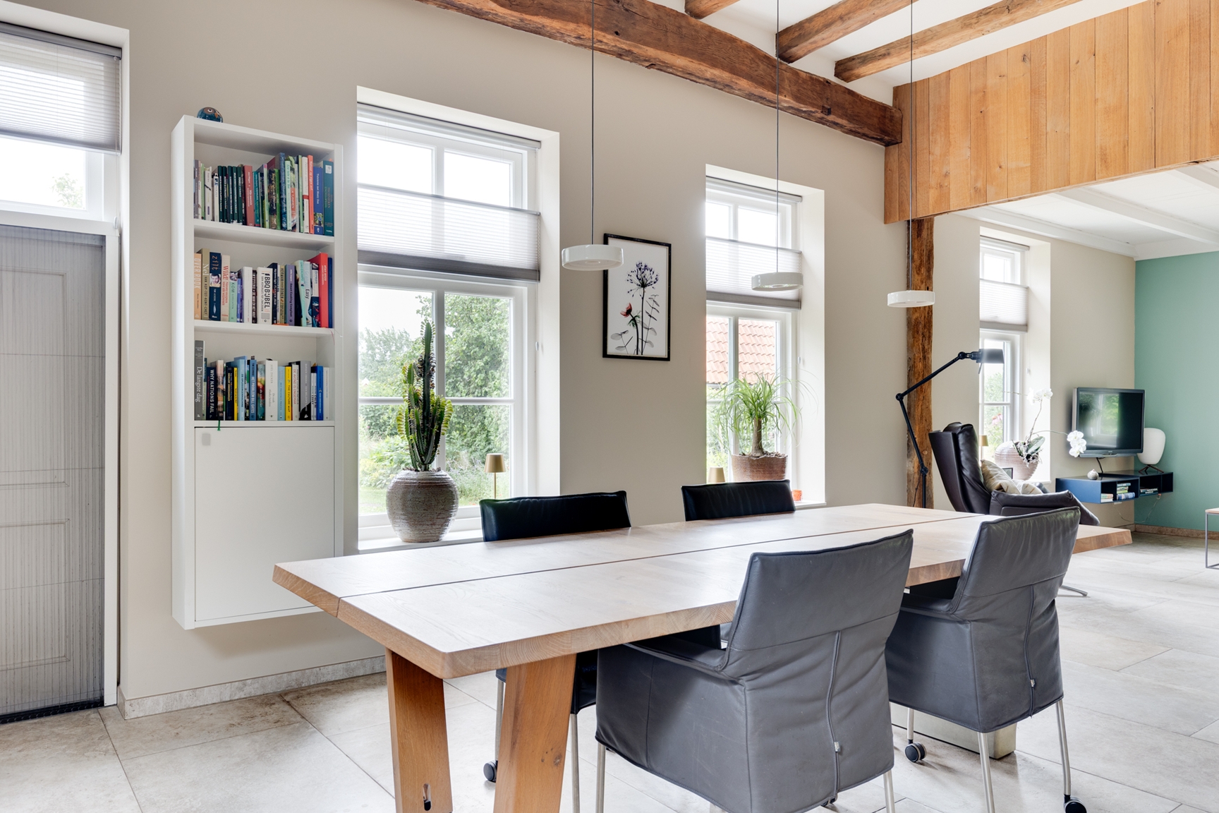 Aan de linkerzijde bevindt zich de deur naar de living met zit- en eethoek. Door de dakramen is deze ruimte heerlijk licht. Zoals in de gehele woning zijn ook in de living de oude eikenhouten gebinten en balken zichtbaar en deze geven de woning veel sfeer. De woonkamer beschikt over een fraaie houtkachel en behoudens de deel/bijkeuken is de gehele begane grond voorzien van vloerverwarming.