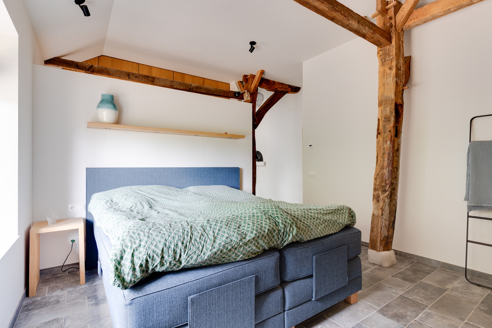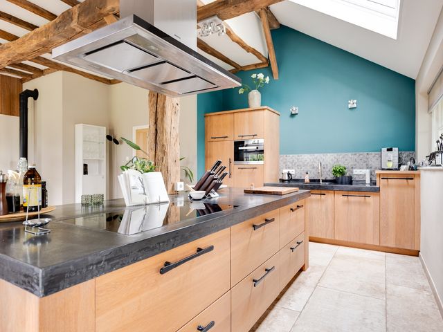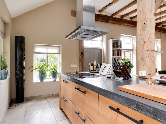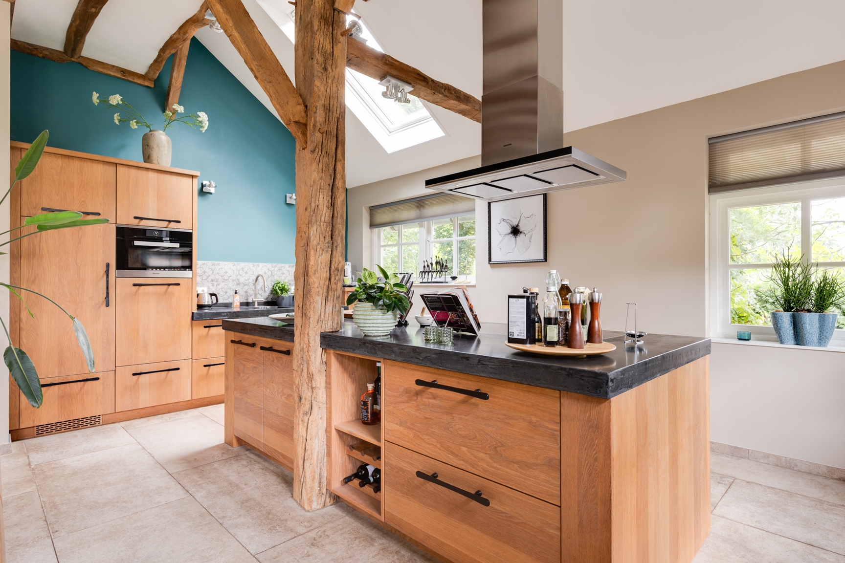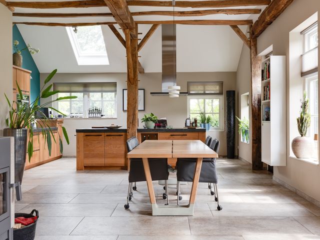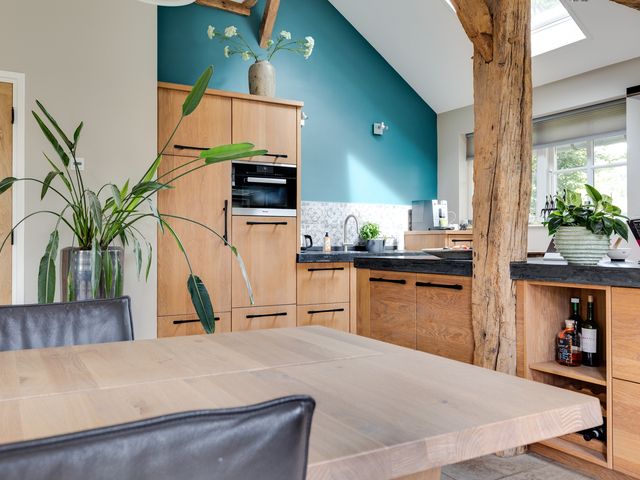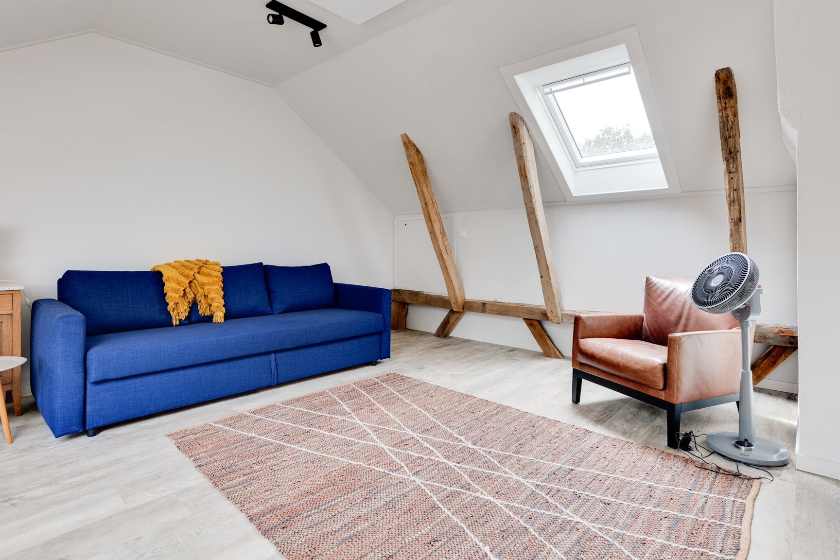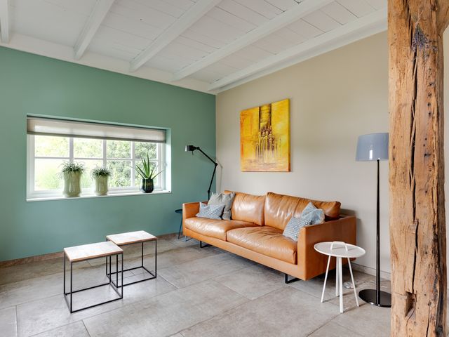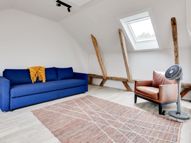 Aan de linkerzijde bevindt zich de deur naar de living met zit- en eethoek. Door de dakramen is deze ruimte heerlijk licht. Zoals in de gehele woning zijn ook in de living de oude eikenhouten gebinten en balken zichtbaar en deze geven de woning veel sfeer. De woonkamer beschikt over een fraaie houtkachel en behoudens de deel/bijkeuken is de gehele begane grond voorzien van vloerverwarming.