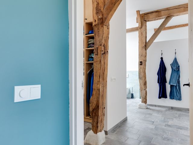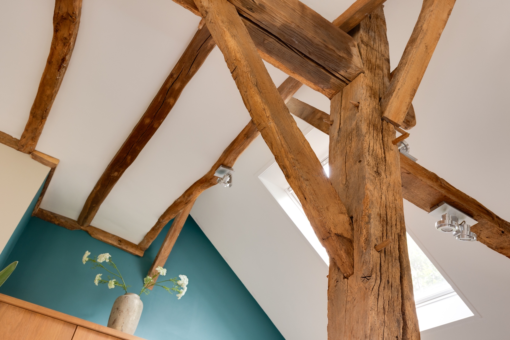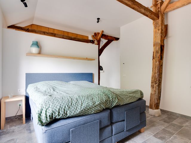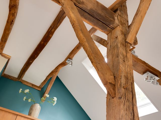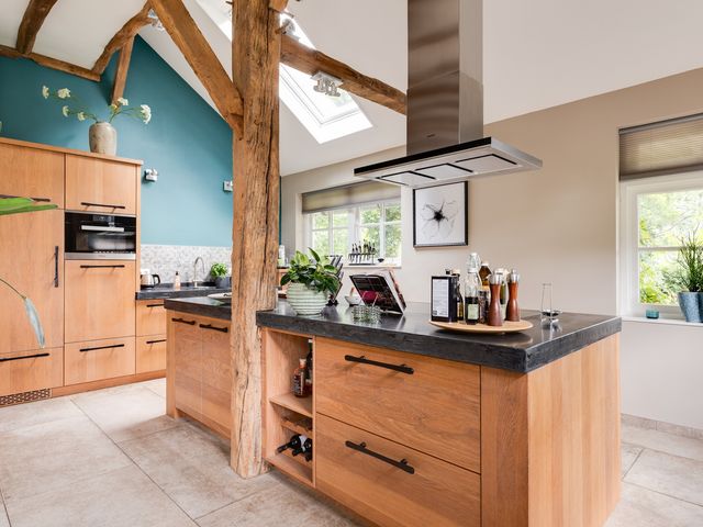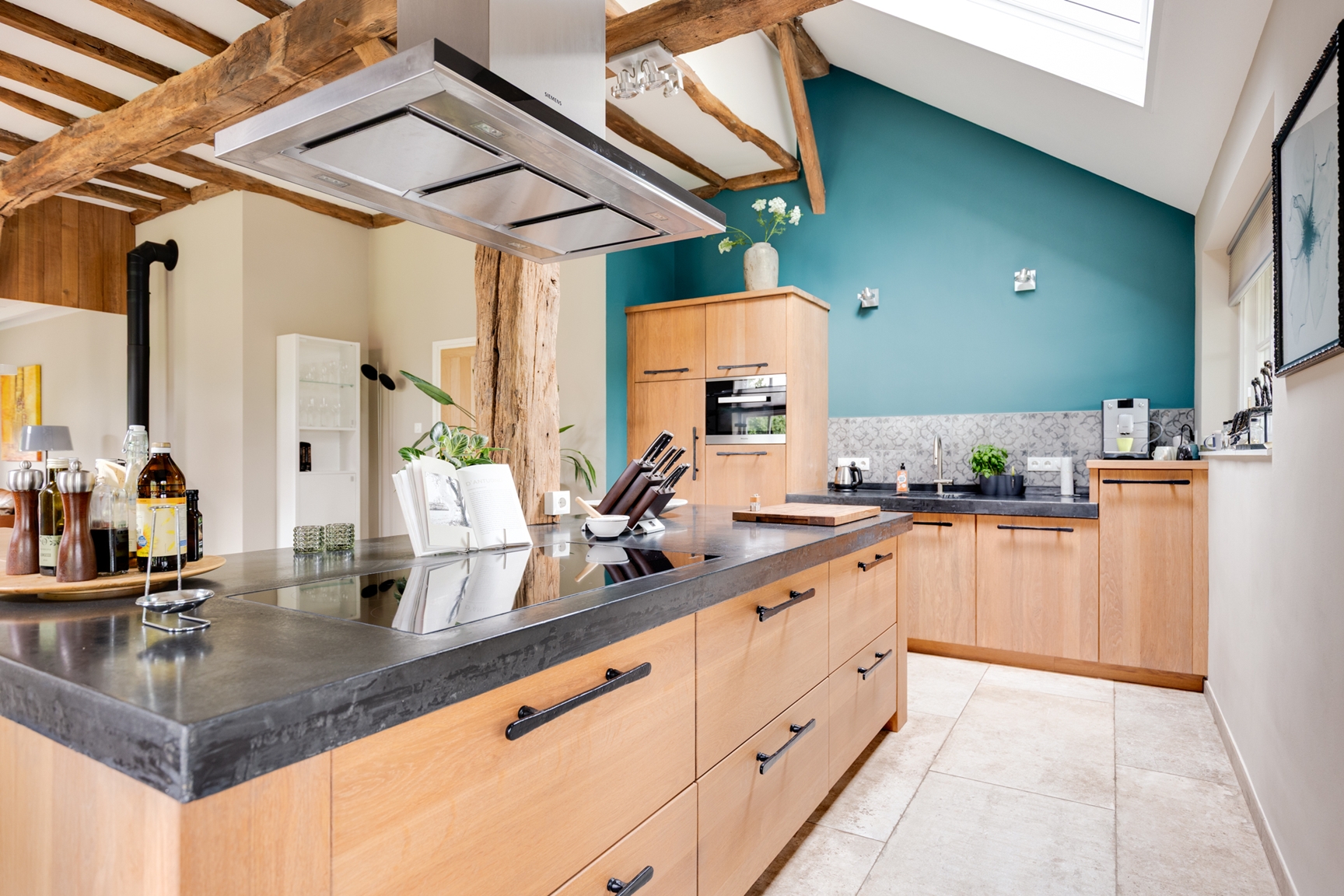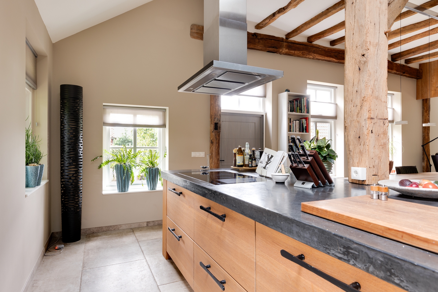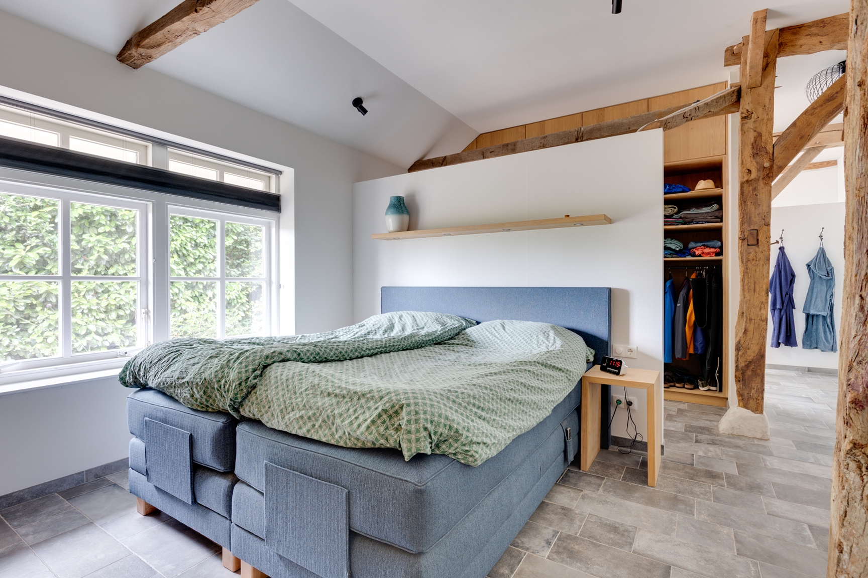 Aan de linkerzijde bevindt zich de deur naar de living met zit- en eethoek. Door de dakramen is deze ruimte heerlijk licht. Zoals in de gehele woning zijn ook in de living de oude eikenhouten gebinten en balken zichtbaar en deze geven de woning veel sfeer. De woonkamer beschikt over een fraaie houtkachel en behoudens de deel/bijkeuken is de gehele begane grond voorzien van vloerverwarming.