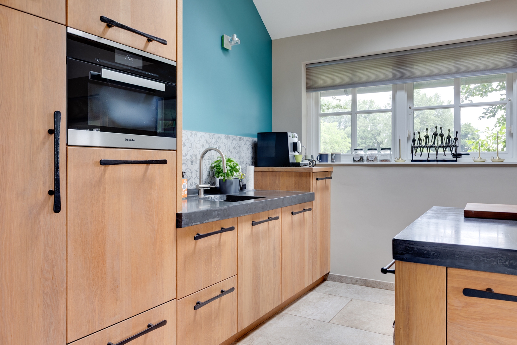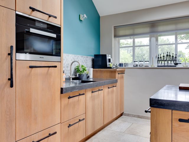 De open keuken met kookeiland beschikt over diverse inbouwapparatuur.