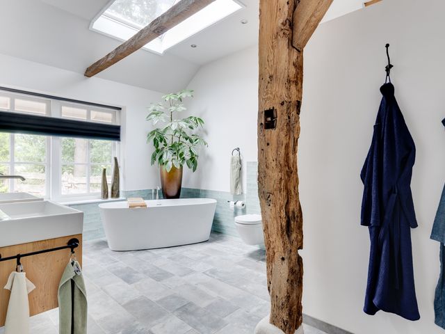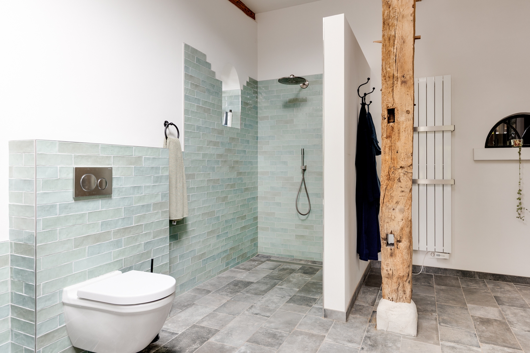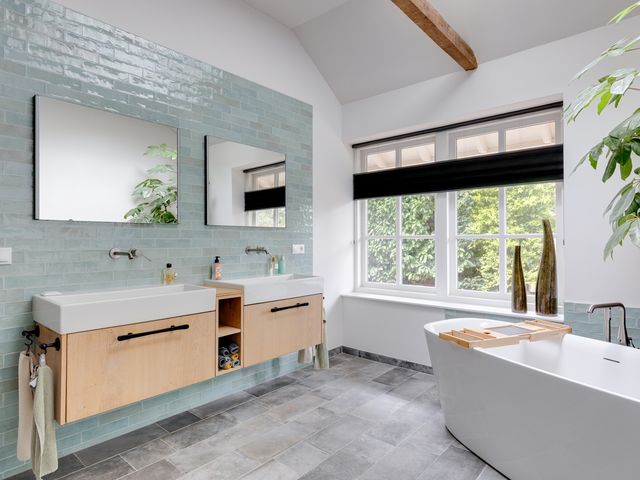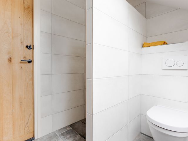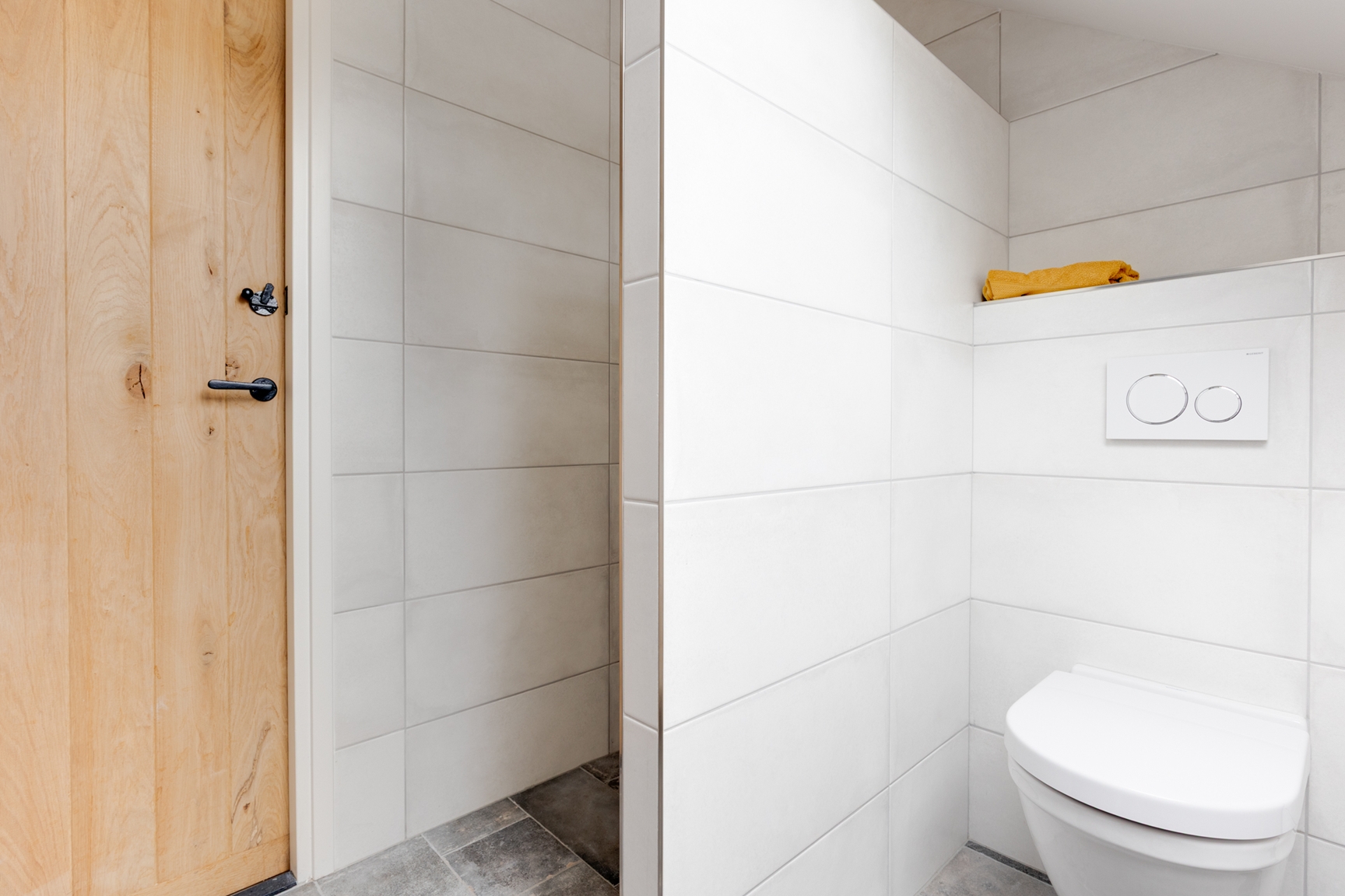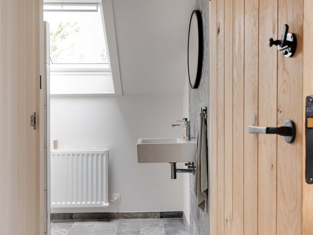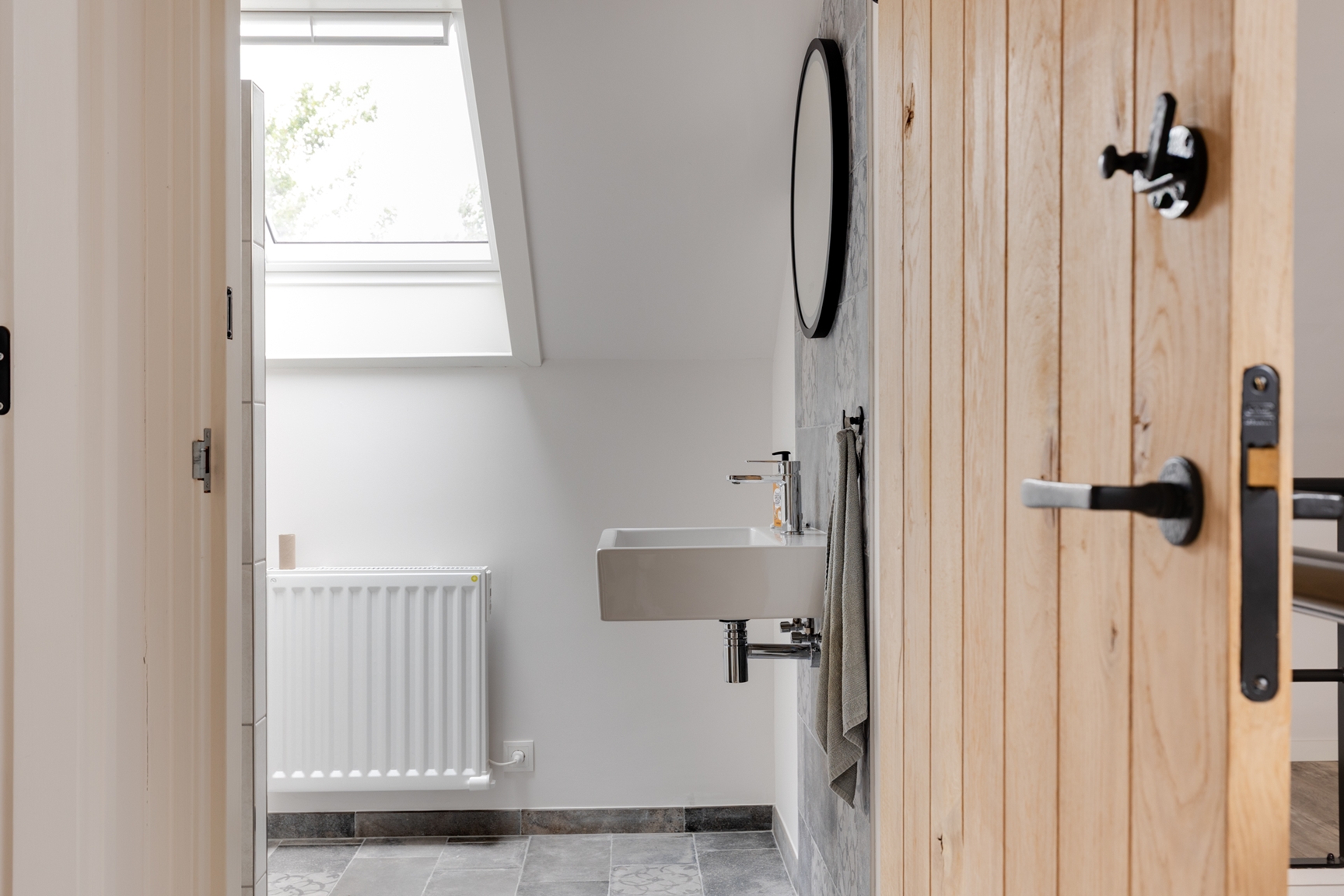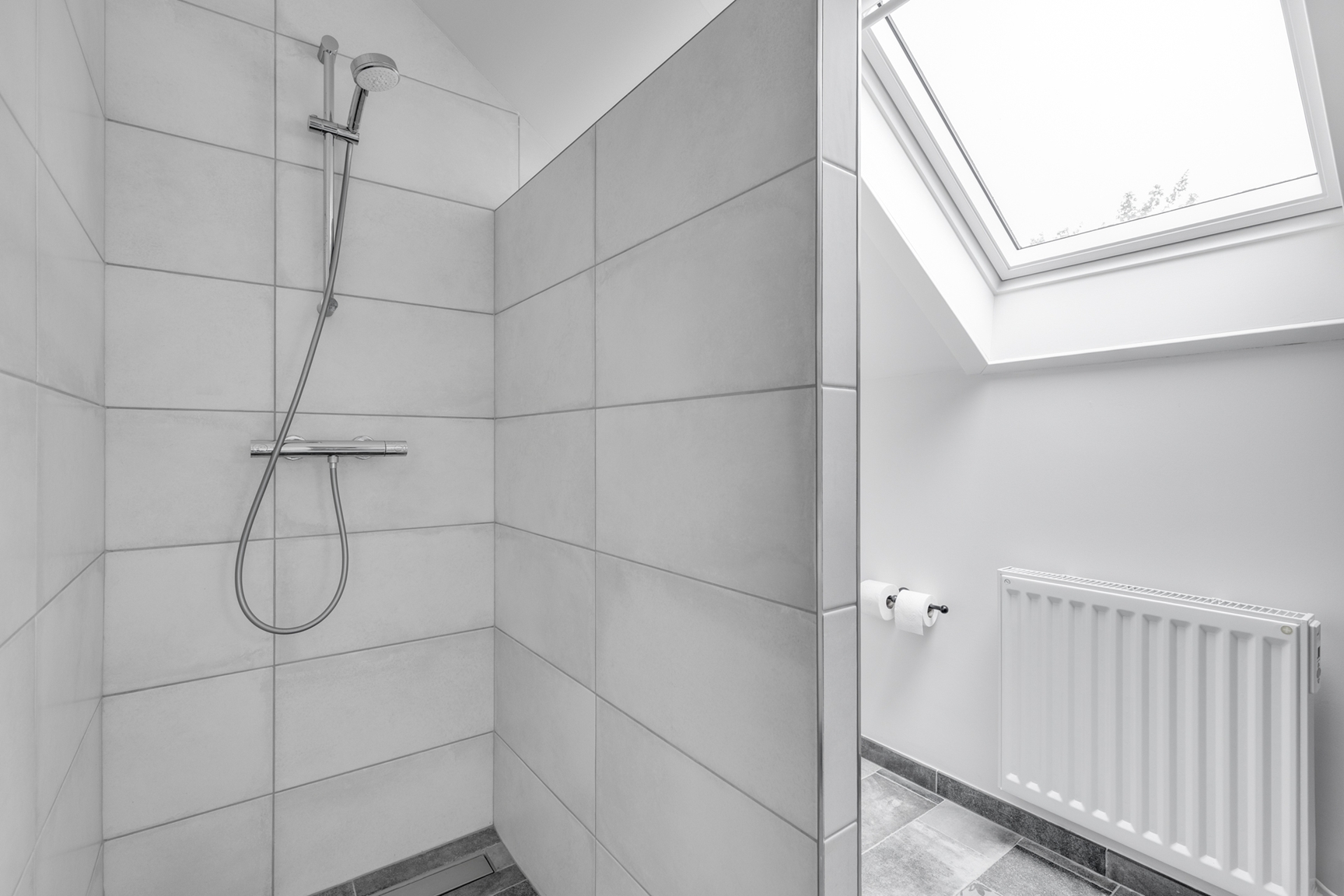 De badkamer is voorzien van een ligbad, inloopdouche, wandcloset en groot dubbel wastafelmeubel. Net als in keuken is hier een dakraam geplaatst zodat er veel natuurlijk licht binnenstroomt.