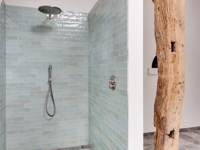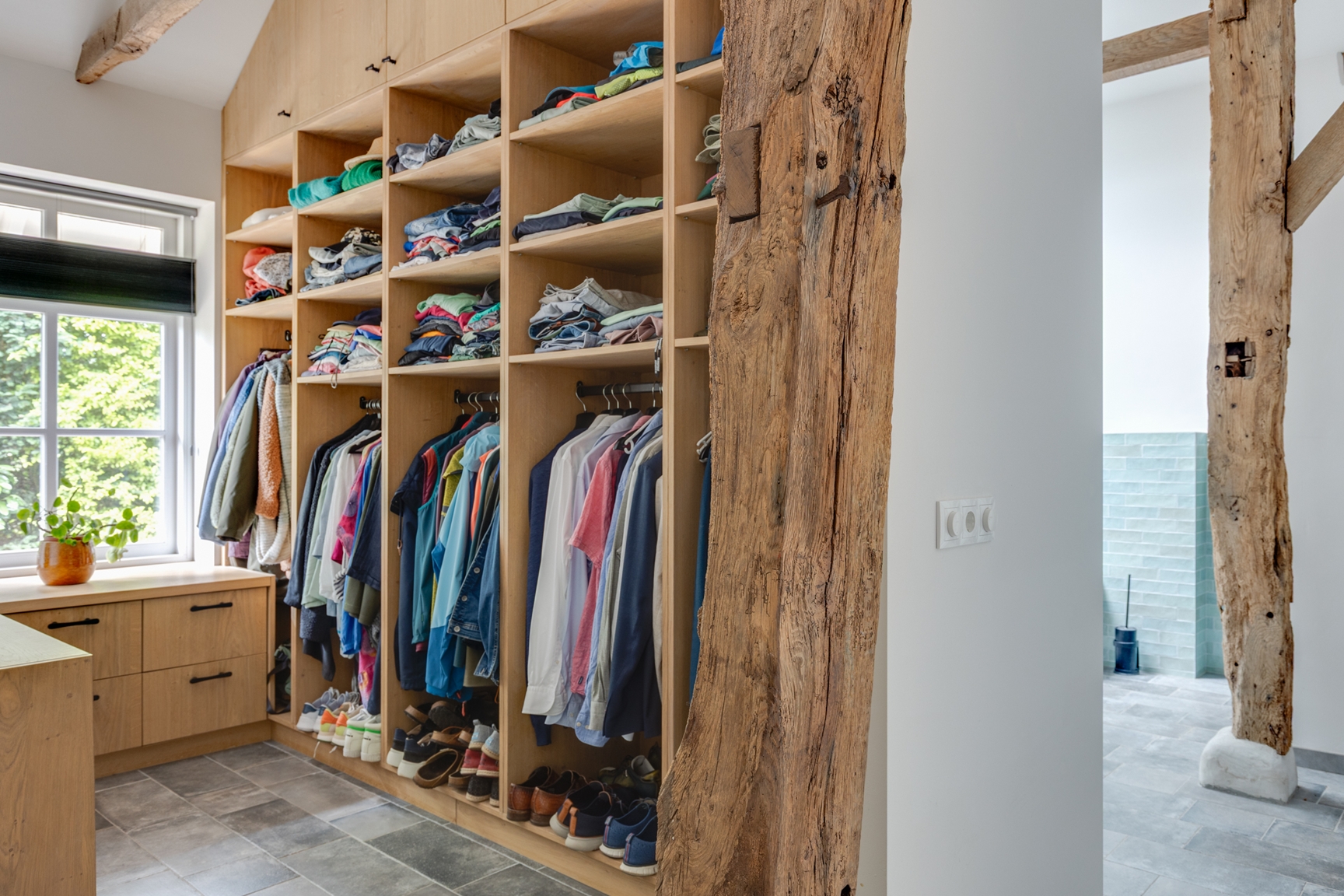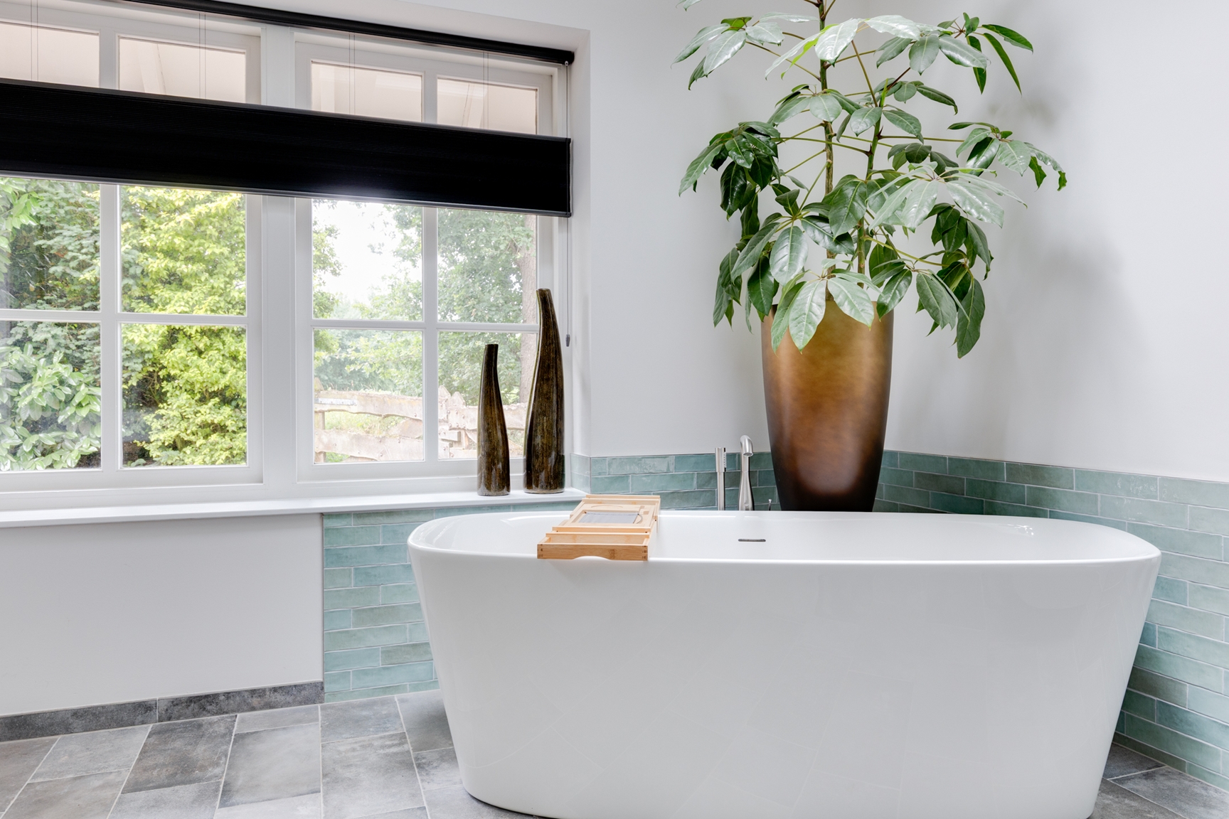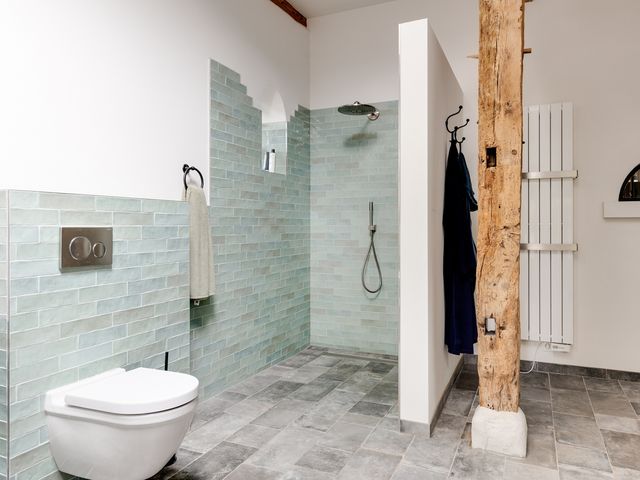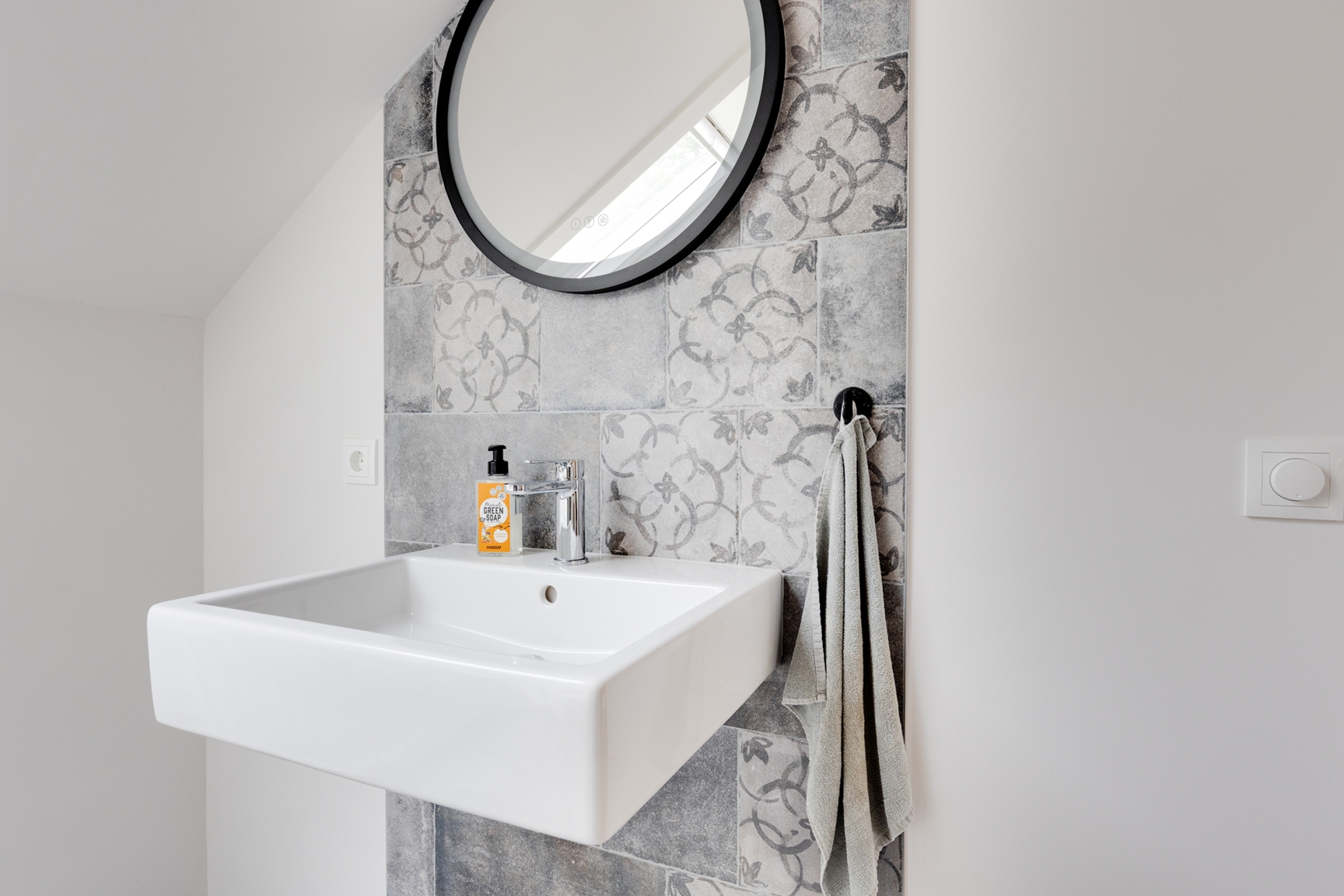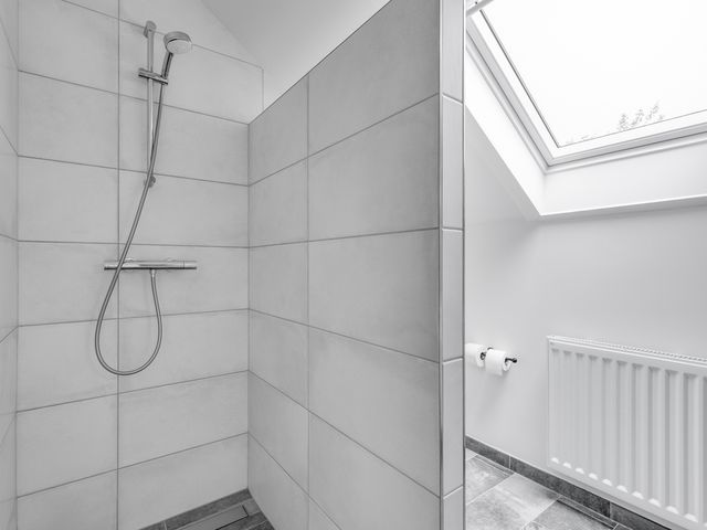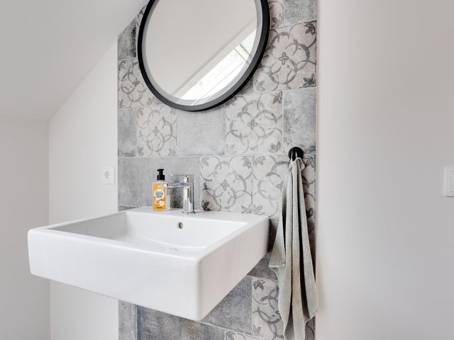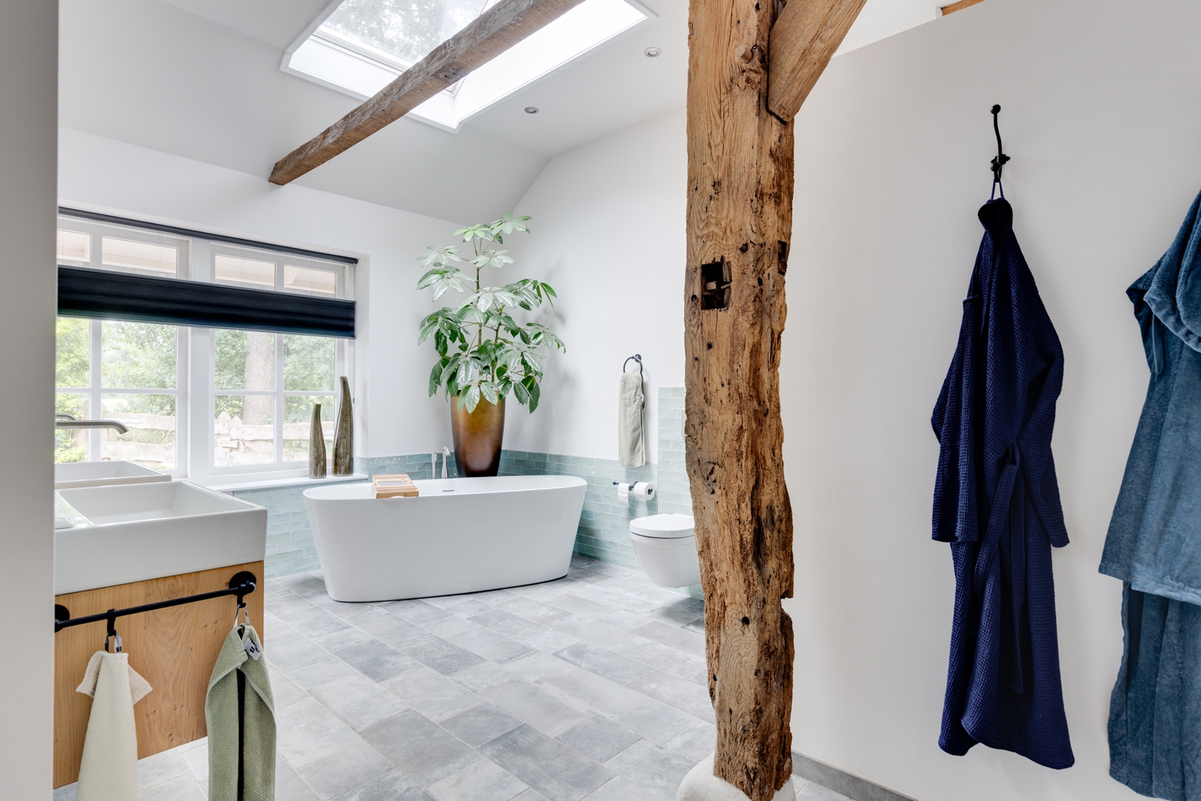 De badkamer is voorzien van een ligbad, inloopdouche, wandcloset en groot dubbel wastafelmeubel. Net als in keuken is hier een dakraam geplaatst zodat er veel natuurlijk licht binnenstroomt.