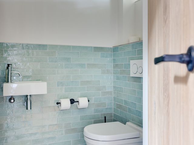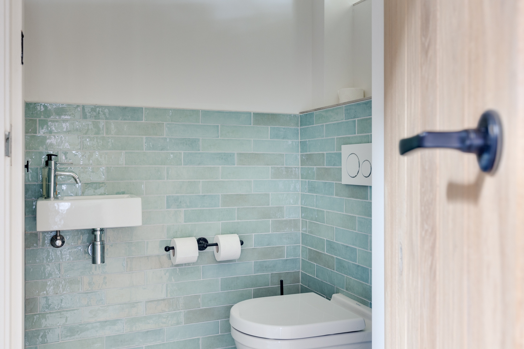 Bij binnenkomst treft u aan de rechterzijde de moderne toiletruimte met wandcloset en fonteintje.