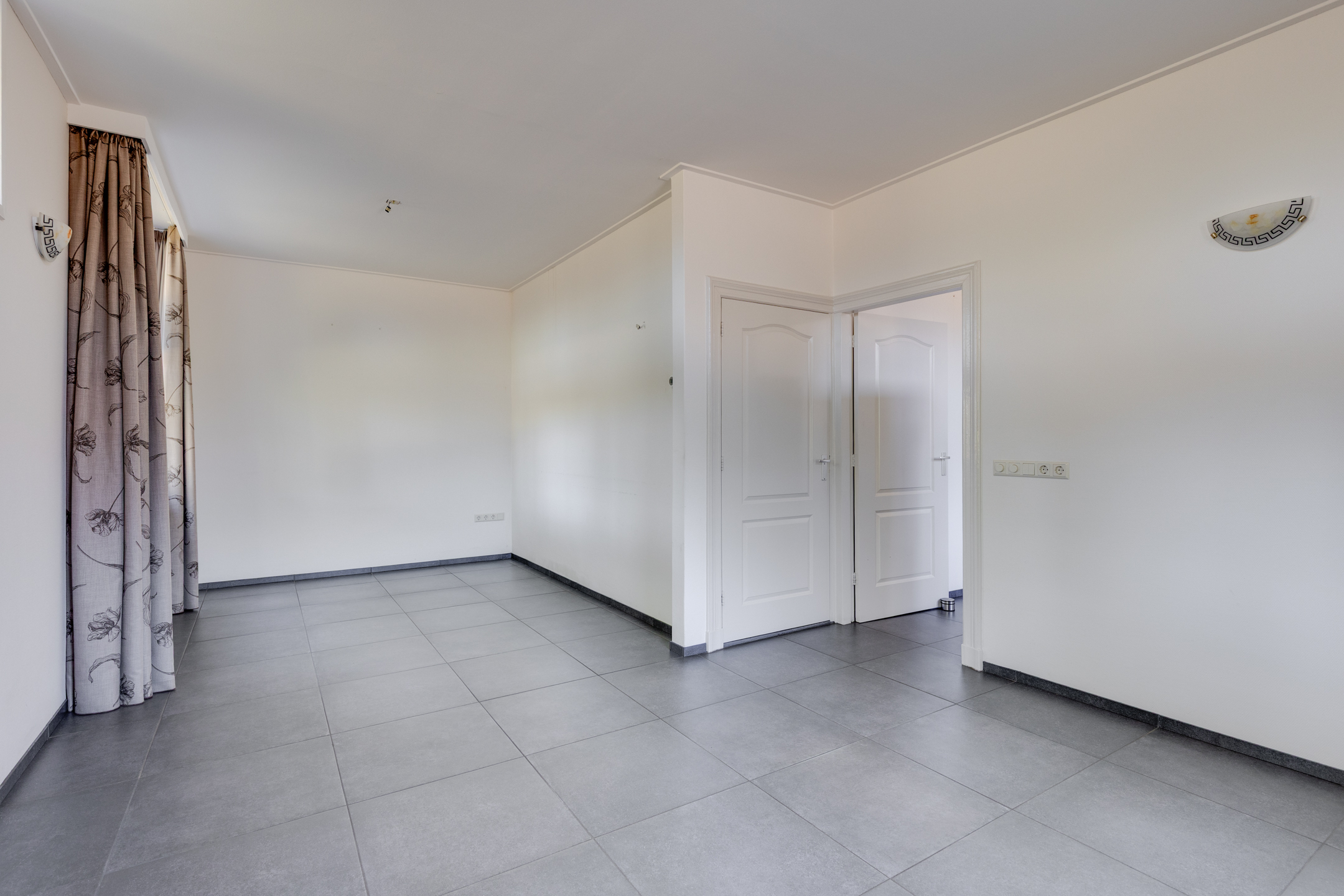 Vanuit de keuken is de woonkamer toegankelijk. De woonkamer strekt zich uit over de volle breedte van het huis en geniet dankzij de vier raampartijen van een veel lichtinval.