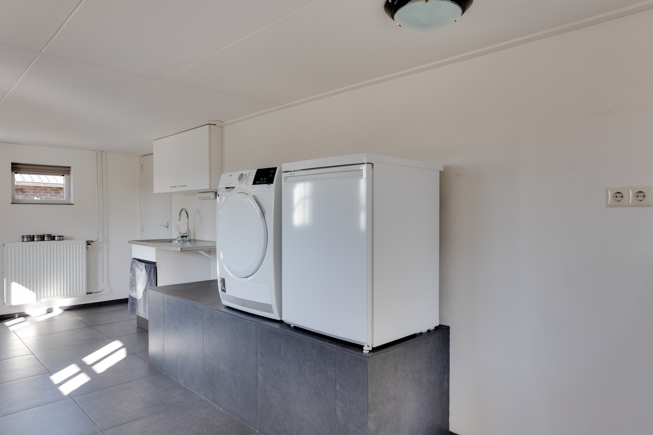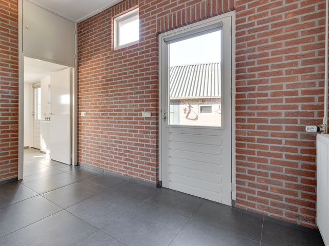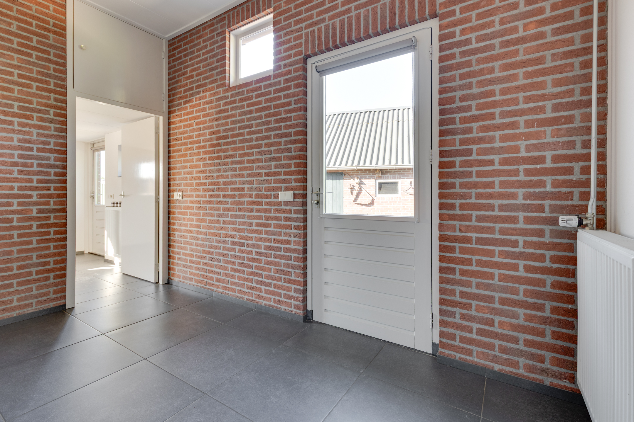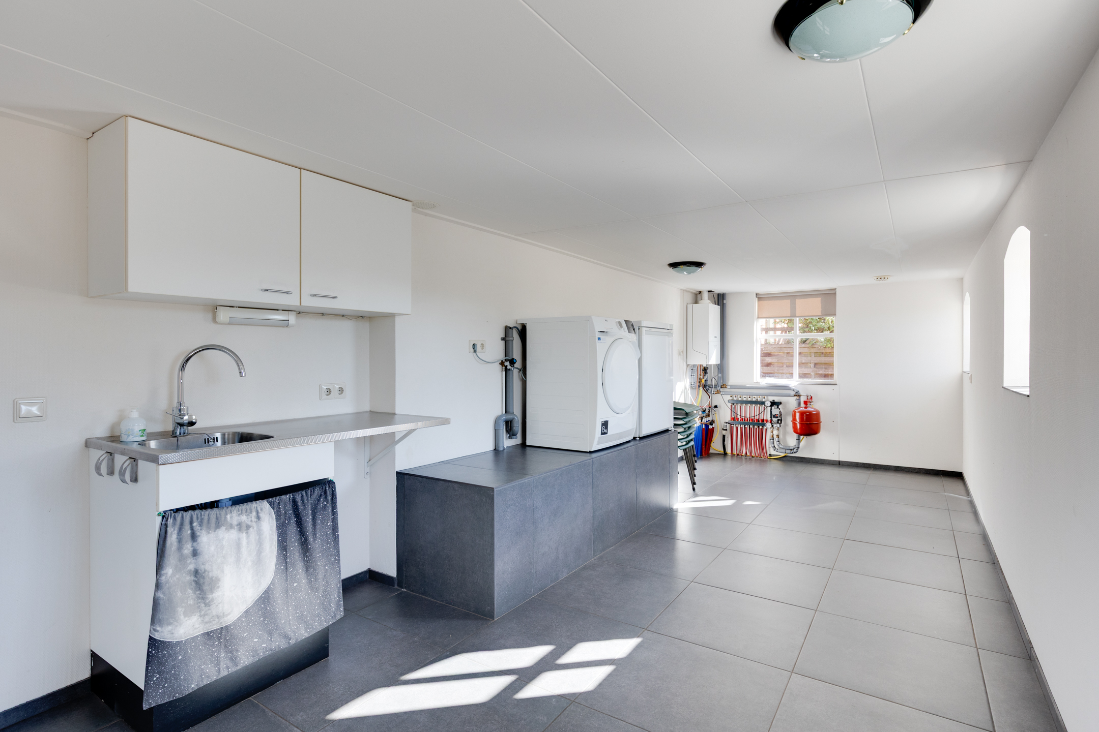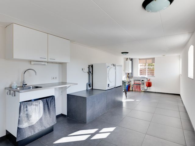Begane grond: De woning is aan de zijkant toegankelijk via de entree/hal. Bij binnenkomst bevindt zich aan de rechterzijde de deur naar de grote bijkeuken welke aan de achterzijde van de woning is gesitueerd. De bijkeuken beschikt o.a. over een aansluiting voor wasmachine en -droger (op hoogte), een aanrechtblokje met wasbak en de opstelling van de cv-installatie en verdeler t.b.v. vloerverwarming. In de hal rechtdoor is er toegang tot de centrale hal. Vanuit deze hal zijn de toiletruimte, de badkamer, slaapkamer, en trap naar 1e verdieping toegankelijk.