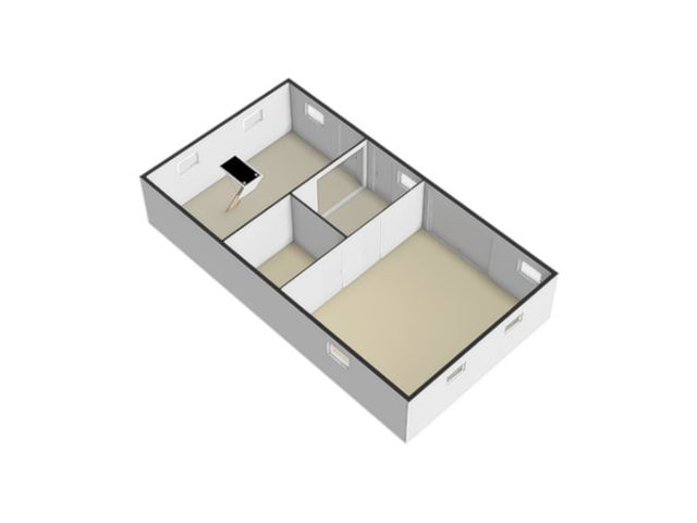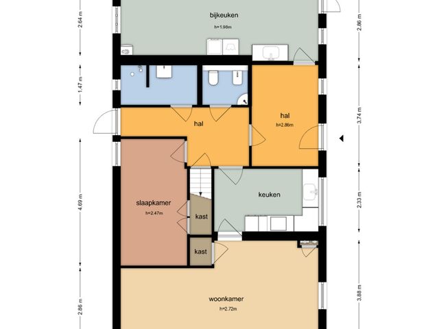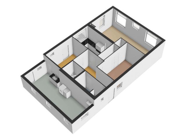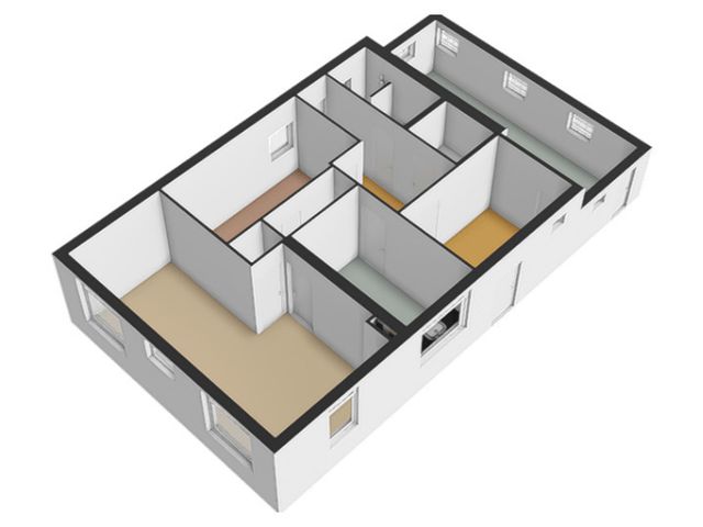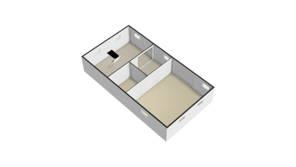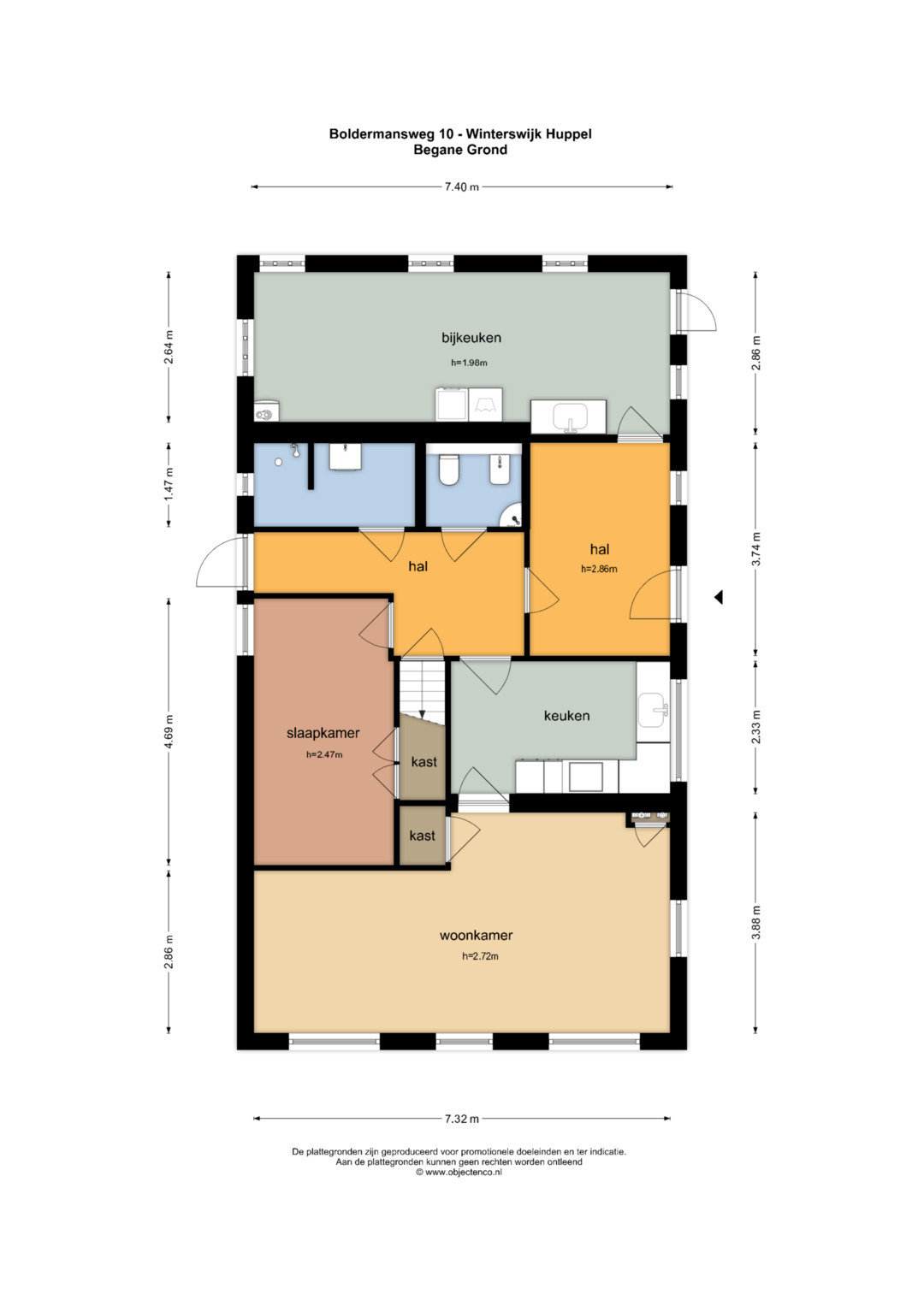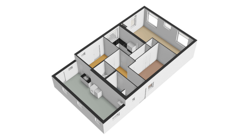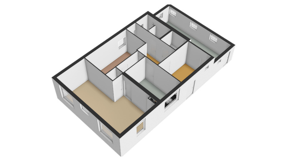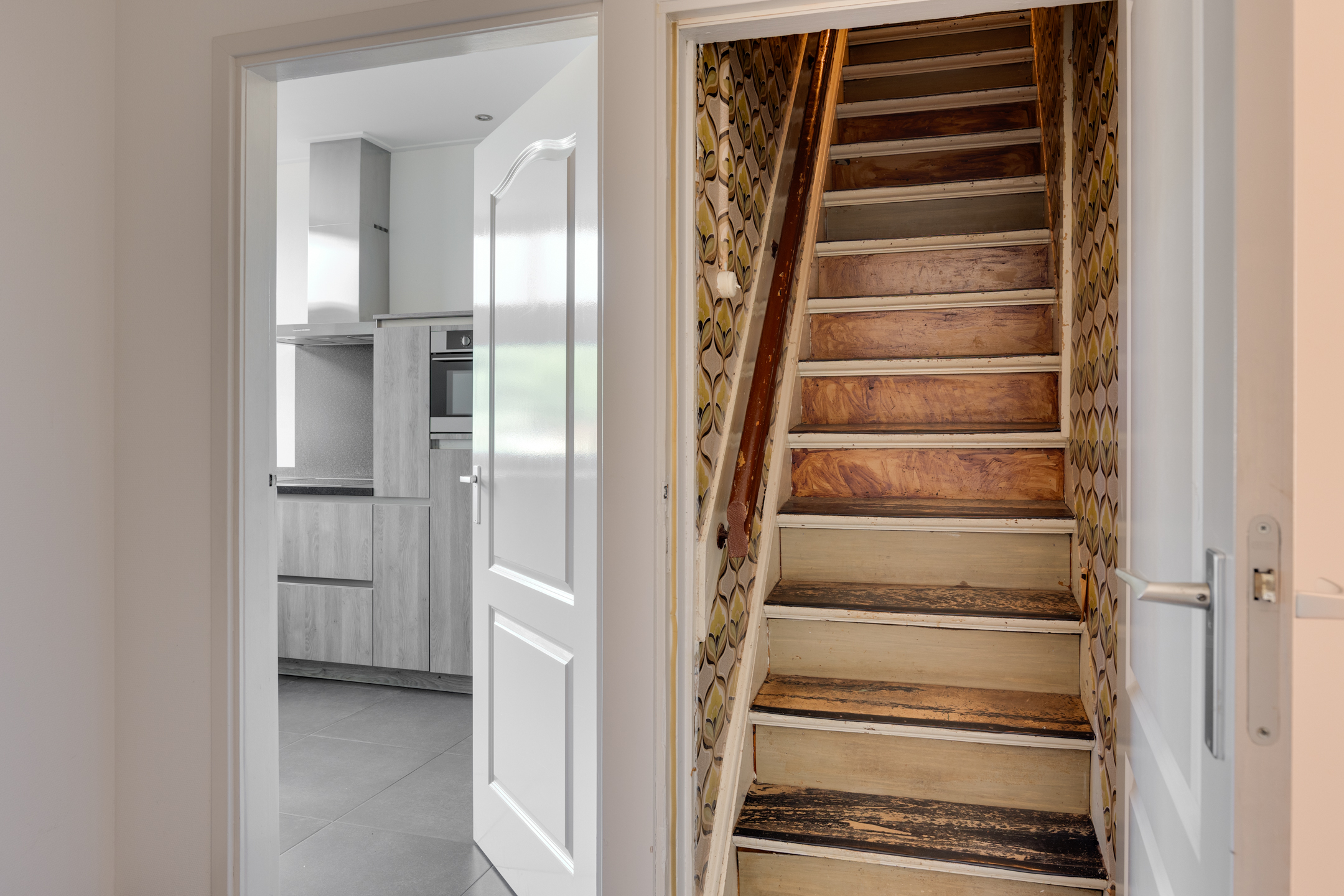 Begane grond: De woning is aan de zijkant toegankelijk via de entree/hal. Bij binnenkomst bevindt zich aan de rechterzijde de deur naar de grote bijkeuken welke aan de achterzijde van de woning is gesitueerd. De bijkeuken beschikt o.a. over een aansluiting voor wasmachine en -droger (op hoogte), een aanrechtblokje met wasbak en de opstelling van de cv-installatie en verdeler t.b.v. vloerverwarming. In de hal rechtdoor is er toegang tot de centrale hal. Vanuit deze hal zijn de toiletruimte, de badkamer, slaapkamer, en trap naar 1e verdieping toegankelijk.