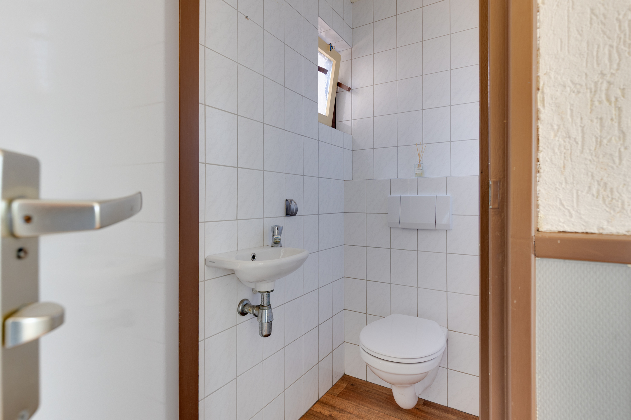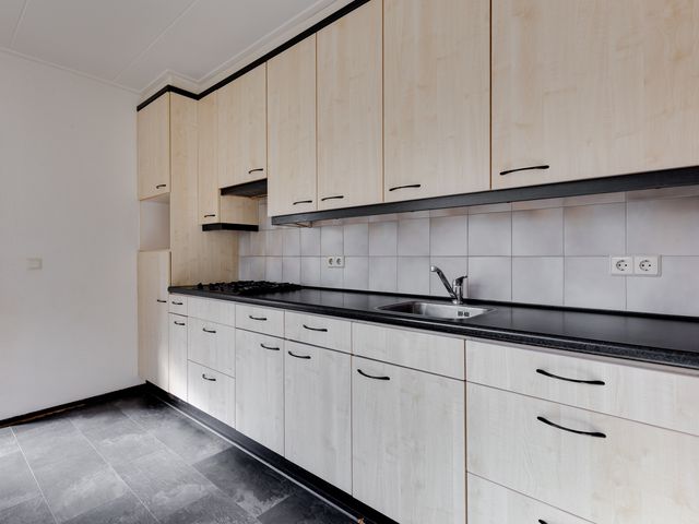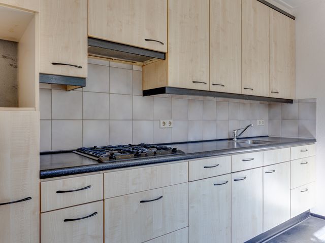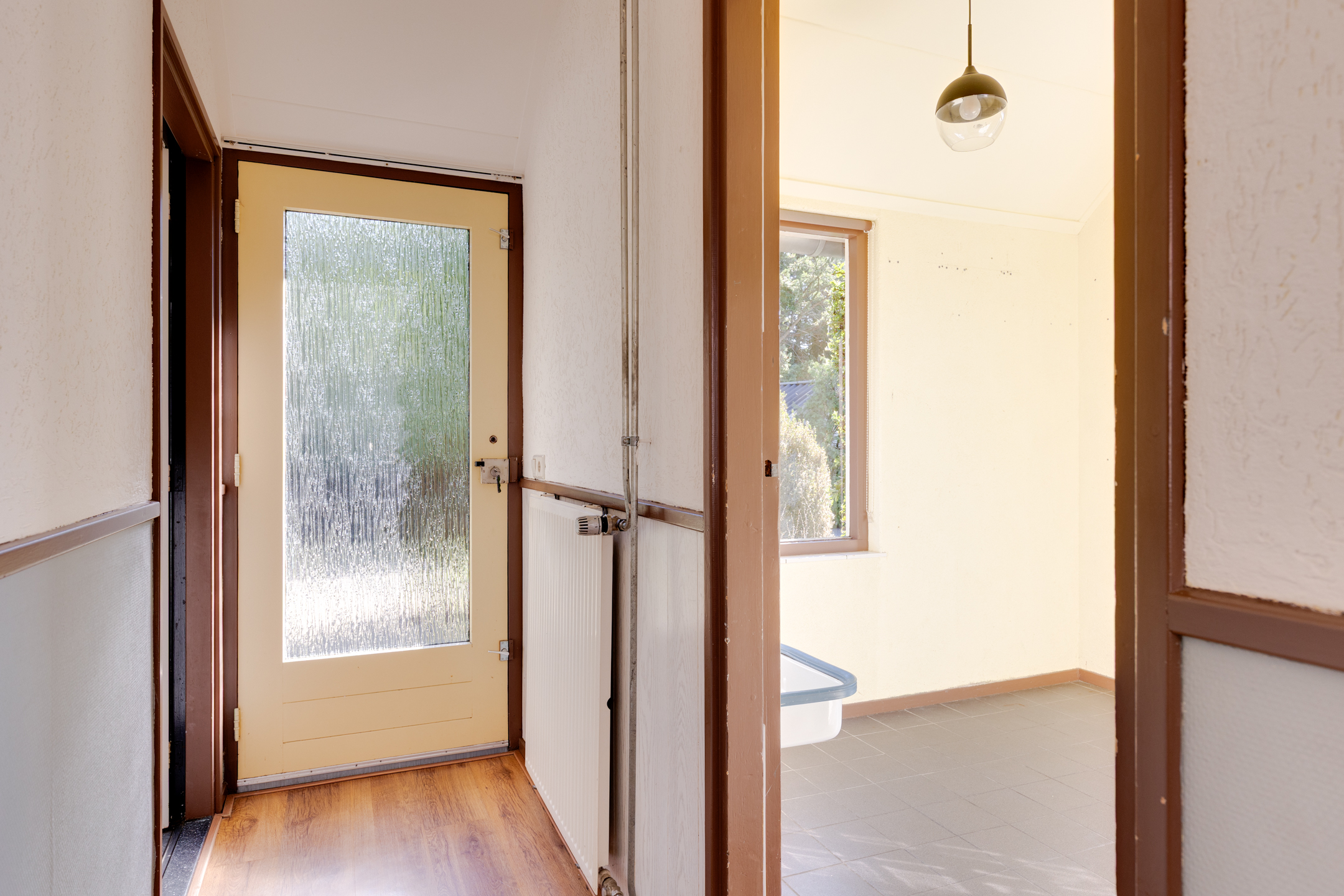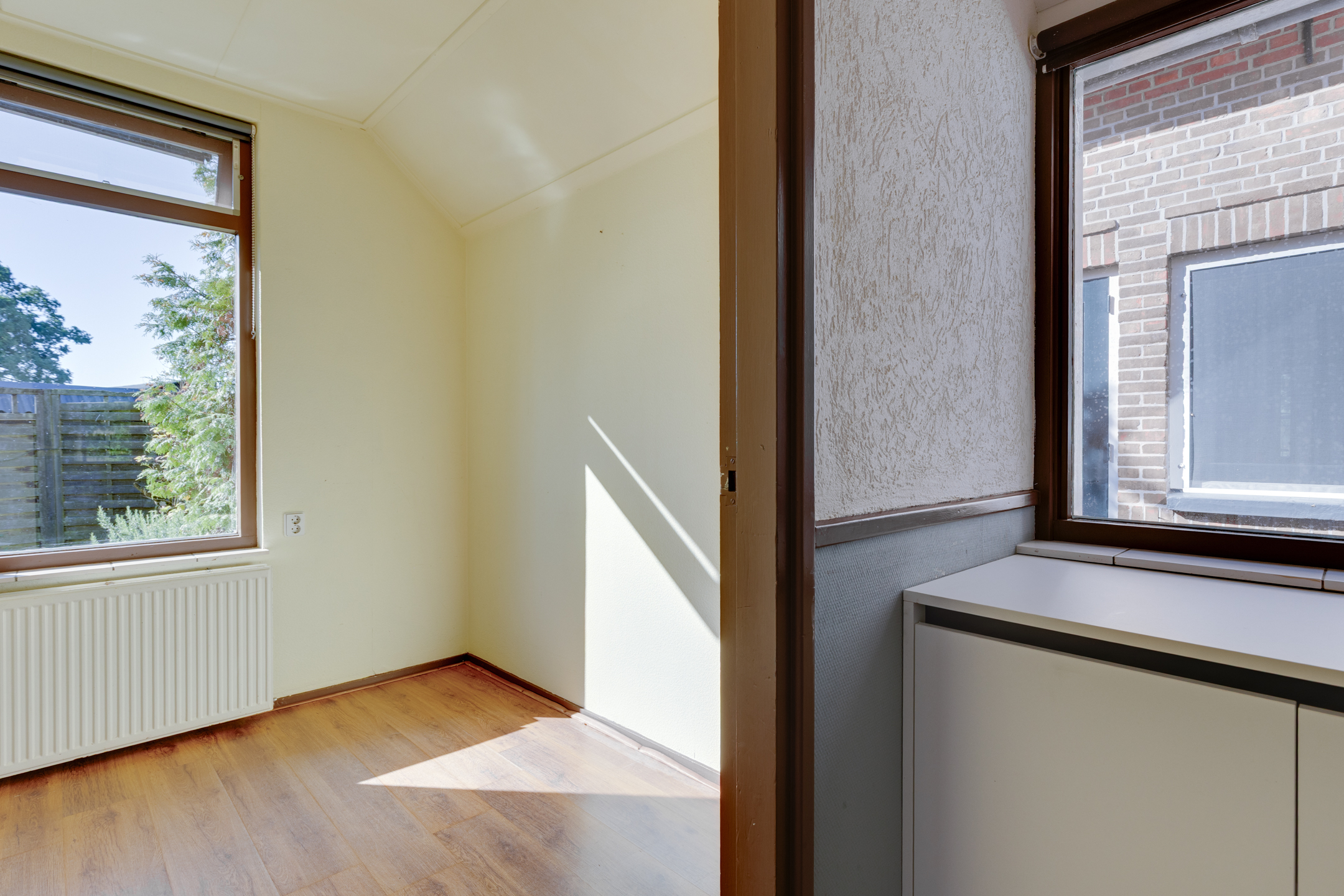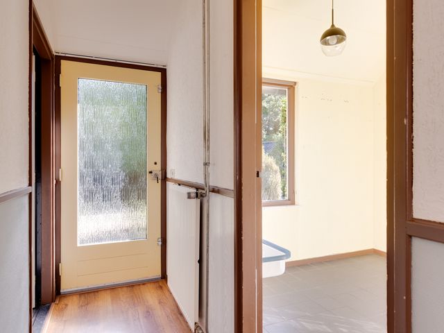 Begane grond: De woning is toegankelijk via de voordeur aan de zijkant van de woning alsmede de achterdeur aan de achterzijde, via de bijkeuken. Via de voordeur bereik je de centrale hal. Aan de linkerzijde van deze hal bevindt zich de bijkeuken met aansluiting voor de wasmachine en wasbak. Tevens bevindt zich aan de linkerzijde van de hal een slaapkamer. Aan de rechterzijde van de hal is de keuken gelegen. De inbouwkeuken is o.a. voorzien van een gaskookplaat, afzuigkap en koelkast. Vanuit de keuken is toegang naar de woonkamer die over de volle breedte van de woning aan de voorzijde is gelegen. De woonkamer biedt eveneens toegang tot de hal/het portaal alwaar zich de sanitaire ruimtes en trapopgang bevinden. De badkamer beschikt over een douche en wastafelmeubel en de toiletruimte over een wandcloset en fonteintje.