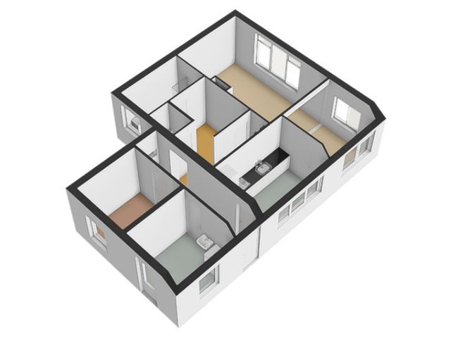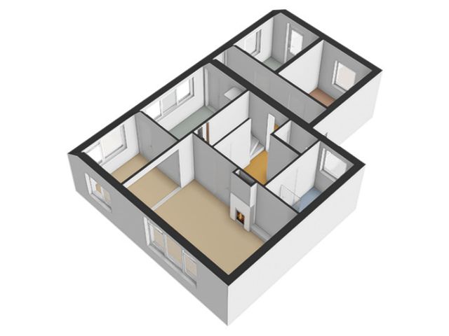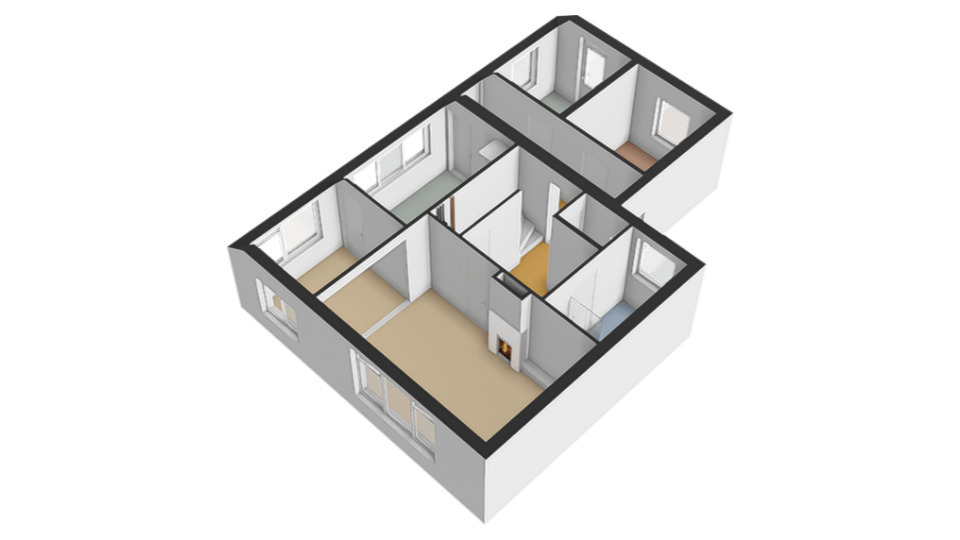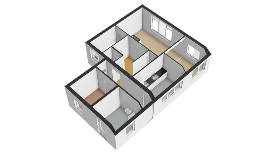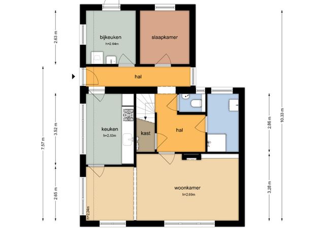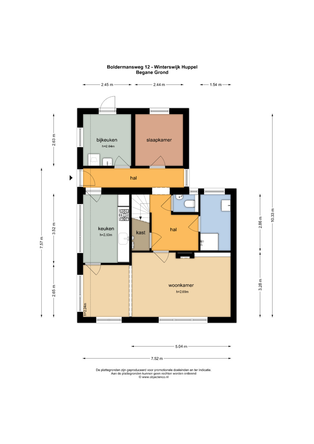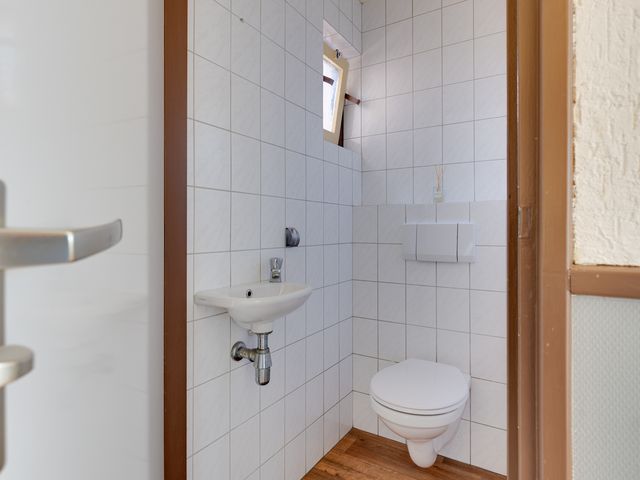 Begane grond: De woning is toegankelijk via de voordeur aan de zijkant van de woning alsmede de achterdeur aan de achterzijde, via de bijkeuken. Via de voordeur bereik je de centrale hal. Aan de linkerzijde van deze hal bevindt zich de bijkeuken met aansluiting voor de wasmachine en wasbak. Tevens bevindt zich aan de linkerzijde van de hal een slaapkamer. Aan de rechterzijde van de hal is de keuken gelegen. De inbouwkeuken is o.a. voorzien van een gaskookplaat, afzuigkap en koelkast. Vanuit de keuken is toegang naar de woonkamer die over de volle breedte van de woning aan de voorzijde is gelegen. De woonkamer biedt eveneens toegang tot de hal/het portaal alwaar zich de sanitaire ruimtes en trapopgang bevinden. De badkamer beschikt over een douche en wastafelmeubel en de toiletruimte over een wandcloset en fonteintje.