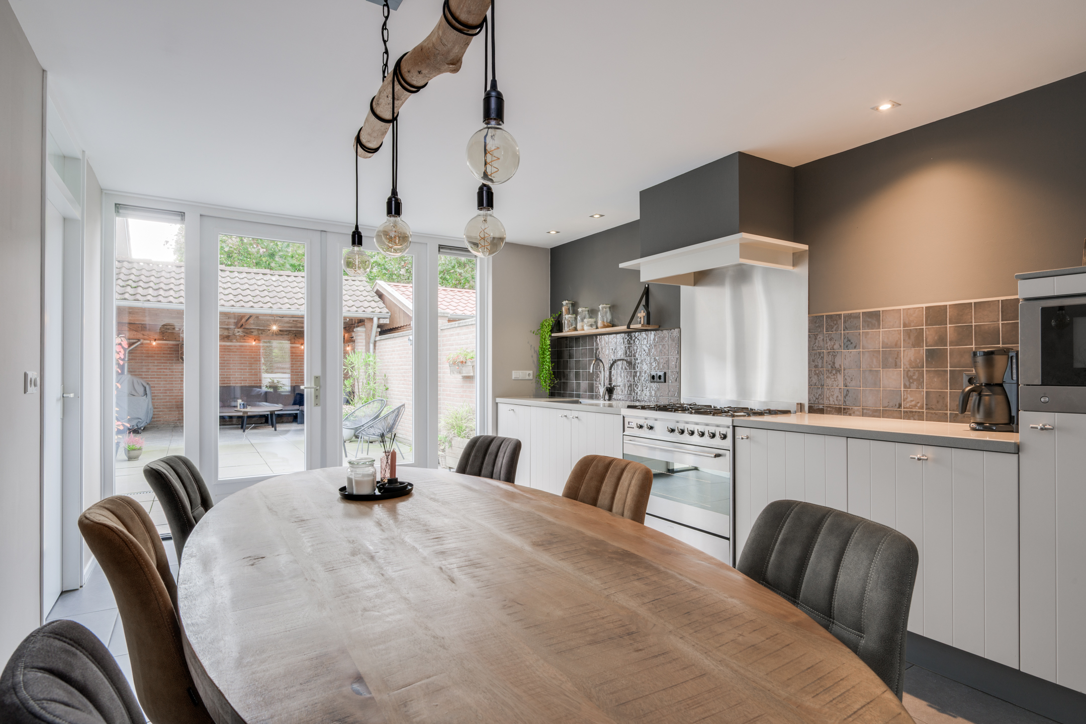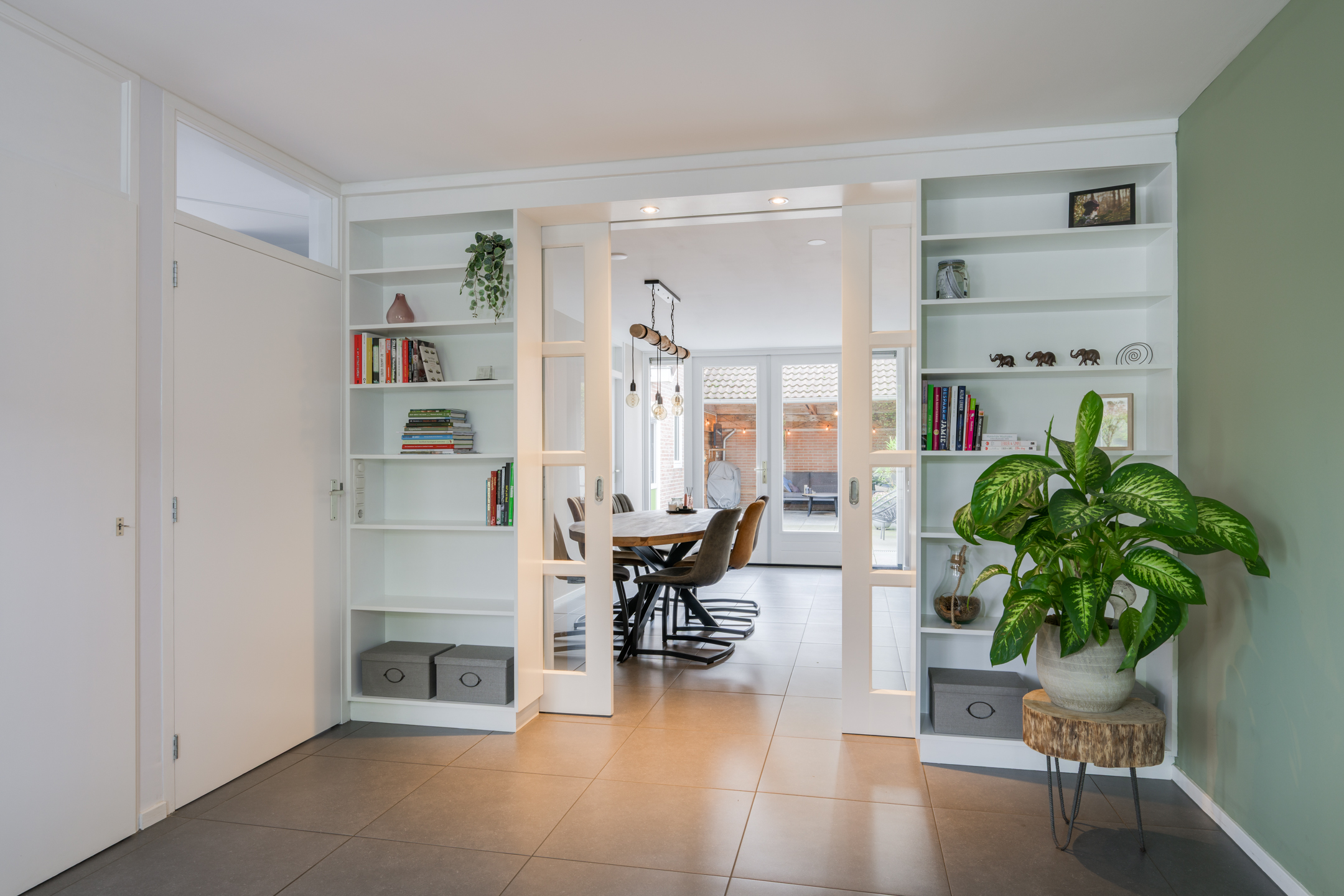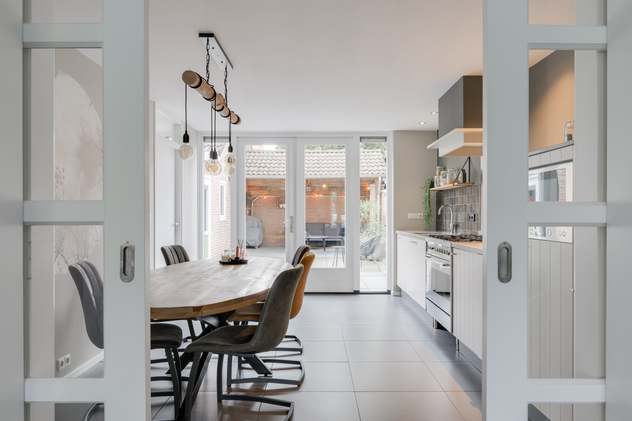Begane grond: Via de entree aan de zijkant van de woning bereik je hal met toegang tot meterkast, toiletruimte, trapopgang en woonkamer. De L-vormige woonkamer heeft een bergkast onder de trap en grote ramen aan de voorzijde. Er is volop ruimte voor een grote zithoek en via de sfeervolle schuifdeuren is er toegang tot de gezellige eetkeuken. De openslaande deuren naar de tuin, de tegelvloer en de inbouwkeuken met diverse apparatuur in wandopstelling (2013) maken de keuken tot een sfeervolle ruimte. Vanuit de keuken is er toegang tot bijkeuken. Deze ruimte beschikt over een achterdeur naar de tuin en meerdere (berg)kasten met schuifdeuren. Een deel van deze kasten is ingericht als cv-ruimte en wasruimte met de benodigde aansluitingen.