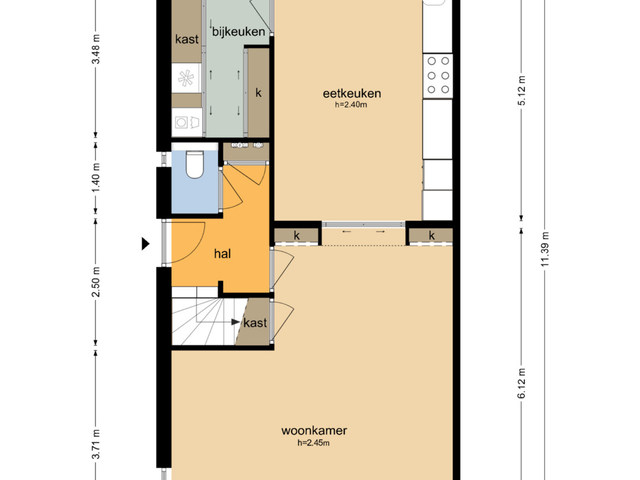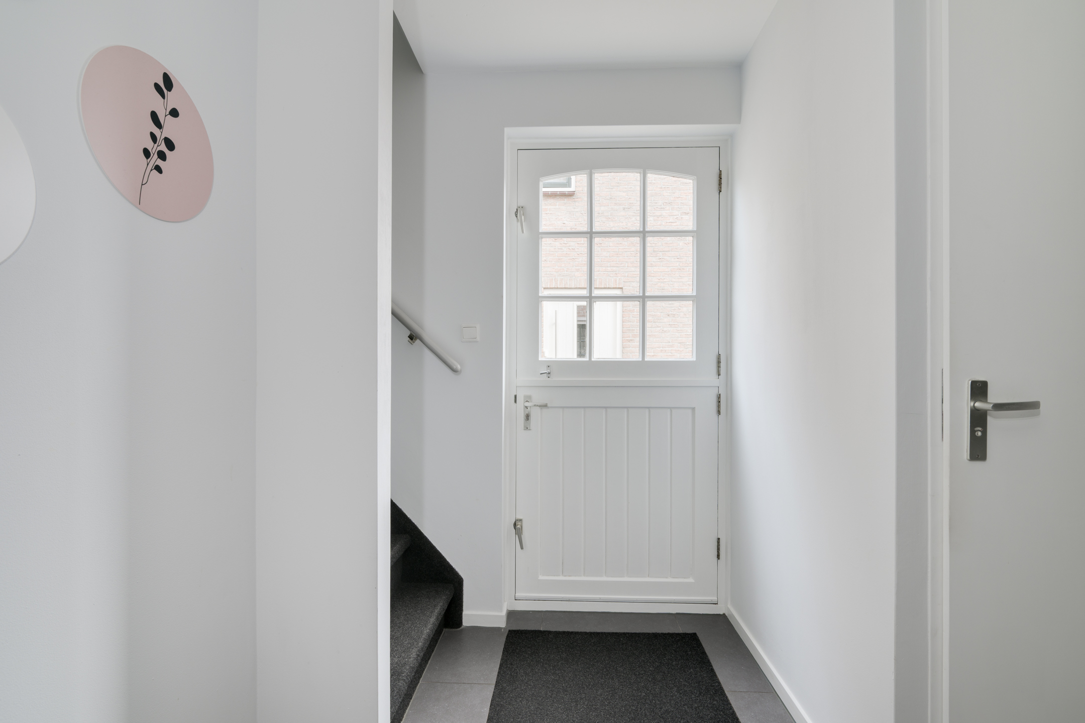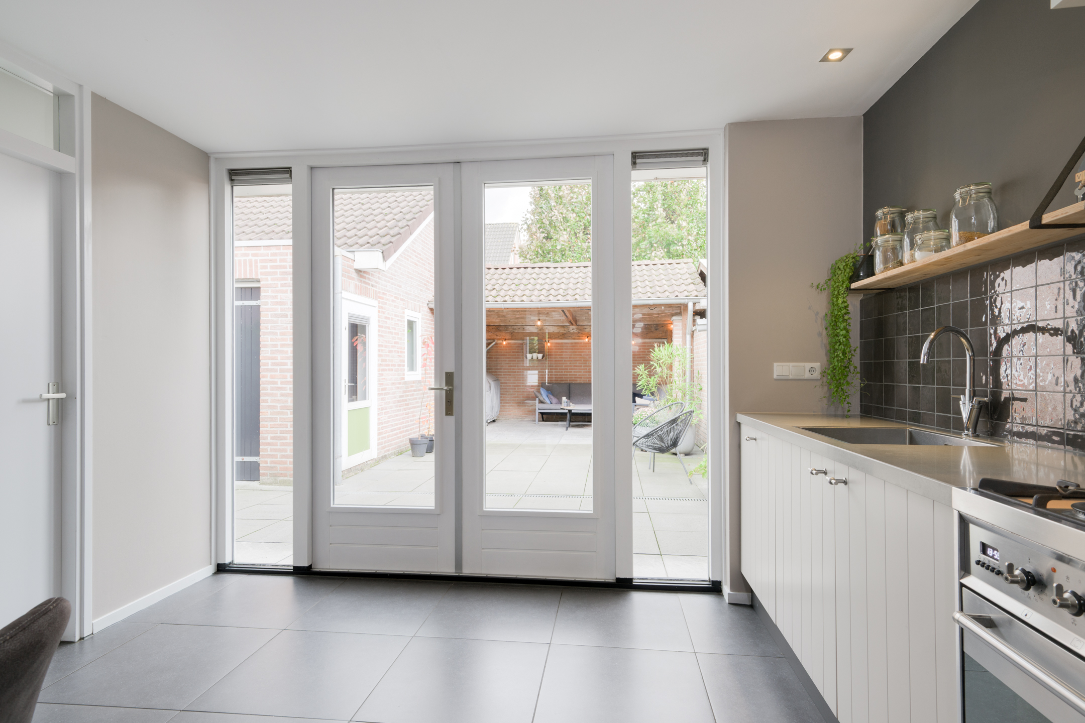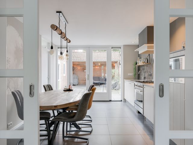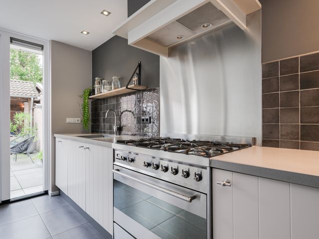 Begane grond: Via de entree aan de zijkant van de woning bereik je hal met toegang tot meterkast, toiletruimte, trapopgang en woonkamer. De L-vormige woonkamer heeft een bergkast onder de trap en grote ramen aan de voorzijde. Er is volop ruimte voor een grote zithoek en via de sfeervolle schuifdeuren is er toegang tot de gezellige eetkeuken. De openslaande deuren naar de tuin, de tegelvloer en de inbouwkeuken met diverse apparatuur in wandopstelling (2013) maken de keuken tot een sfeervolle ruimte. Vanuit de keuken is er toegang tot bijkeuken. Deze ruimte beschikt over een achterdeur naar de tuin en meerdere (berg)kasten met schuifdeuren. Een deel van deze kasten is ingericht als cv-ruimte en wasruimte met de benodigde aansluitingen.
