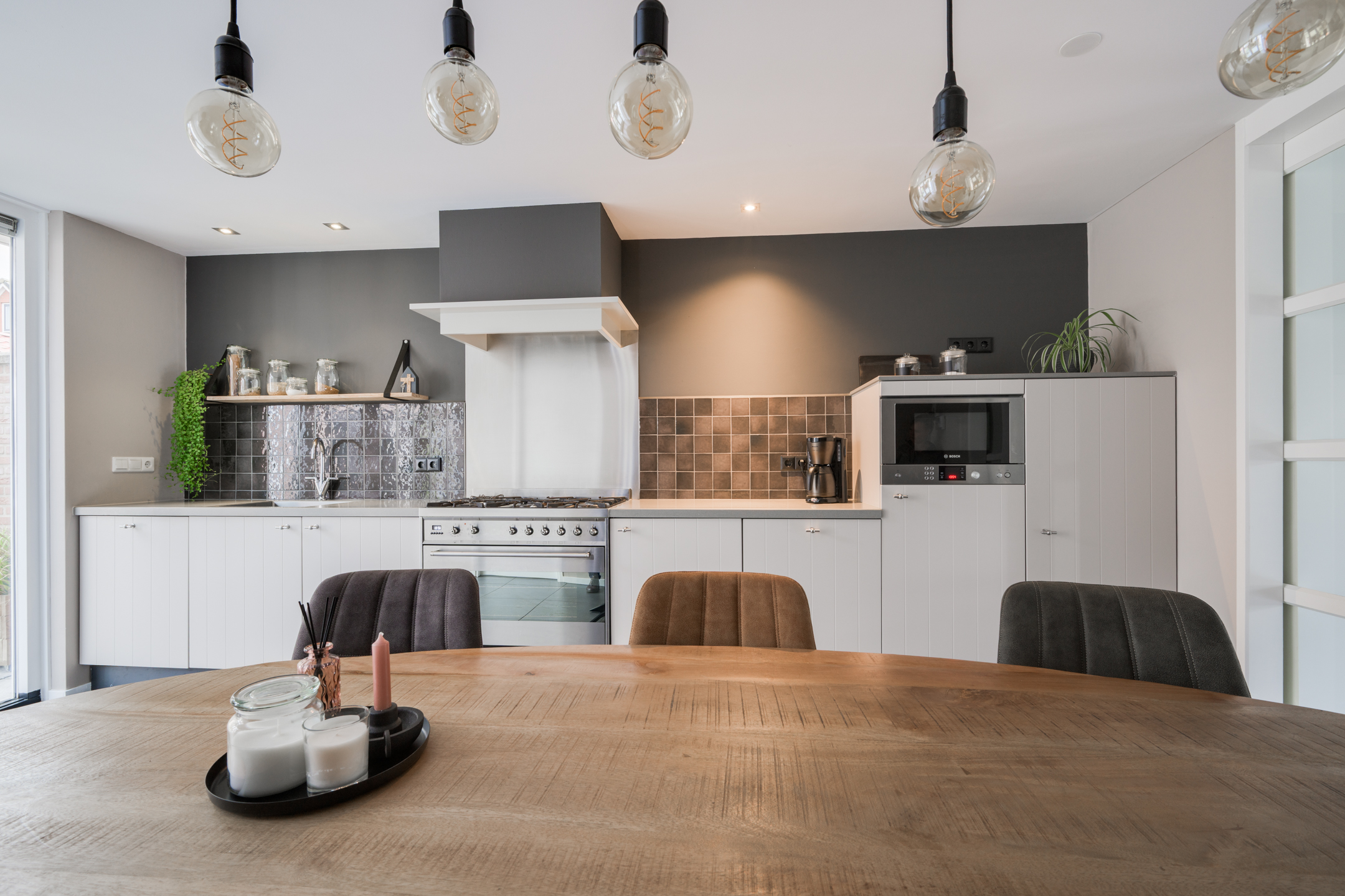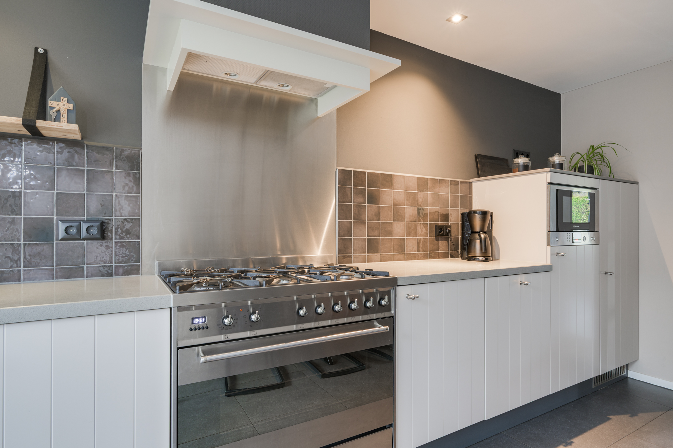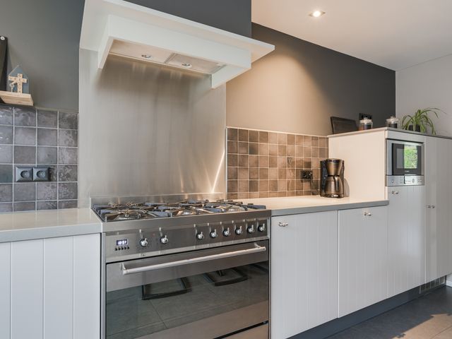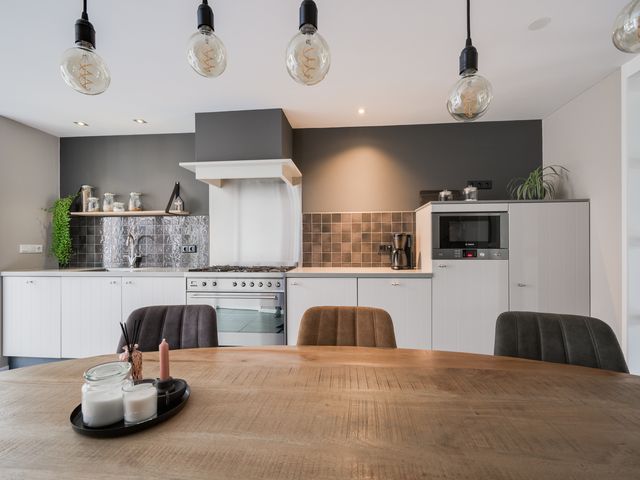 De grote donkergrijze plavuizen waaronder vloerverwarming liggen op de hele begane grond en de afwerking van zowel wanden als plafonds is van hoog niveau.