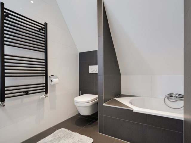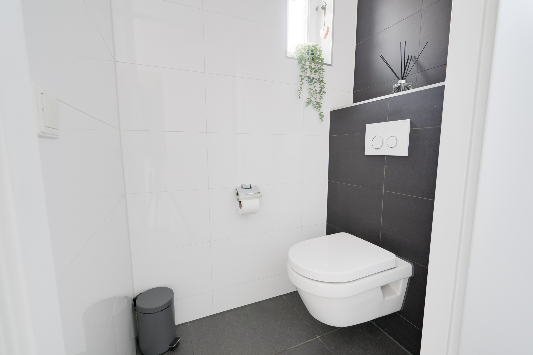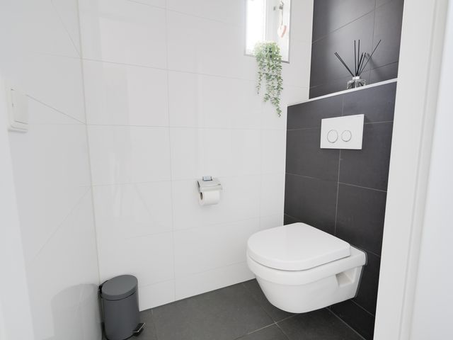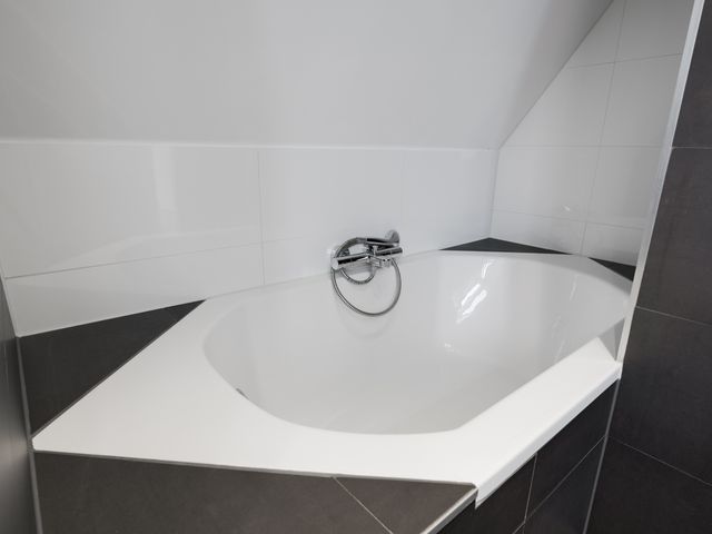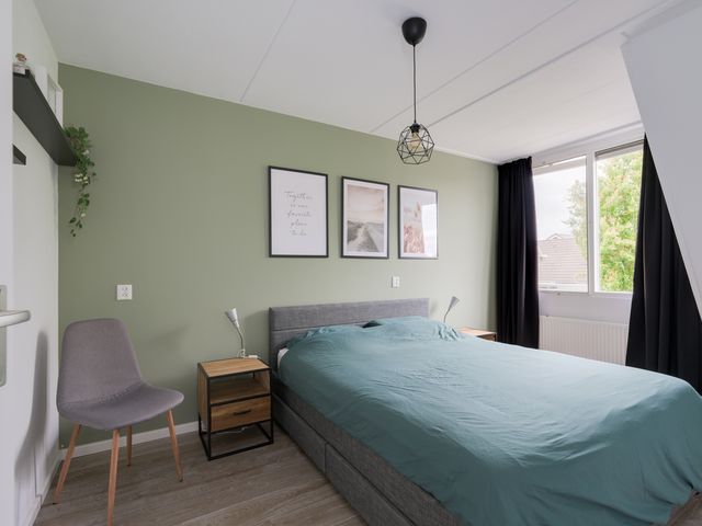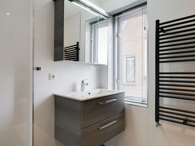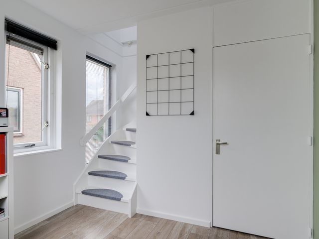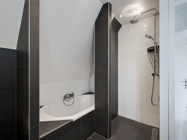 Eerste verdieping: Overloop met toegang tot drie slaapkamers en de badkamer. Twee slaapkamers zijn voorzien van een dakkapel en de derde kamer heeft een groot dakraam. Op nagenoeg de hele verdieping ligt een mooie laminaatvloer. De badkamer (2013) heeft een speelse indeling met een ligbad, inloopdouche, tweede toilet, handdoekenradiator en een wastafelmeubel. De rechte wanden zijn geheel betegeld, het plafond is voorzien van inbouwverlichting en op de vloer liggen prachtige zwarte tegels in een groot formaat.