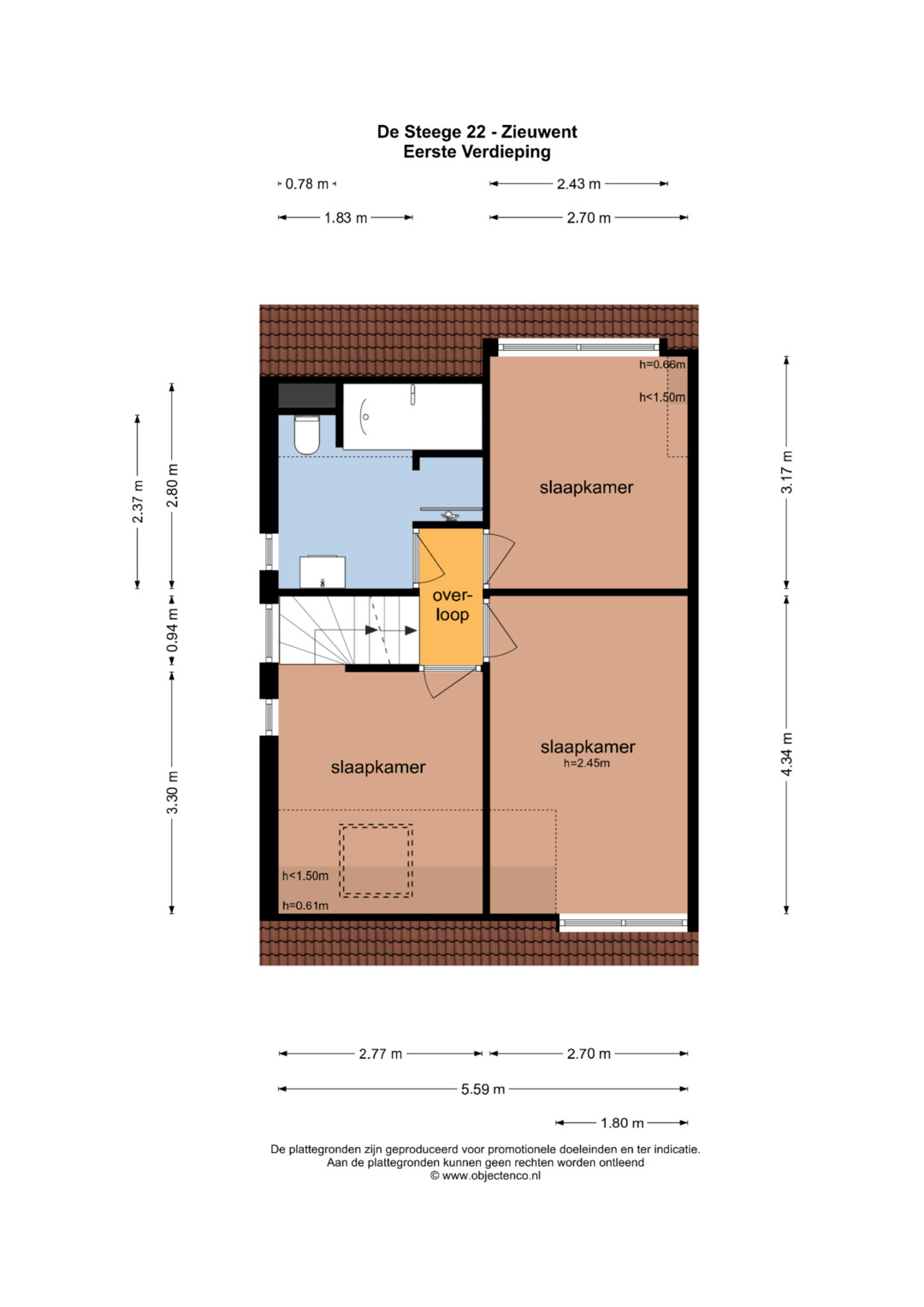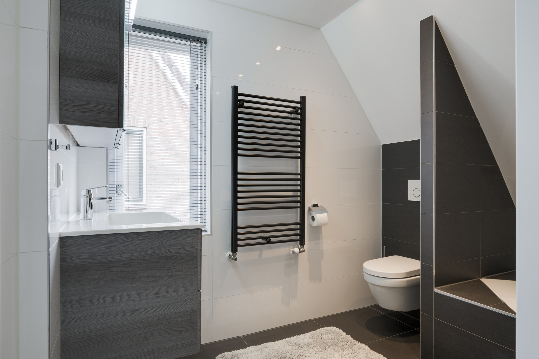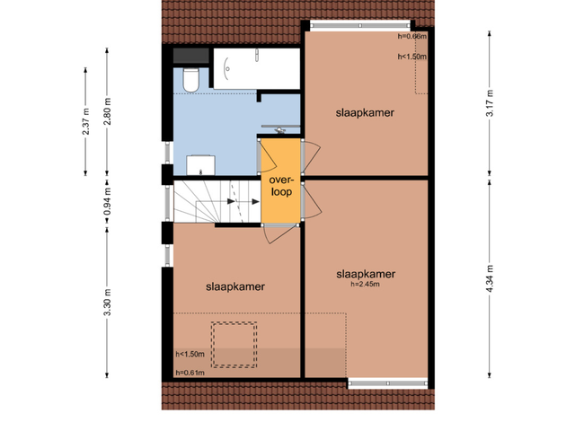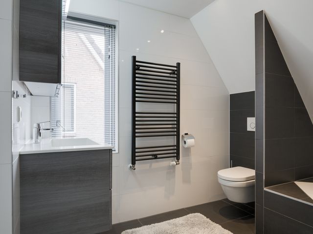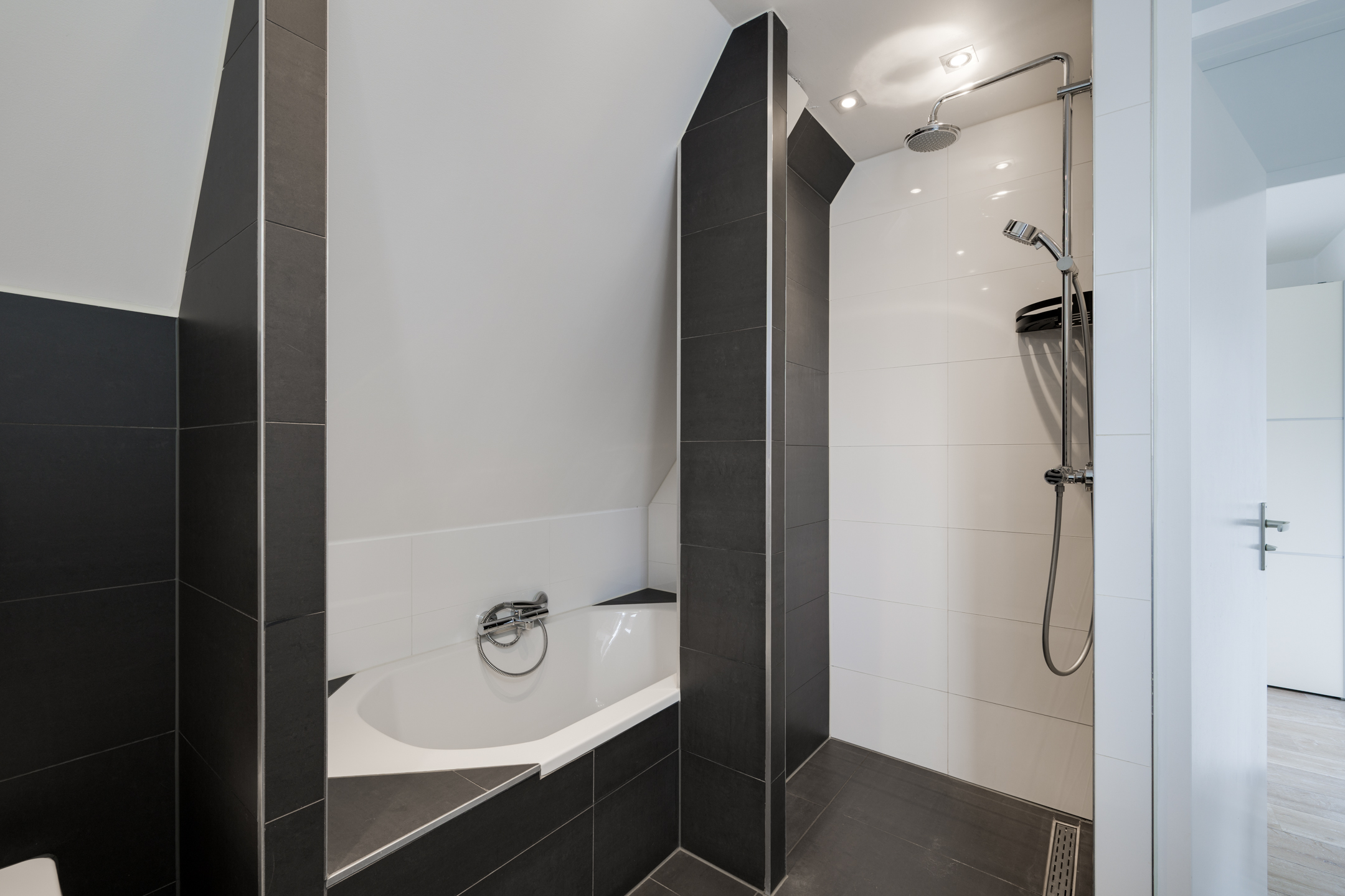 Eerste verdieping: Overloop met toegang tot drie slaapkamers en de badkamer. Twee slaapkamers zijn voorzien van een dakkapel en de derde kamer heeft een groot dakraam. Op nagenoeg de hele verdieping ligt een mooie laminaatvloer. De badkamer (2013) heeft een speelse indeling met een ligbad, inloopdouche, tweede toilet, handdoekenradiator en een wastafelmeubel. De rechte wanden zijn geheel betegeld, het plafond is voorzien van inbouwverlichting en op de vloer liggen prachtige zwarte tegels in een groot formaat.