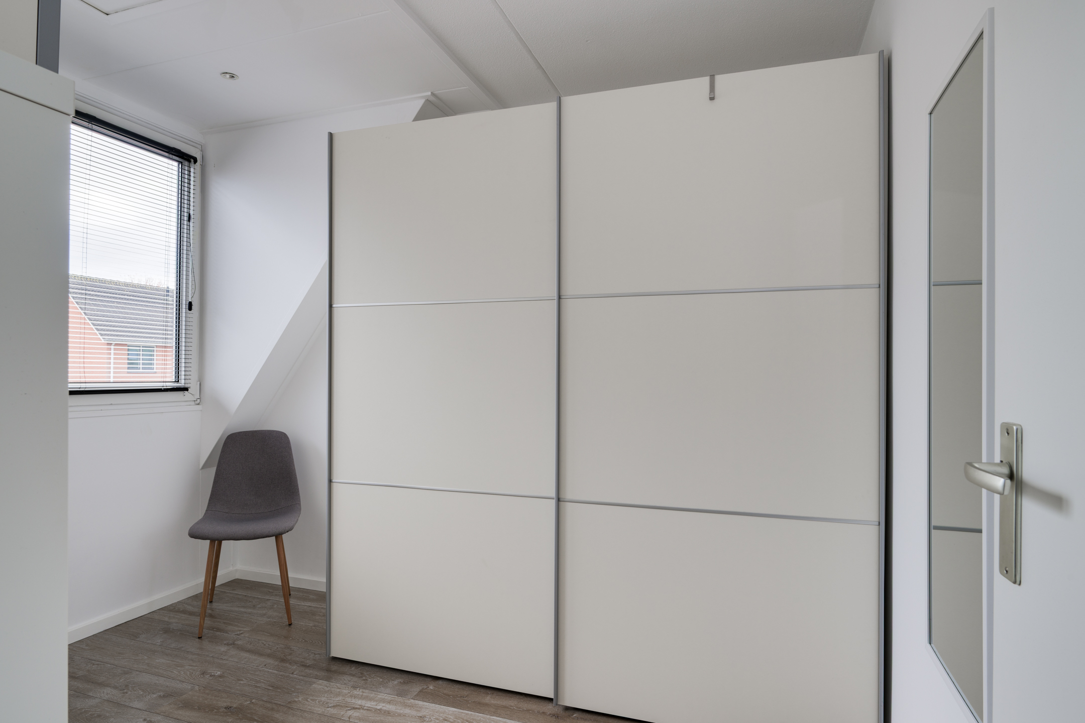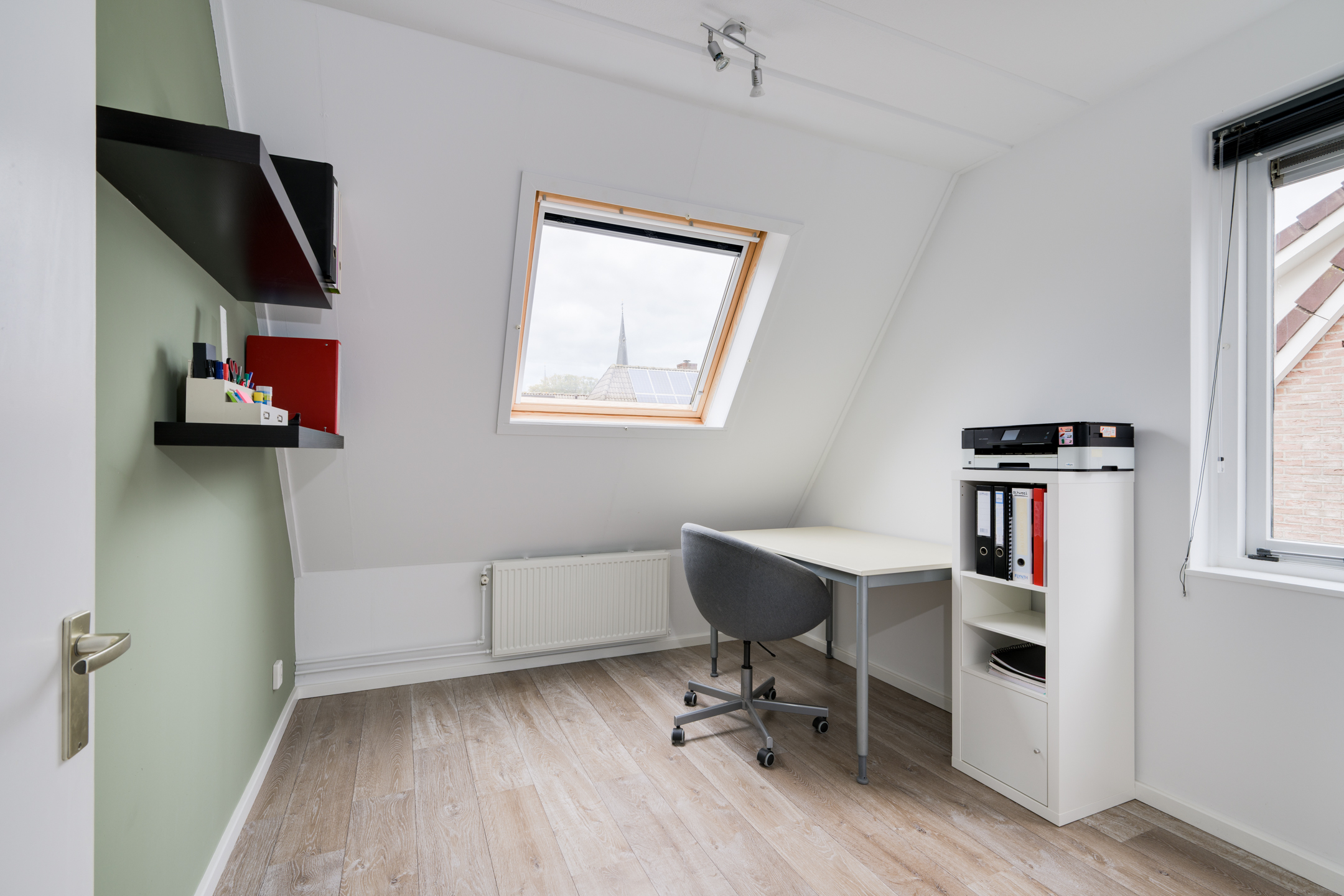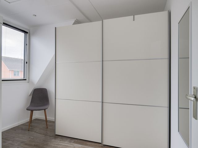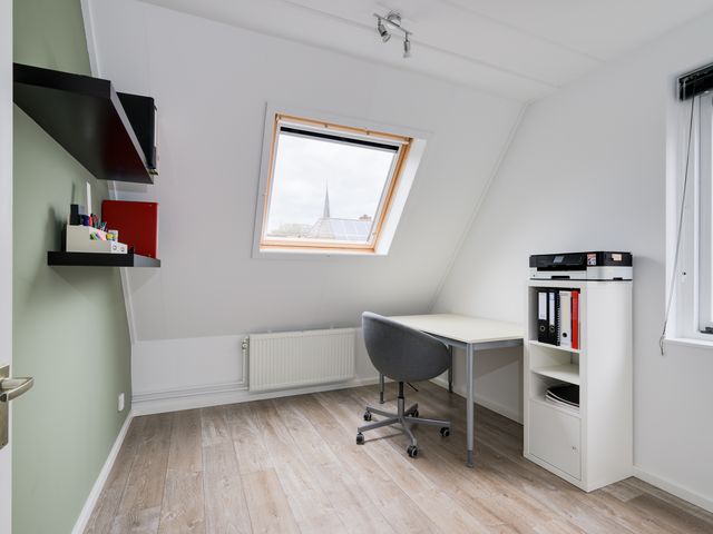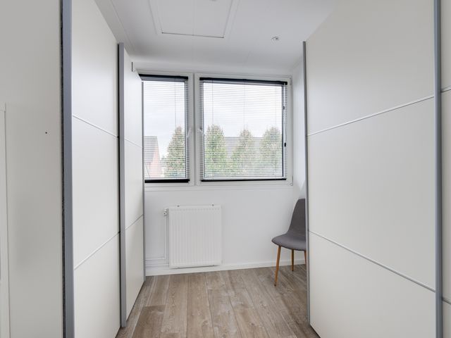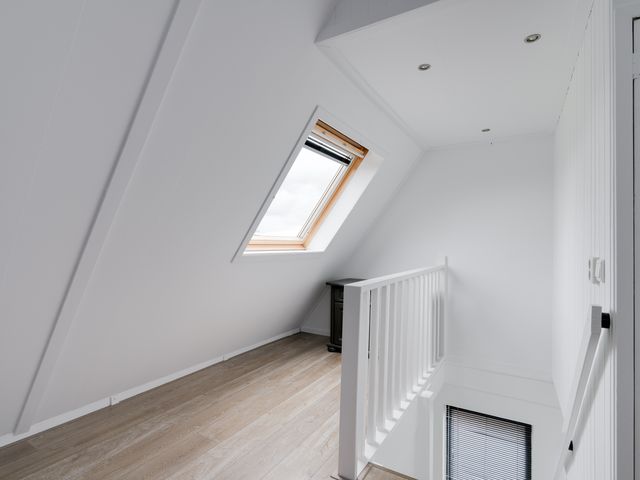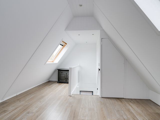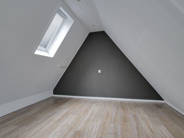 Tweede verdieping: Via de vaste trap in één van de slaapkamers op de eerste verdieping bereik je de 4e slaapkamer op de tweede verdieping. Deze ruimte is keurig afgewerkt en voorzien van een tweetal dakramen en een bergruimte/vaste kast. Ook tref je hier dezelfde laminaatvloer aan als op de eerste verdieping.