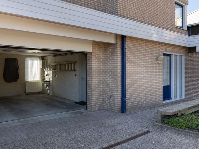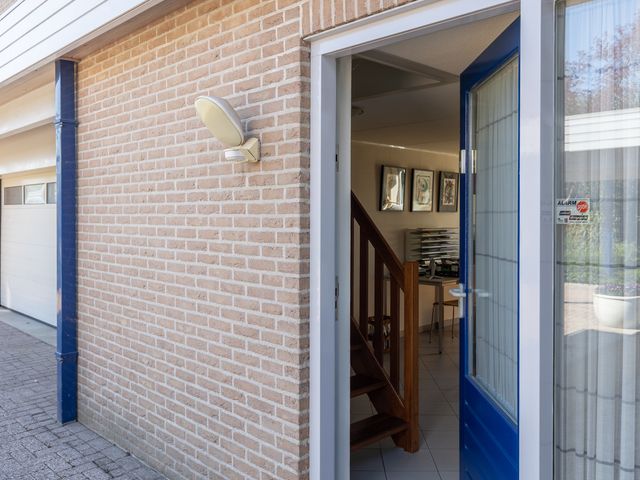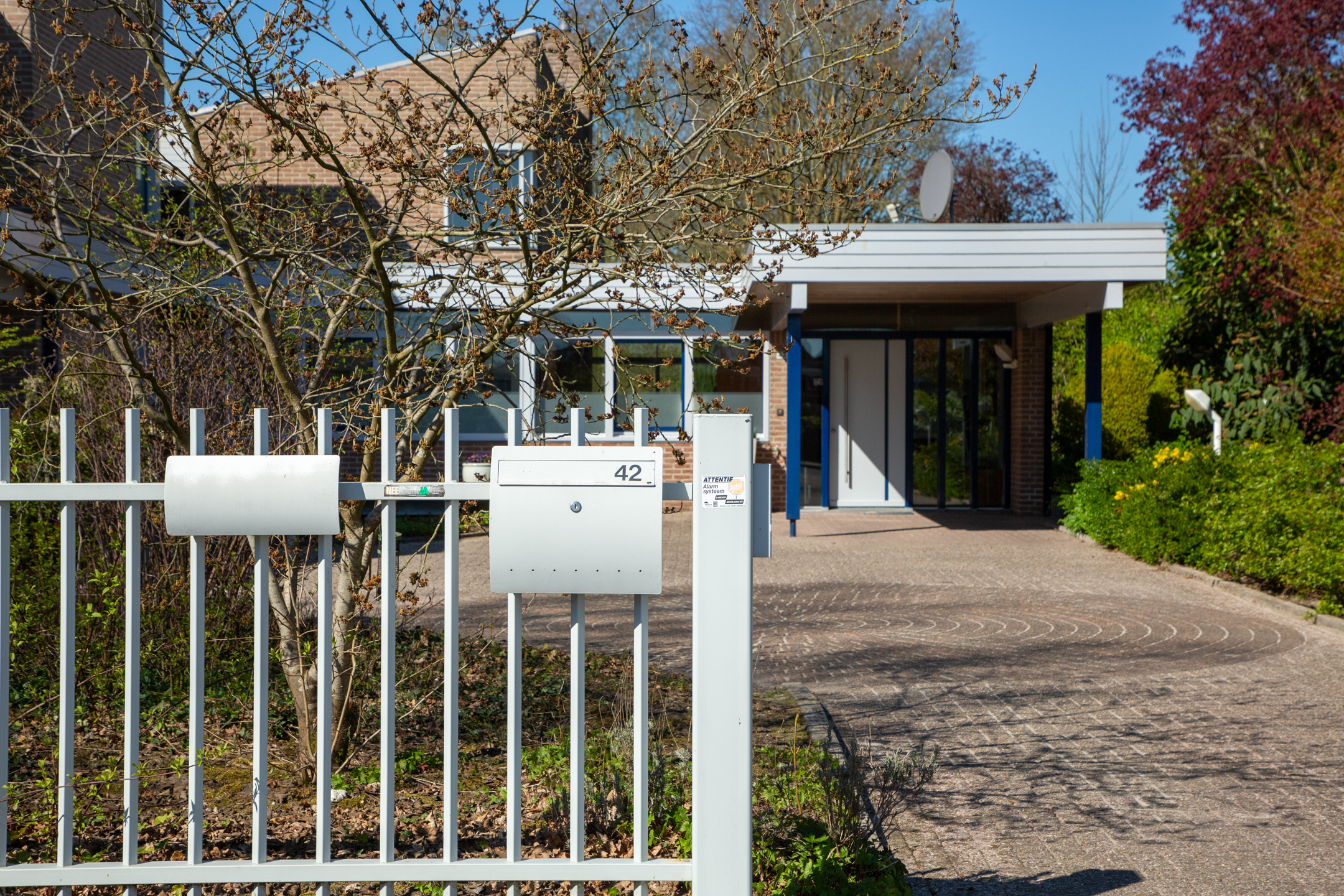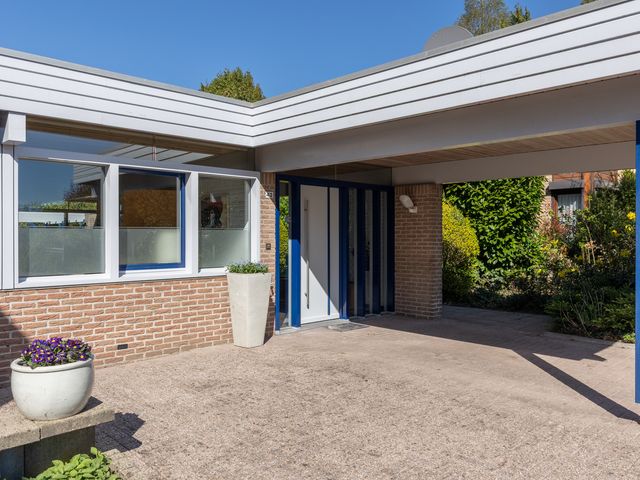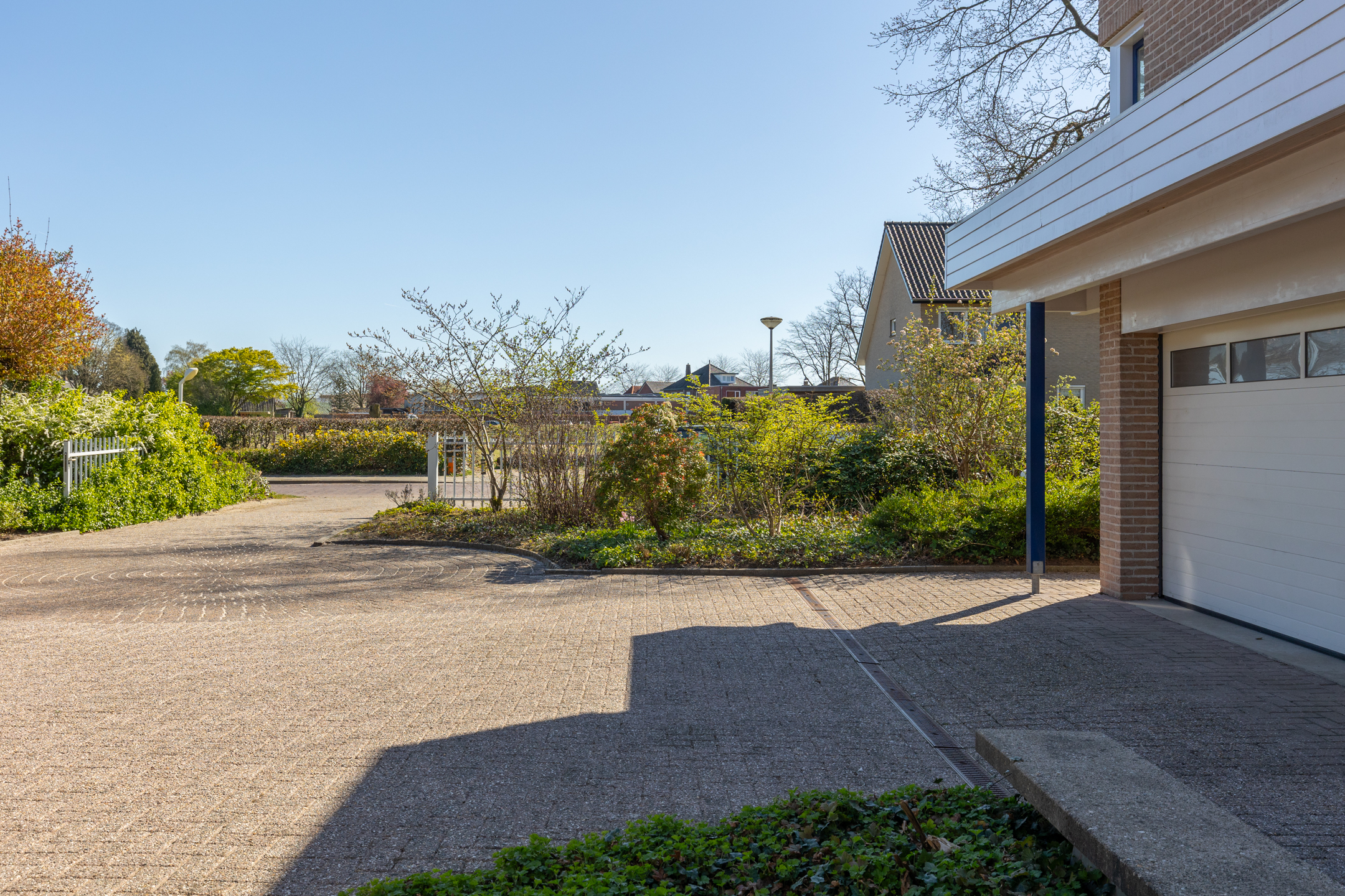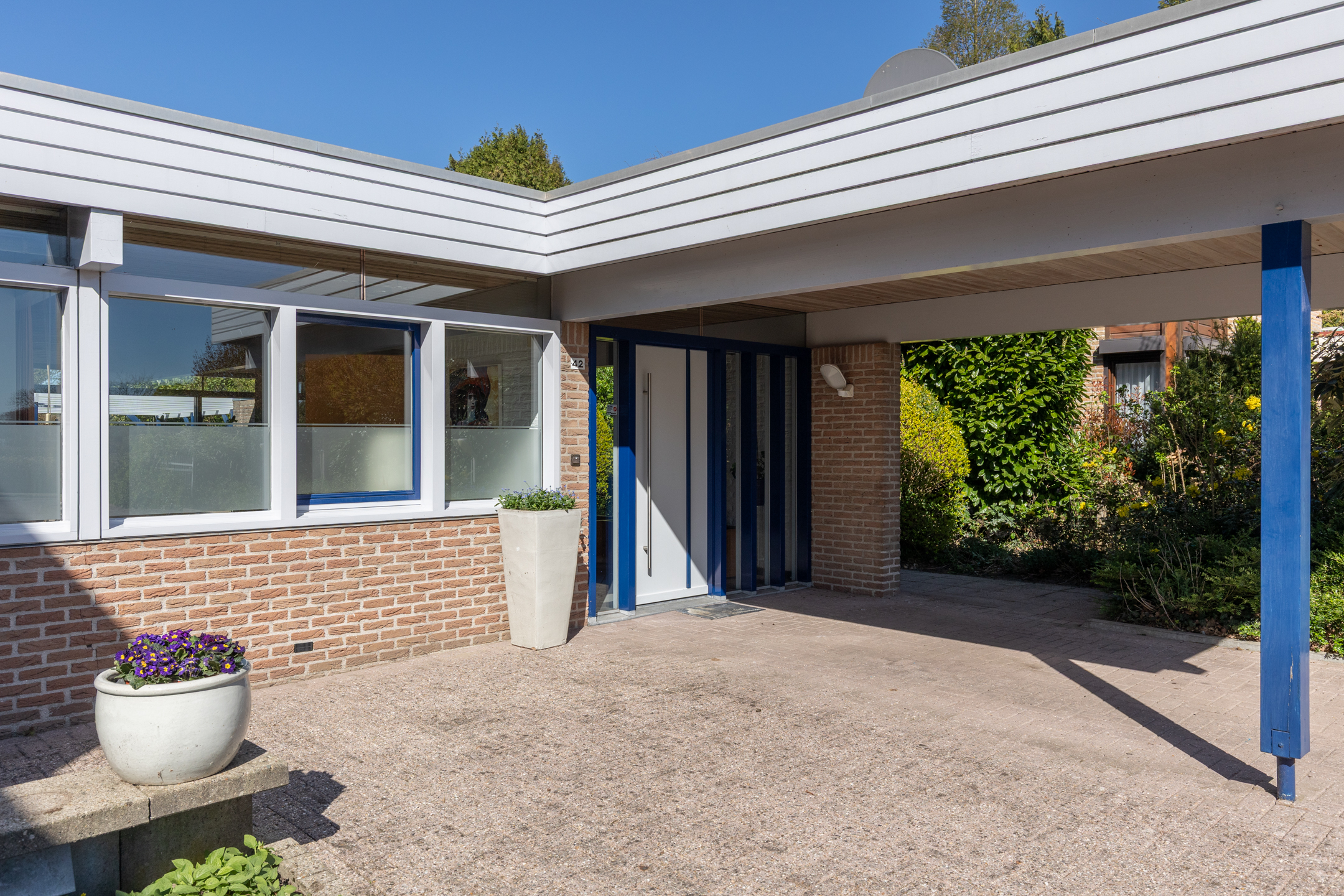 Aan de voorzijde is het perceel af te sluiten middels een grote poort. Buiten de poort is er nog parkeerruimte voor 2 auto’s. Aan de voorzijde, bij de voordeur, is een carport aangebouwd. Verder is het perceel aan de voorzijde grotendeels bestraat en ingericht met makkelijk te onderhouden borders.