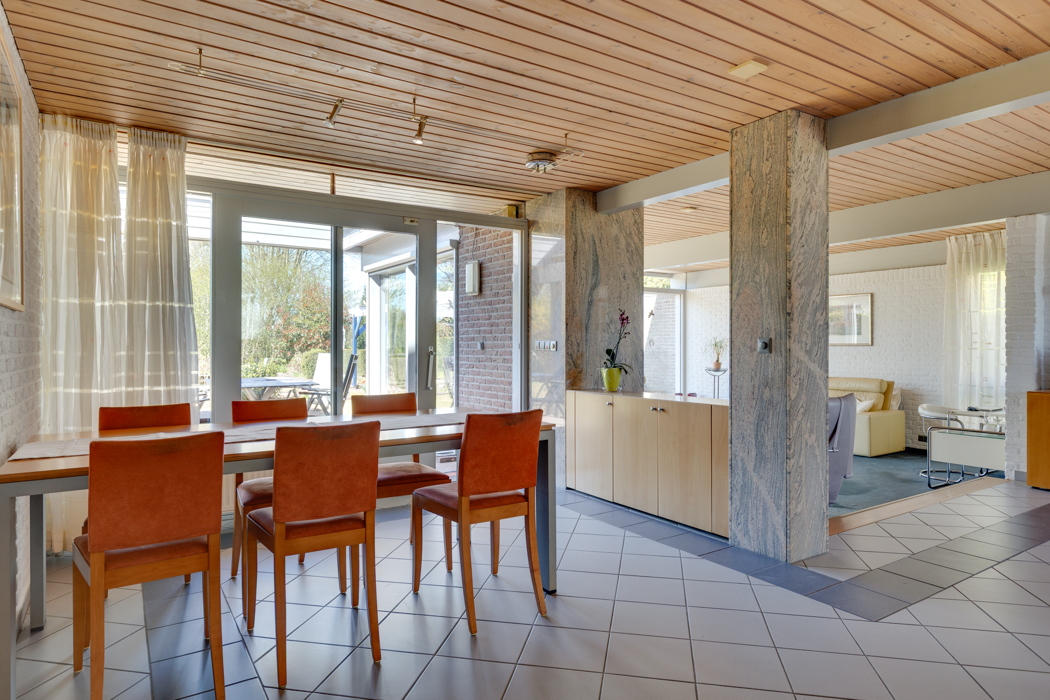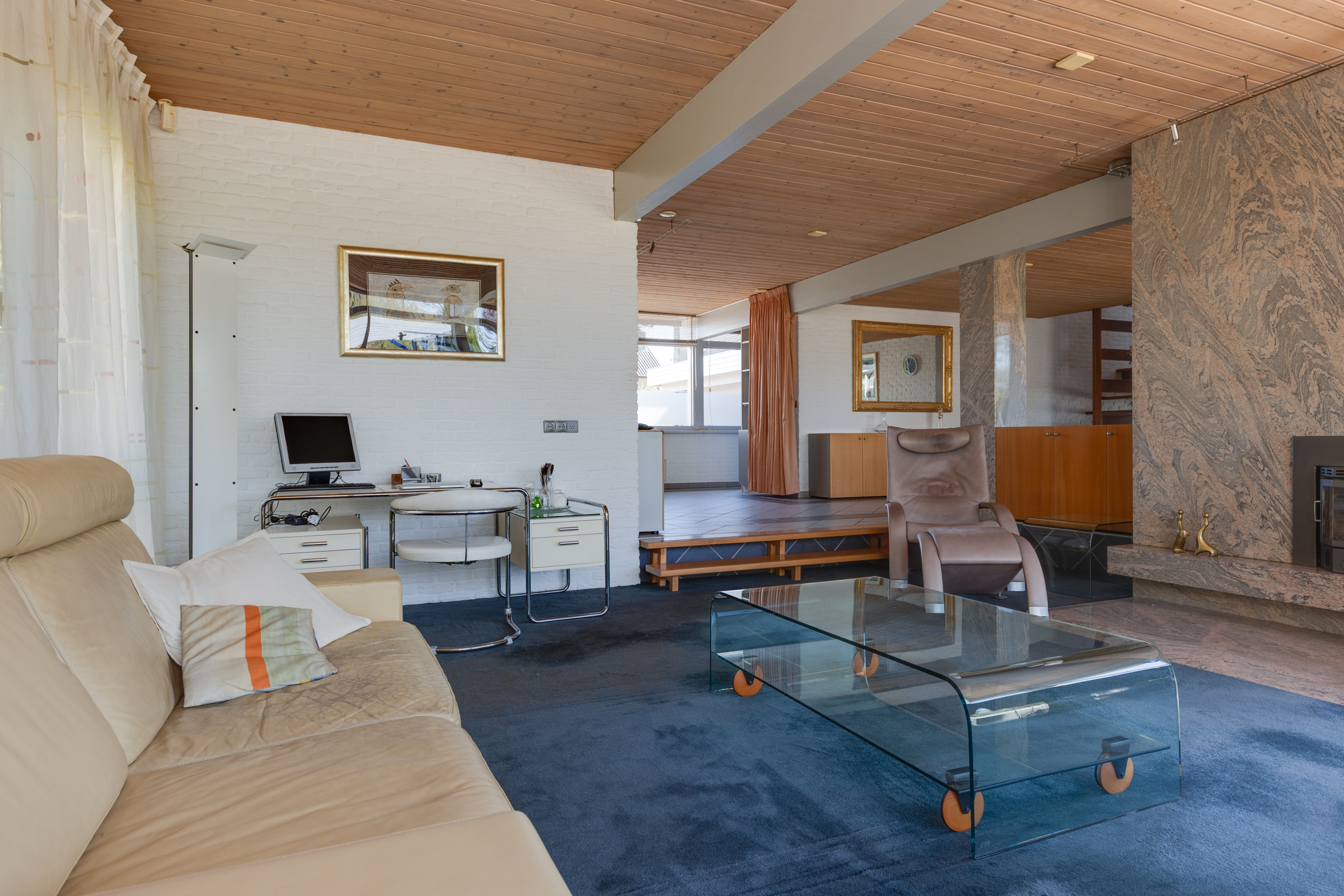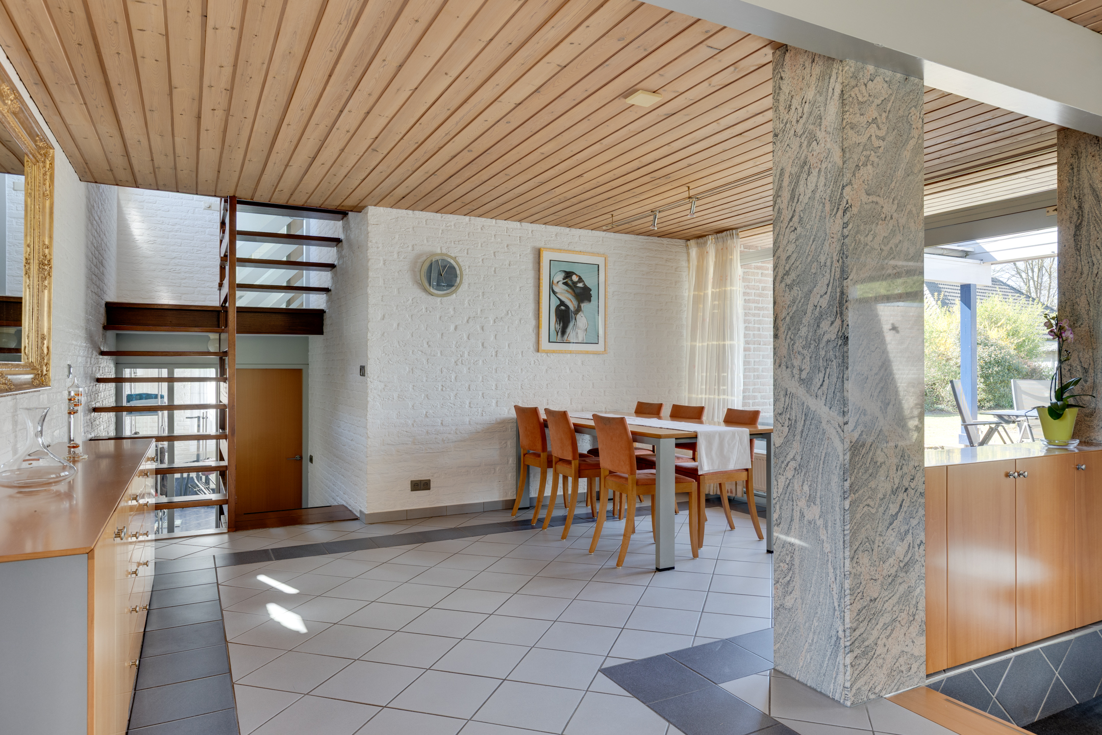 Via de voordeur komt u in de grote hal die toegang biedt tot de toiletruimte, de meterkast en de verkeersruimte in het midden van de woning. Vanuit deze ruimte loop je via een paar tredes door naar de zitkamer met grote marmeren schouw met houthaard. Vanuit de zithoek is er fraai zicht op de tuin. De eethoek is eveneens aan de achterzijde van de woning ingericht en via de schuifpui is de achtertuin/het terras bereikbaar. De keuken en bijkeuken bevinden zich in het midden van de woning. De inbouwkeuken is voorzien van apparatuur en vanuit de keuken zijn de bijkeuken en de kantoorruimte te toegankelijk. De bijkeuken is royaal en heeft een zij-uitgang. Zowel de kelder als de verdieping zijn bereikbaar via de trappen in de centrale ruimte.