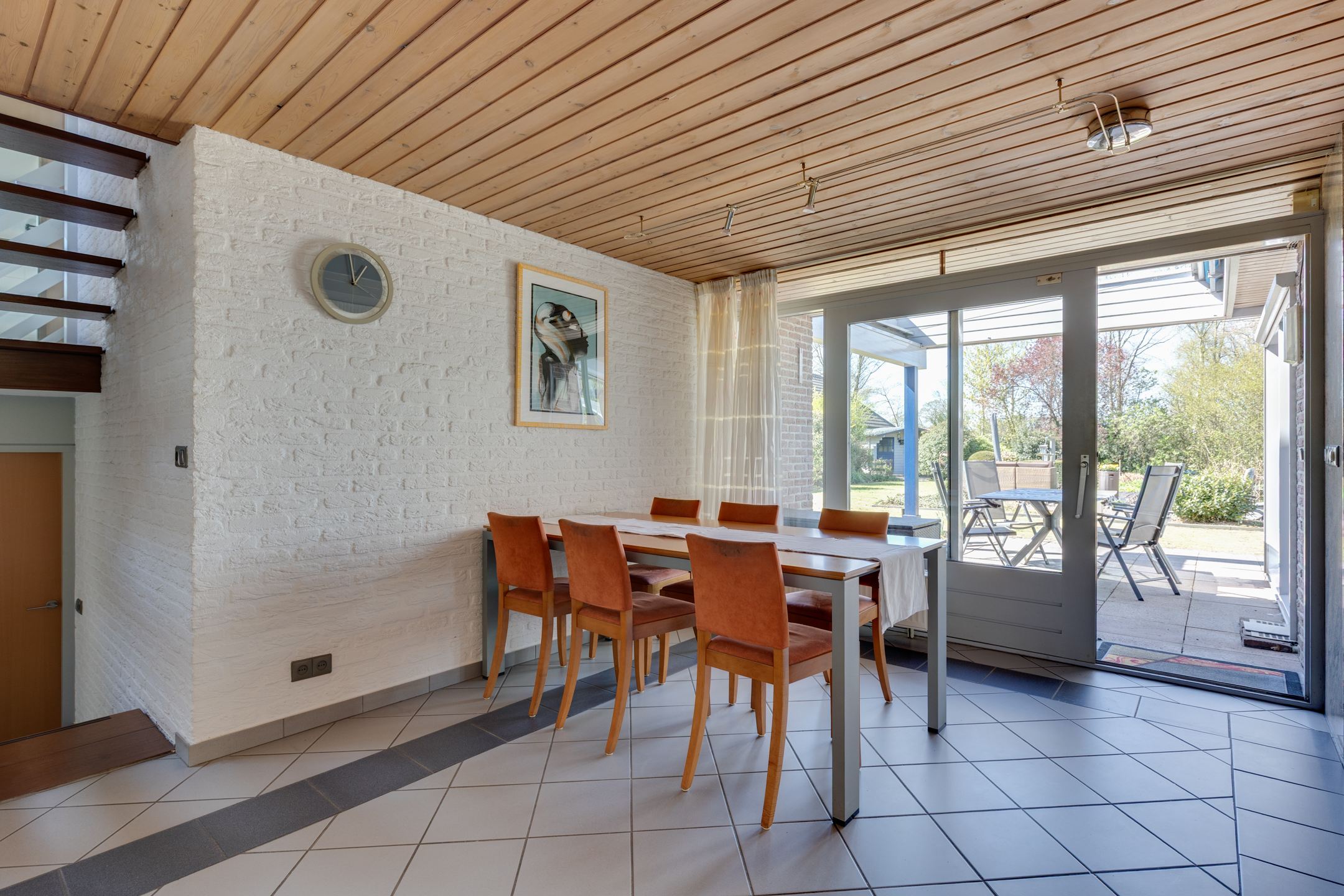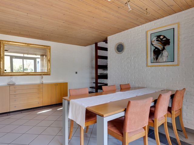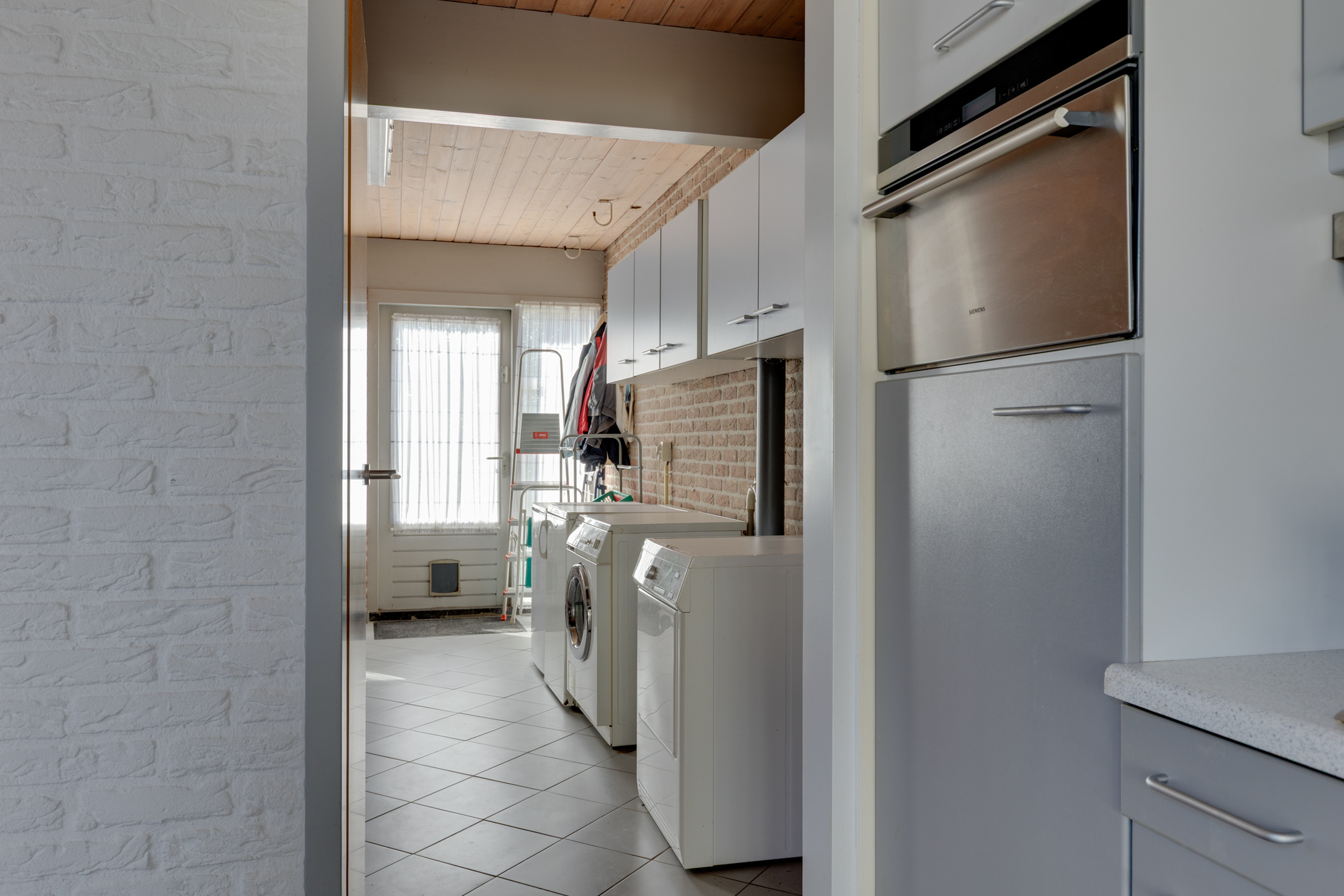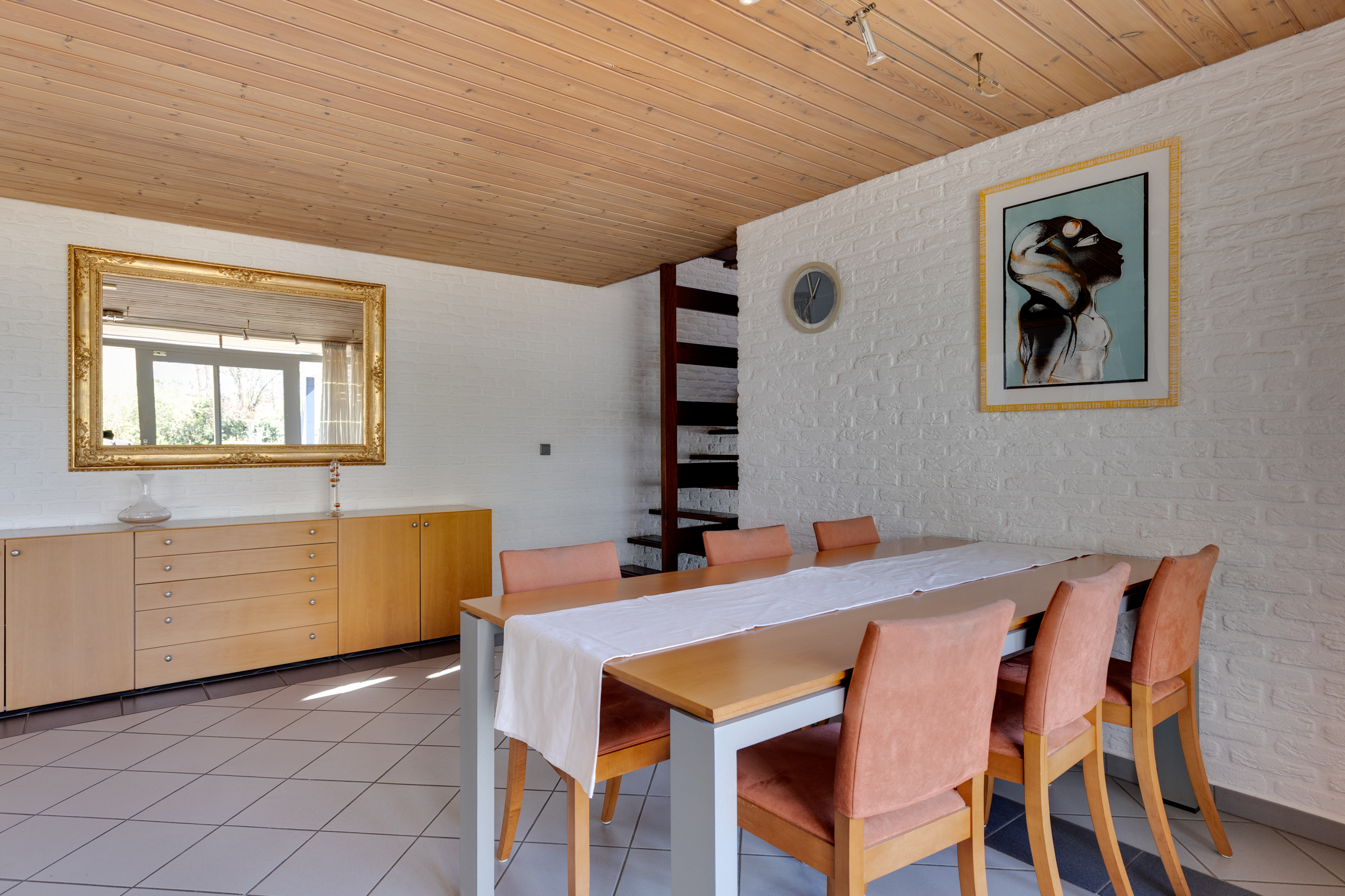 Via de voordeur komt u in de grote hal die toegang biedt tot de toiletruimte, de meterkast en de verkeersruimte in het midden van de woning. Vanuit deze ruimte loop je via een paar tredes door naar de zitkamer met grote marmeren schouw met houthaard. Vanuit de zithoek is er fraai zicht op de tuin. De eethoek is eveneens aan de achterzijde van de woning ingericht en via de schuifpui is de achtertuin/het terras bereikbaar. De keuken en bijkeuken bevinden zich in het midden van de woning. De inbouwkeuken is voorzien van apparatuur en vanuit de keuken zijn de bijkeuken en de kantoorruimte te toegankelijk. De bijkeuken is royaal en heeft een zij-uitgang. Zowel de kelder als de verdieping zijn bereikbaar via de trappen in de centrale ruimte.