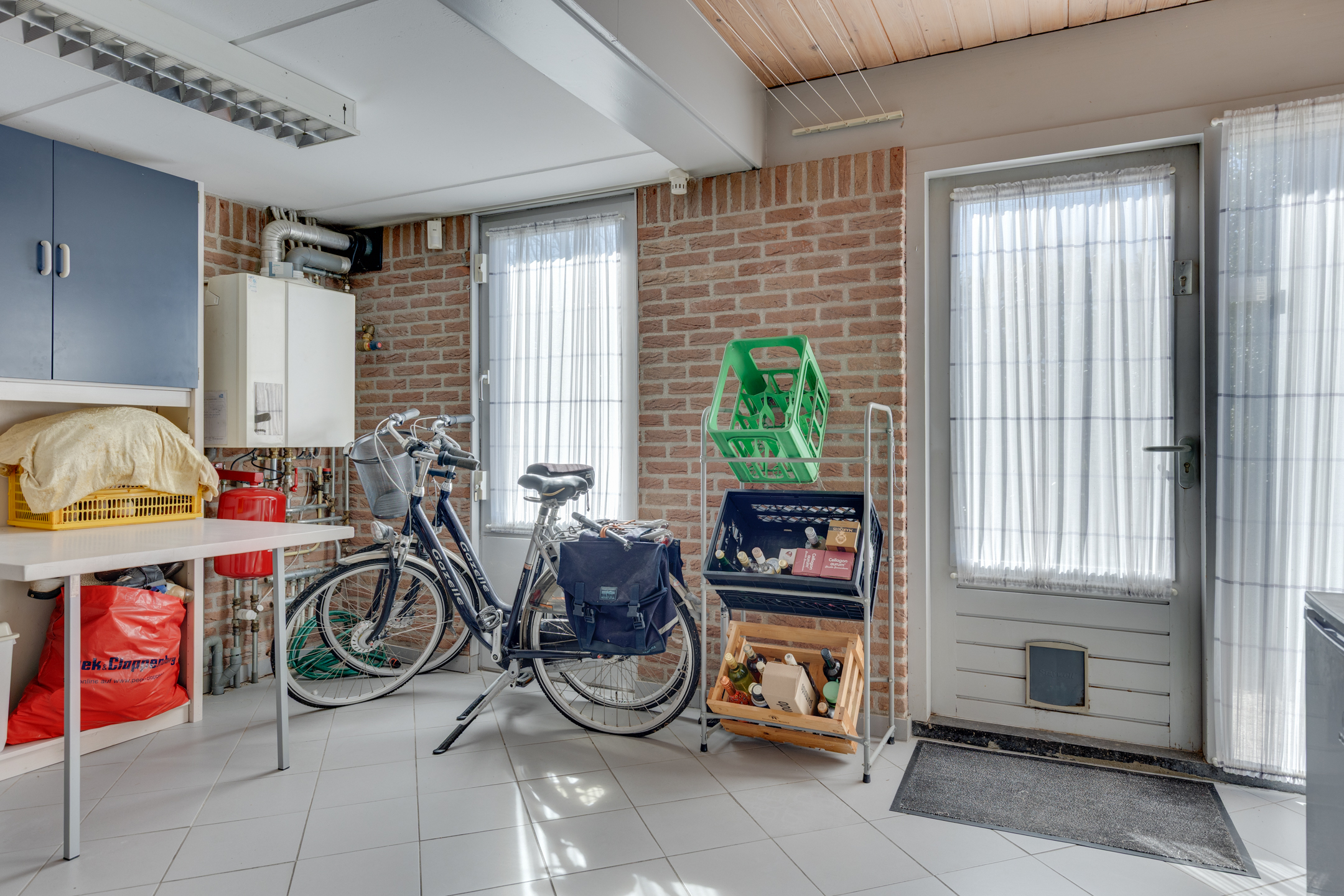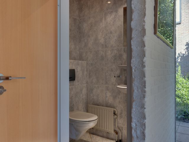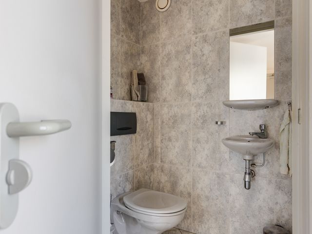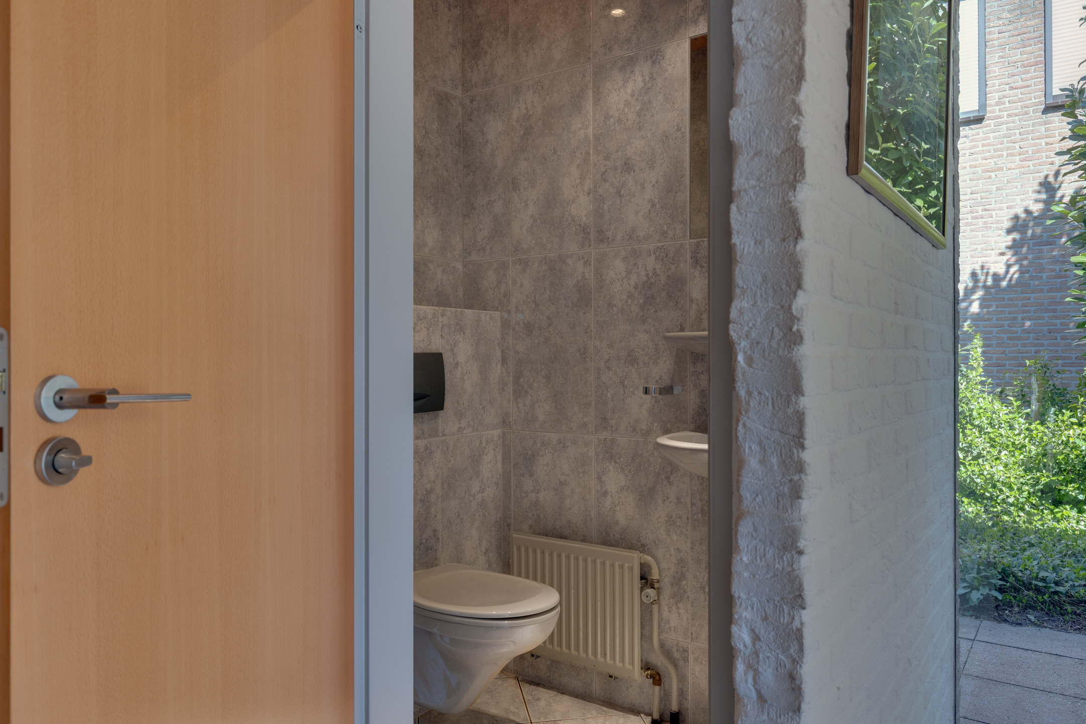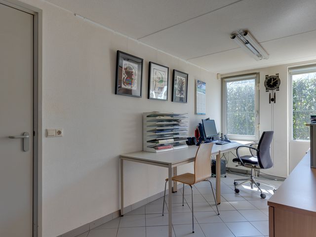 Het kantoor heeft een eigen ingang aan de buitenzijde en is voorzien van een separate toiletruimte. Via het kantoor is de garage inpandig bereikbaar en is er een trap naar het bovengelegen atelier.