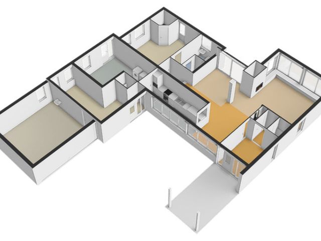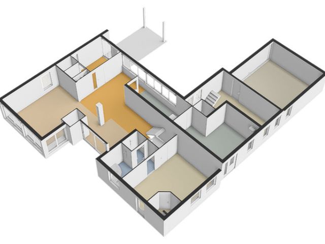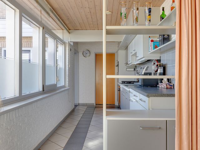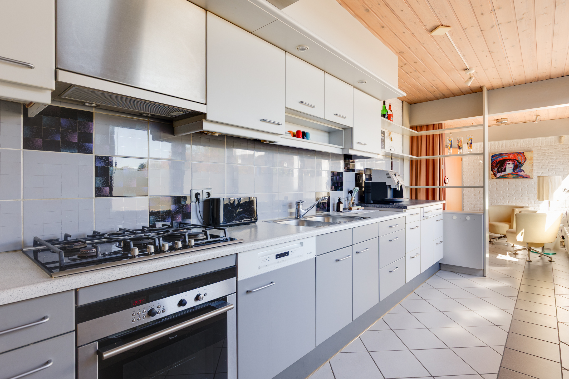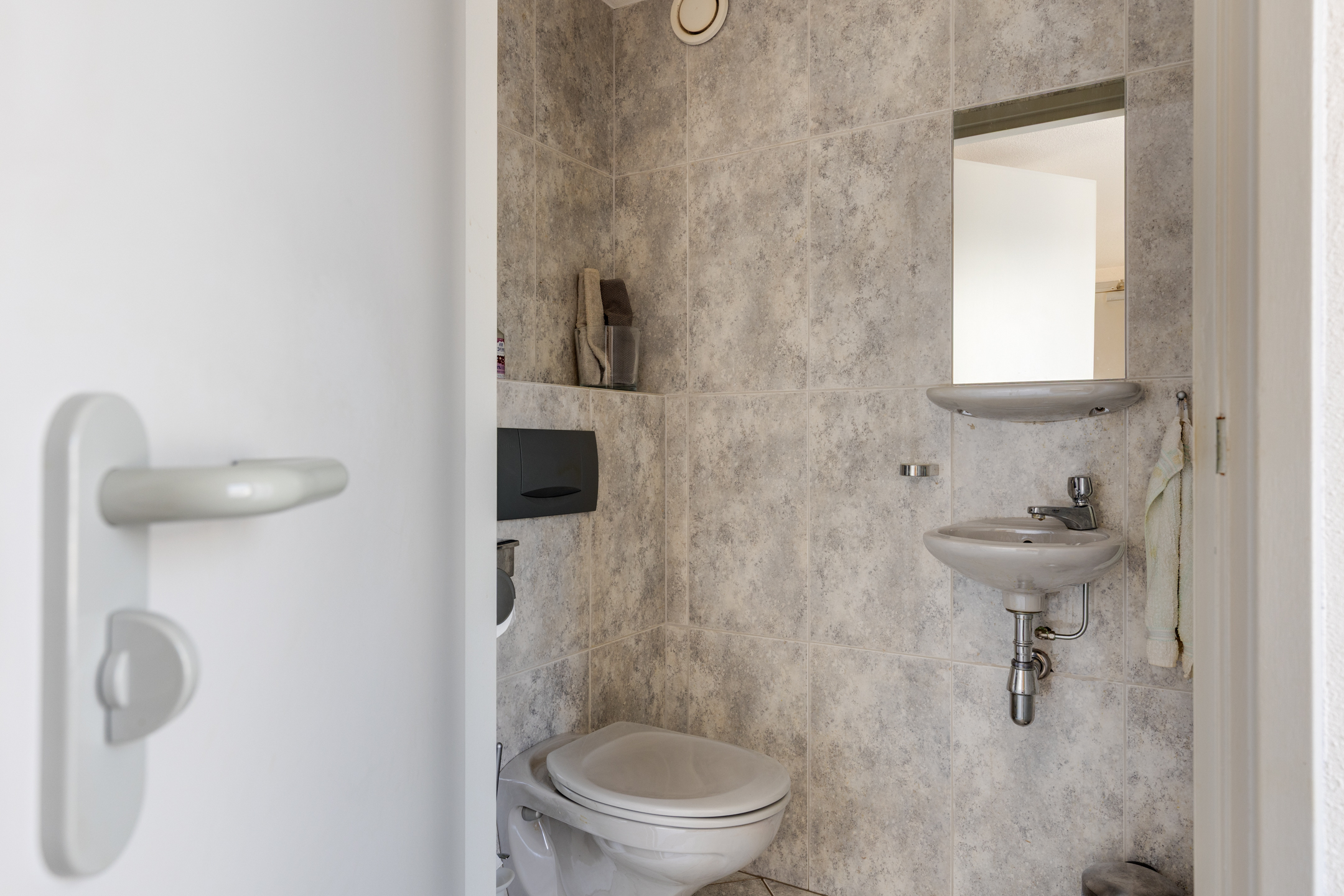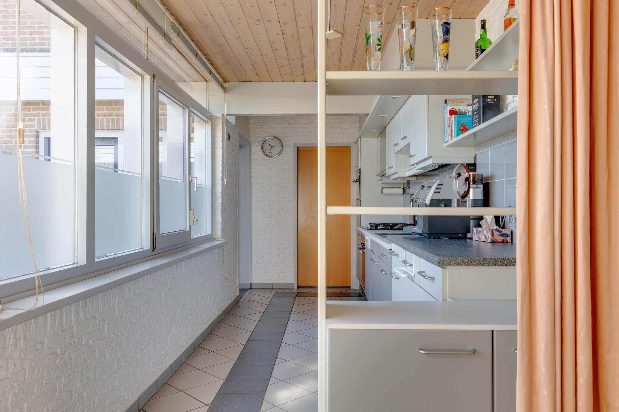 Het kantoor heeft een eigen ingang aan de buitenzijde en is voorzien van een separate toiletruimte. Via het kantoor is de garage inpandig bereikbaar en is er een trap naar het bovengelegen atelier.