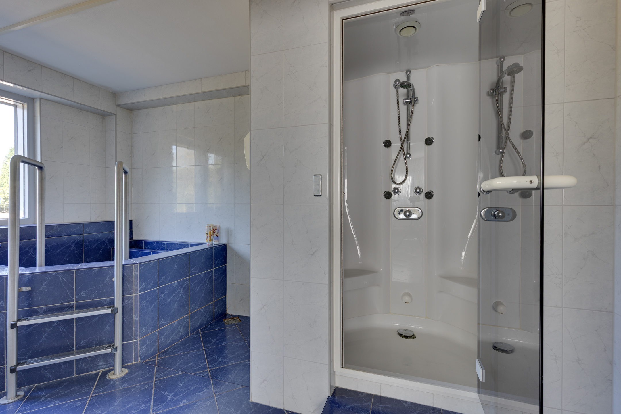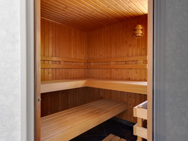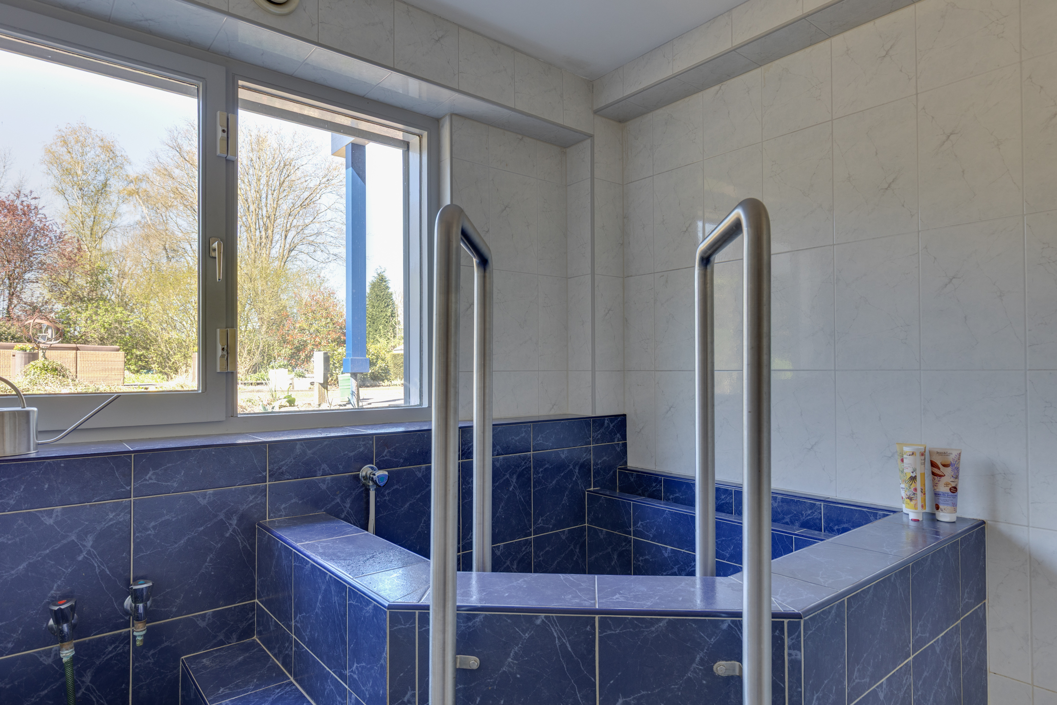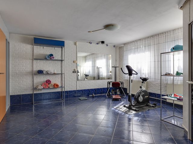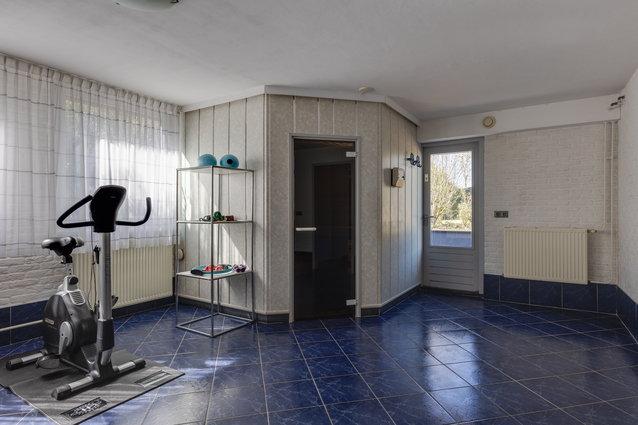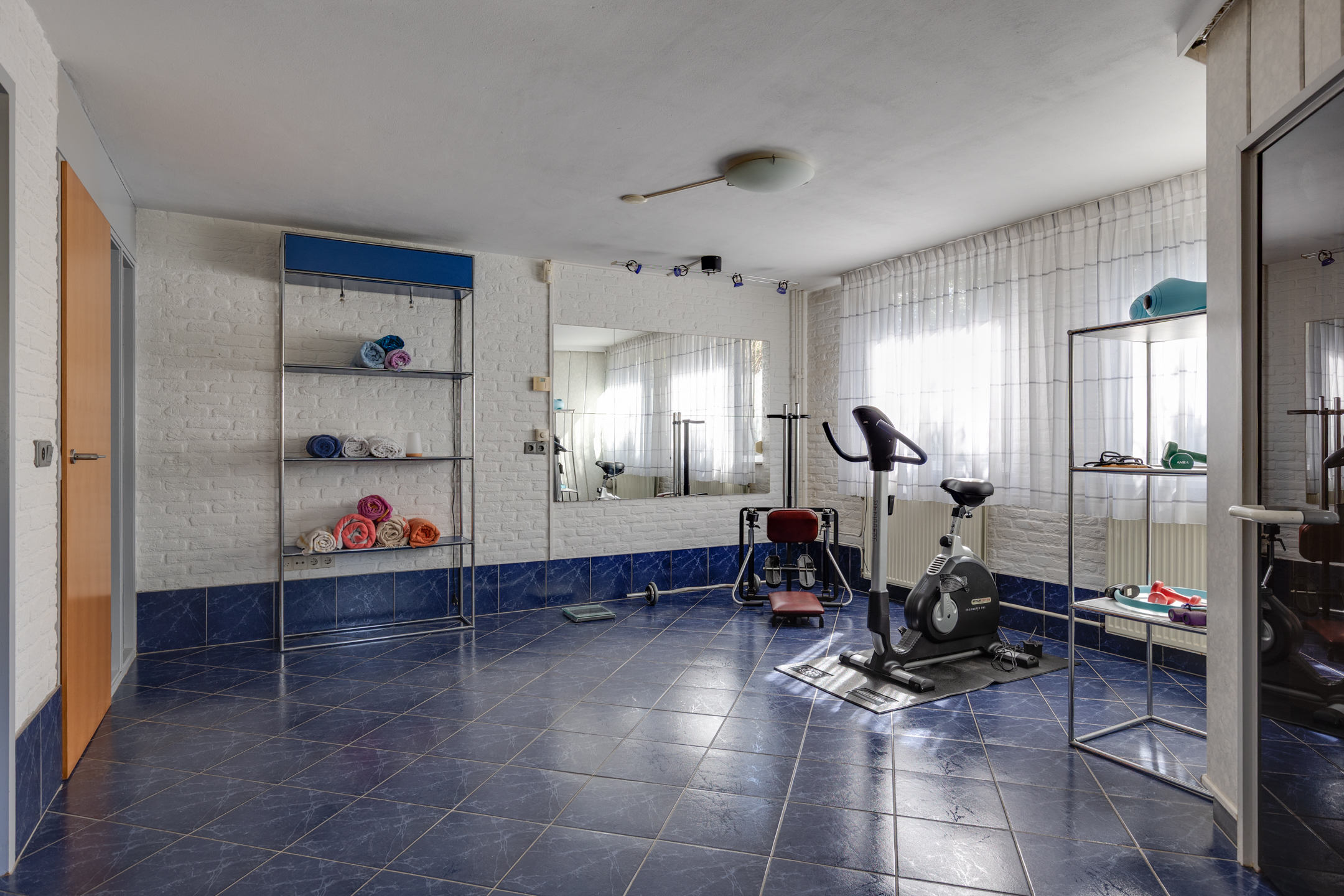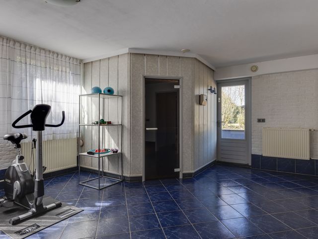 In de linkervleugel op de begane grond van deze woning bevinden zich een fitnessruimte en sauna. Ook treft u hier een dompelbad en stoomdouchecabine. De fitnessruimte heeft een deur naar de achtertuin.
