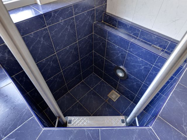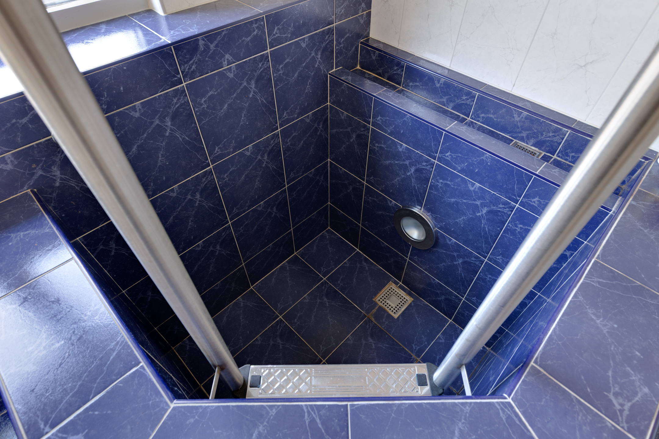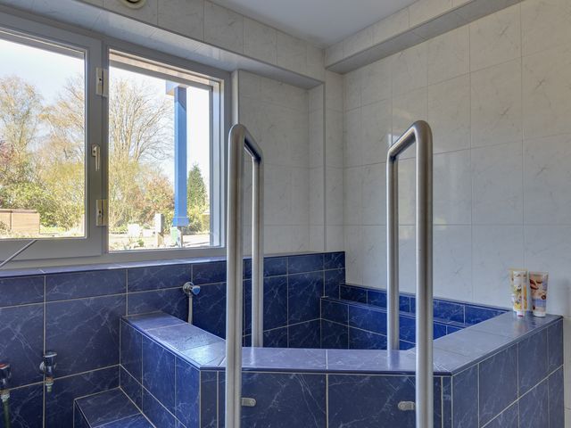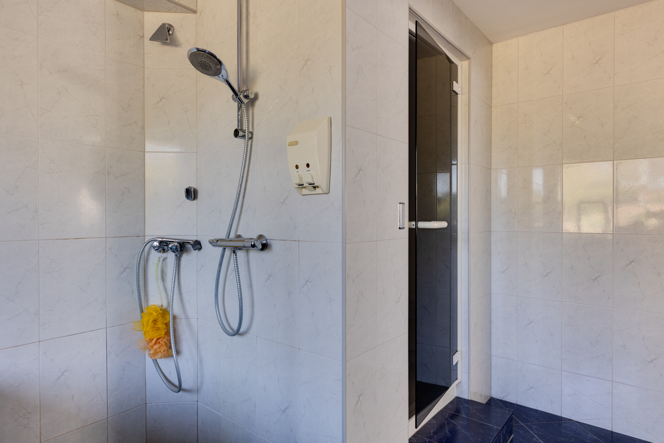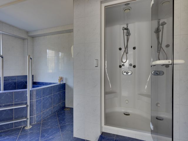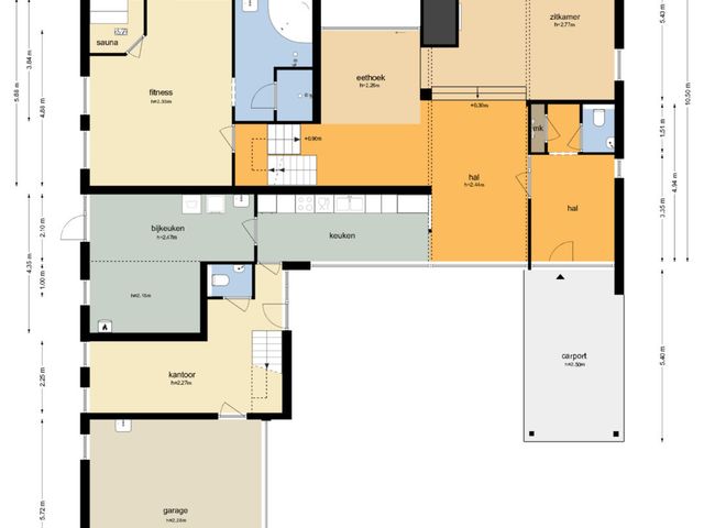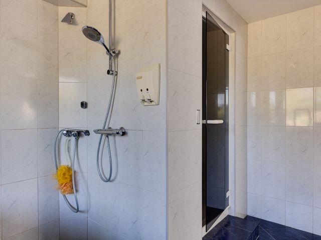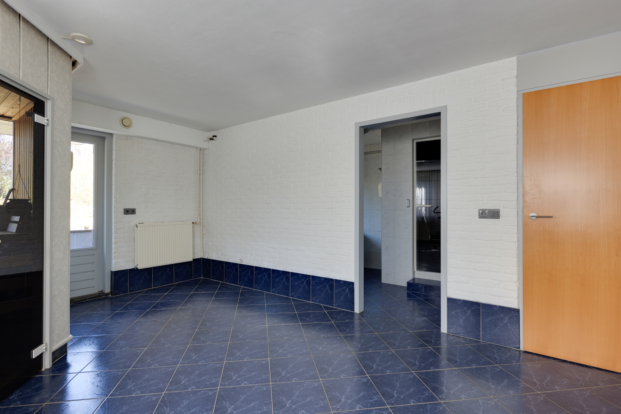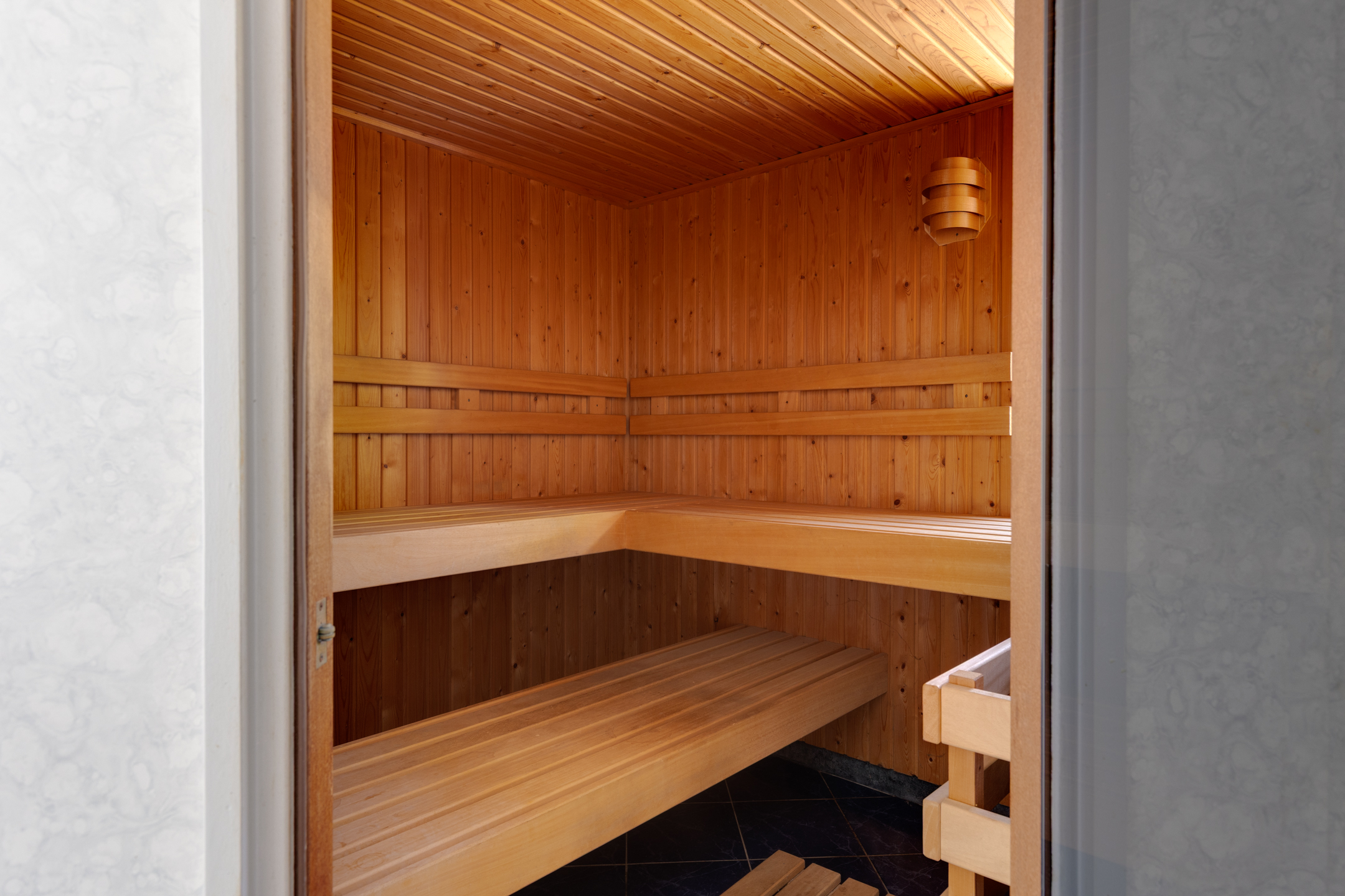 In de linkervleugel op de begane grond van deze woning bevinden zich een fitnessruimte en sauna. Ook treft u hier een dompelbad en stoomdouchecabine. De fitnessruimte heeft een deur naar de achtertuin.