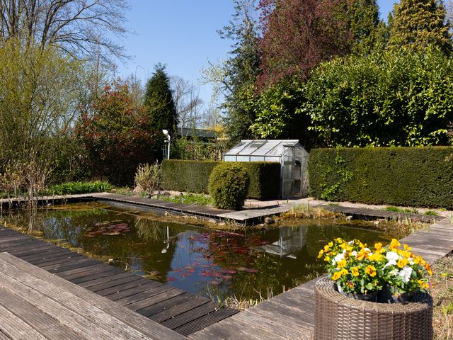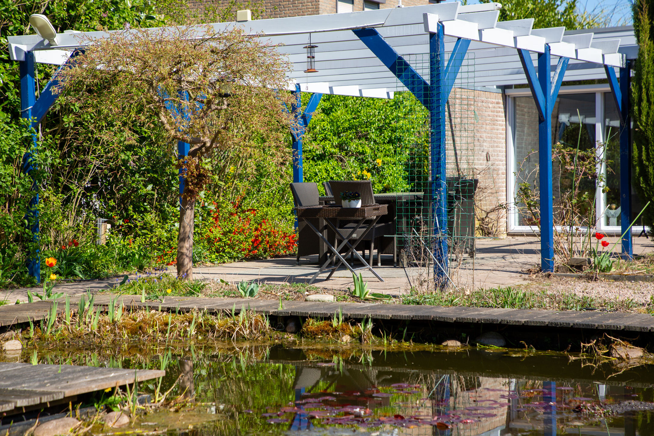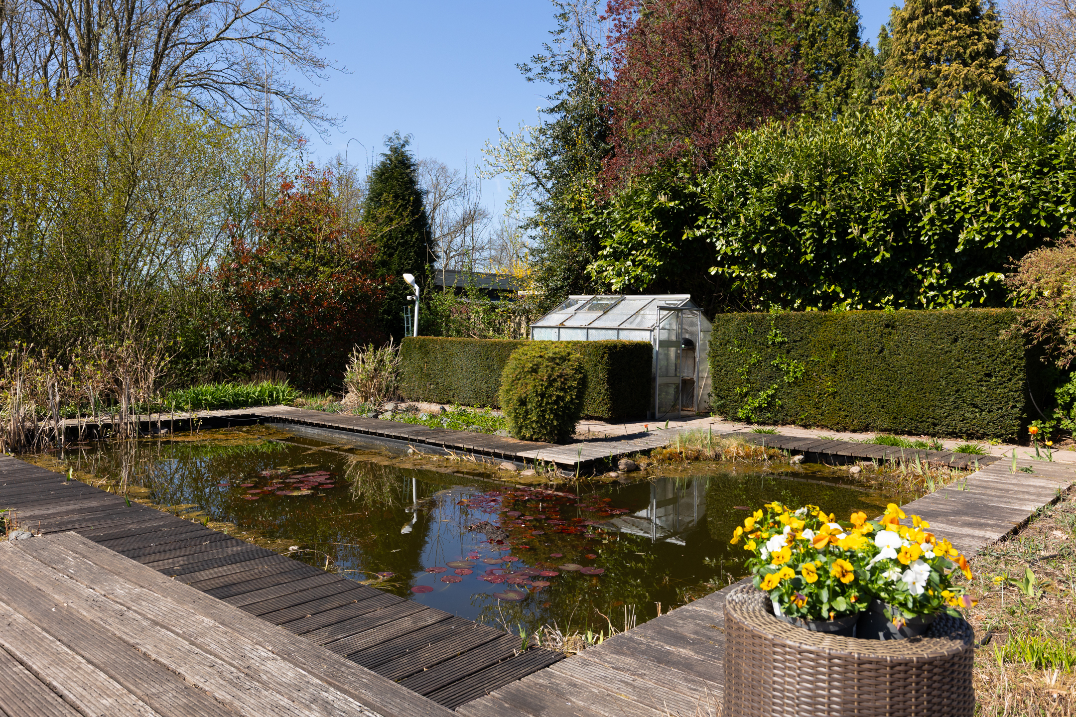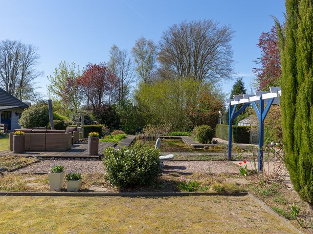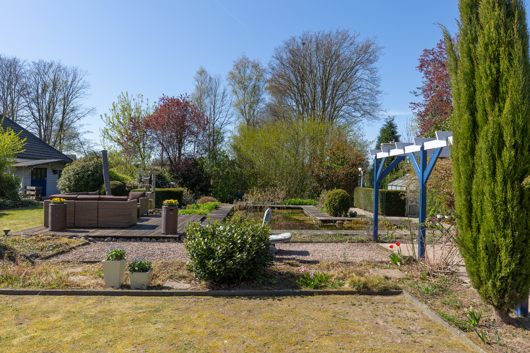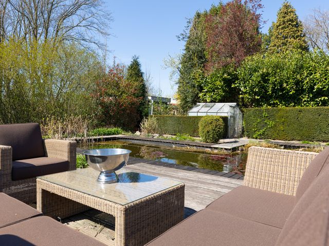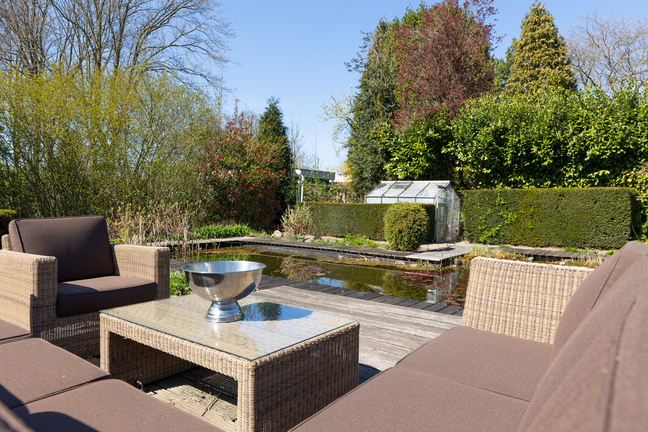 De zonnige tuin aan de achterzijde van de woning is gelegen op het Westen en o.a. ingericht met meerdere terrassen en een grote vijverpartij met vlonders. De zitkamer, eethoek en de fitnessruimte met sauna en dompelbad grenzen aan de achtertuin. In de achtertuin bevinden zich een houten tuinhuisje en een voormalige broeikas.