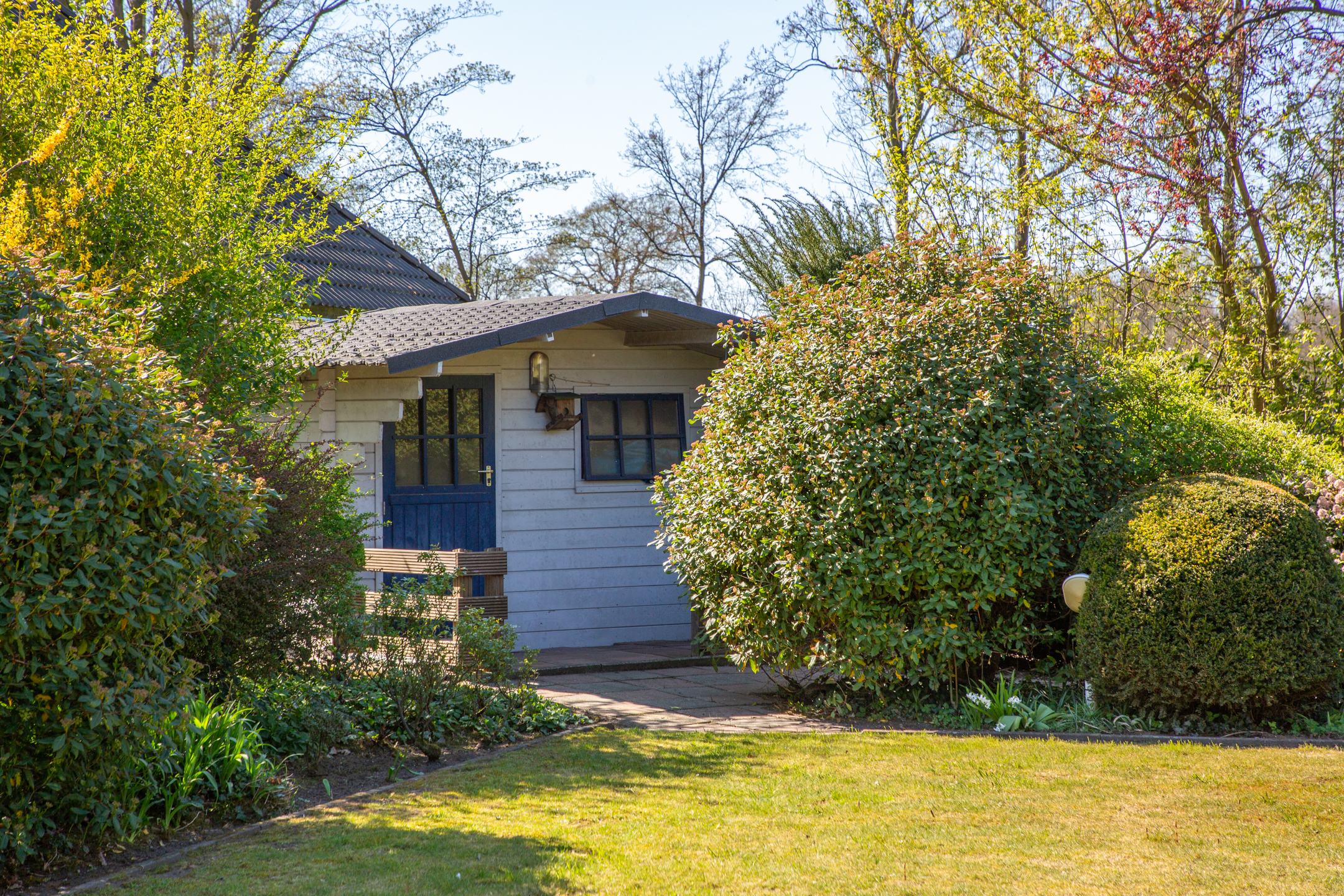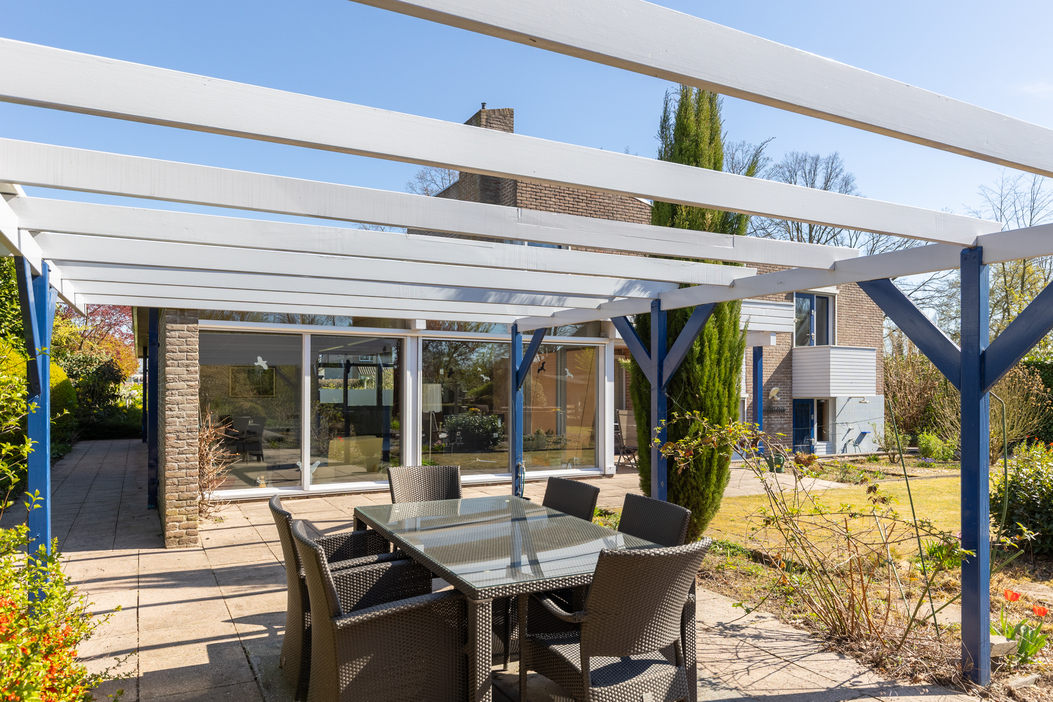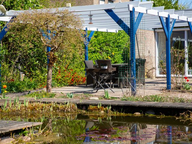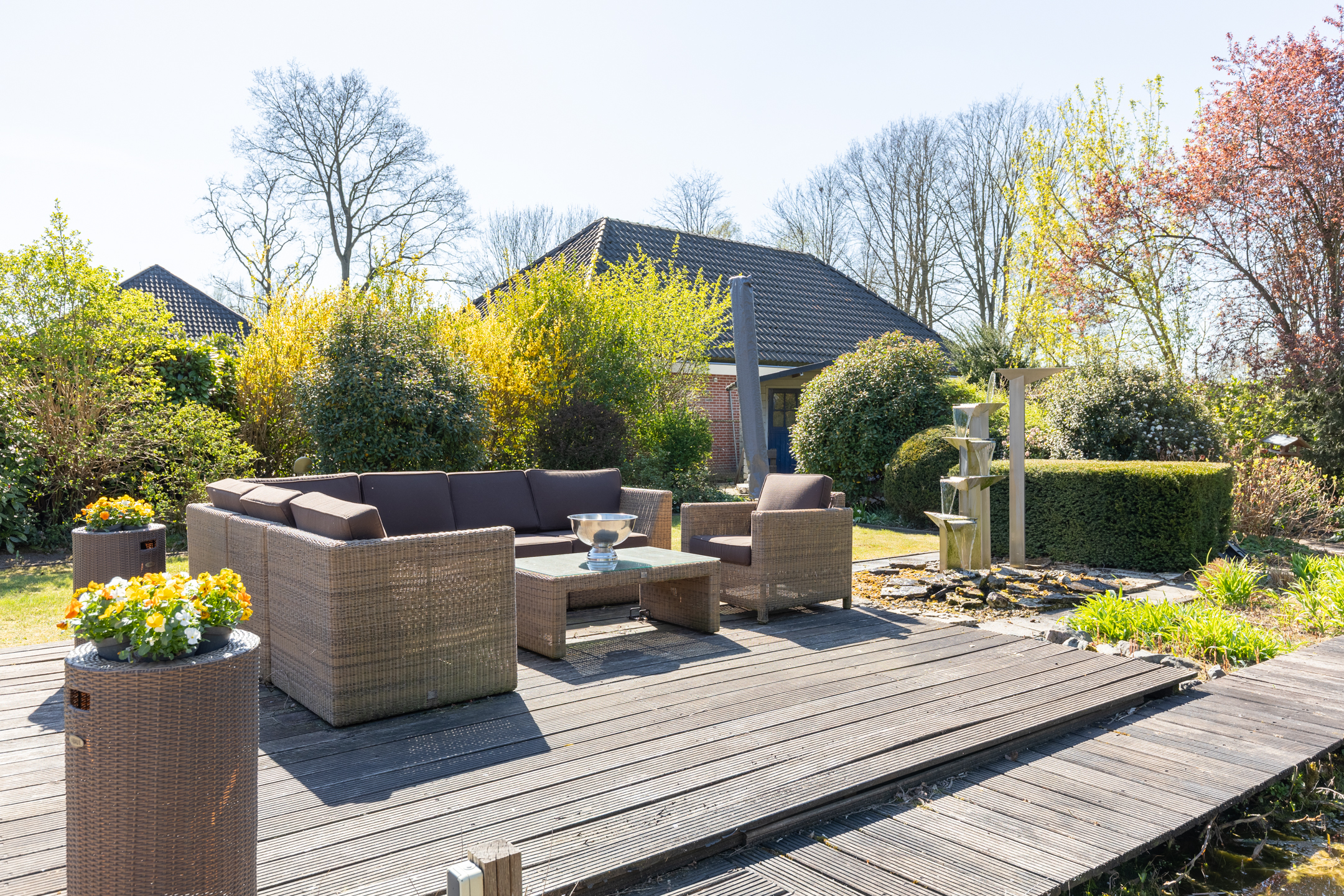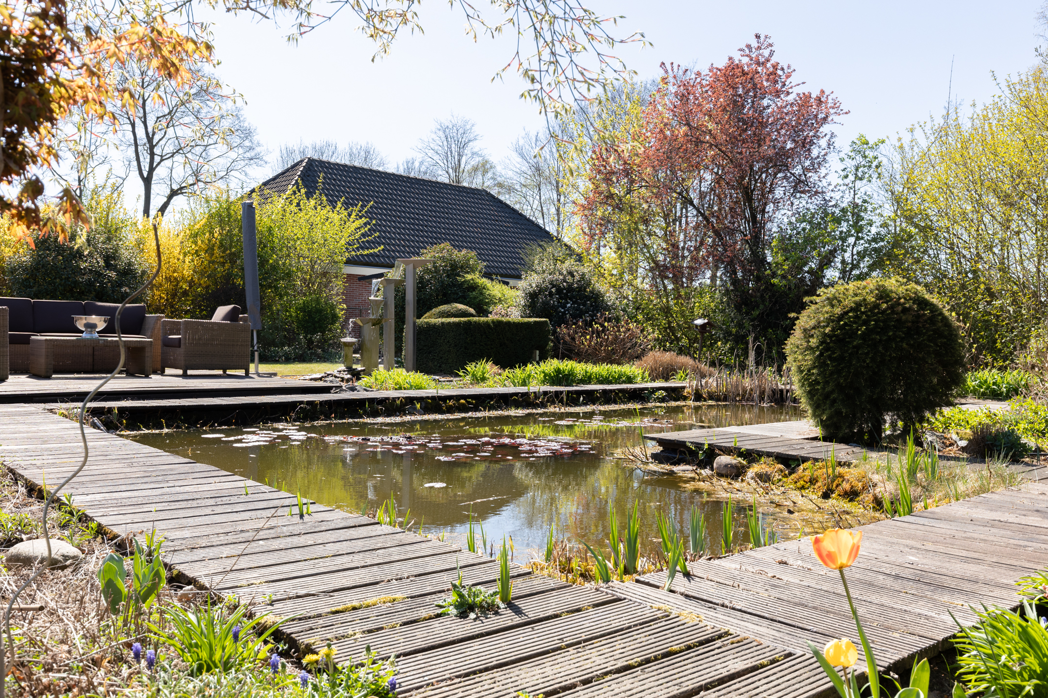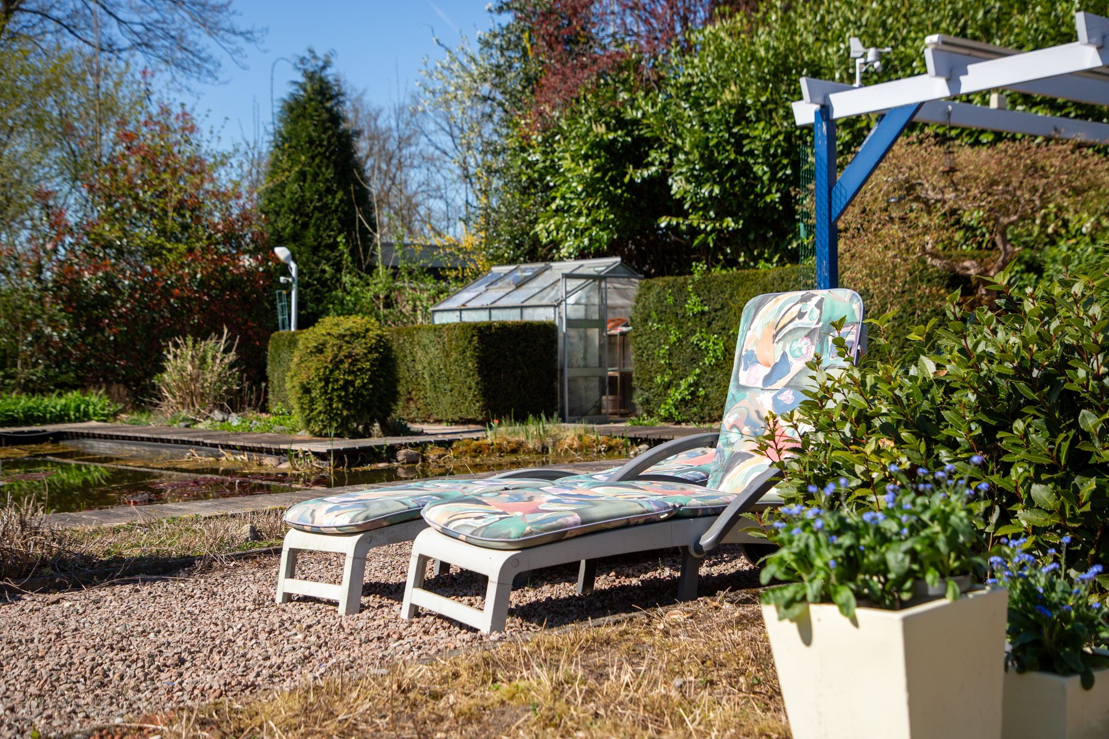 De zonnige tuin aan de achterzijde van de woning is gelegen op het Westen en o.a. ingericht met meerdere terrassen en een grote vijverpartij met vlonders. De zitkamer, eethoek en de fitnessruimte met sauna en dompelbad grenzen aan de achtertuin. In de achtertuin bevinden zich een houten tuinhuisje en een voormalige broeikas.
