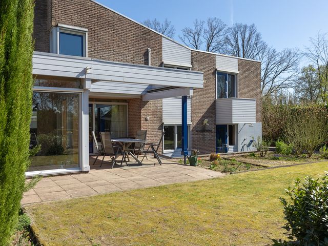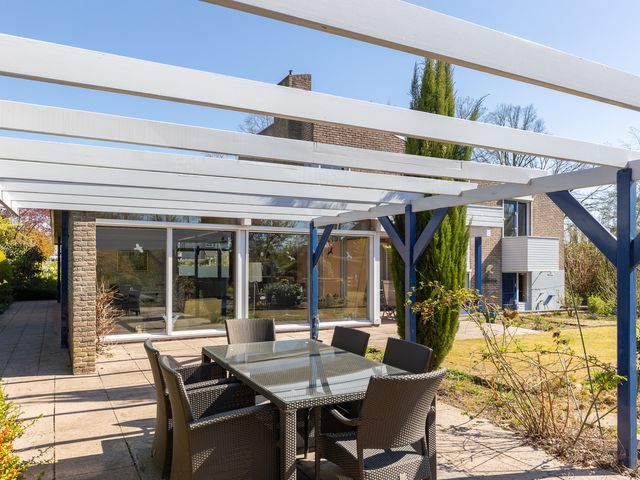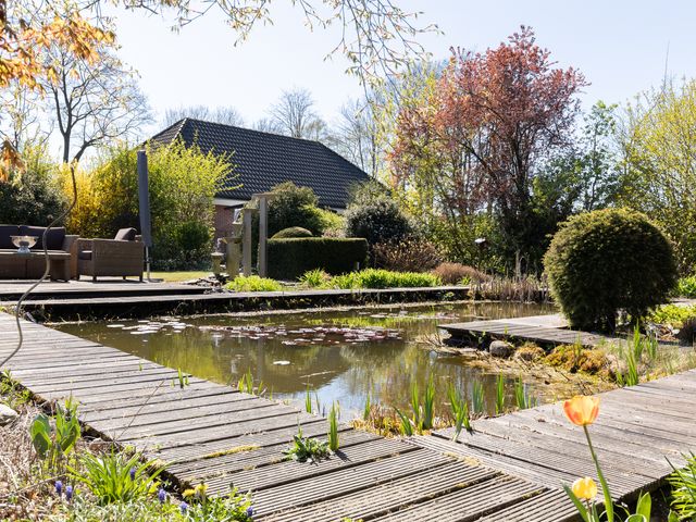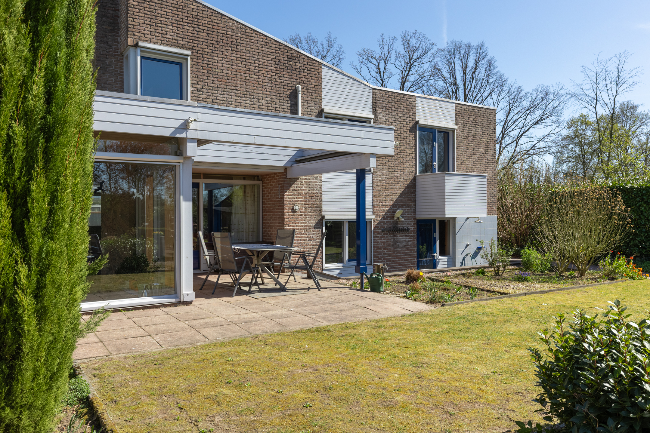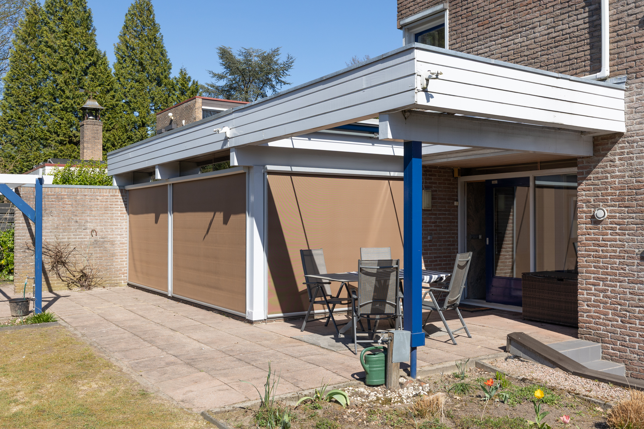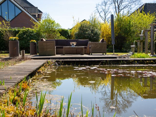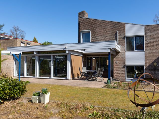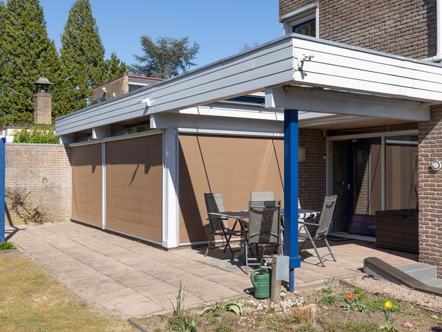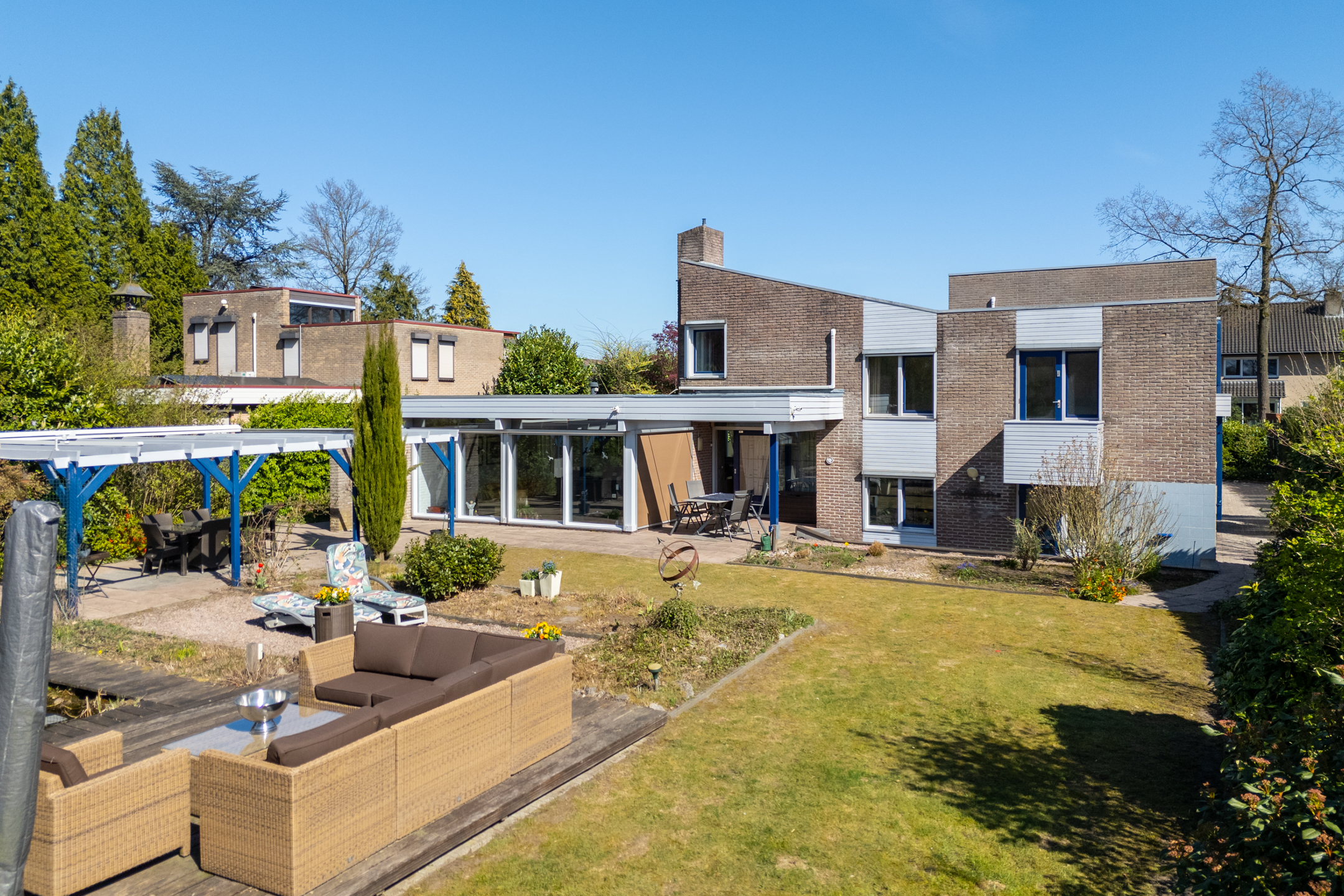 De zonnige tuin aan de achterzijde van de woning is gelegen op het Westen en o.a. ingericht met meerdere terrassen en een grote vijverpartij met vlonders. De zitkamer, eethoek en de fitnessruimte met sauna en dompelbad grenzen aan de achtertuin. In de achtertuin bevinden zich een houten tuinhuisje en een voormalige broeikas.