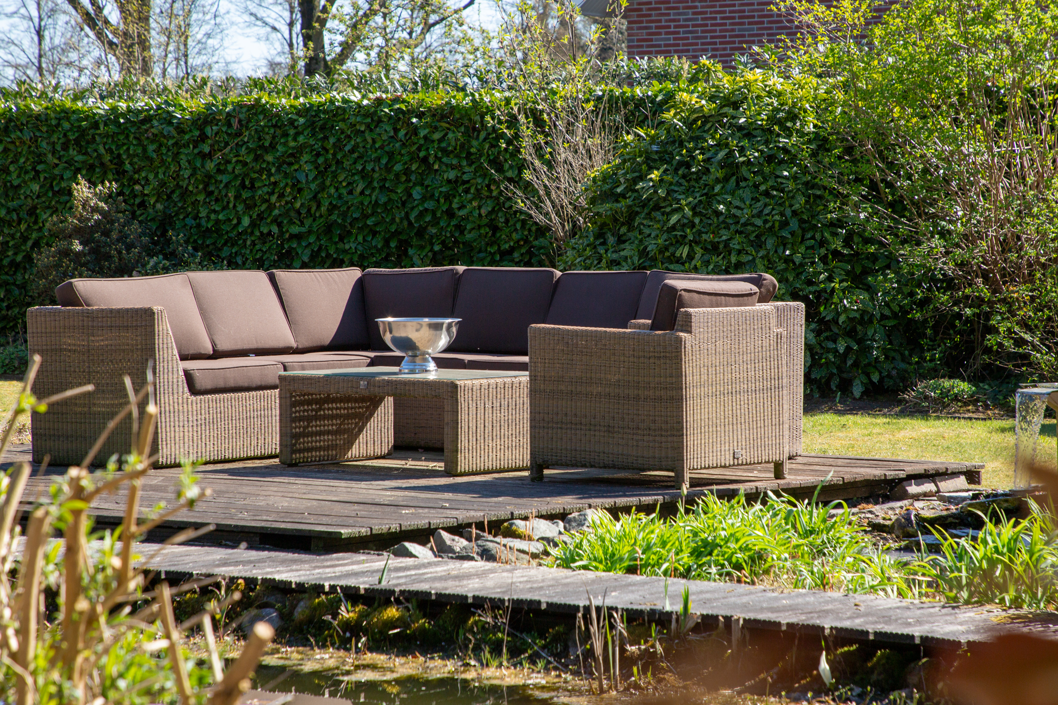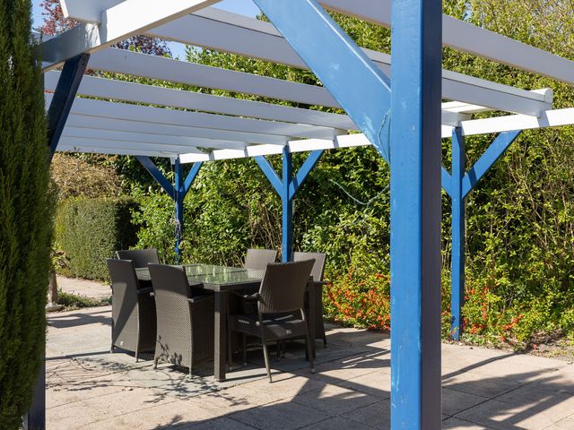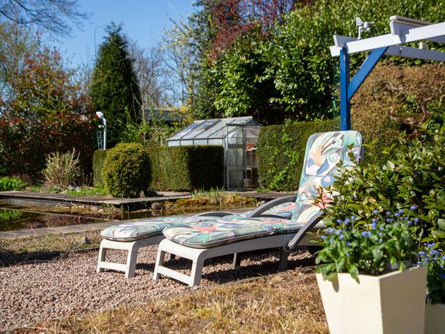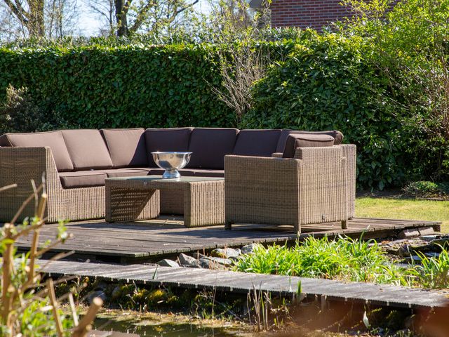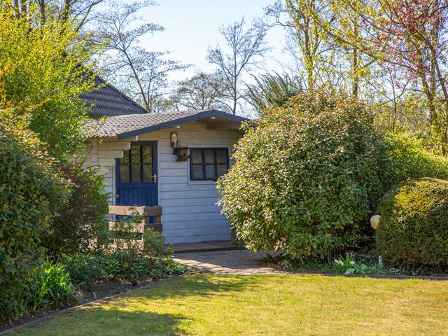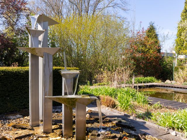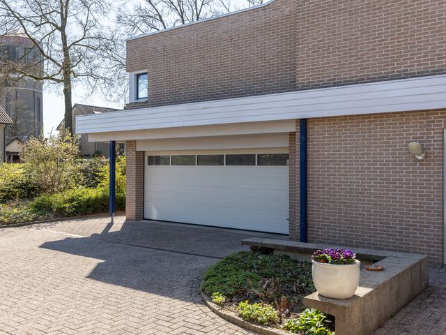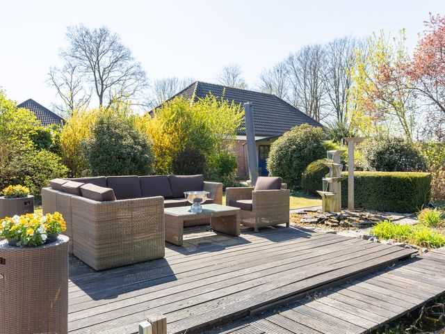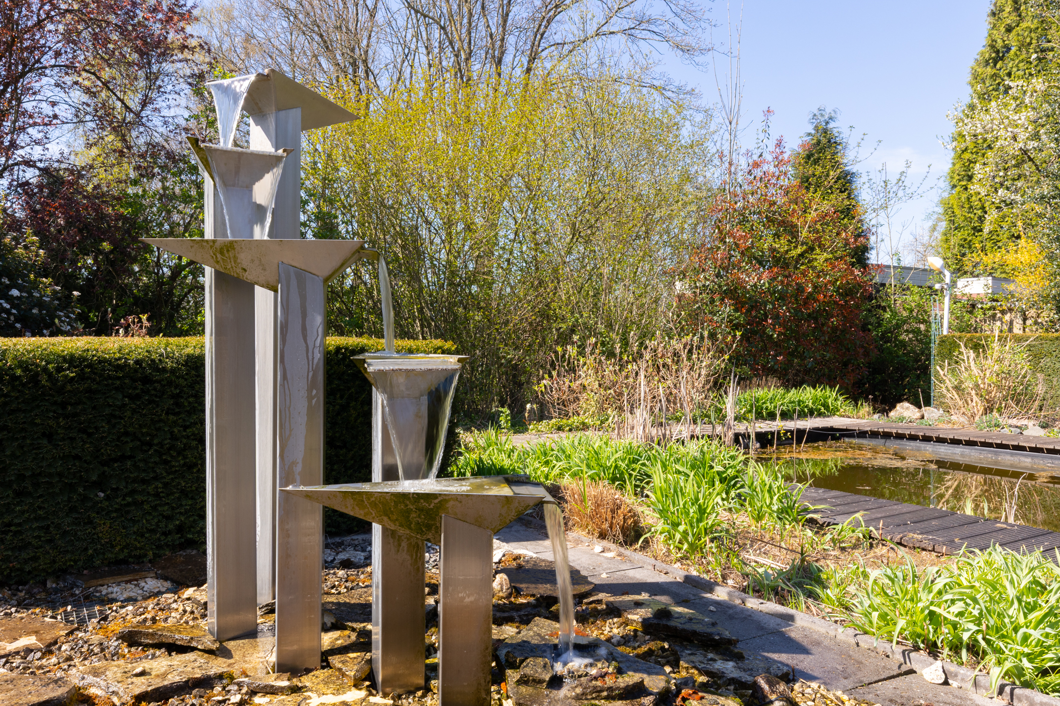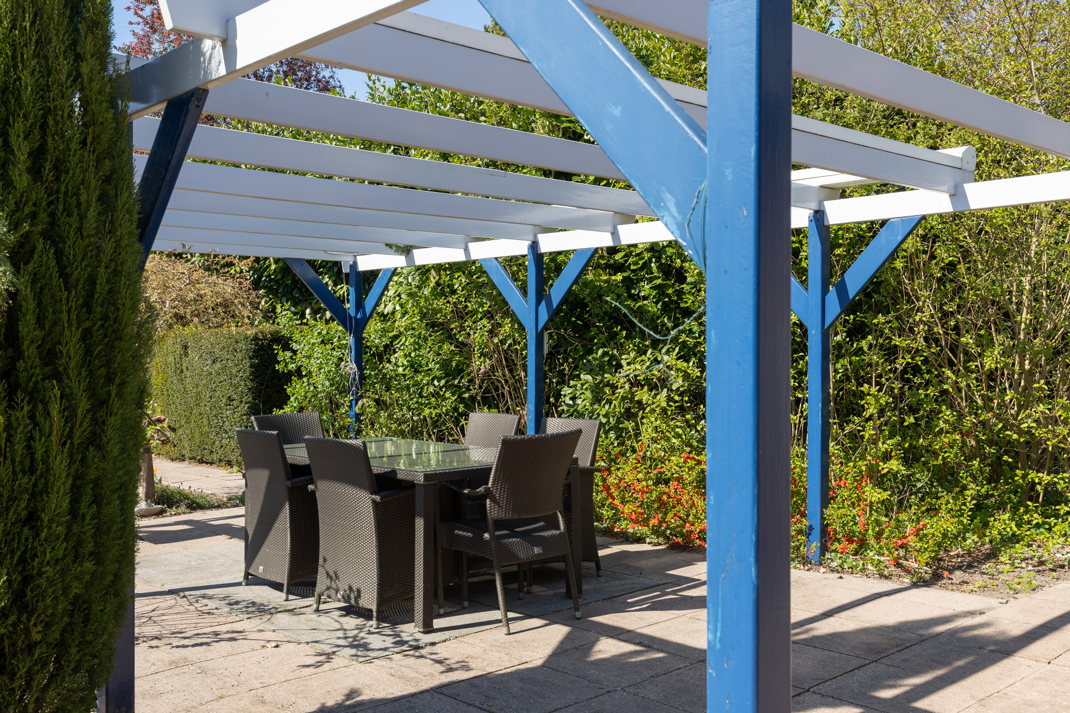 De zonnige tuin aan de achterzijde van de woning is gelegen op het Westen en o.a. ingericht met meerdere terrassen en een grote vijverpartij met vlonders. De zitkamer, eethoek en de fitnessruimte met sauna en dompelbad grenzen aan de achtertuin. In de achtertuin bevinden zich een houten tuinhuisje en een voormalige broeikas.