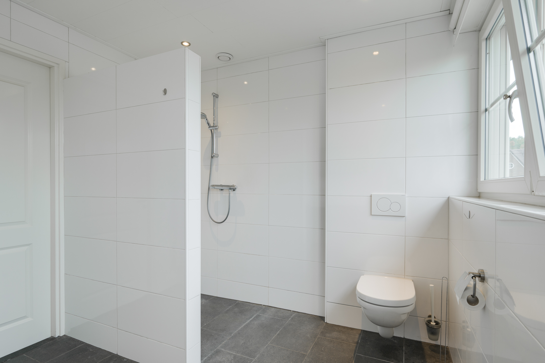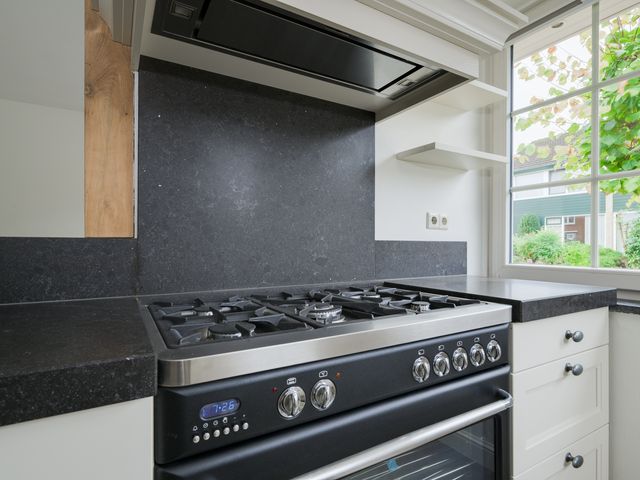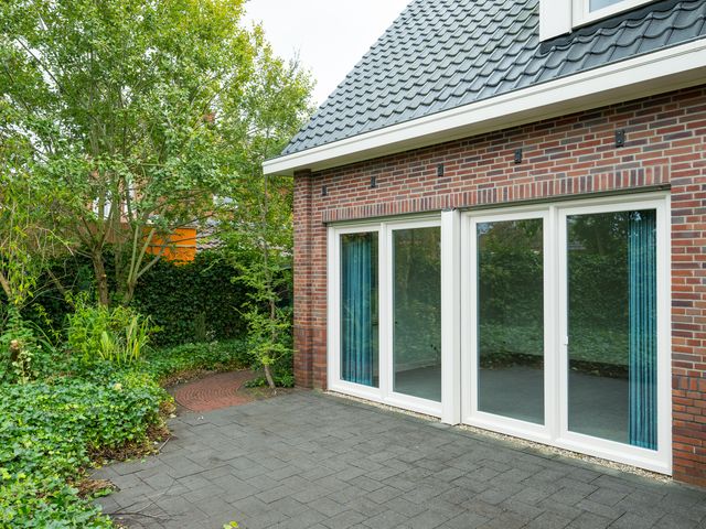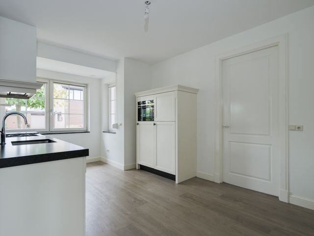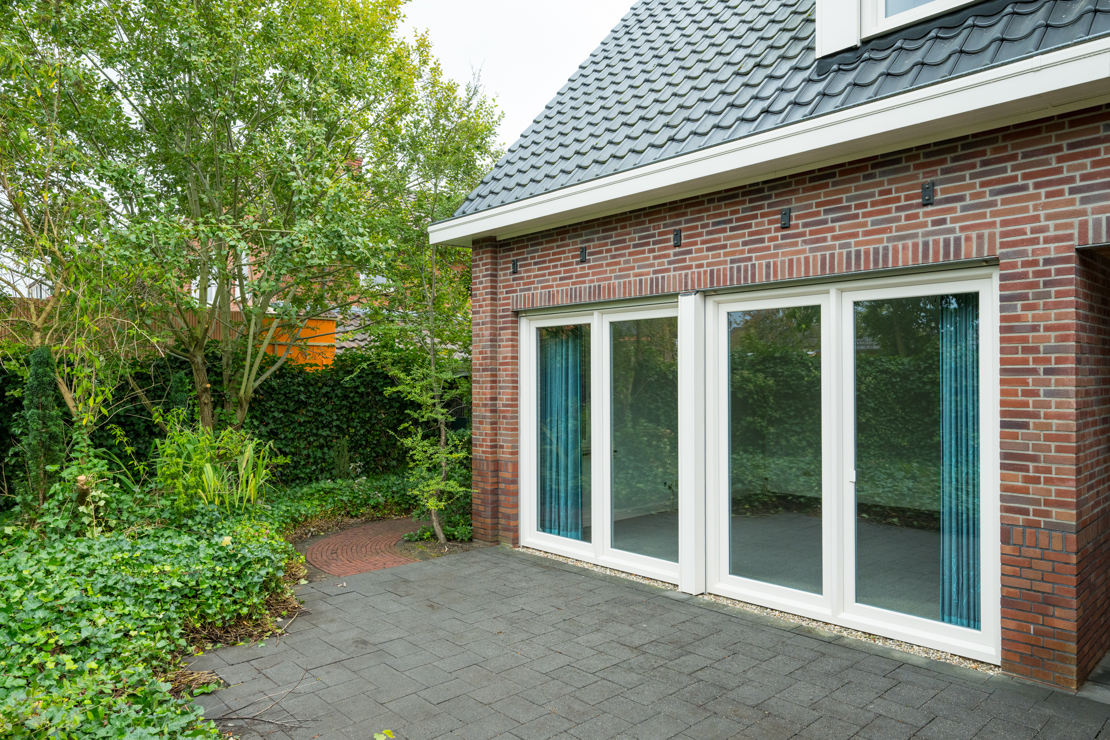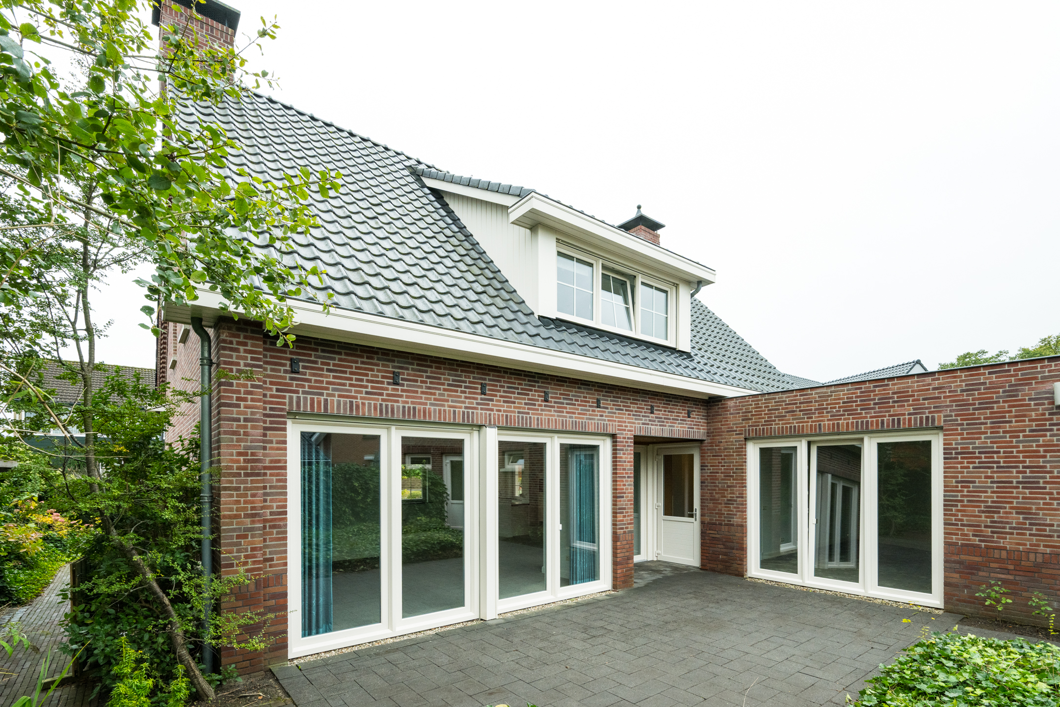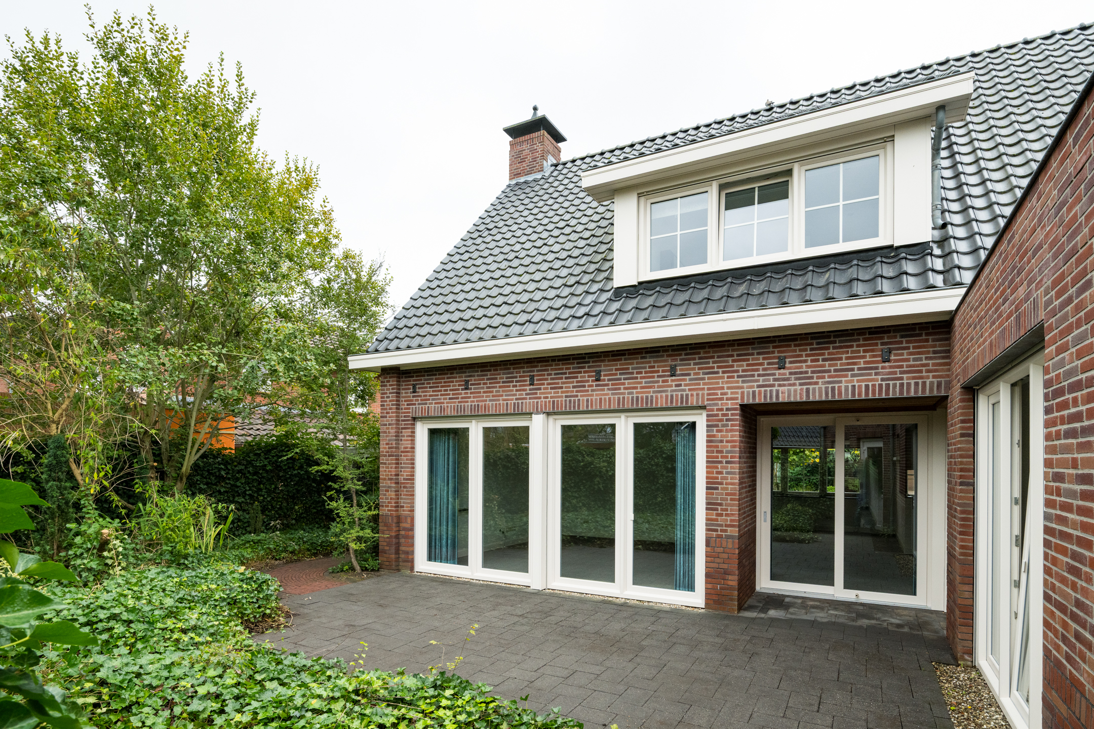 Begane grond: Via de overdekte entree betreedt u de woning. U komt binnen in een ruime en lichte hal met trapopgang naar de eerste verdieping en toegang tot de meterkast. Vanuit de hal bereikt u de royale, Z-vormige woonkamer die dankzij de grote raampartijen bijzonder veel lichtinval geniet. Een schuifpui biedt hier direct toegang tot de achtertuin. De woonkamer staat in open verbinding met de keuken, die is voorzien van diverse inbouwapparatuur, waaronder een hoogwaardig gasfornuis van het merk 'Fratelli'. Diverse raamkozijnen zijn voorzien van rolluiken en (binnen)screens. Aansluitend aan de keuken bevindt zich een tweede hal met toegang tot de voortuin en de aangebouwde garage. De garage beschikt over een praktische inbouwkast en een elektrische garagedeur en leent zich uitstekend als werkplaats of voor het stallen van (smalle) voertuigen. Vanuit de keuken bereikt u tevens de bijkeuken, voorzien van een keukenblok met onder andere een wastafel en inbouwkoelkast. Vanuit de bijkeuken is er toegang tot een separate toiletruimte met fonteintje, de achtertuin én de slaapkamer op de begane grond. Deze ruime slaapkamer is sfeervol afgewerkt met inbouwspotjes en beschikt over een groot raamkozijn met uitzicht op de beschutte achtertuin. Direct aangrenzend vindt u de badkamer met inloopdouche, toilet en wastafel. Nagenoeg de gehele begane grond is voorzien van vloerverwarming, wat zorgt voor een aangenaam wooncomfort.