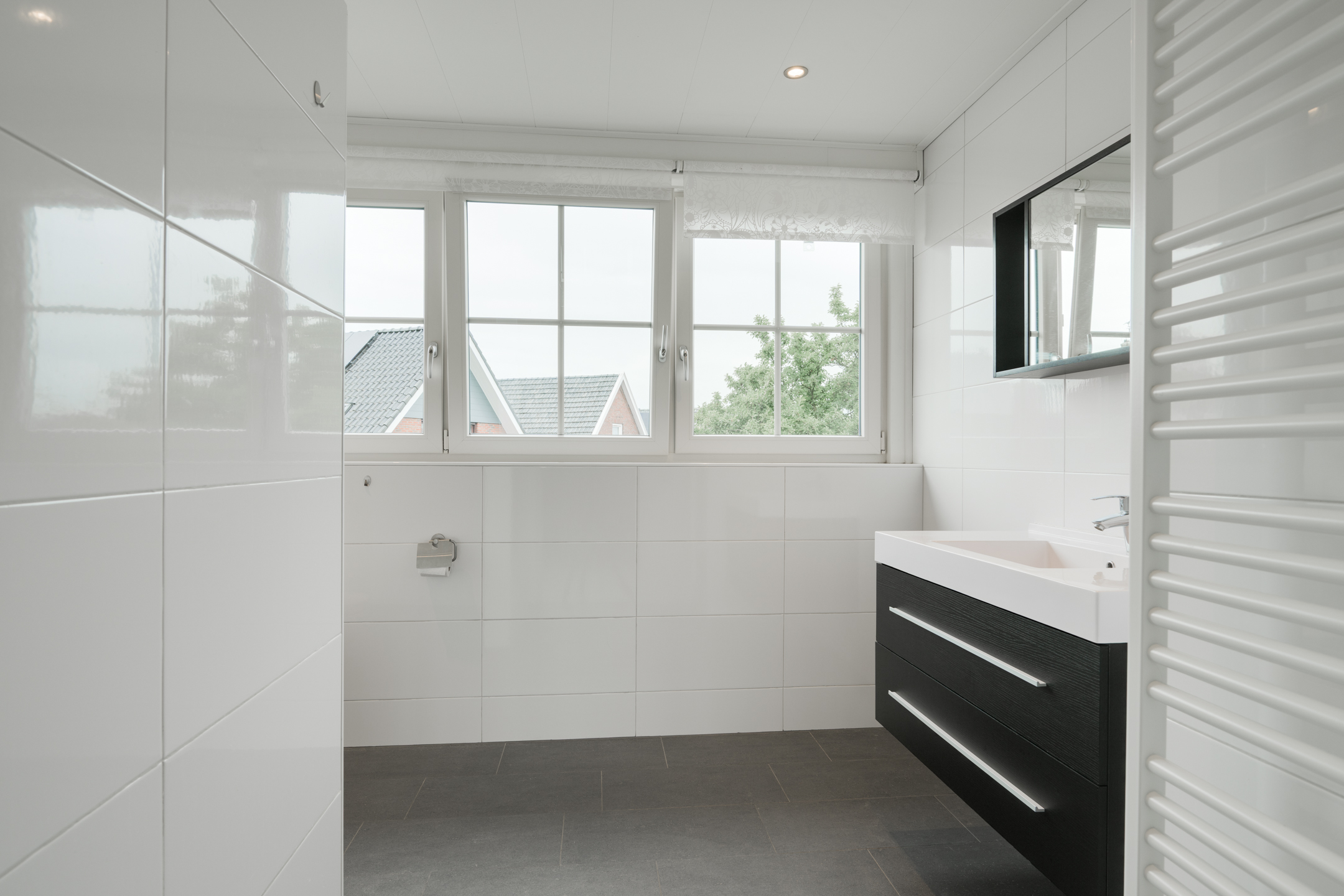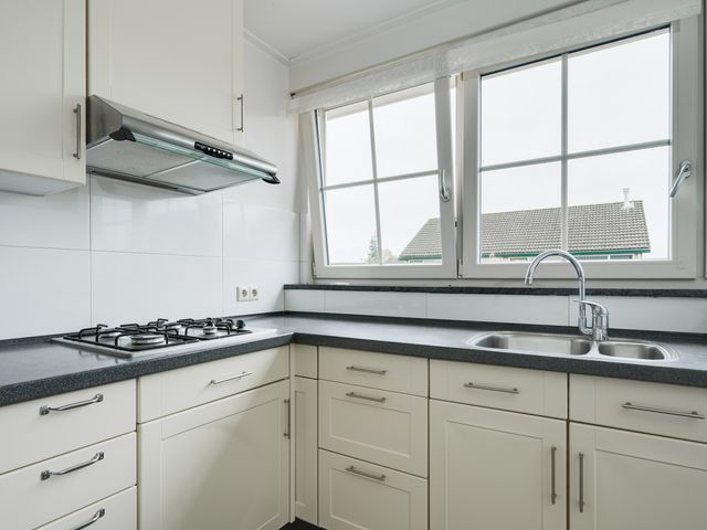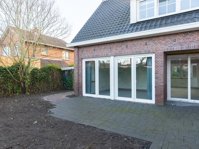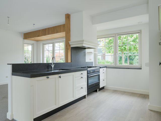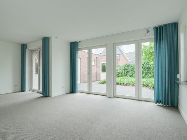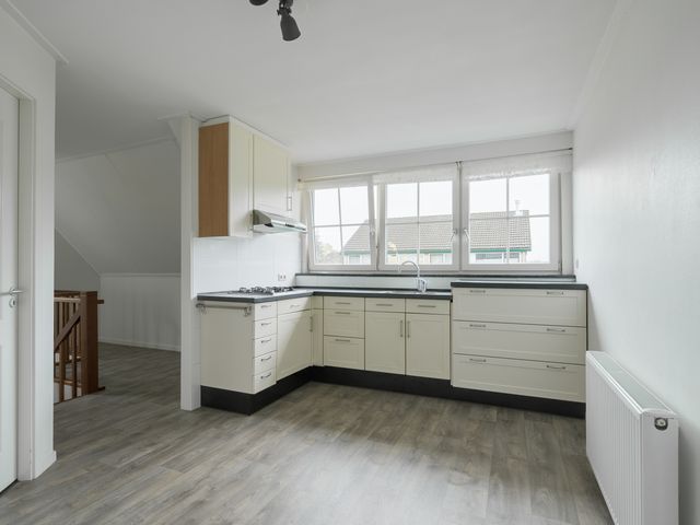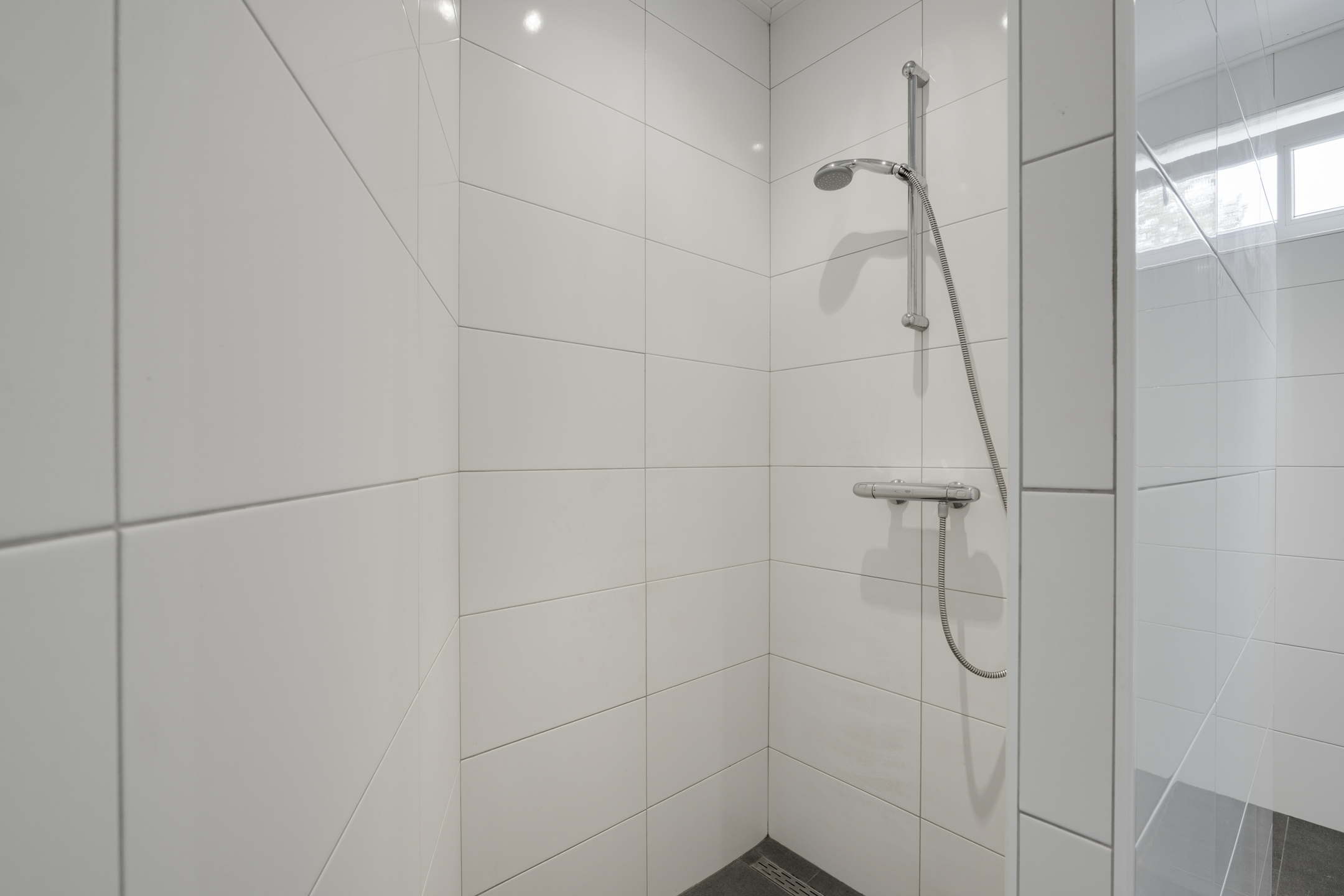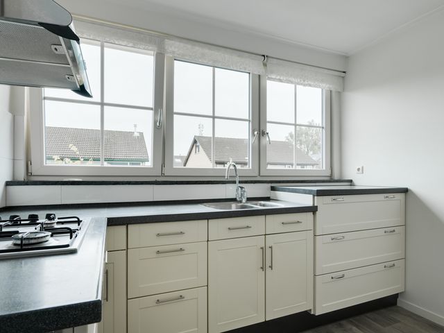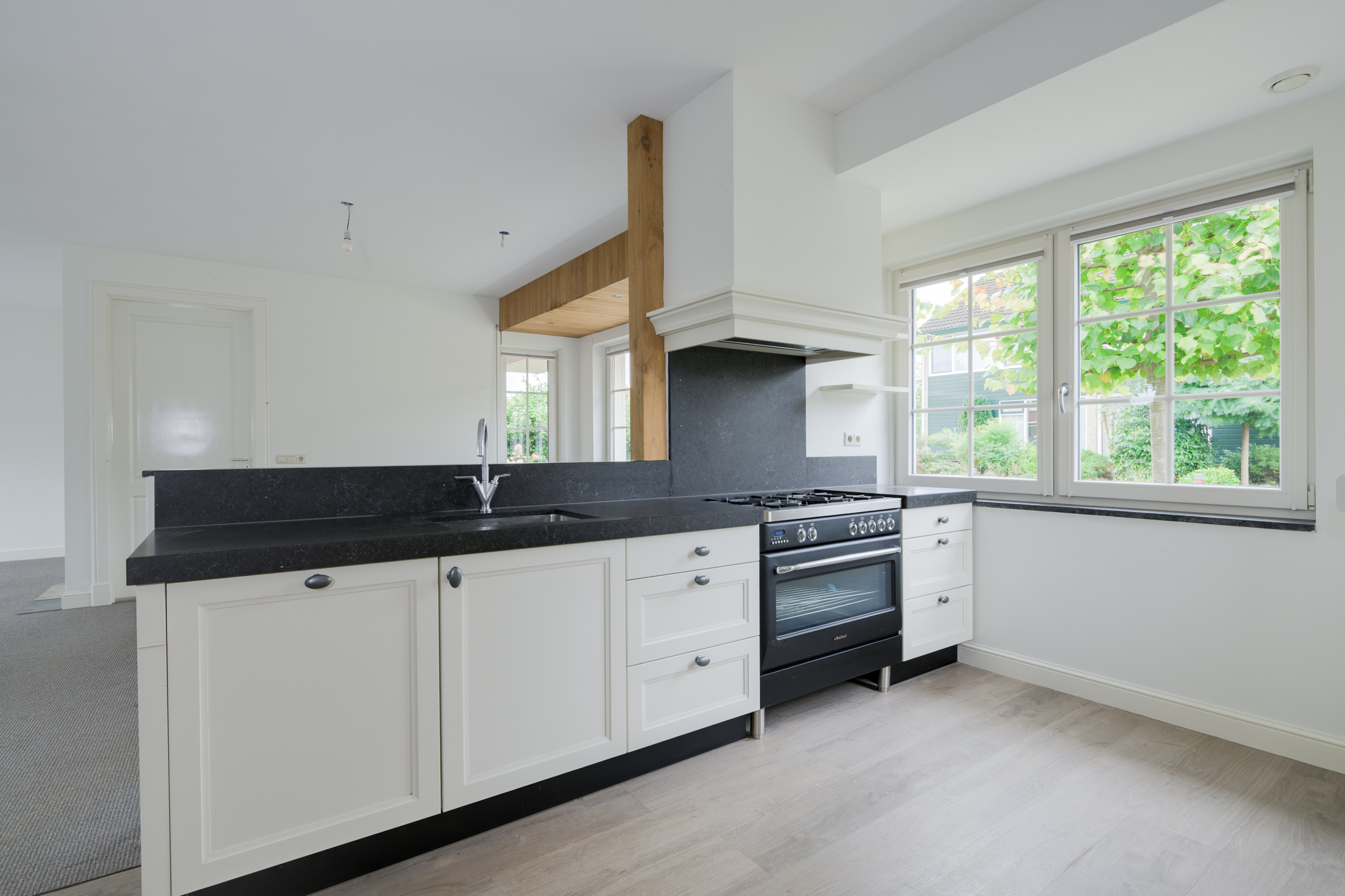 Begane grond: Via de overdekte entree betreedt u de woning. U komt binnen in een ruime en lichte hal met trapopgang naar de eerste verdieping en toegang tot de meterkast. Vanuit de hal bereikt u de royale, Z-vormige woonkamer die dankzij de grote raampartijen bijzonder veel lichtinval geniet. Een schuifpui biedt hier direct toegang tot de achtertuin. De woonkamer staat in open verbinding met de keuken, die is voorzien van diverse inbouwapparatuur, waaronder een hoogwaardig gasfornuis van het merk 'Fratelli'. Diverse raamkozijnen zijn voorzien van rolluiken en (binnen)screens. Aansluitend aan de keuken bevindt zich een tweede hal met toegang tot de voortuin en de aangebouwde garage. De garage beschikt over een praktische inbouwkast en een elektrische garagedeur en leent zich uitstekend als werkplaats of voor het stallen van (smalle) voertuigen. Vanuit de keuken bereikt u tevens de bijkeuken, voorzien van een keukenblok met onder andere een wastafel en inbouwkoelkast. Vanuit de bijkeuken is er toegang tot een separate toiletruimte met fonteintje, de achtertuin én de slaapkamer op de begane grond. Deze ruime slaapkamer is sfeervol afgewerkt met inbouwspotjes en beschikt over een groot raamkozijn met uitzicht op de beschutte achtertuin. Direct aangrenzend vindt u de badkamer met inloopdouche, toilet en wastafel. Nagenoeg de gehele begane grond is voorzien van vloerverwarming, wat zorgt voor een aangenaam wooncomfort.