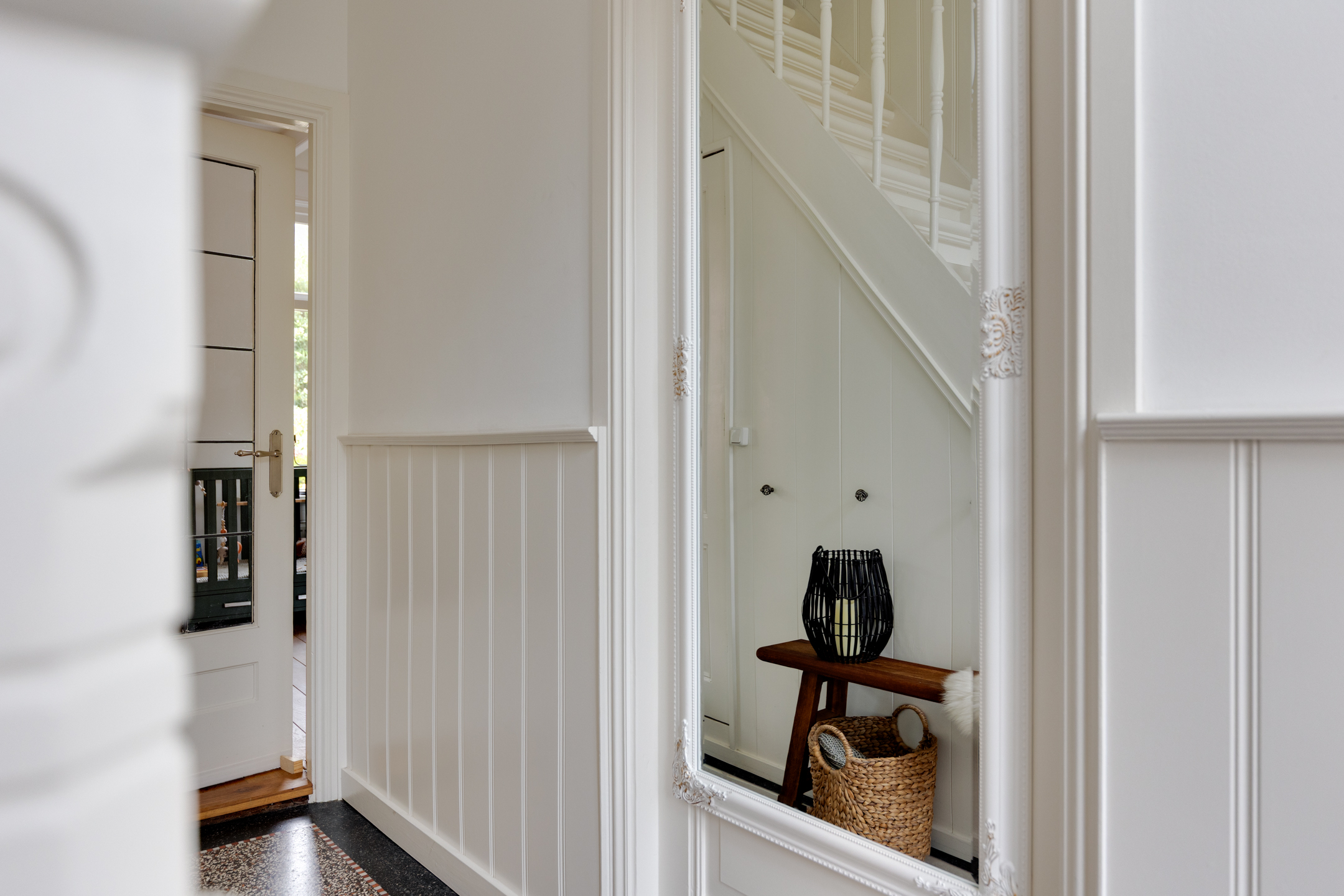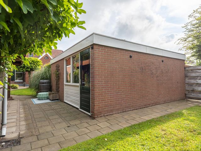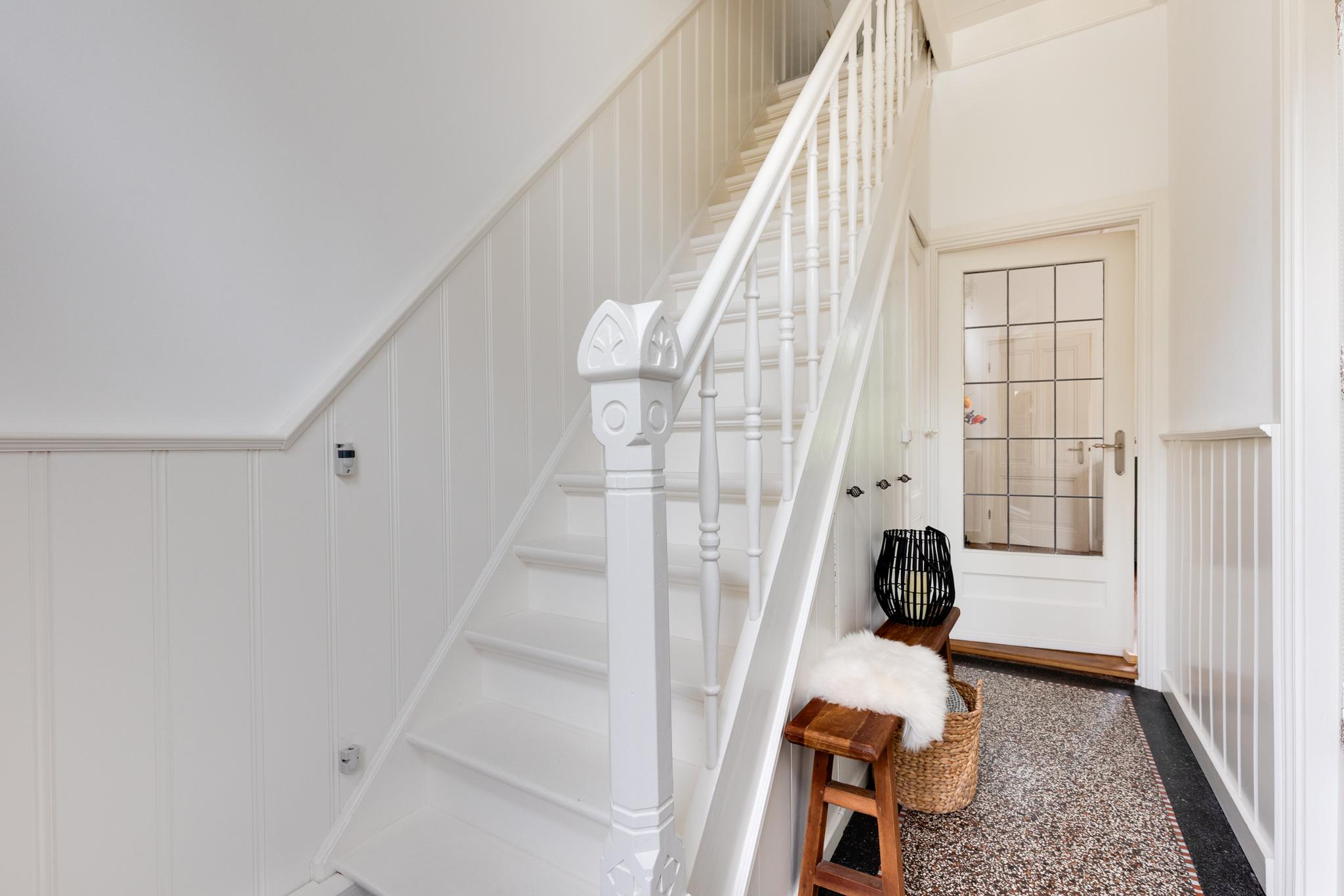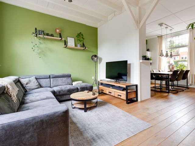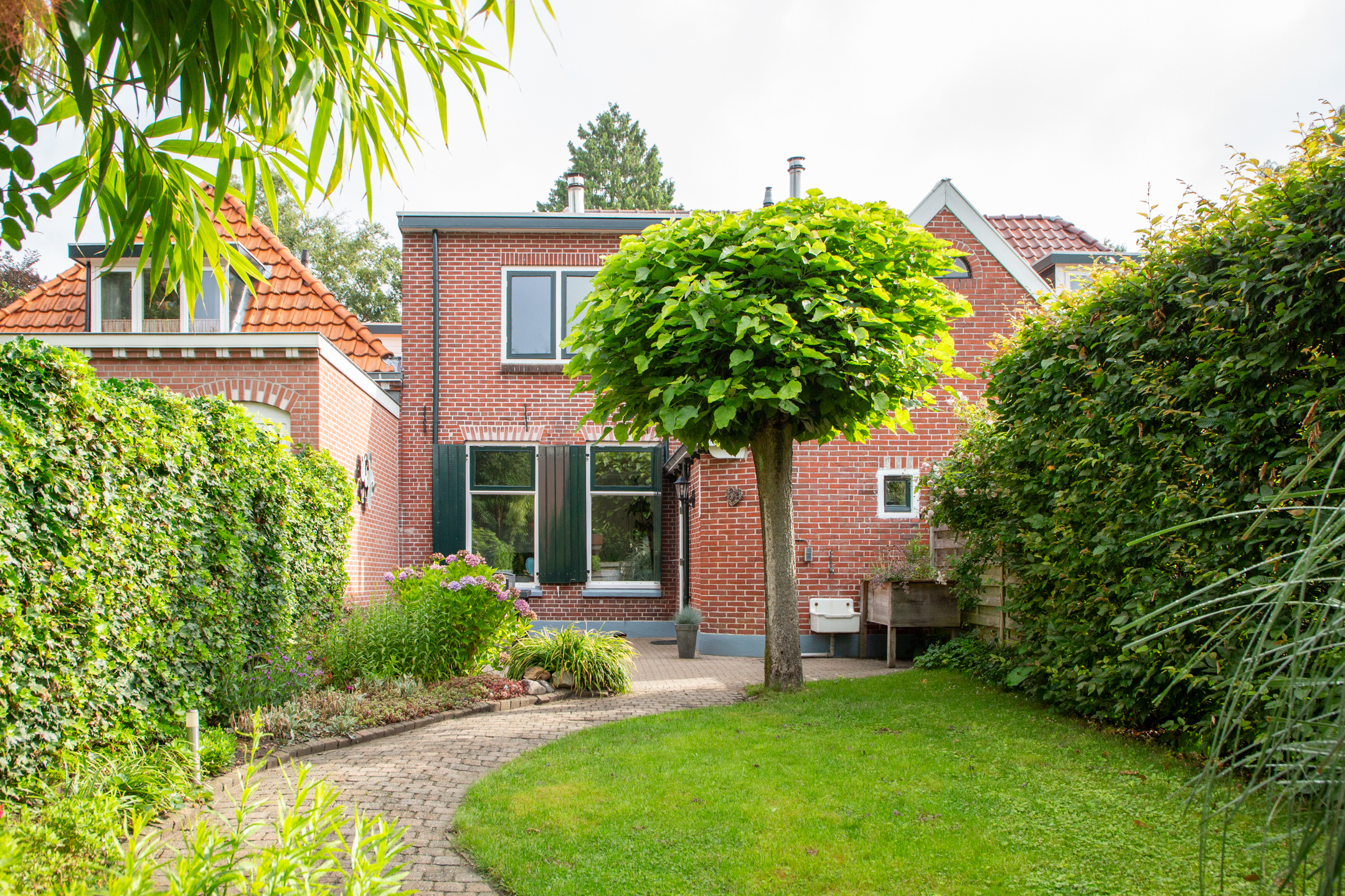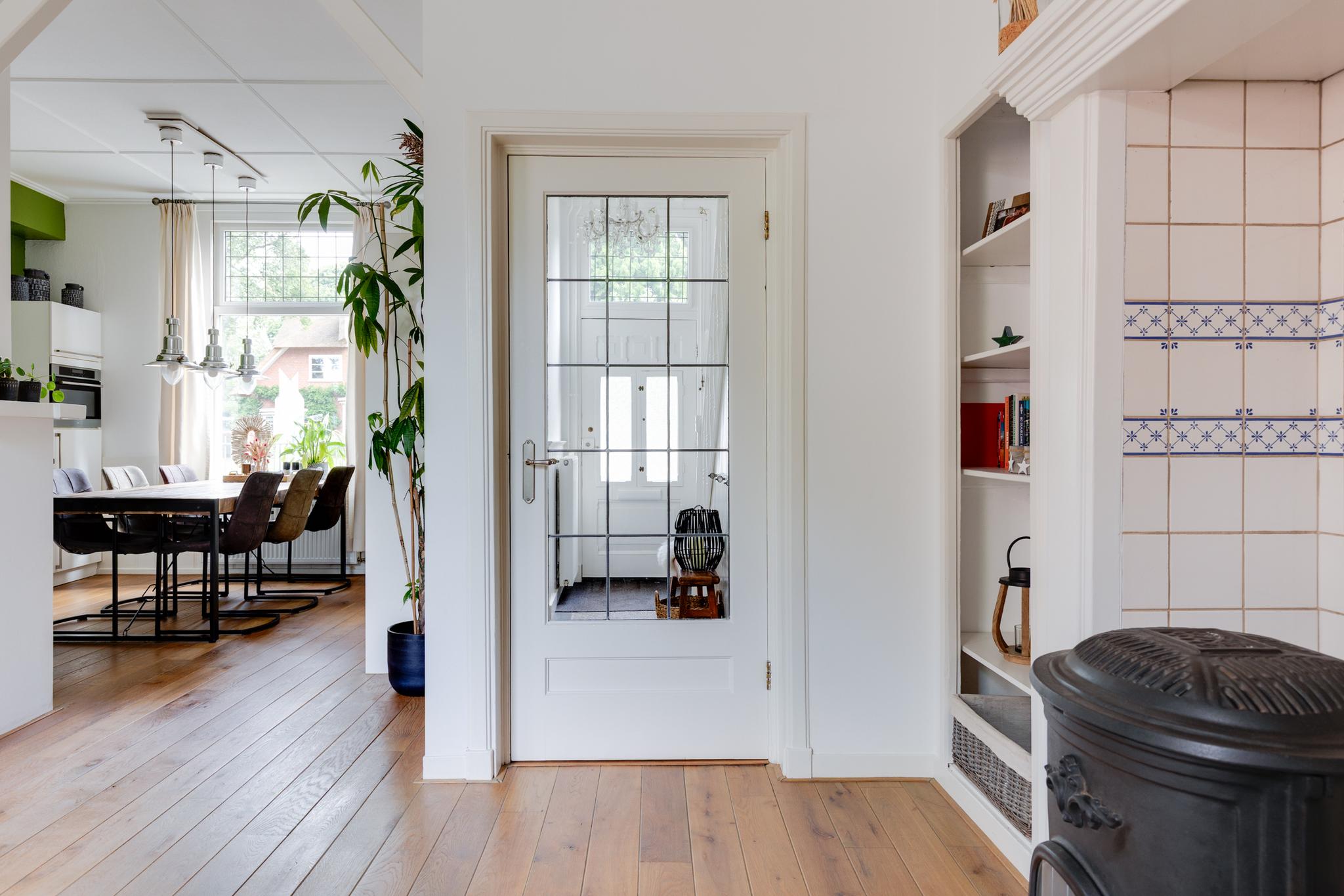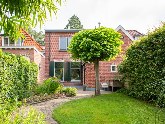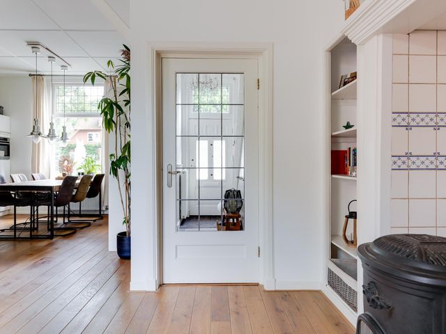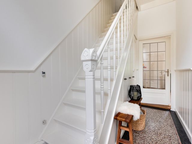 Begane grond: Sfeervolle entreehal met karakteristieke glas-in-loodramen en granito vloer, voorzien van meterkast, trapopgang naar de eerste verdieping en trapkast. Brede en charmante woonkamer met eikenhouten vloer en plafond met houten balken, voorzien van een (gas)kachel en inbouwkastruimte. De woonkamer loopt over in de open eetkeuken, voorzien van diverse inbouwapparatuur, waaronder een vaatwasser, oven en koelkast. Vanuit de woonkamer is er toegang tot een hal met kastruimte, toilet met fontein en een wasruimte met aansluiting voor wasmachine en droger. Via een vlizotrap is hier ook een handige bergzolder bereikbaar. De deur in deze hal geeft toegang tot de achtertuin. De diepe achtertuin, gelegen op het zonnige zuidwesten, is een heerlijke plek om te ontspannen. Hier vindt u een vrijstaande houten overkapping met gezellige zitplek en een vrijstaande stenen berging, ideaal voor het stallen van fietsen en tuingereedschap.