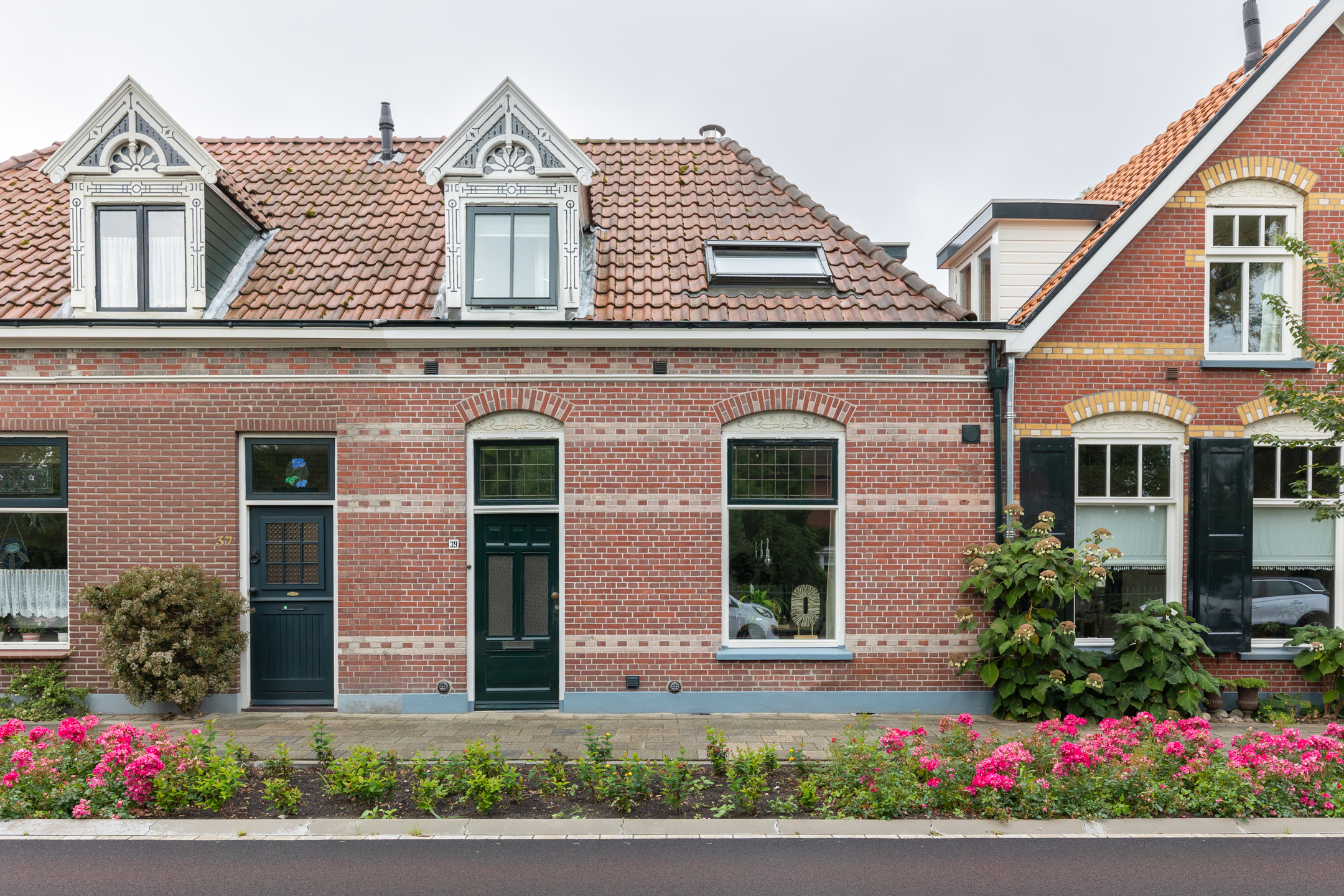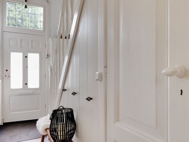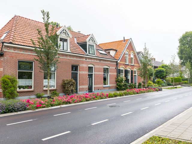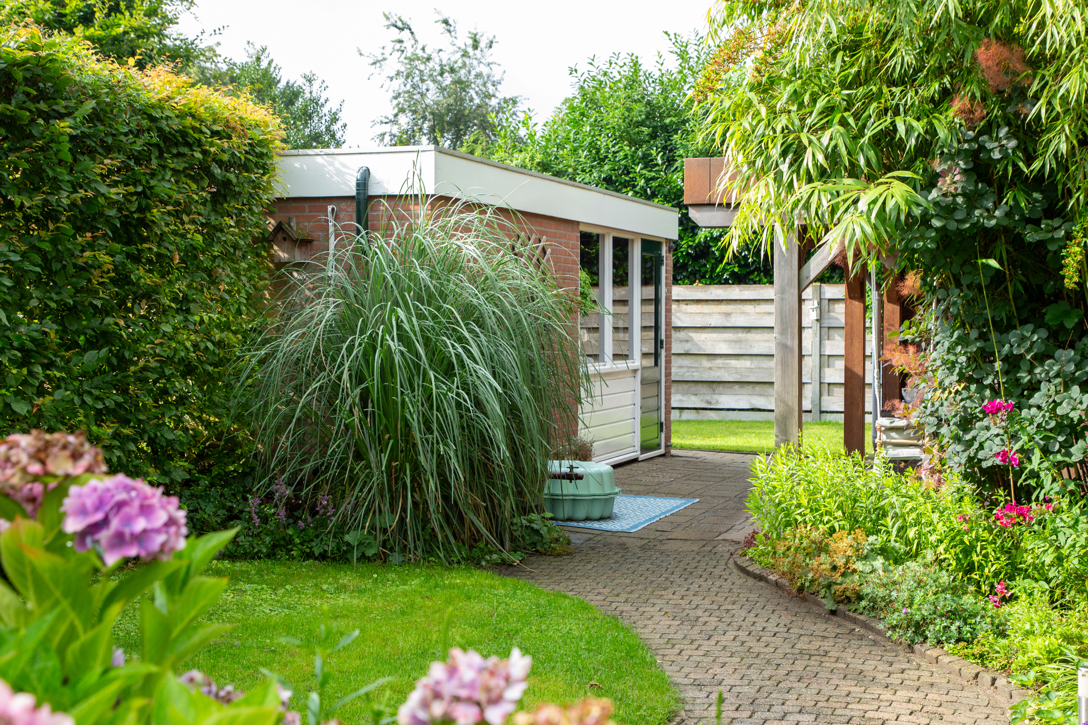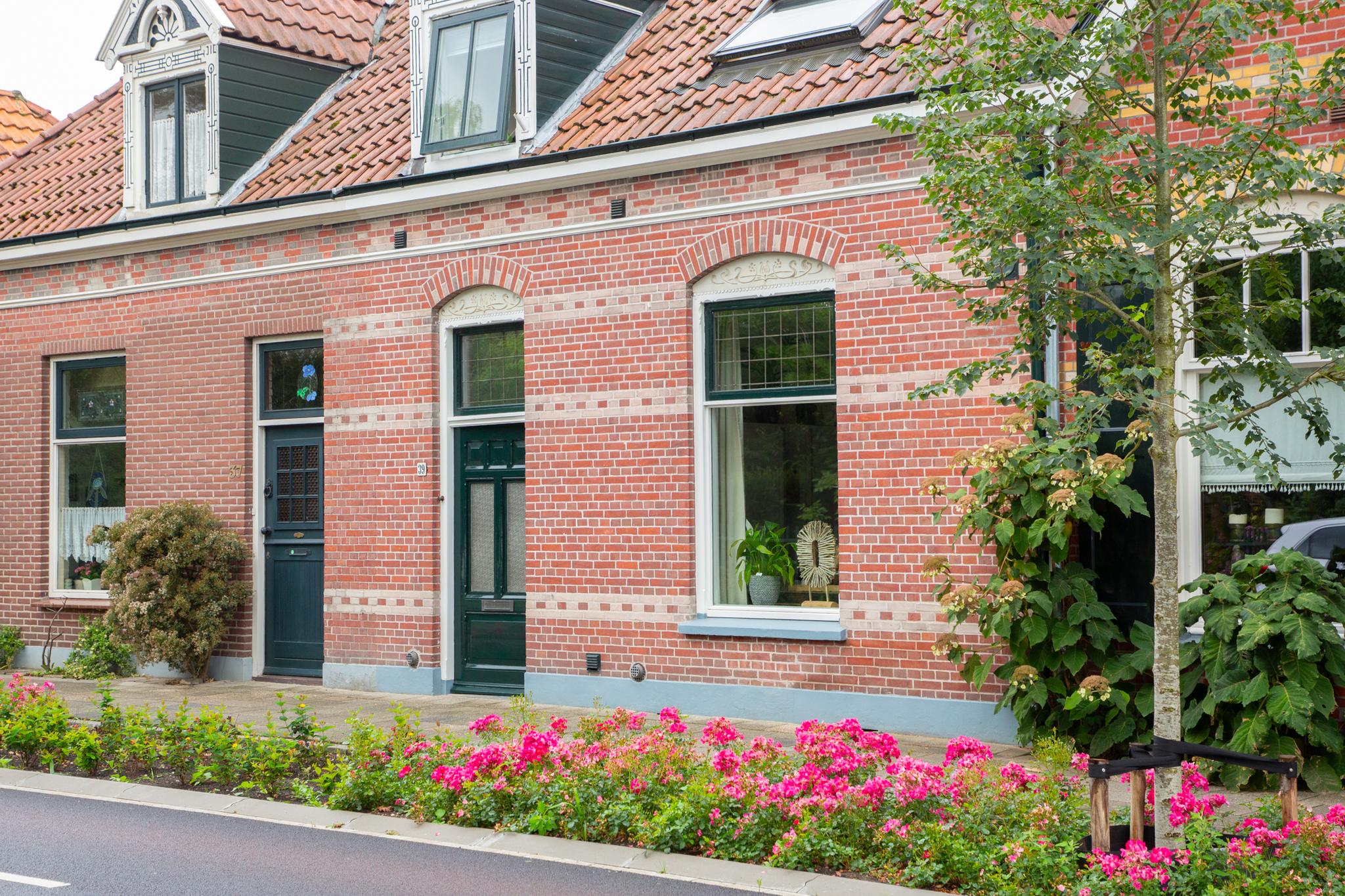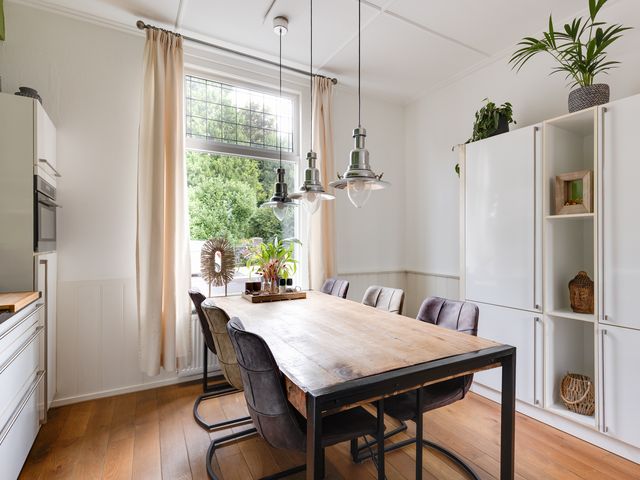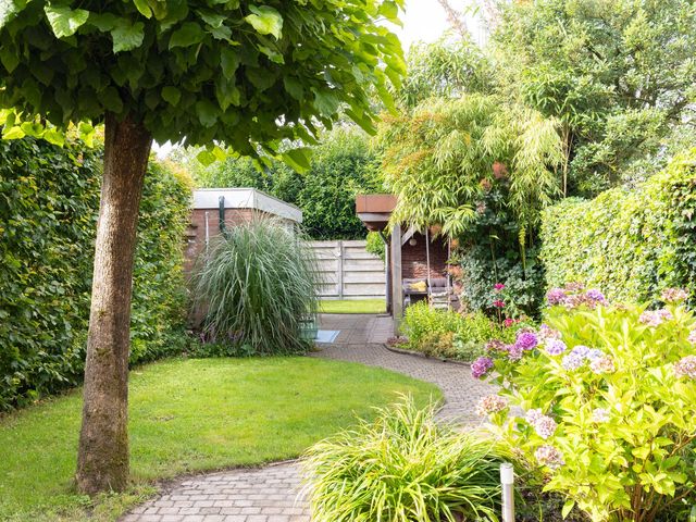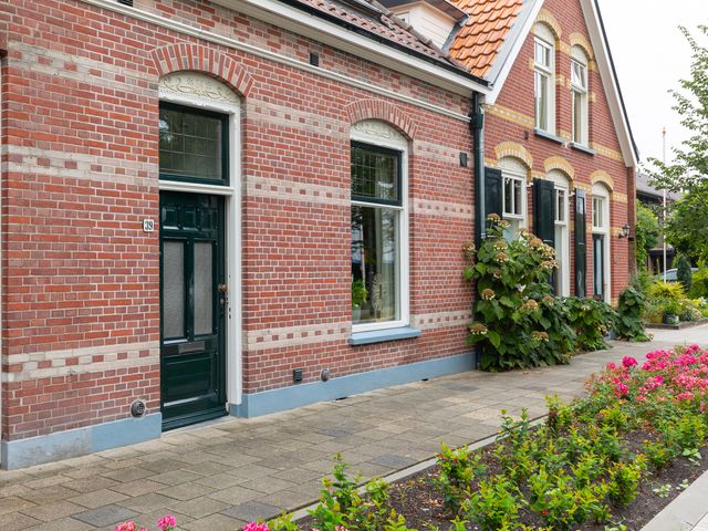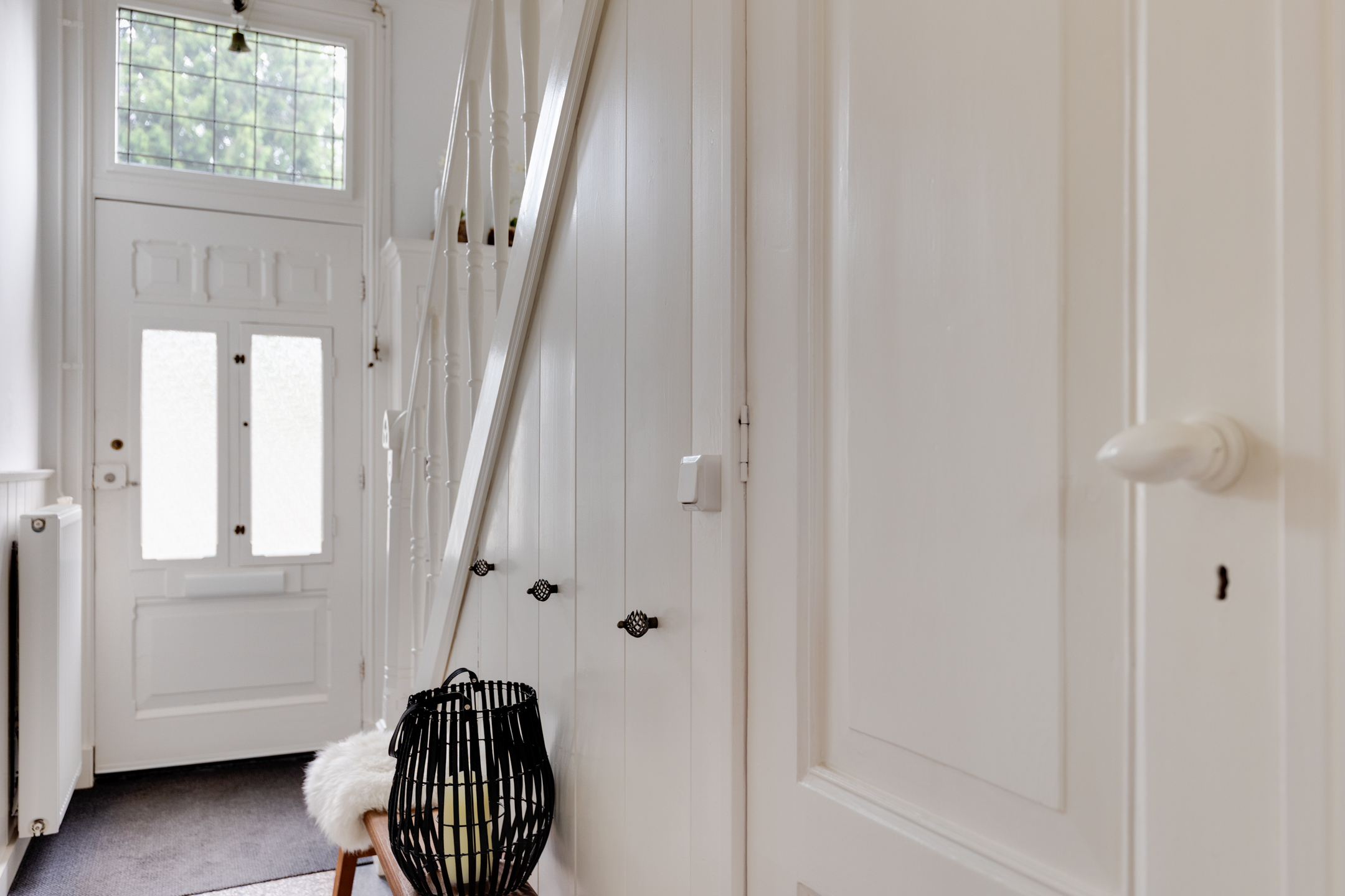 Begane grond: Sfeervolle entreehal met karakteristieke glas-in-loodramen en granito vloer, voorzien van meterkast, trapopgang naar de eerste verdieping en trapkast. Brede en charmante woonkamer met eikenhouten vloer en plafond met houten balken, voorzien van een (gas)kachel en inbouwkastruimte. De woonkamer loopt over in de open eetkeuken, voorzien van diverse inbouwapparatuur, waaronder een vaatwasser, oven en koelkast. Vanuit de woonkamer is er toegang tot een hal met kastruimte, toilet met fontein en een wasruimte met aansluiting voor wasmachine en droger. Via een vlizotrap is hier ook een handige bergzolder bereikbaar. De deur in deze hal geeft toegang tot de achtertuin. De diepe achtertuin, gelegen op het zonnige zuidwesten, is een heerlijke plek om te ontspannen. Hier vindt u een vrijstaande houten overkapping met gezellige zitplek en een vrijstaande stenen berging, ideaal voor het stallen van fietsen en tuingereedschap.