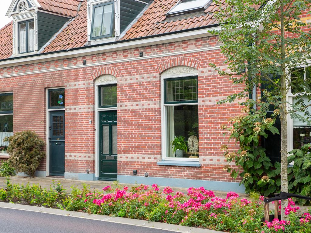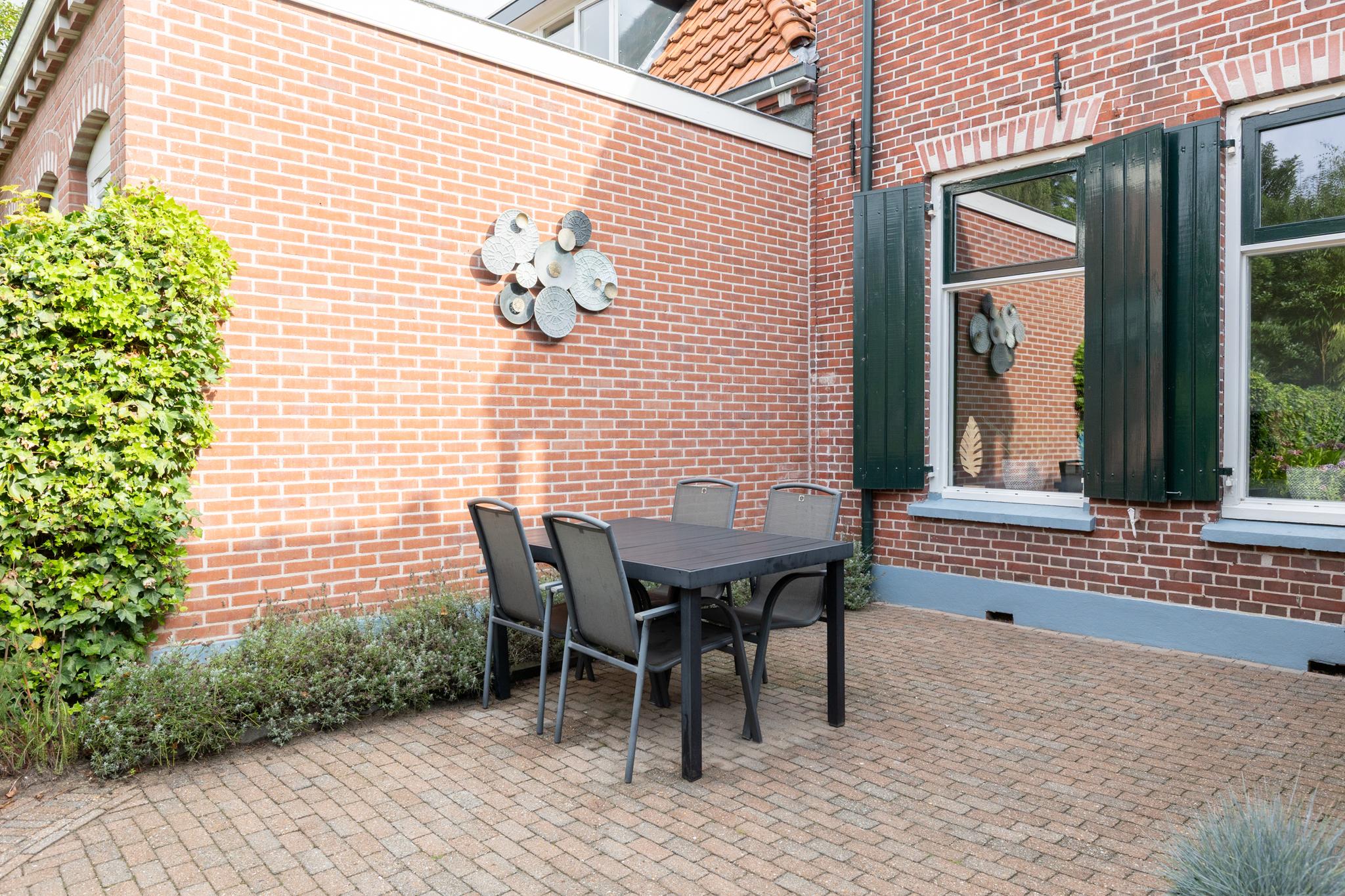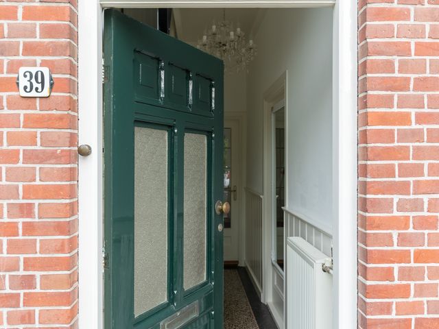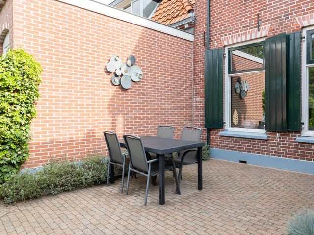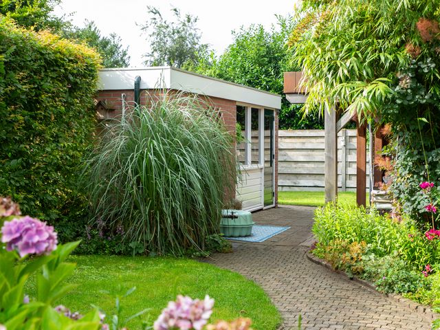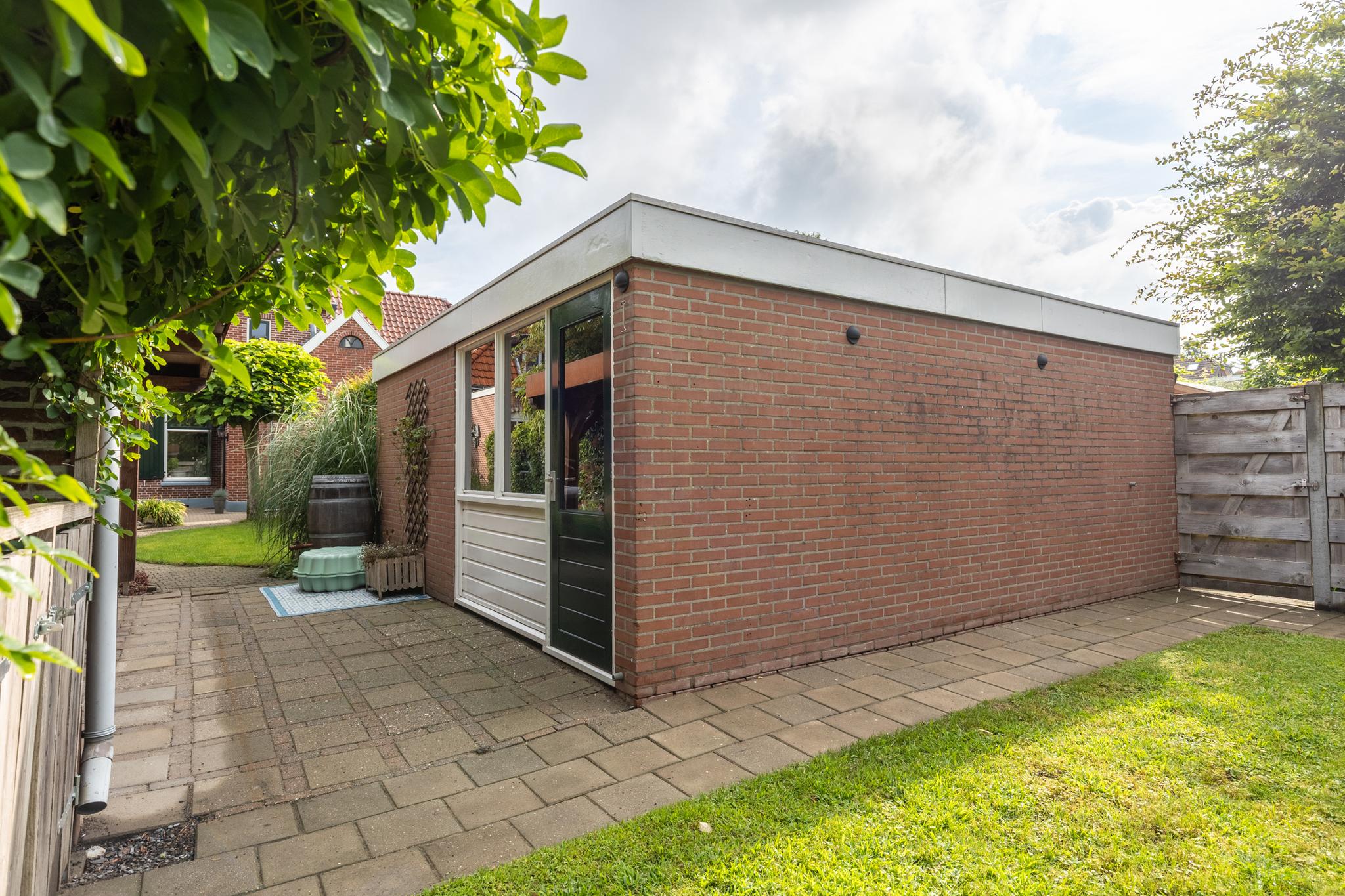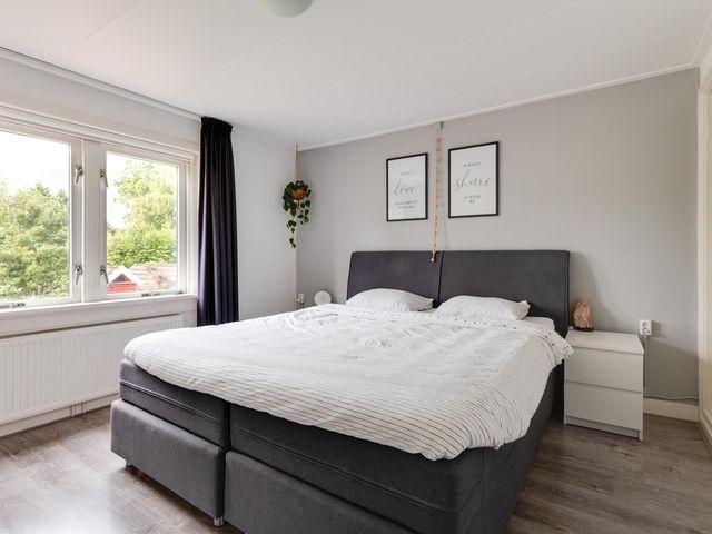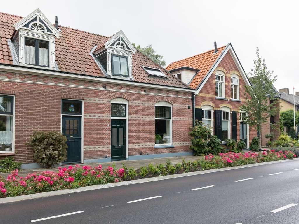 Begane grond: Sfeervolle entreehal met karakteristieke glas-in-loodramen en granito vloer, voorzien van meterkast, trapopgang naar de eerste verdieping en trapkast. Brede en charmante woonkamer met eikenhouten vloer en plafond met houten balken, voorzien van een (gas)kachel en inbouwkastruimte. De woonkamer loopt over in de open eetkeuken, voorzien van diverse inbouwapparatuur, waaronder een vaatwasser, oven en koelkast. Vanuit de woonkamer is er toegang tot een hal met kastruimte, toilet met fontein en een wasruimte met aansluiting voor wasmachine en droger. Via een vlizotrap is hier ook een handige bergzolder bereikbaar. De deur in deze hal geeft toegang tot de achtertuin. De diepe achtertuin, gelegen op het zonnige zuidwesten, is een heerlijke plek om te ontspannen. Hier vindt u een vrijstaande houten overkapping met gezellige zitplek en een vrijstaande stenen berging, ideaal voor het stallen van fietsen en tuingereedschap.