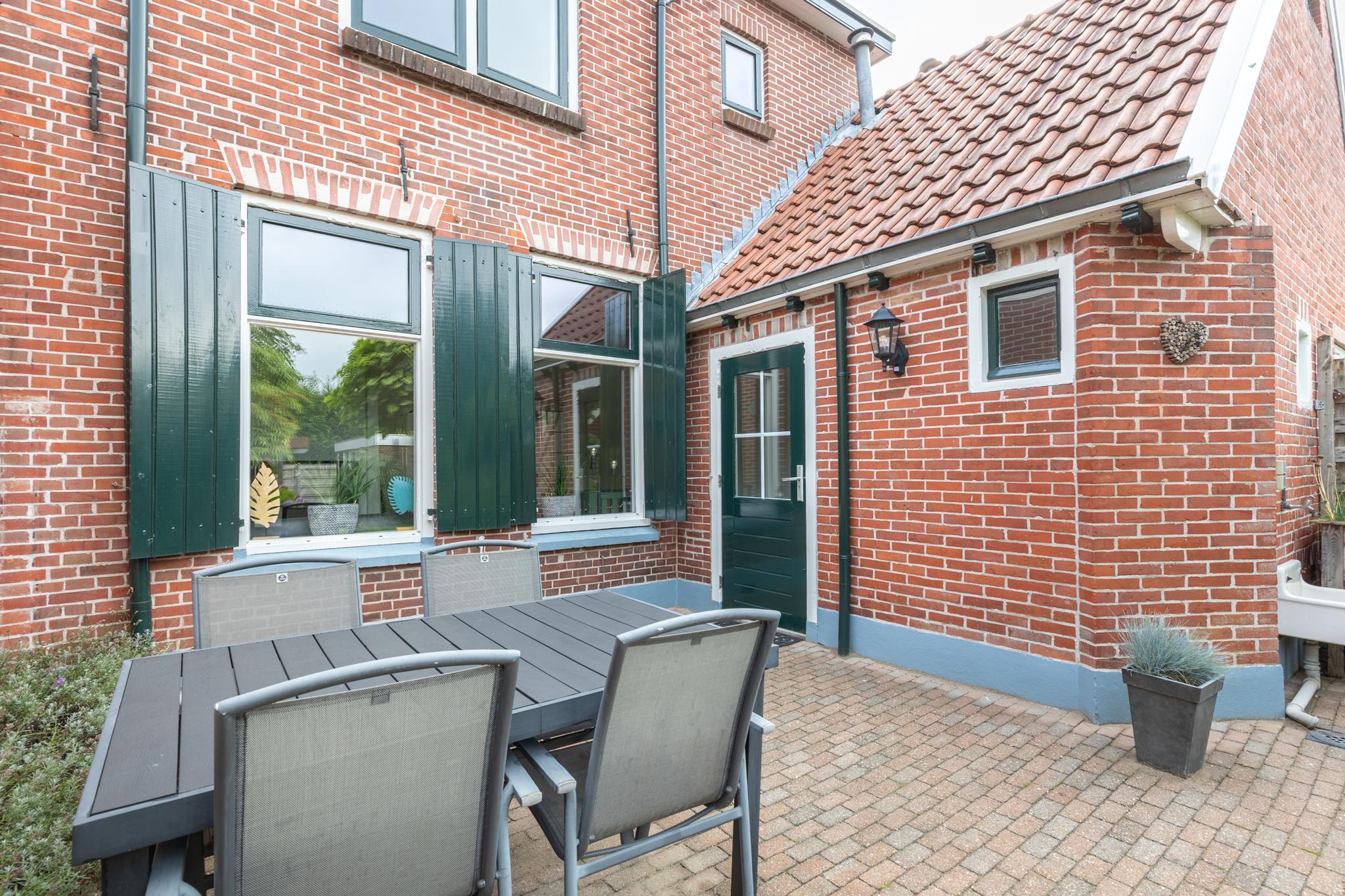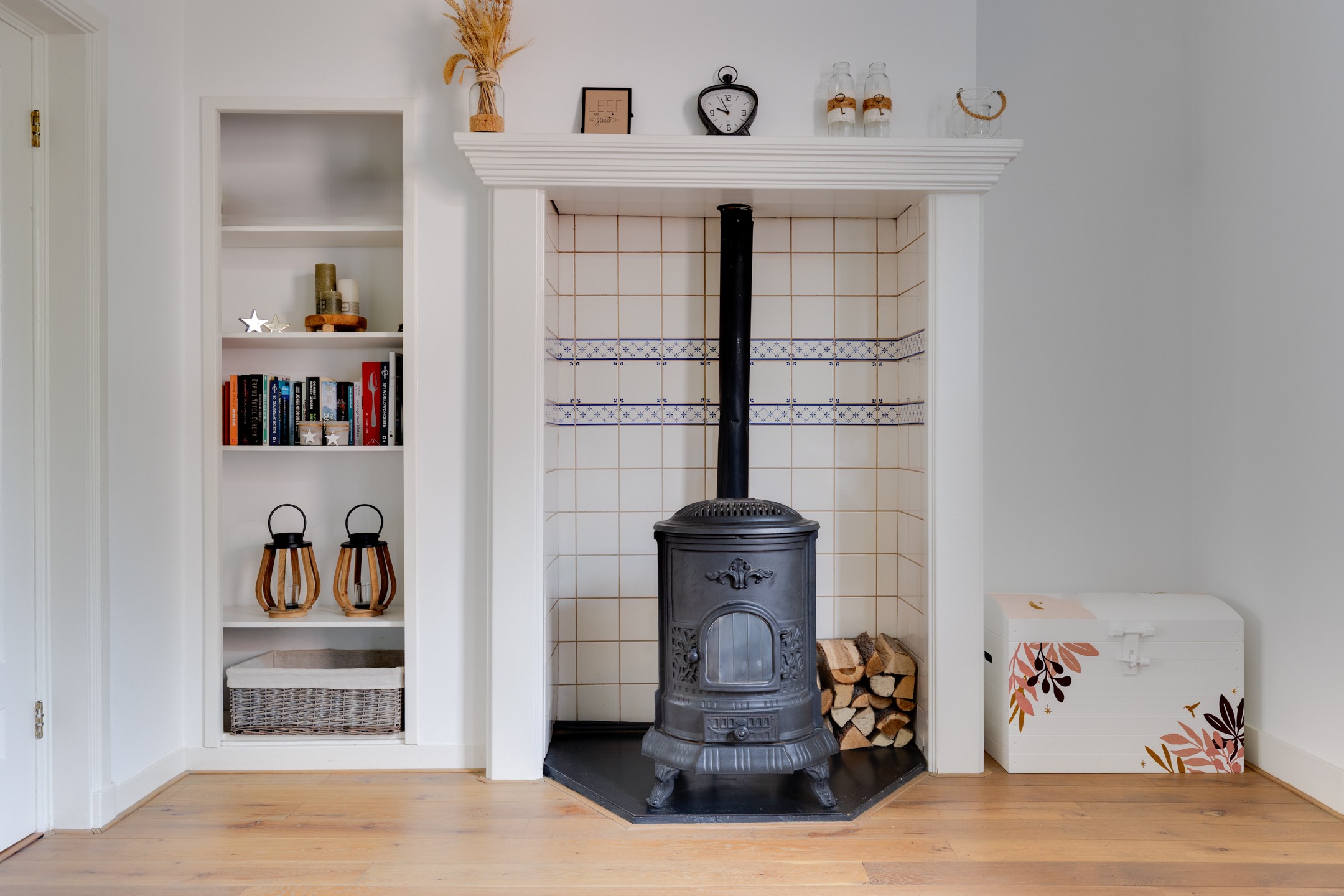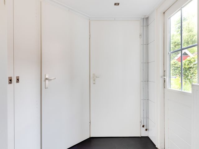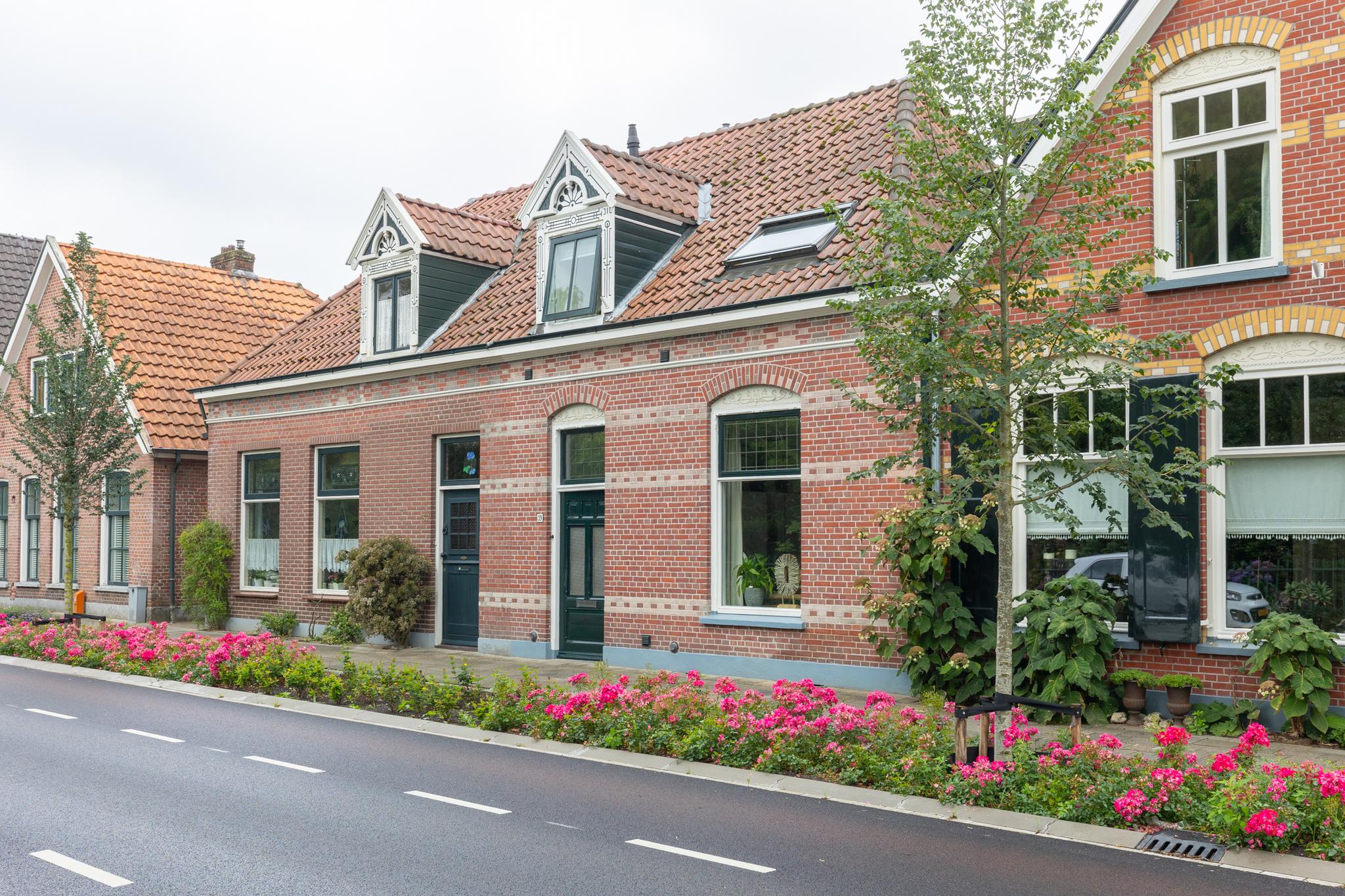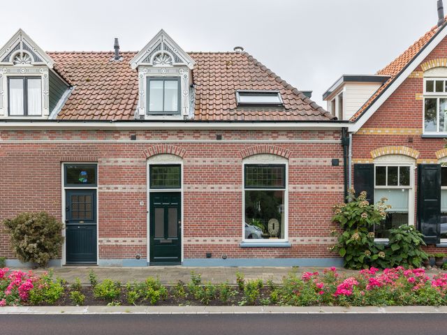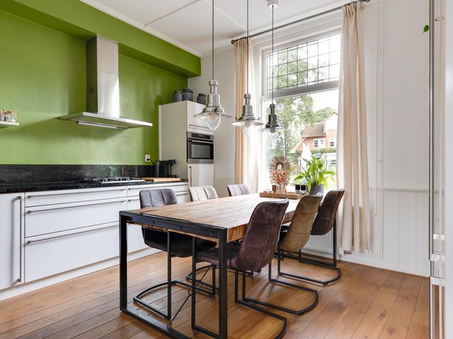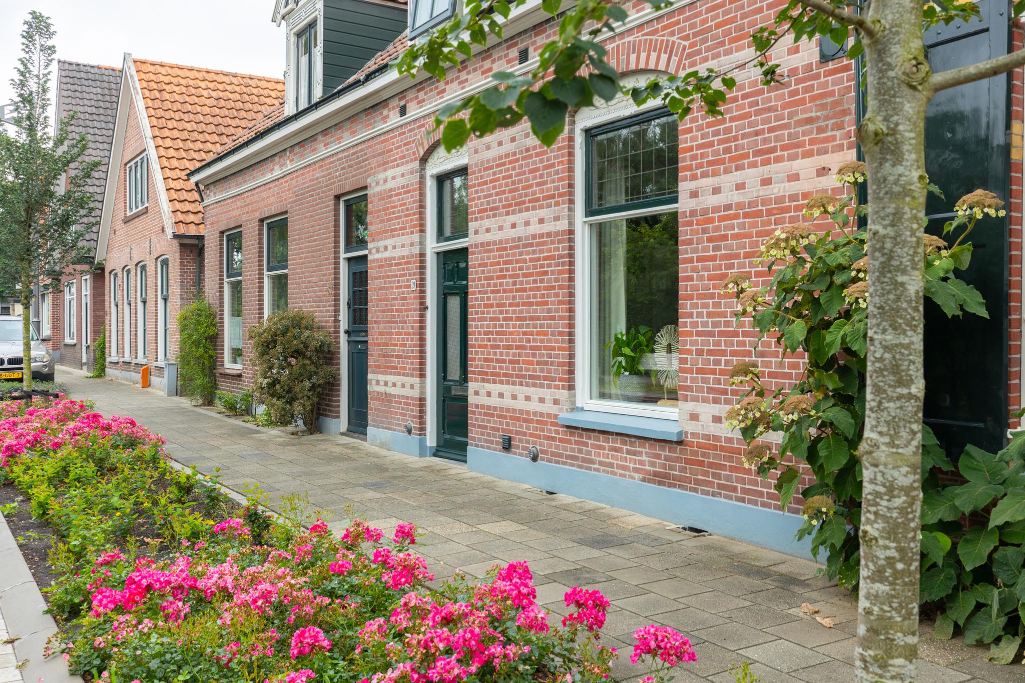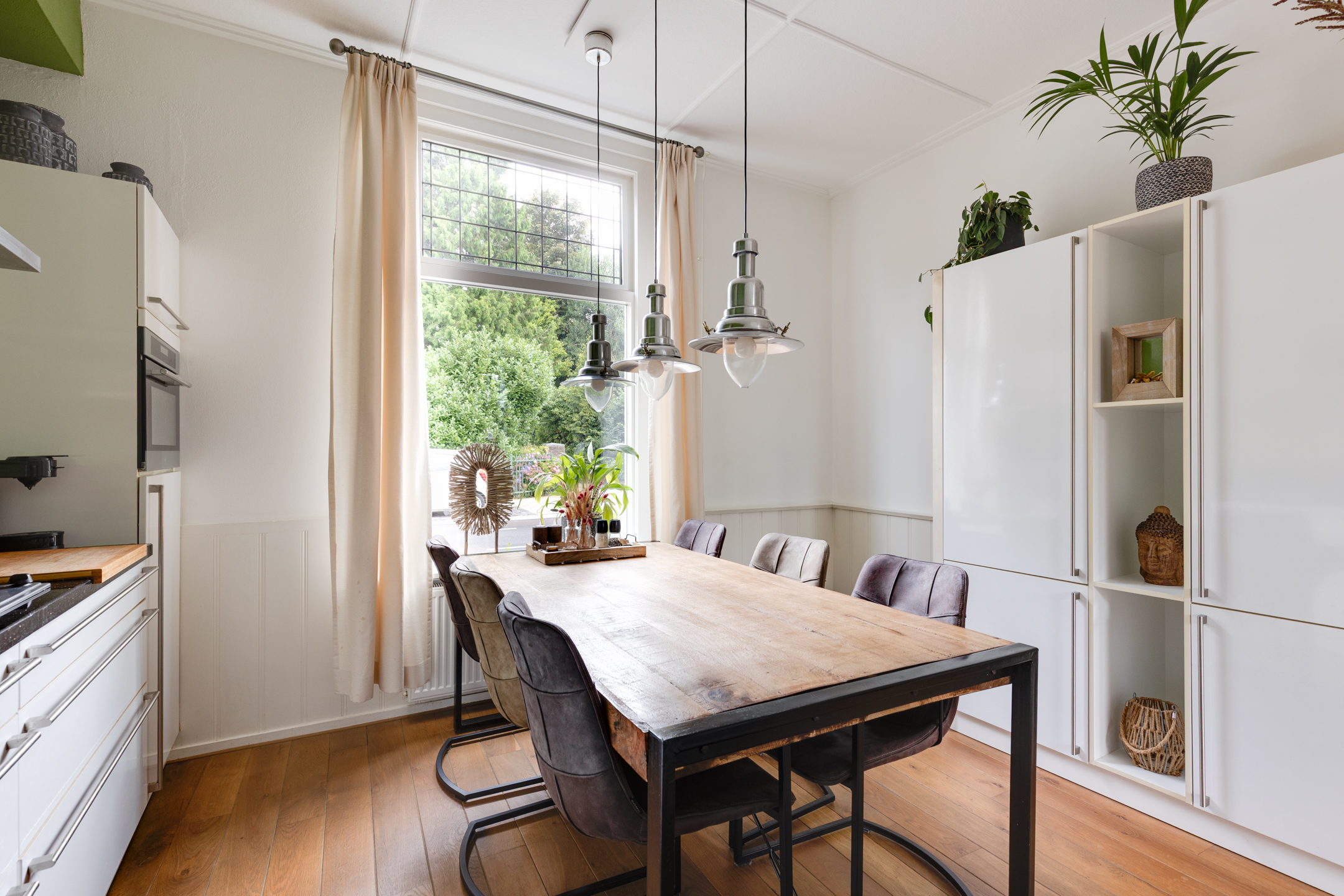 Begane grond: Sfeervolle entreehal met karakteristieke glas-in-loodramen en granito vloer, voorzien van meterkast, trapopgang naar de eerste verdieping en trapkast. Brede en charmante woonkamer met eikenhouten vloer en plafond met houten balken, voorzien van een (gas)kachel en inbouwkastruimte. De woonkamer loopt over in de open eetkeuken, voorzien van diverse inbouwapparatuur, waaronder een vaatwasser, oven en koelkast. Vanuit de woonkamer is er toegang tot een hal met kastruimte, toilet met fontein en een wasruimte met aansluiting voor wasmachine en droger. Via een vlizotrap is hier ook een handige bergzolder bereikbaar. De deur in deze hal geeft toegang tot de achtertuin. De diepe achtertuin, gelegen op het zonnige zuidwesten, is een heerlijke plek om te ontspannen. Hier vindt u een vrijstaande houten overkapping met gezellige zitplek en een vrijstaande stenen berging, ideaal voor het stallen van fietsen en tuingereedschap.
