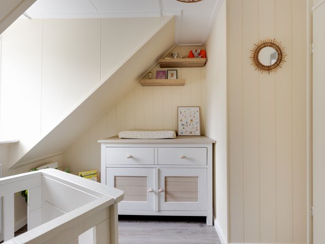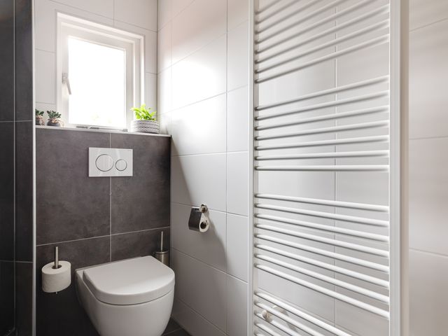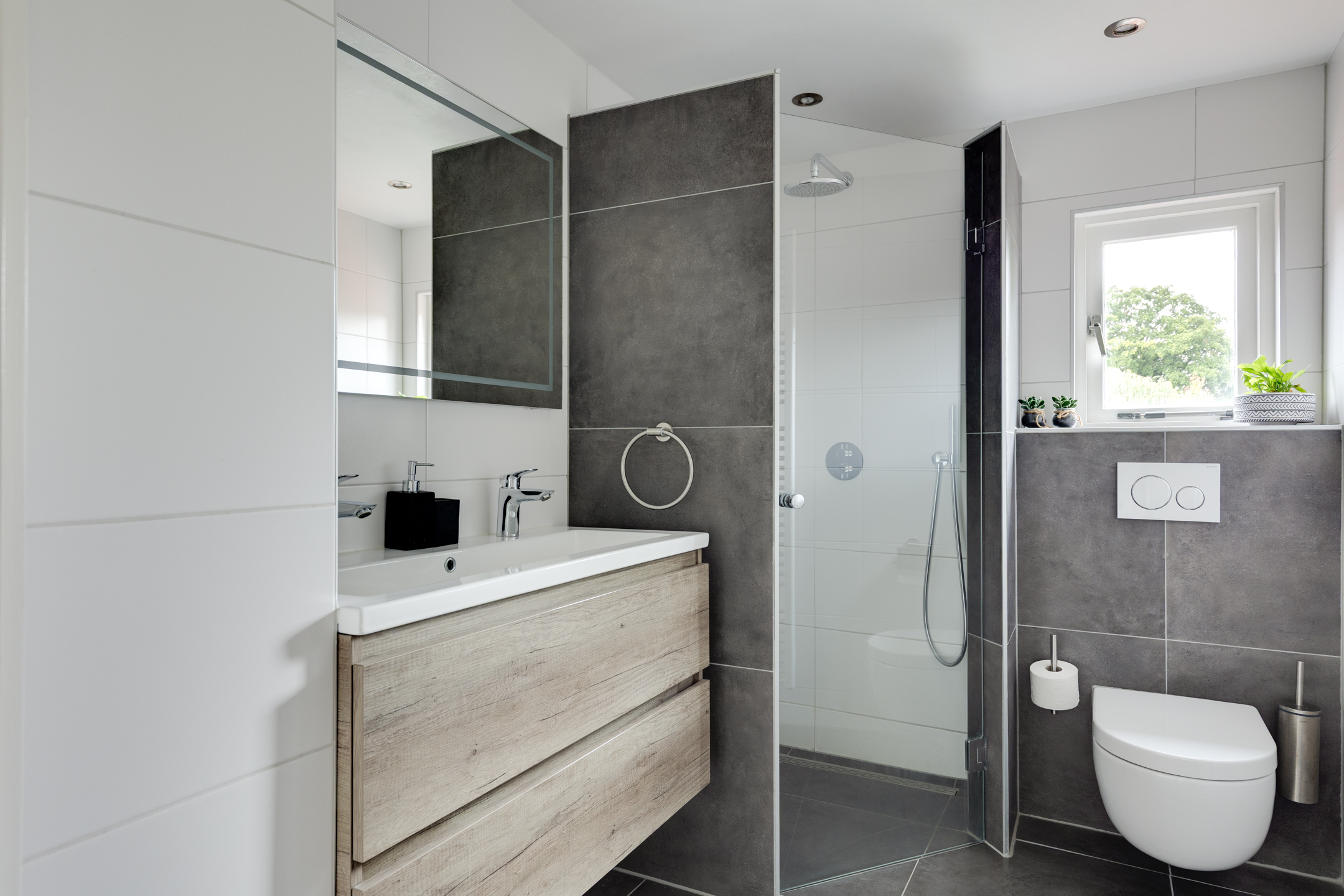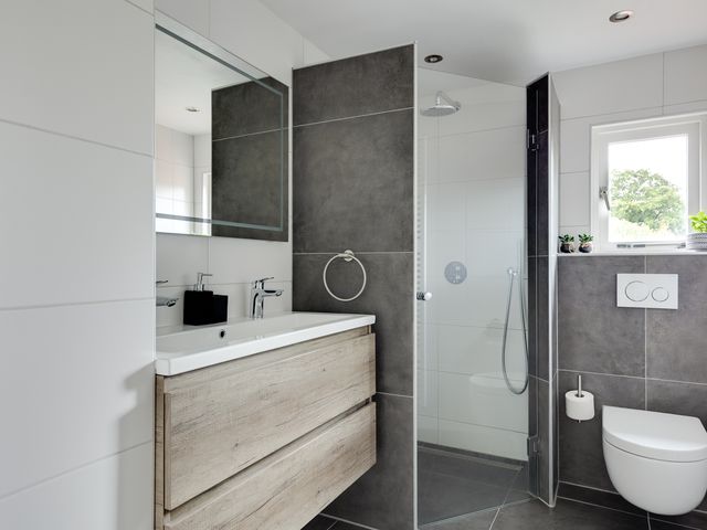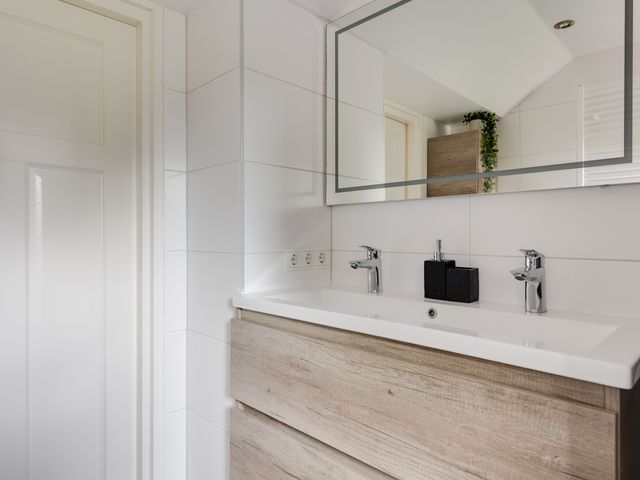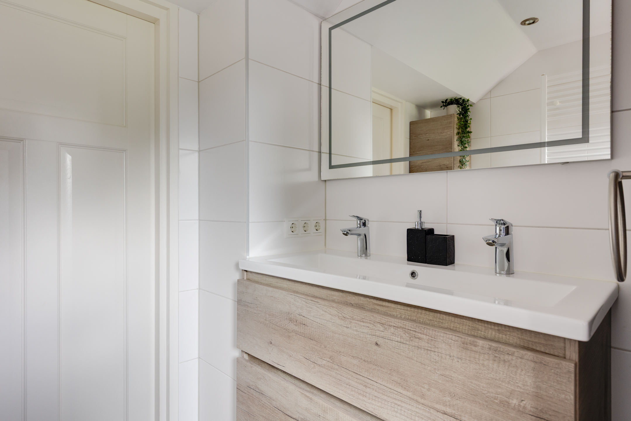 Eerste verdieping: Overloop met toegang tot drie modern afgewerkte slaapkamers, waarvan twee voorzien zijn van praktische inbouwkasten. De eigentijdse badkamer is voorzien van vloerverwarming, een douche, tweede toilet en een dubbele wastafelmeubel