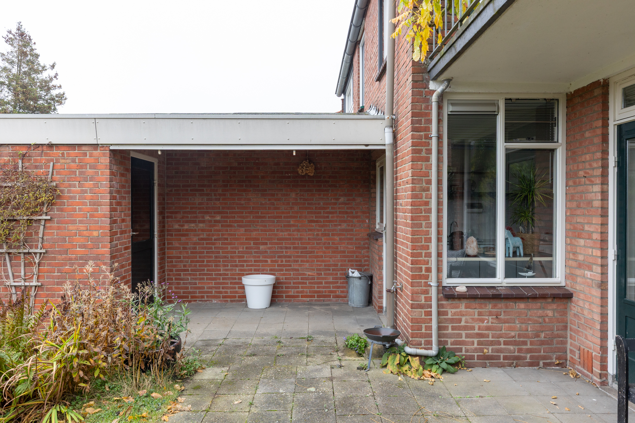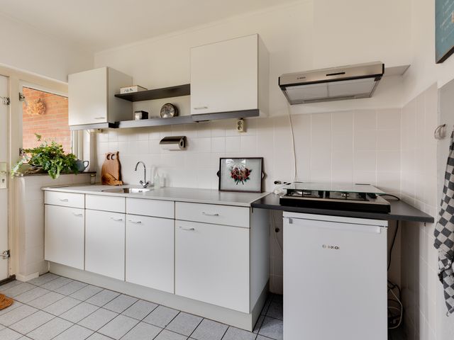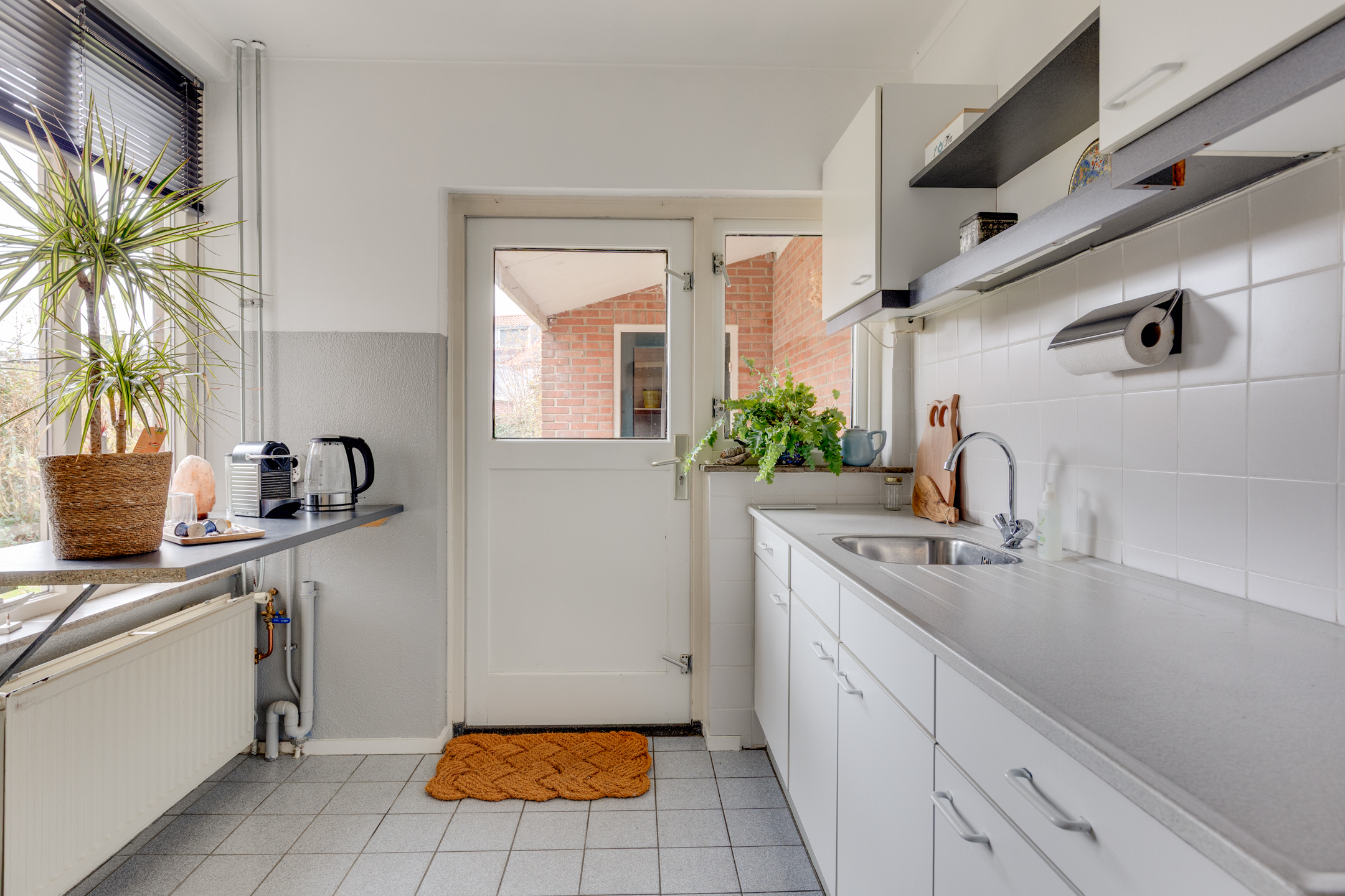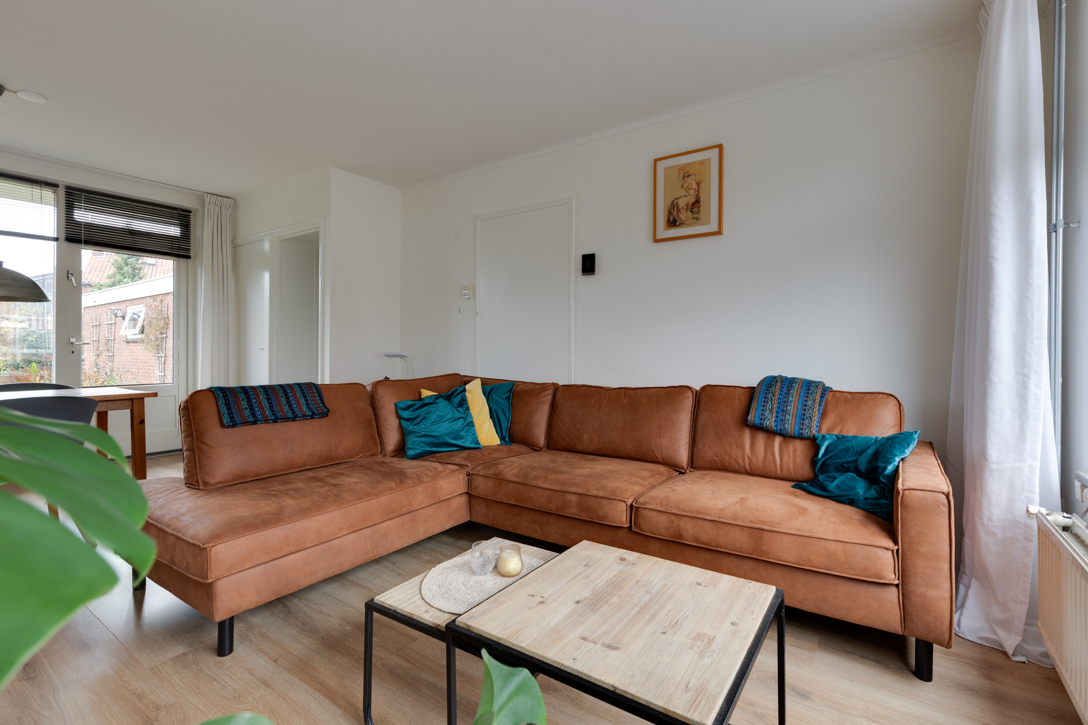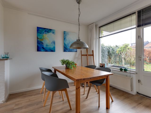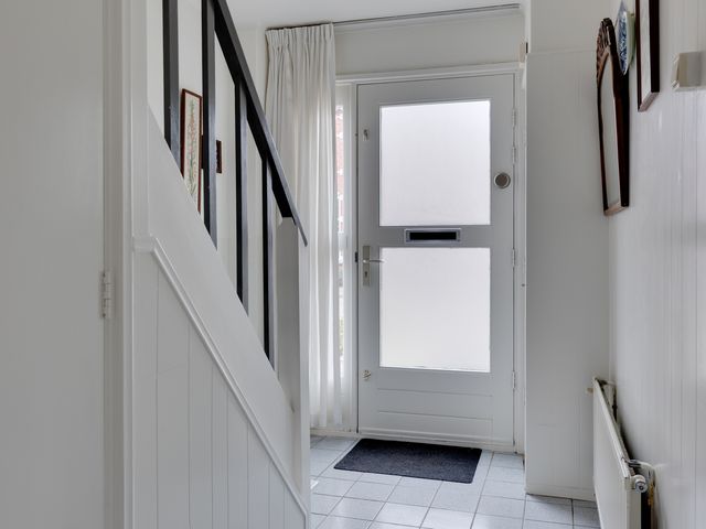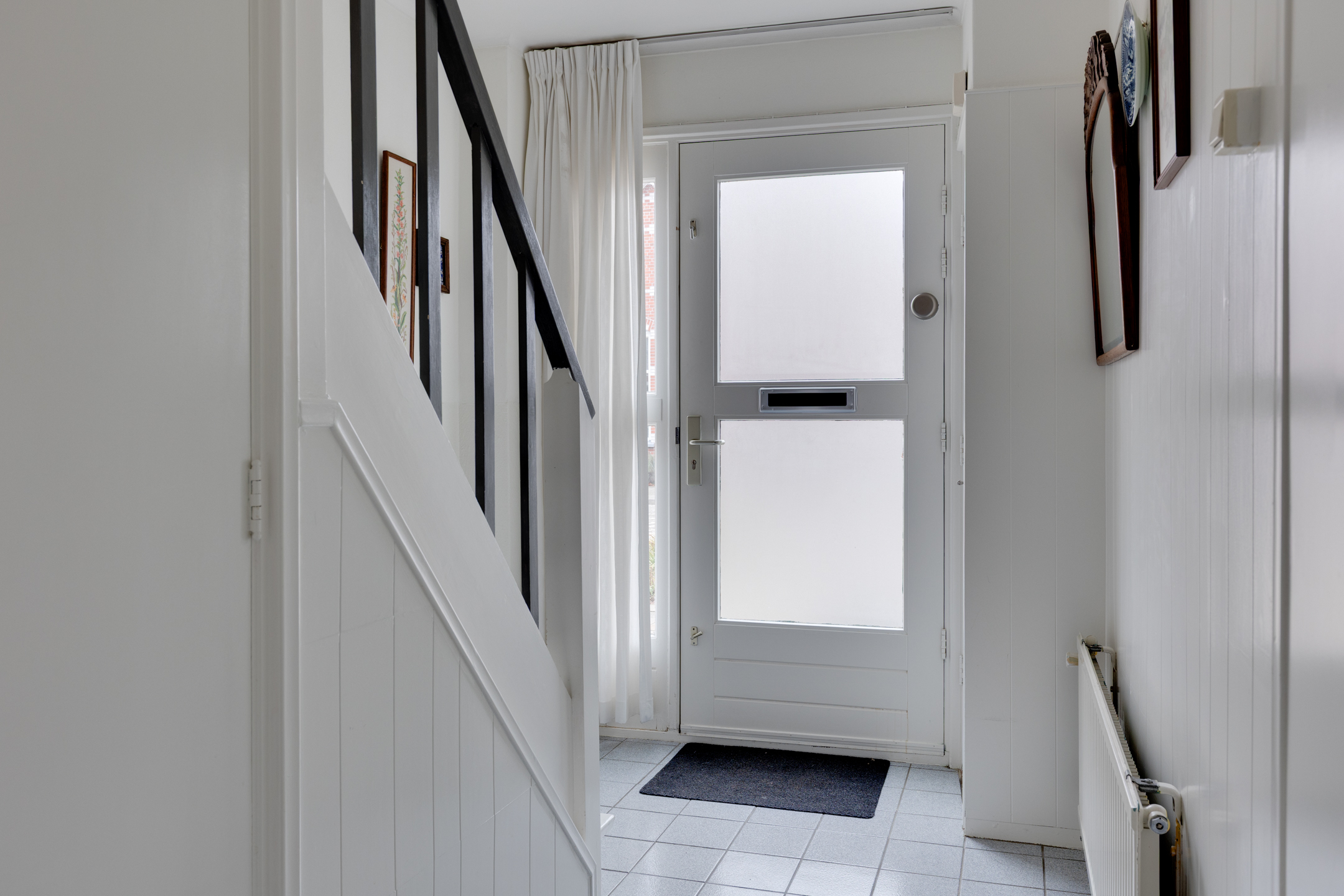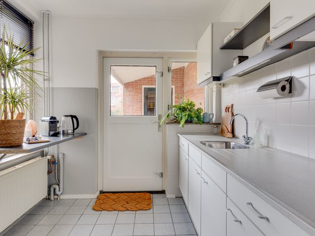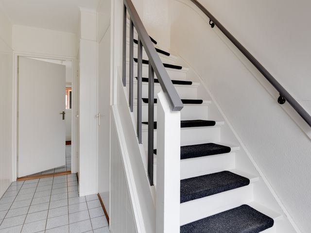 Begane grond: Entreehal met meterkast, vaste trap naar boven, kastruimte en een toiletruimte. Vanuit de hal is er toegang tot de lichte keuken. De keuken biedt doorgang naar de doorzonwoonkamer, voorzien van een inbouwkast, een deur naar de achtertuin én een extra zijraam dankzij de hoekligging. Via de keuken is er tevens toegang tot de achtertuin onder een overkapping, die doorloopt naar de stenen berging.