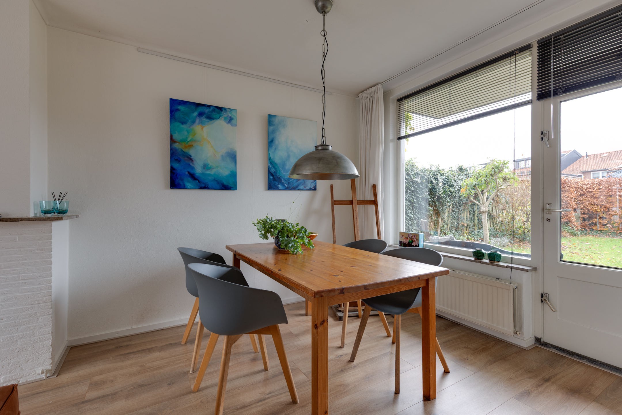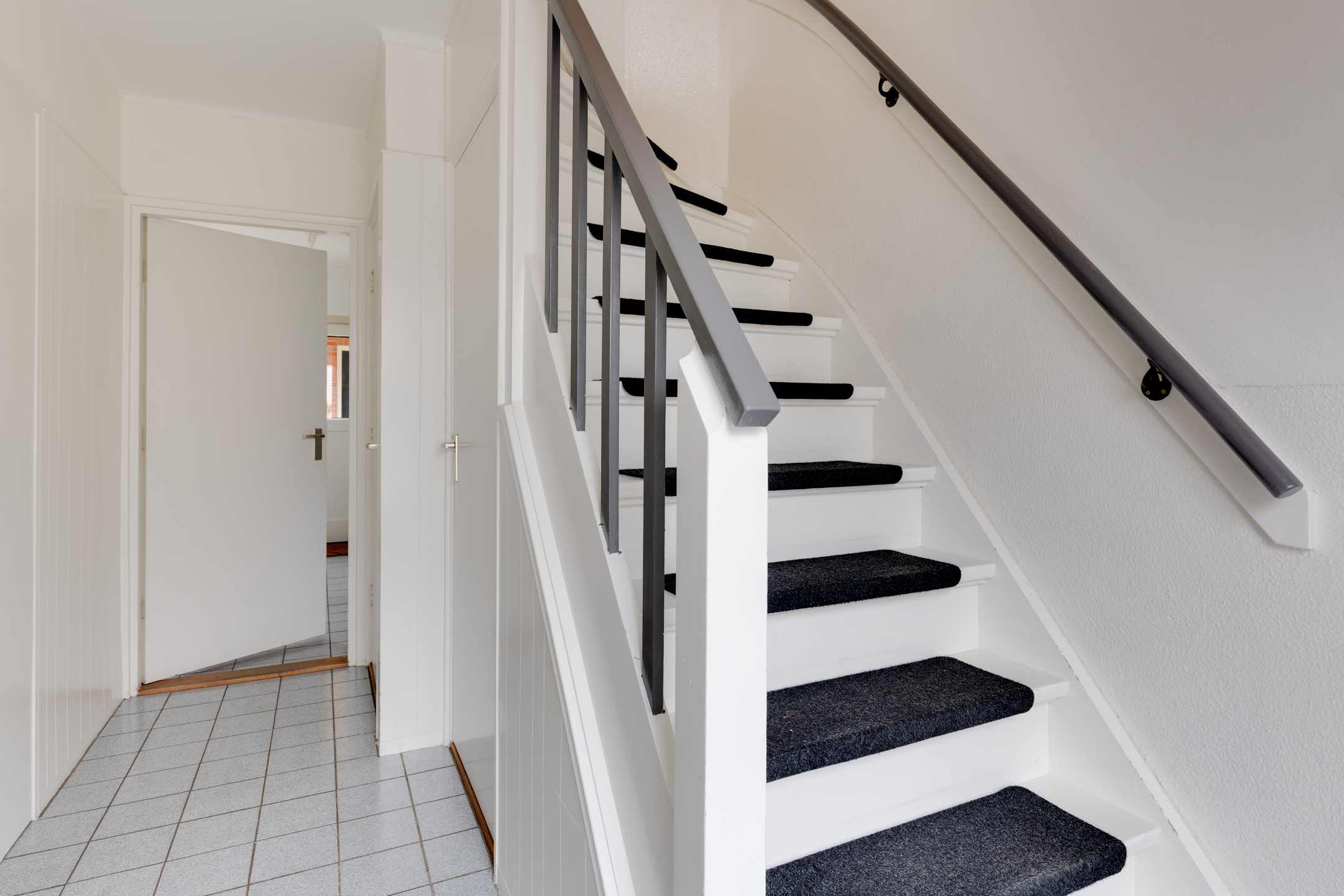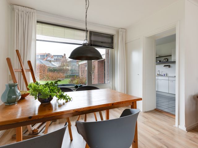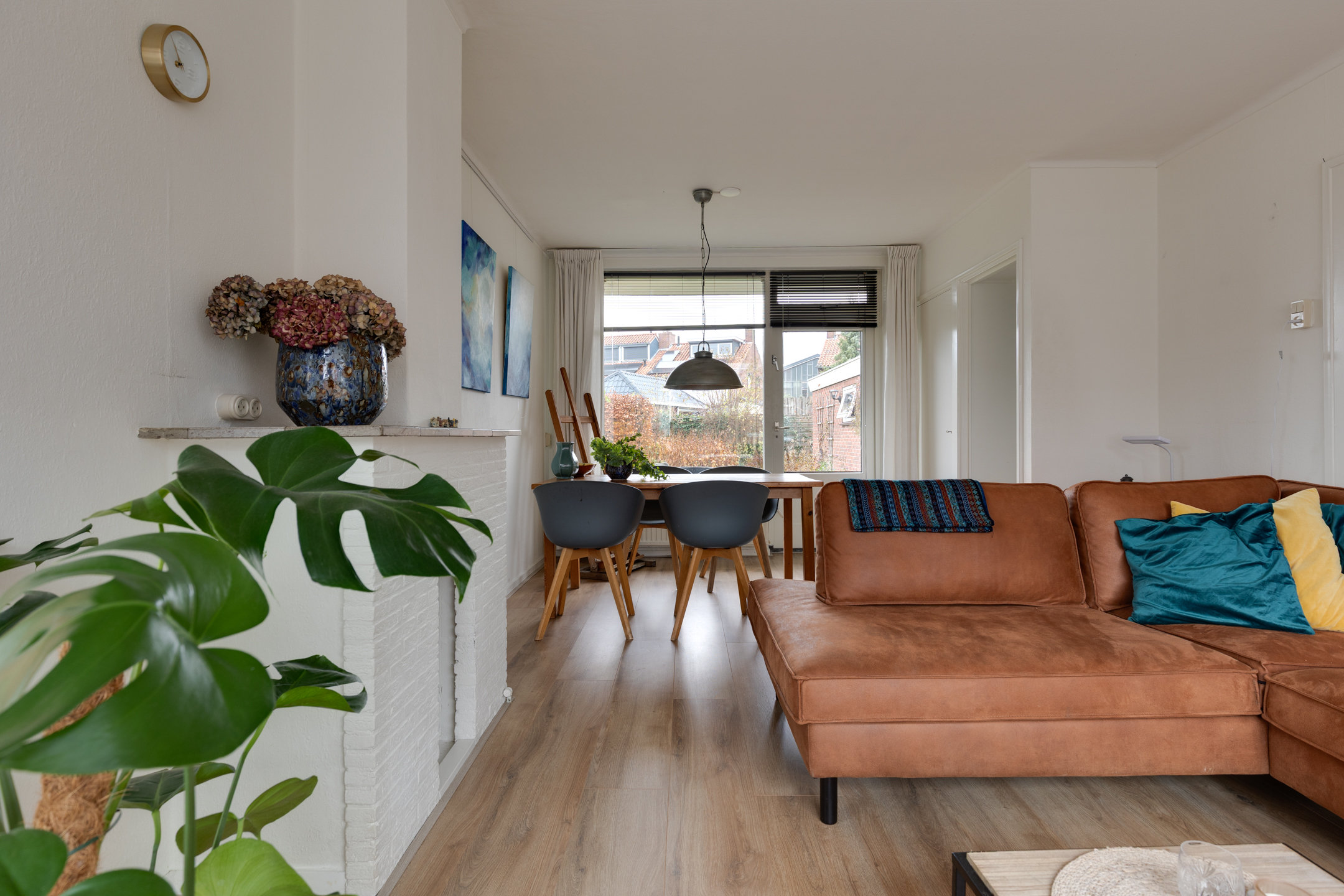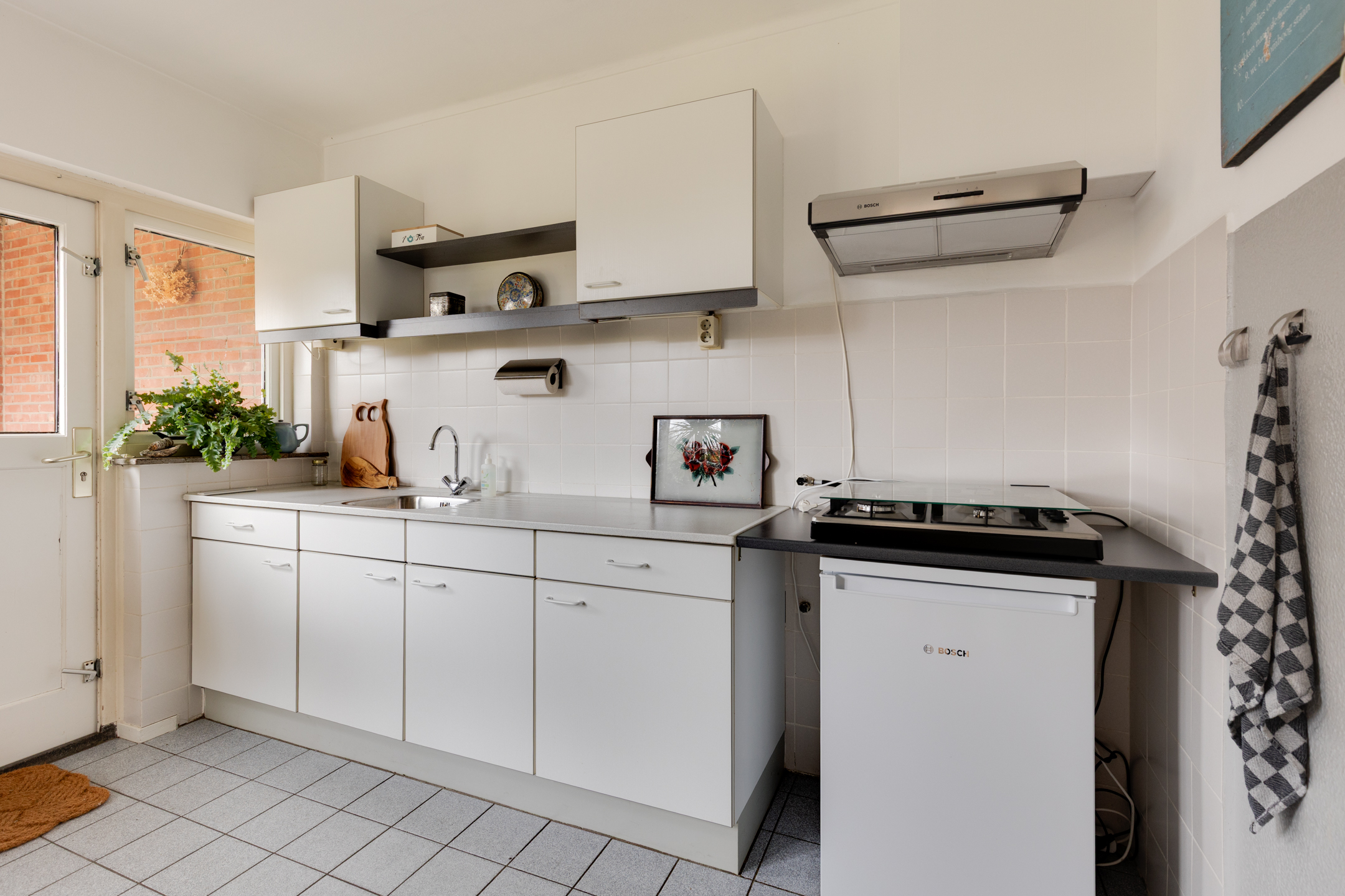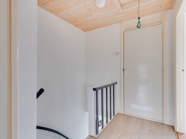 Begane grond: Entreehal met meterkast, vaste trap naar boven, kastruimte en een toiletruimte. Vanuit de hal is er toegang tot de lichte keuken. De keuken biedt doorgang naar de doorzonwoonkamer, voorzien van een inbouwkast, een deur naar de achtertuin én een extra zijraam dankzij de hoekligging. Via de keuken is er tevens toegang tot de achtertuin onder een overkapping, die doorloopt naar de stenen berging.
