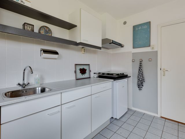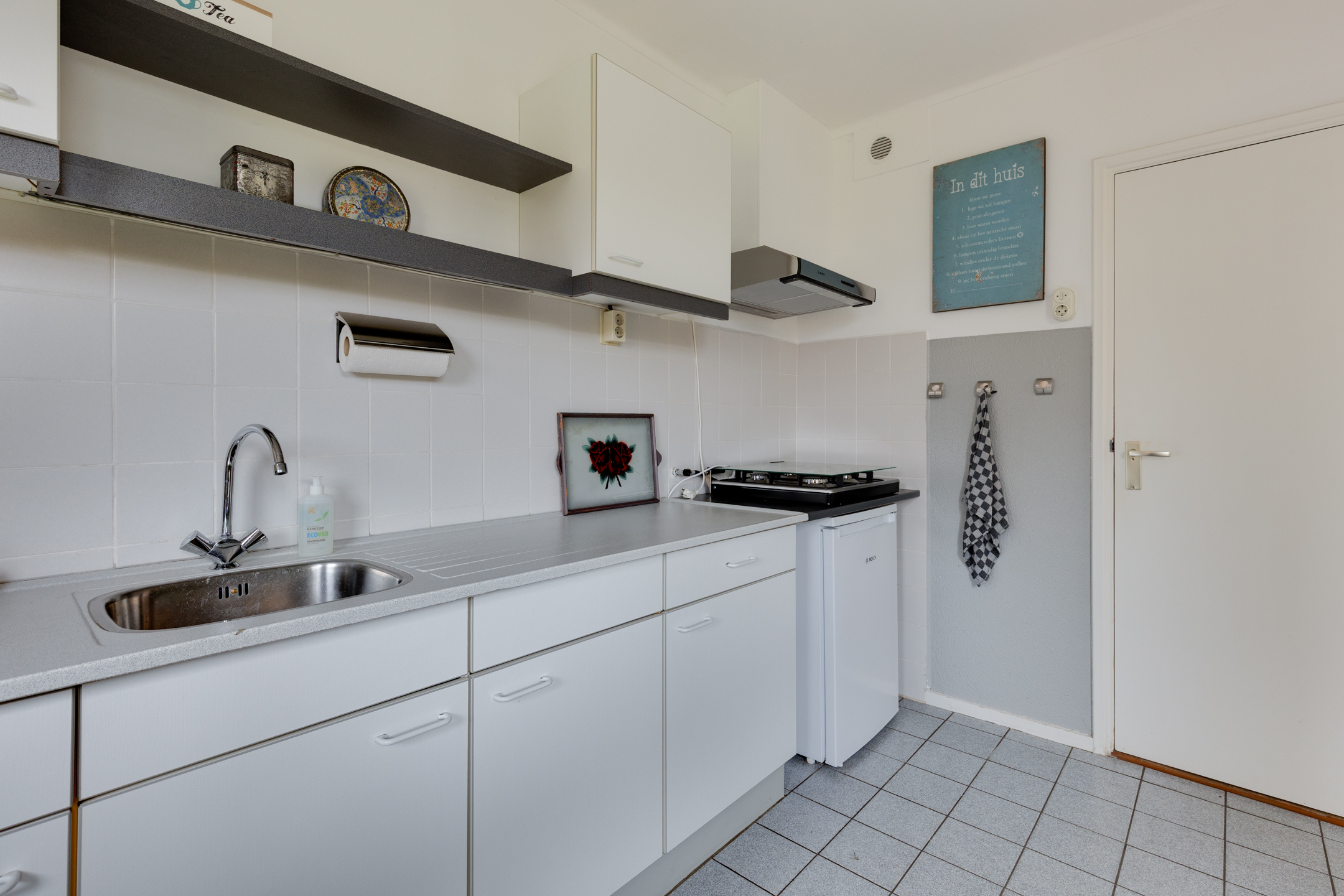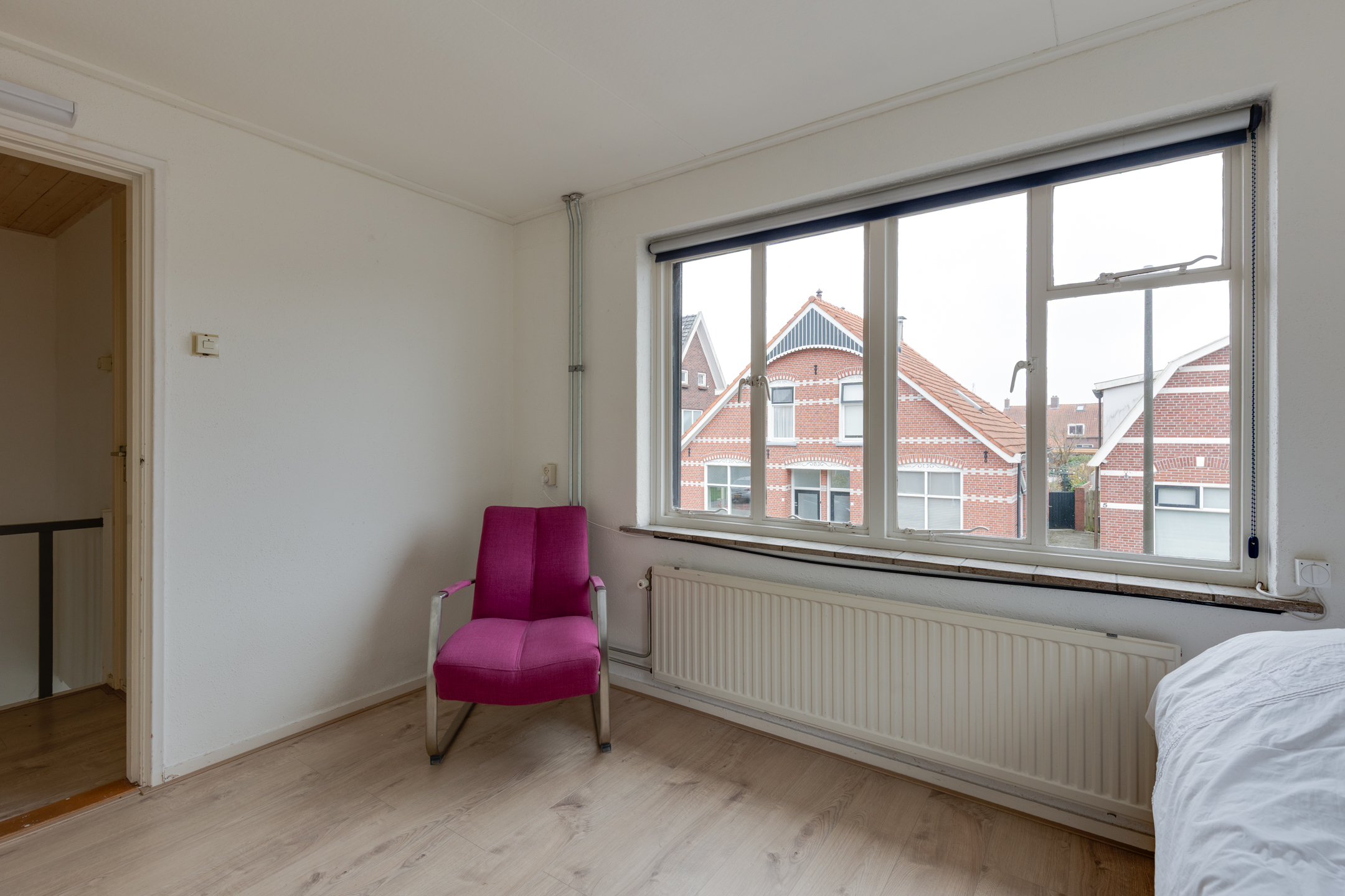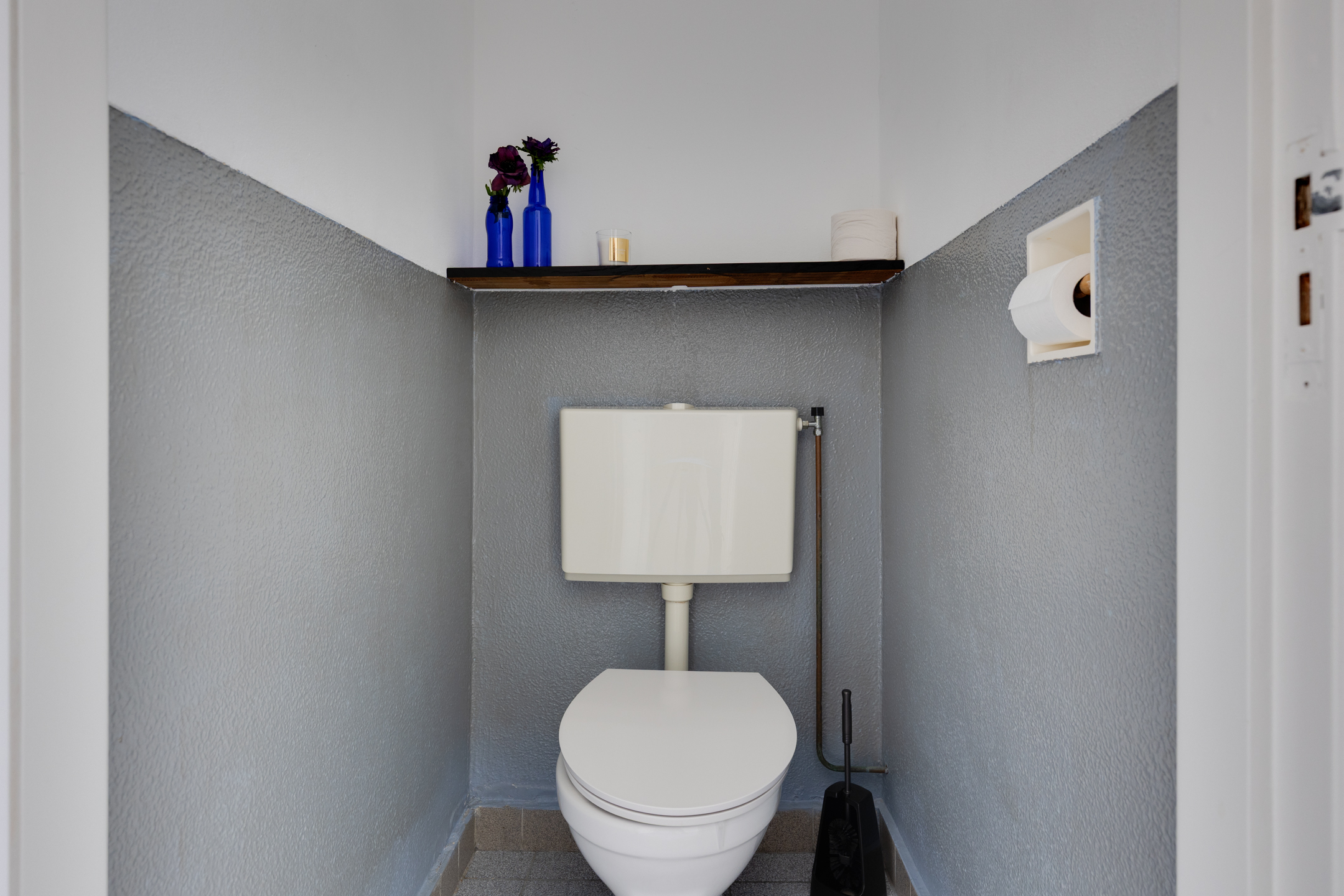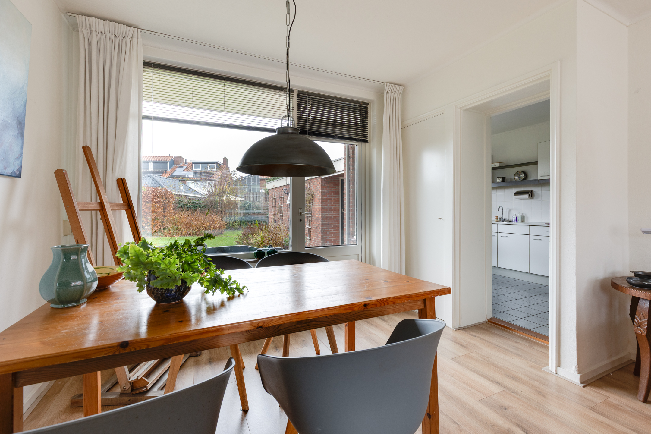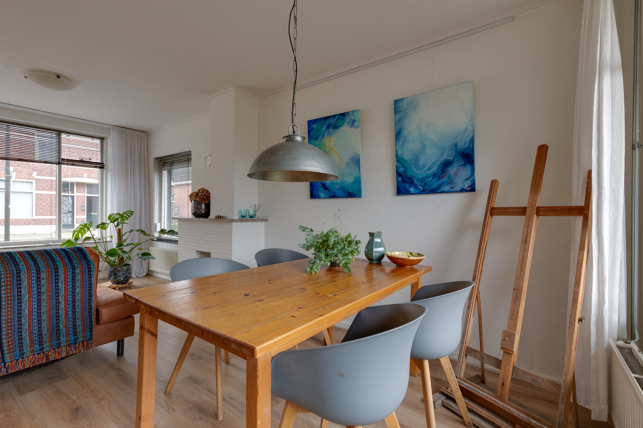 Begane grond: Entreehal met meterkast, vaste trap naar boven, kastruimte en een toiletruimte. Vanuit de hal is er toegang tot de lichte keuken. De keuken biedt doorgang naar de doorzonwoonkamer, voorzien van een inbouwkast, een deur naar de achtertuin én een extra zijraam dankzij de hoekligging. Via de keuken is er tevens toegang tot de achtertuin onder een overkapping, die doorloopt naar de stenen berging.