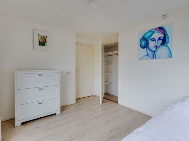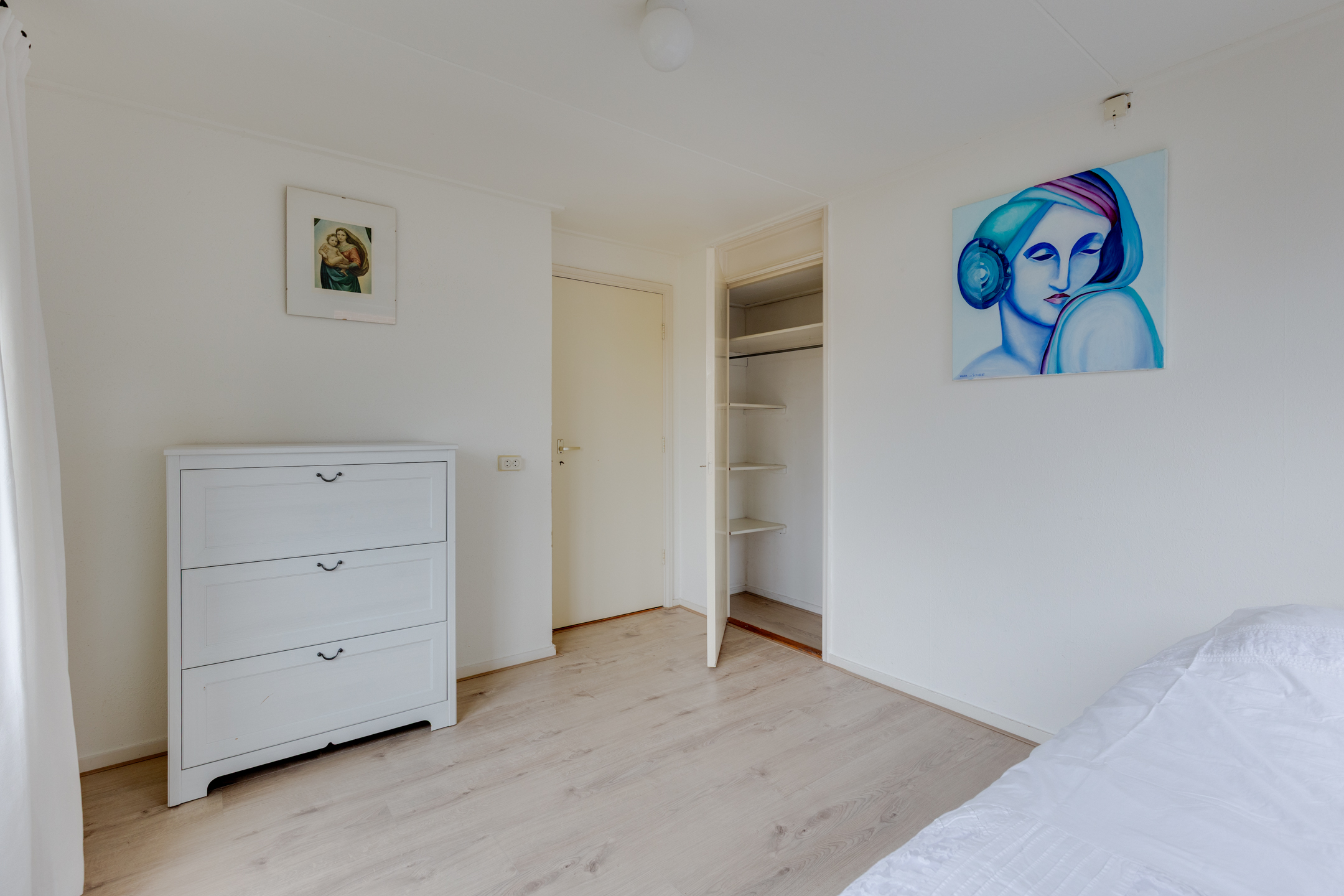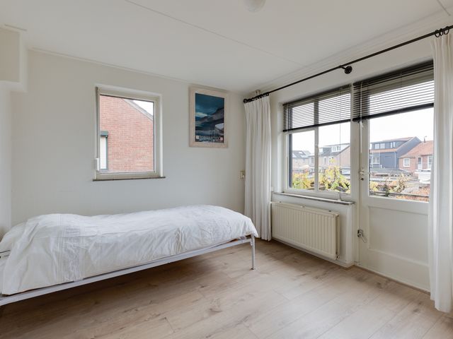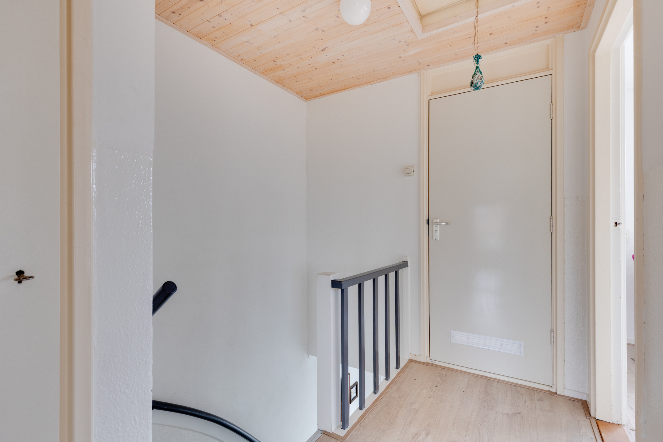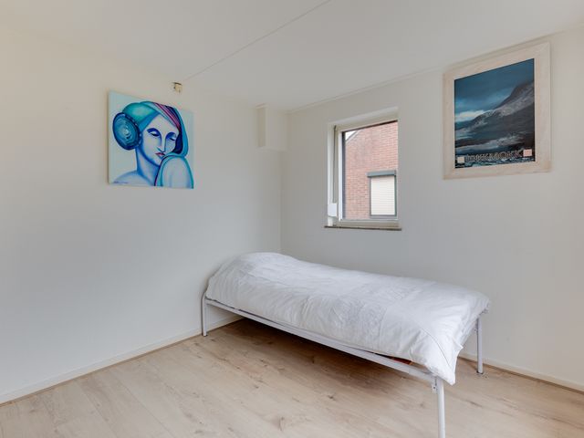Eerste verdieping: Overloop met vaste inbouwkast. Er zijn drie slaapkamers, waarvan twee kamers zijn verbonden met het balkon aan de achterzijde. Twee slaapkamers beschikken daarnaast over inbouwkasten. De badkamer is bereikbaar vanaf de overloop en is voorzien van een douche en wastafel.