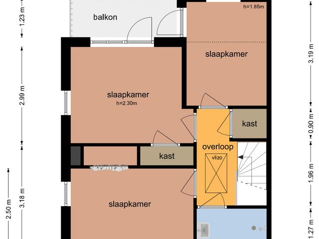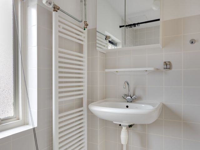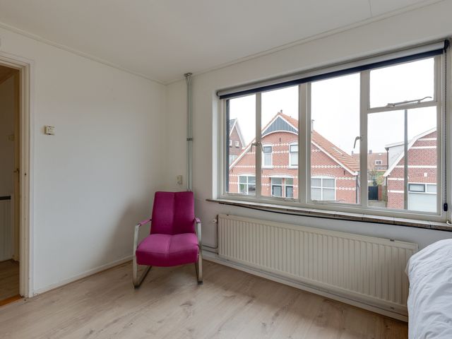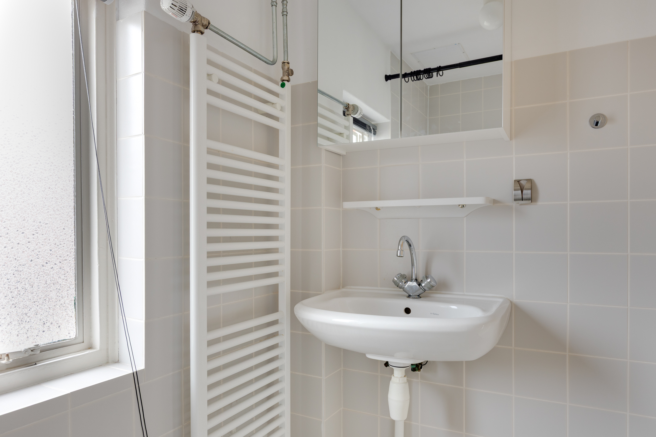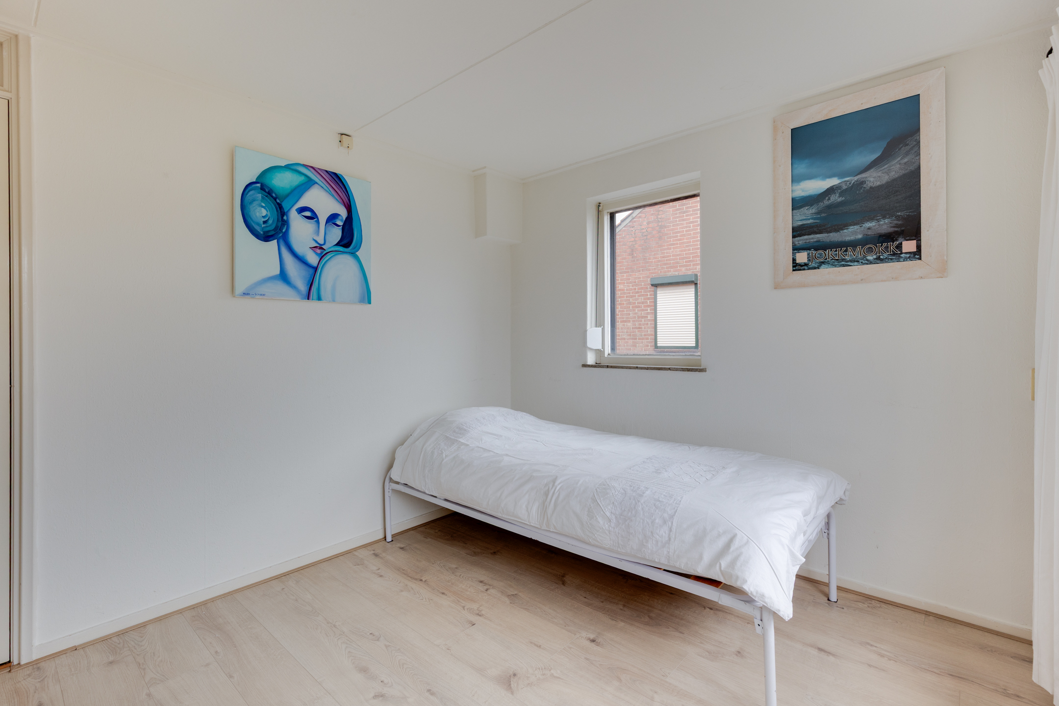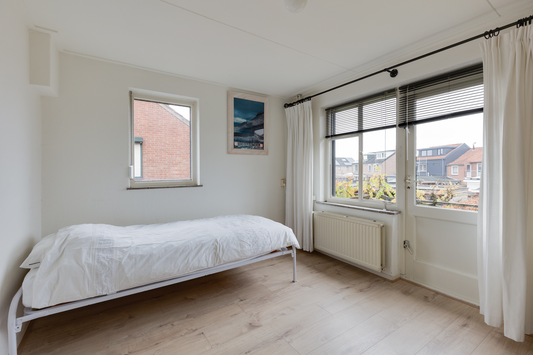 Eerste verdieping: Overloop met vaste inbouwkast. Er zijn drie slaapkamers, waarvan twee kamers zijn verbonden met het balkon aan de achterzijde. Twee slaapkamers beschikken daarnaast over inbouwkasten. De badkamer is bereikbaar vanaf de overloop en is voorzien van een douche en wastafel.